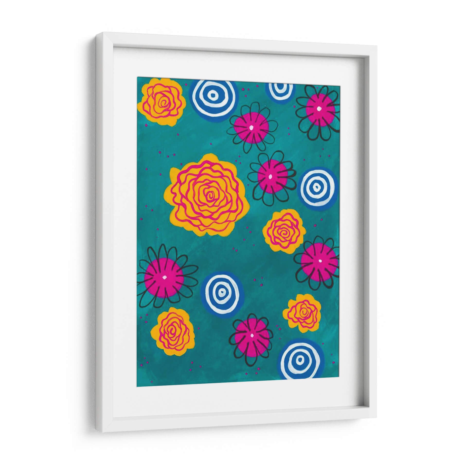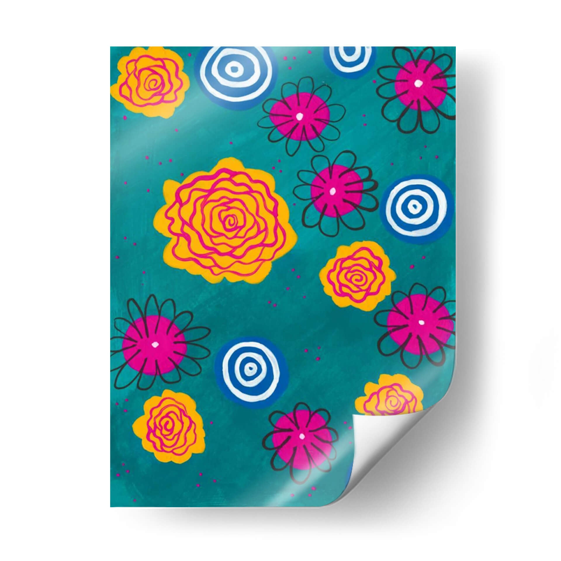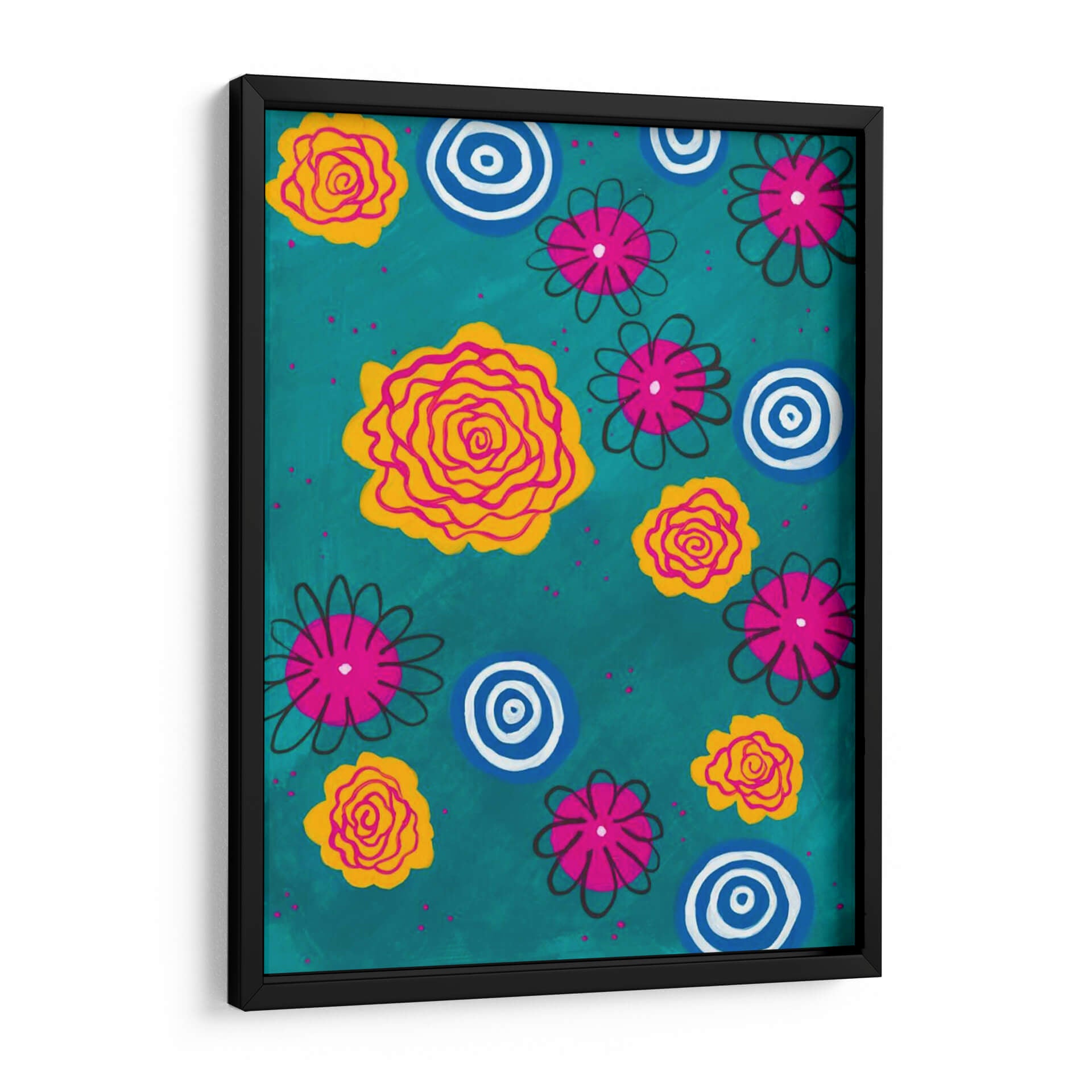 Inyecta una dosis de alegría y color en tu hogar con el vibrante cuadro decorativo 'Flor Pop I' de Regina Moore. Esta obra de arte contemporánea presenta un diseño audaz y juguetón, dominado por un fondo azul verdoso profundo que evoca la serenidad del océano o la vitalidad de un jardín exuberante. Sobre este lienzo, florecen diversas representaciones de flores en tonos amarillos y fucsias intensos, con contornos negros que definen su forma de manera enérgica. Algunas flores exhiben una textura detallada, similar a rosas estilizadas, mientras que otras adoptan una forma más simple y gráfica, casi como margaritas abstractas. Se intercalan círculos concéntricos en azul y blanco, añadiendo un elemento gráfico y dinámico que complementa la temática floral. La composición es una celebración de la naturaleza vista a través de una lente pop art, con puntos pequeños dispersos que añaden un toque de salpicadura artística. El estilo general es moderno, optimista y lleno de vida, perfecto para espacios que buscan un acento de color audaz y una atmósfera de felicidad. Ideal para salas de estar, dormitorios o incluso oficinas que deseen un toque de personalidad y un aire de frescura.