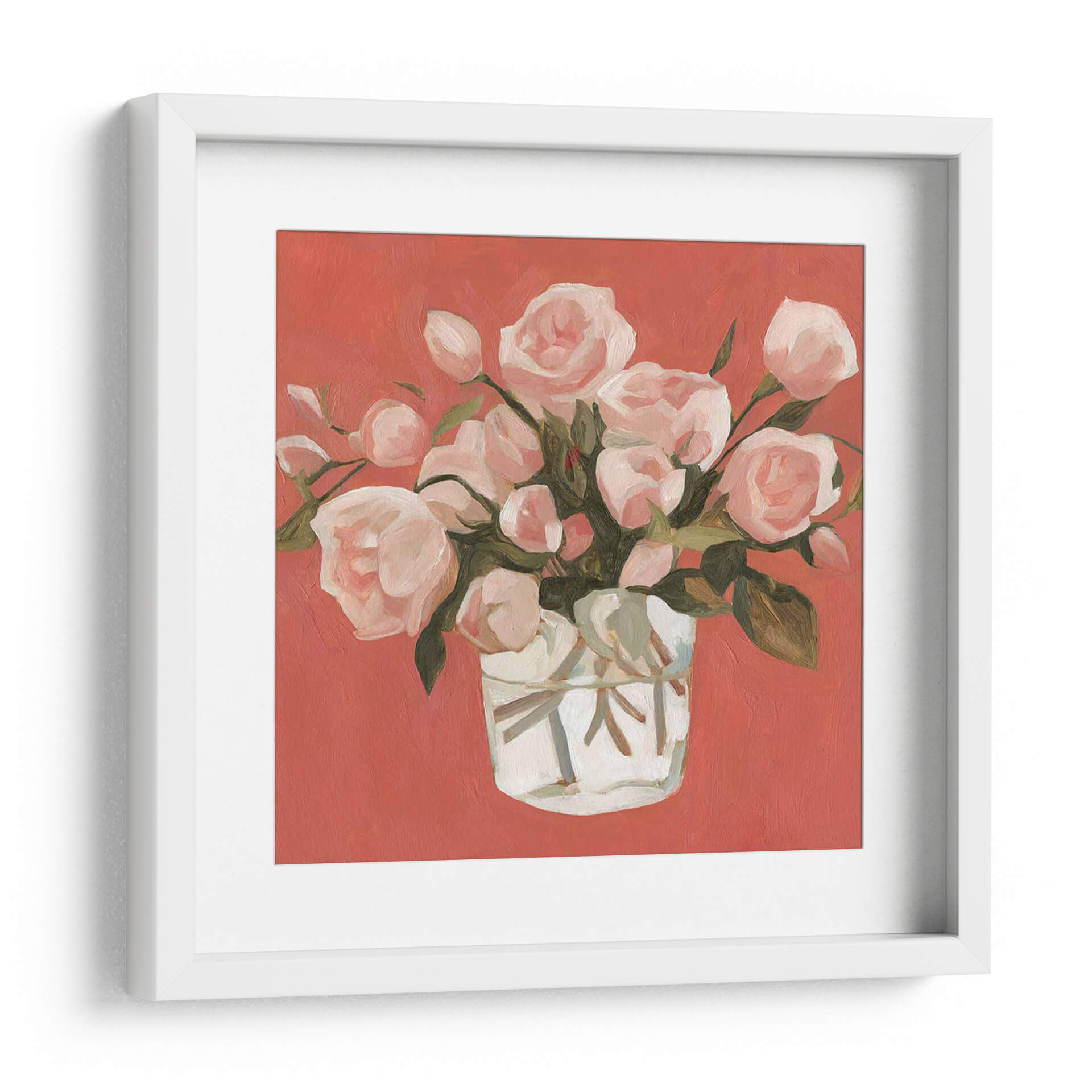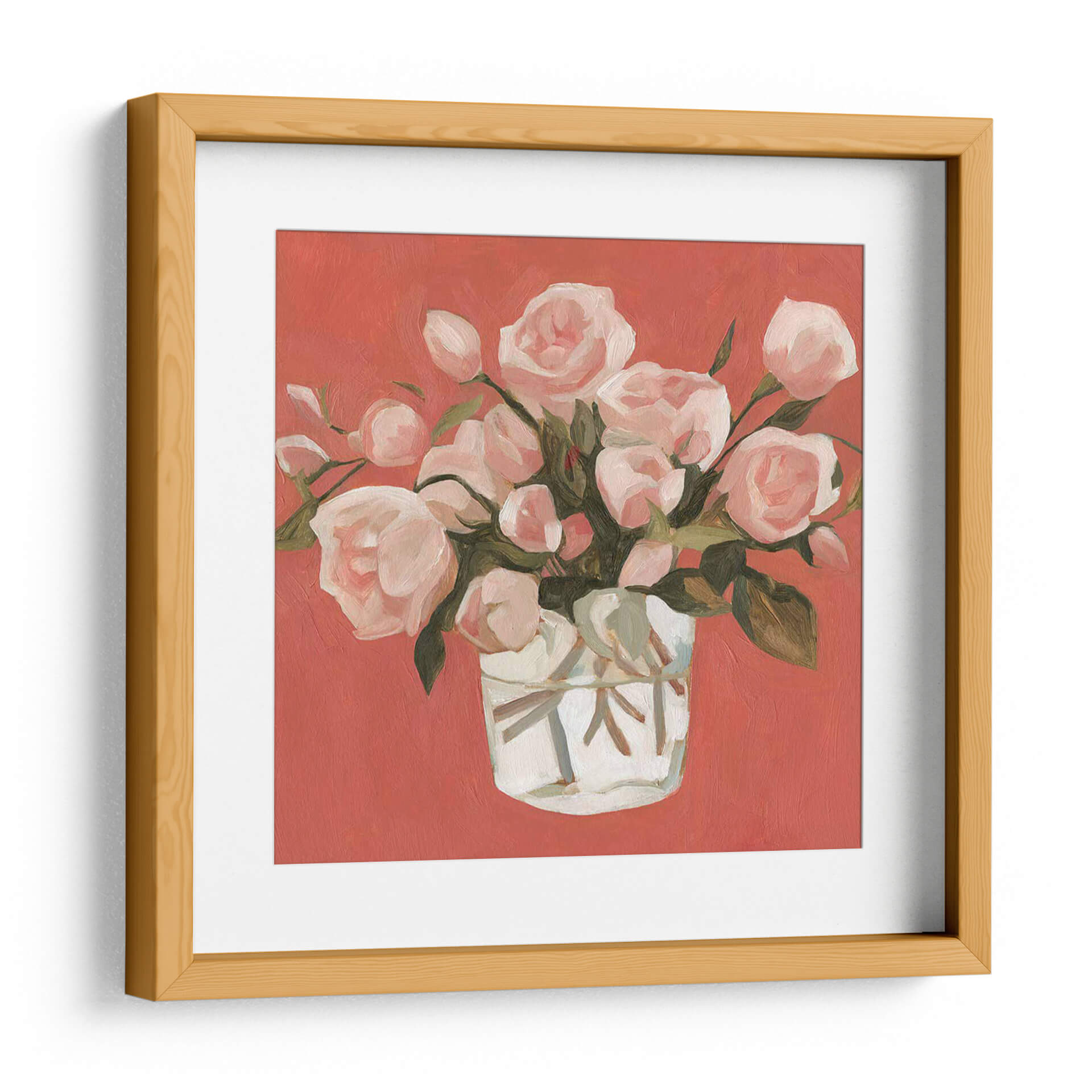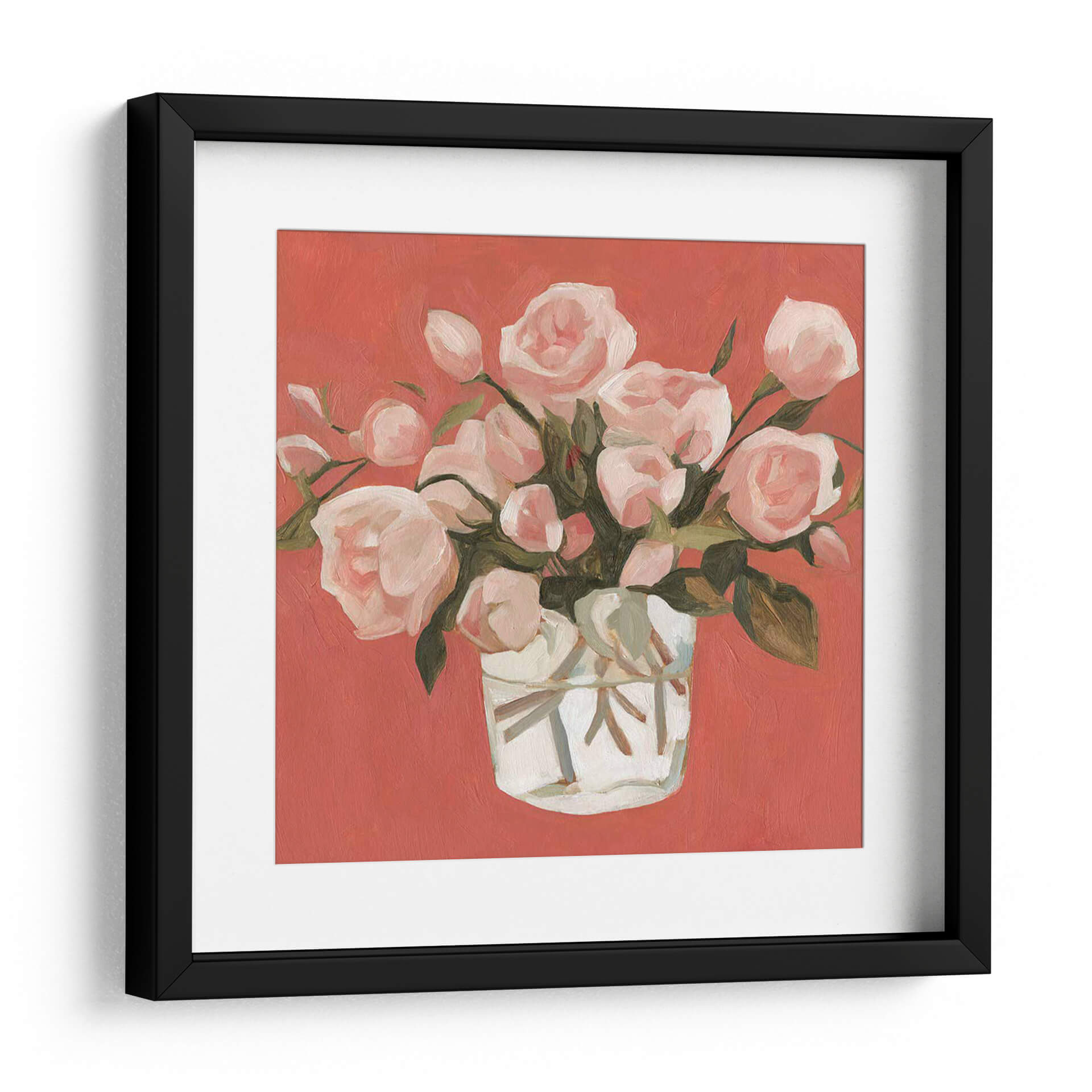 Adéntrate en la delicadeza y el encanto de "Floraciones Brillantes IV", una obra de arte que captura la belleza efímera de las rosas en plena floración. La artista Emma Scarvey nos presenta un ramo exuberante de flores de tonos pastel, cuidadosamente dispuesto en un jarrón transparente que añade un toque de modernidad a la composición. El vibrante fondo anaranjado, con su textura sutil, hace que los pétalos rosados resalten, creando un contraste cautivador que atrae la mirada y evoca una sensación de calidez y alegría. Cada pincelada, aunque libre y expresiva, define con maestría la suavidad de los pétalos y la frescura del follaje verde oscuro, invitando a contemplar la serenidad que emana de esta escena floral. Este cuadro decorativo es perfecto para añadir un toque de sofisticación y color a cualquier espacio, ya sea una sala de estar, un dormitorio o un recibidor. Su estilo contemporáneo pero con reminiscencias clásicas lo convierte en una pieza versátil, ideal para complementar decoraciones modernas, escandinavas o incluso bohemias. "Floraciones Brillantes IV" no es solo una imagen, es una invitación a la contemplación, un soplo de naturaleza que transformará tu hogar en un oasis de paz y belleza.