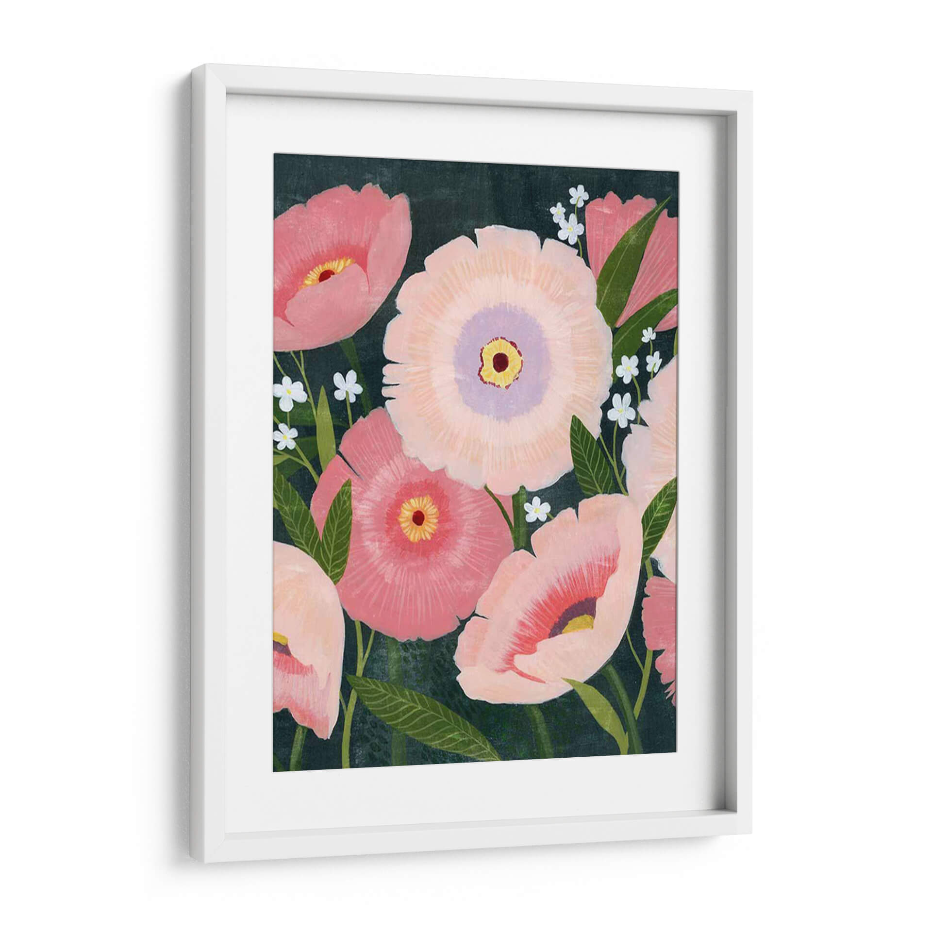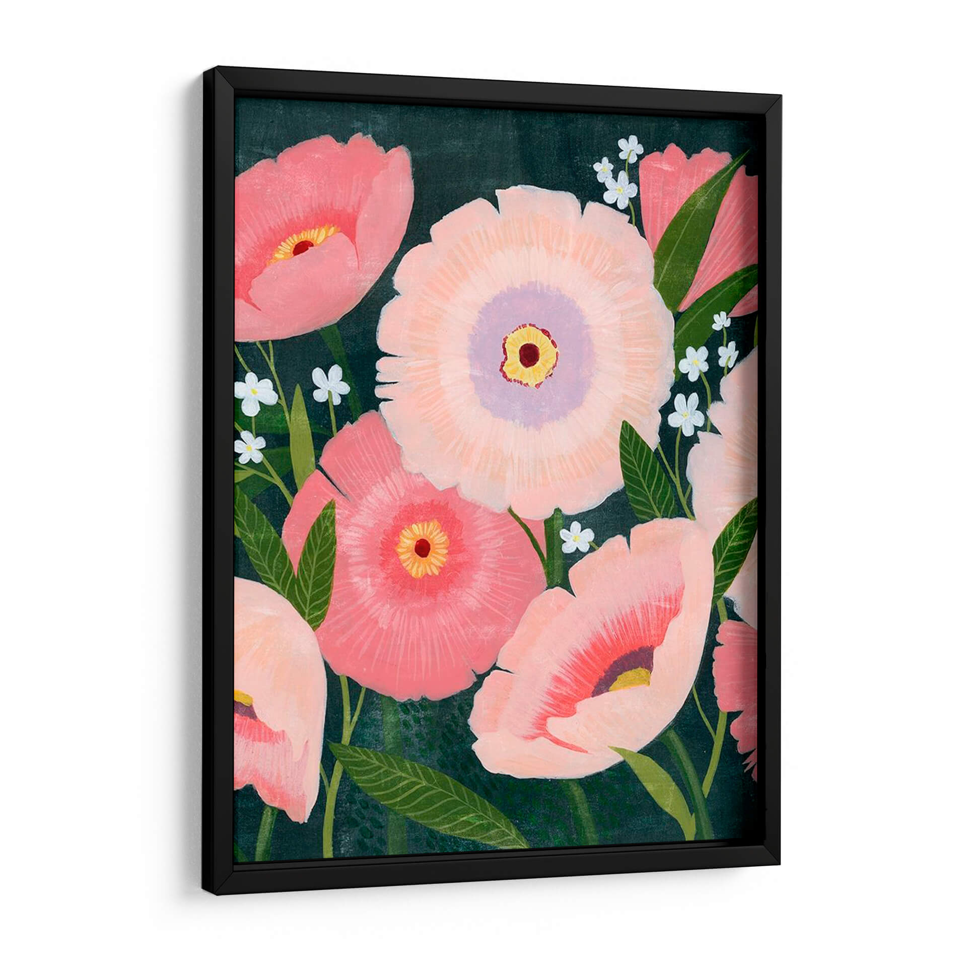Sumérgete en la belleza etérea de "Floraciones Nocturnas I", una obra maestra de Grace Popp que captura la delicadeza de las flores en plena efervescencia. Este cuadro decorativo presenta un vibrante arreglo floral donde predominan los tonos rosados y melocotón, contrastando con un fondo oscuro y profundo que realza la luminosidad de los pétalos. Las formas, suavemente esbozadas con toques de acuarela o acrílico, evocan la sensación de un jardín secreto bañado por la luz de la luna. Cada flor parece cobrar vida propia, desde los grandes capullos principales, con sus centros amarillos y púrpuras, hasta las pequeñas y delicadas flores blancas que salpican el lienzo, añadiendo un toque de inocencia y frescura. La composición, centrada en la abundancia floral y el juego de luces y sombras, crea una atmósfera de misterio y serenidad, perfecta para transformar cualquier espacio. Ideal para añadir un toque de color y sofisticación a tu sala de estar, dormitorio o estudio, este cuadro decorativo inspira calma y admiración por la naturaleza.