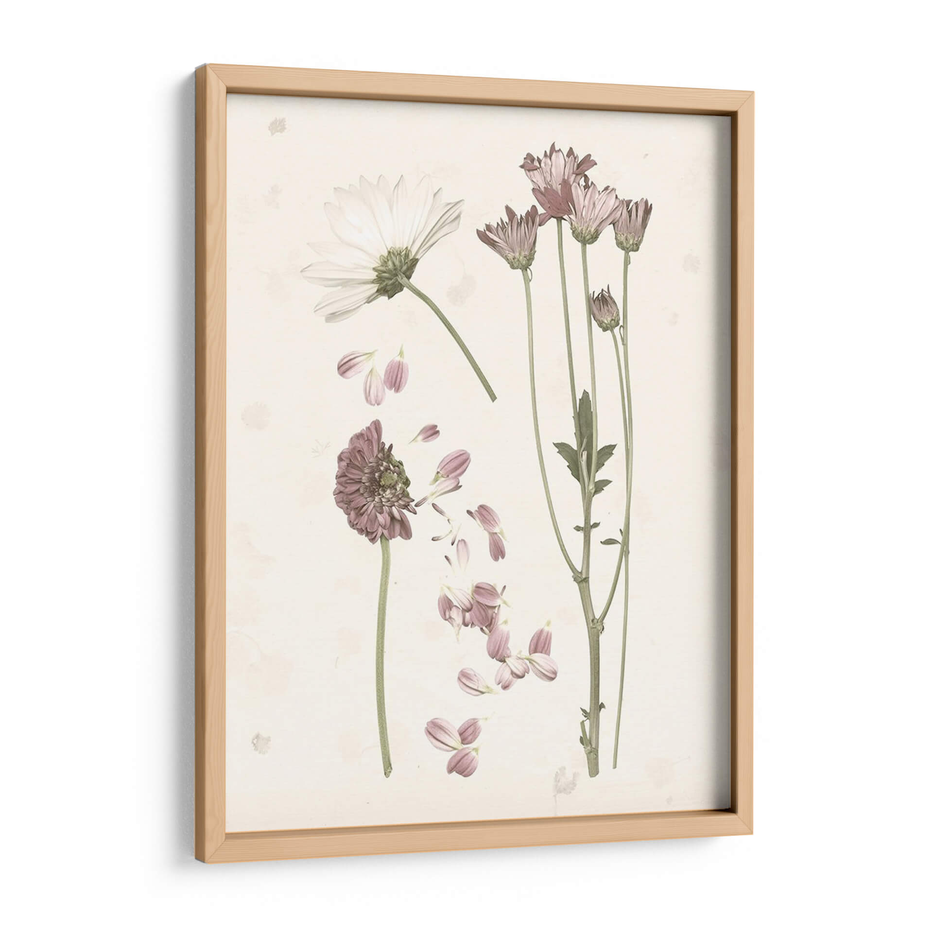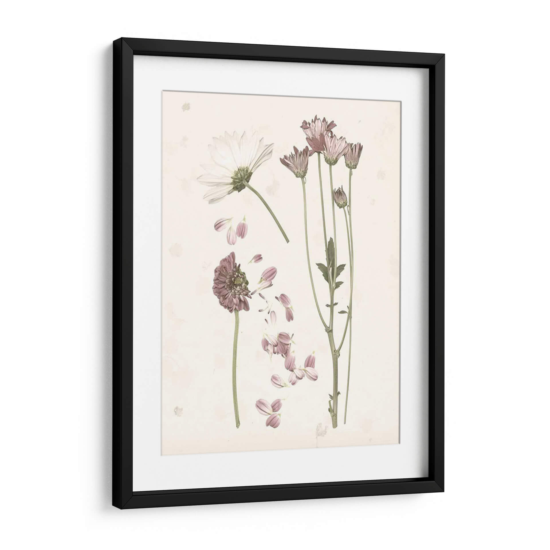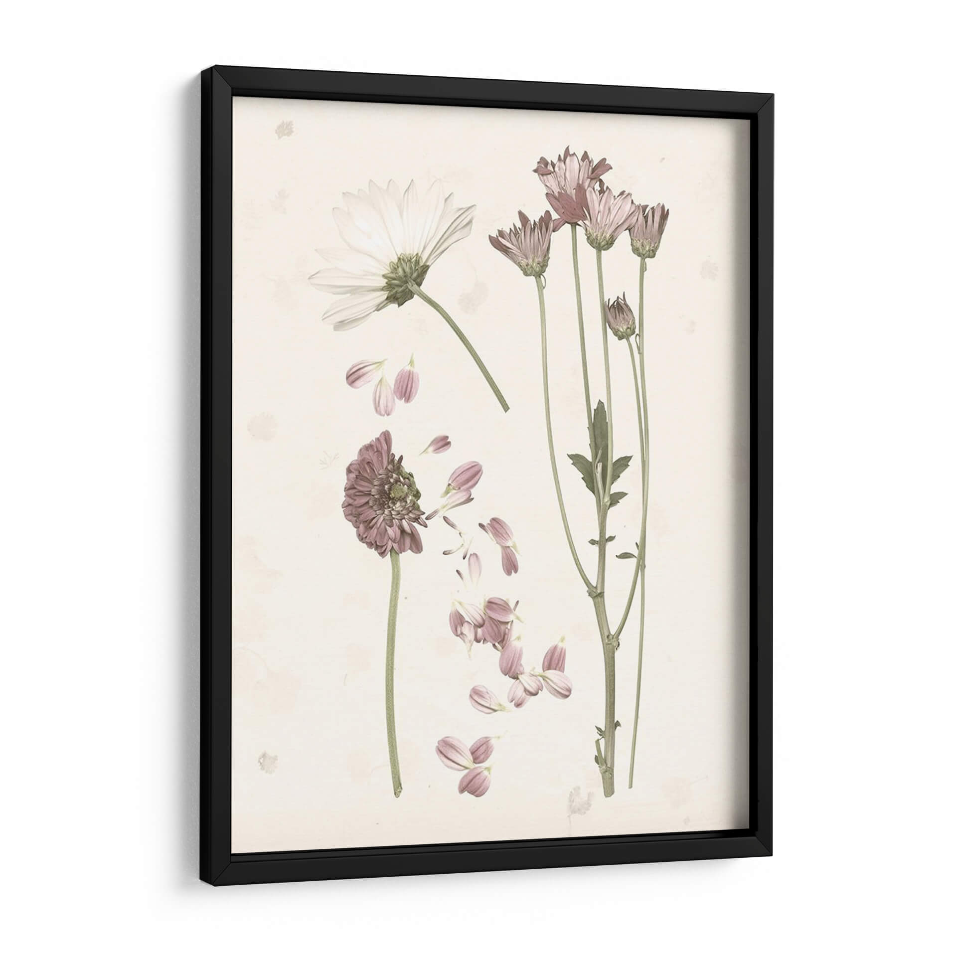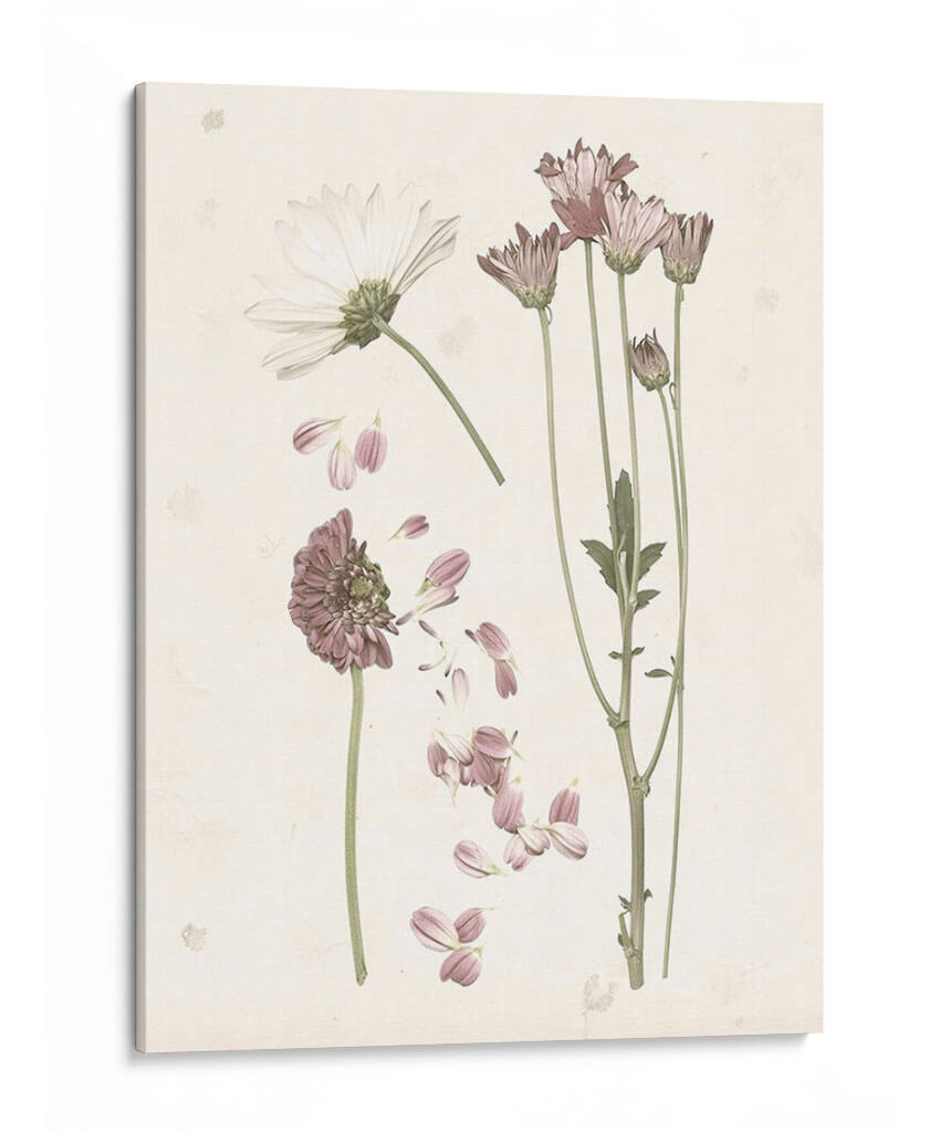 Sumérgete en la delicadeza botánica con "Floraciones Presionadas II", una obra de arte que captura la efímera belleza de las flores con una sensibilidad única. La pieza presenta un estudio detallado de crisantemos en diferentes etapas de su ciclo de vida. Una flor blanca, con sus pétalos desplegados en plena magnificencia, contrasta con otra de tonalidades púrpuras, cuyas hojas comienzan a desprenderse, creando un efecto visual de movimiento y fragilidad. La paleta de colores, dominada por tonos pastel suaves, beige y toques de verde terroso, evoca una atmósfera de calma, nostalgia y serenidad. El estilo, que recuerda a las ilustraciones botánicas clásicas con un toque contemporáneo, sitúa a esta obra como una elección perfecta para añadir un aire de sofisticación y tranquilidad a cualquier espacio. Ideal para dormitorios, salas de estar o estudios que busquen un punto de conexión con la naturaleza y un recordatorio visual de la belleza en la impermanencia. Este cuadro decorativo es una invitación a la contemplación y una adición elegante a la decoración de tu hogar u oficina, aportando una sensación de paz y refinamiento atemporal.