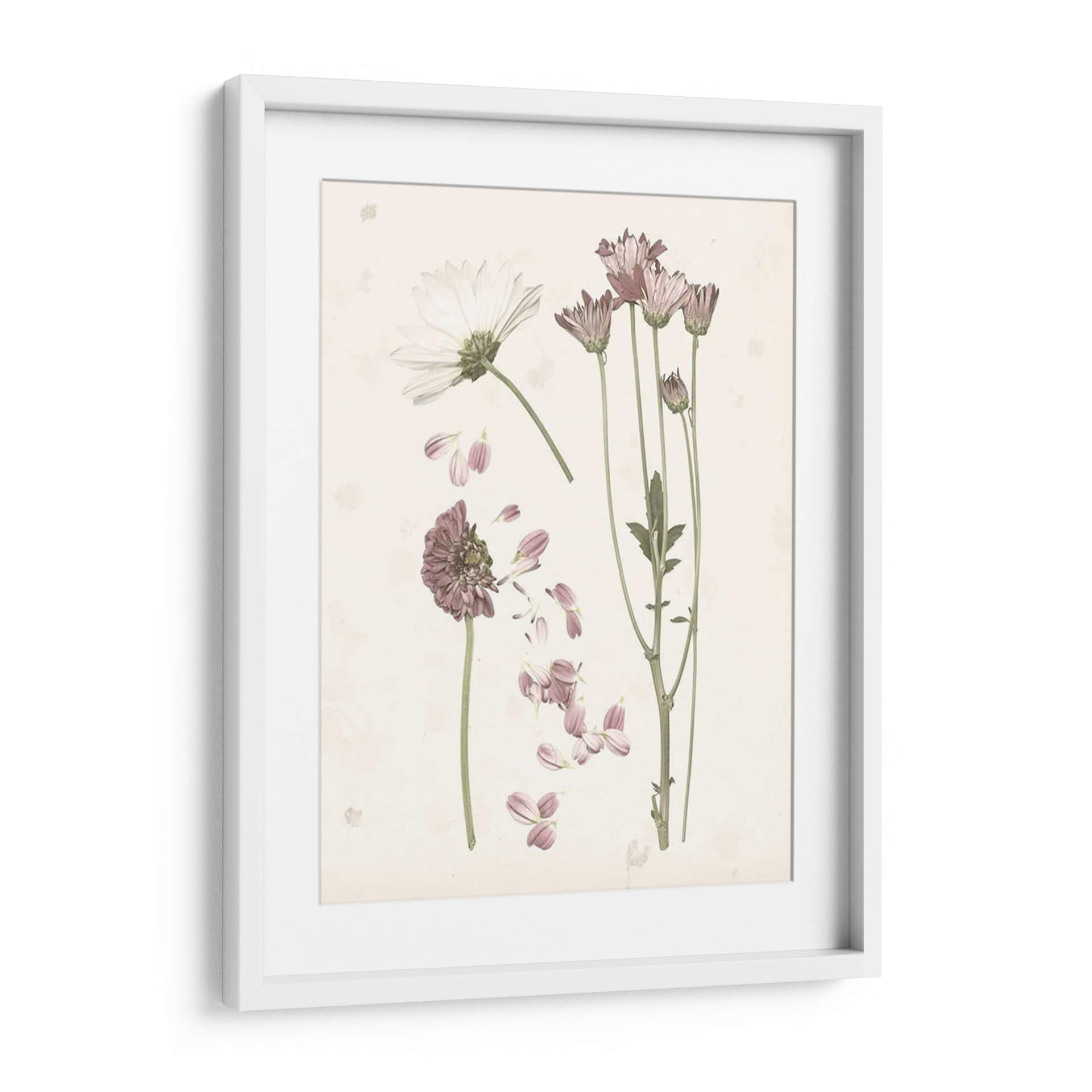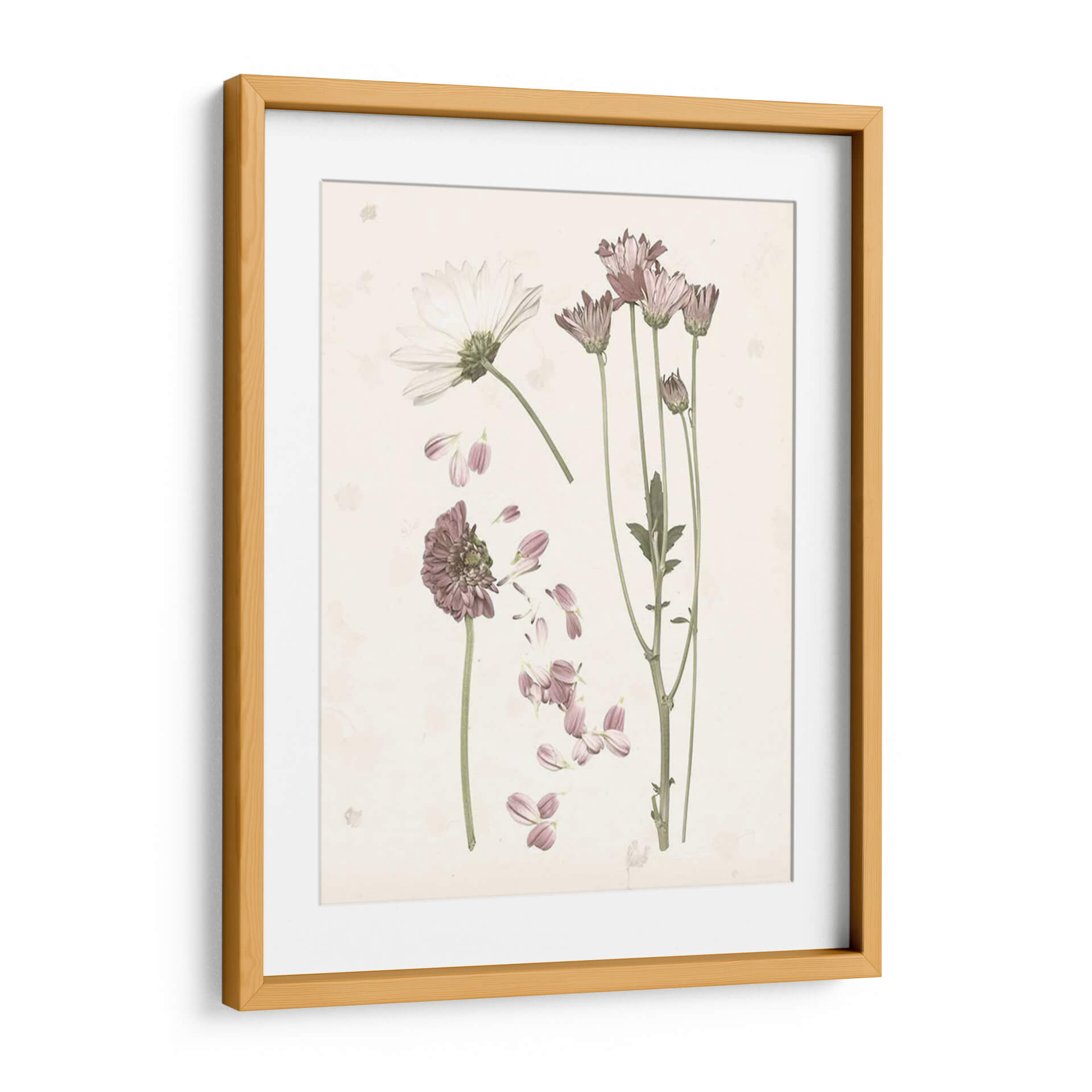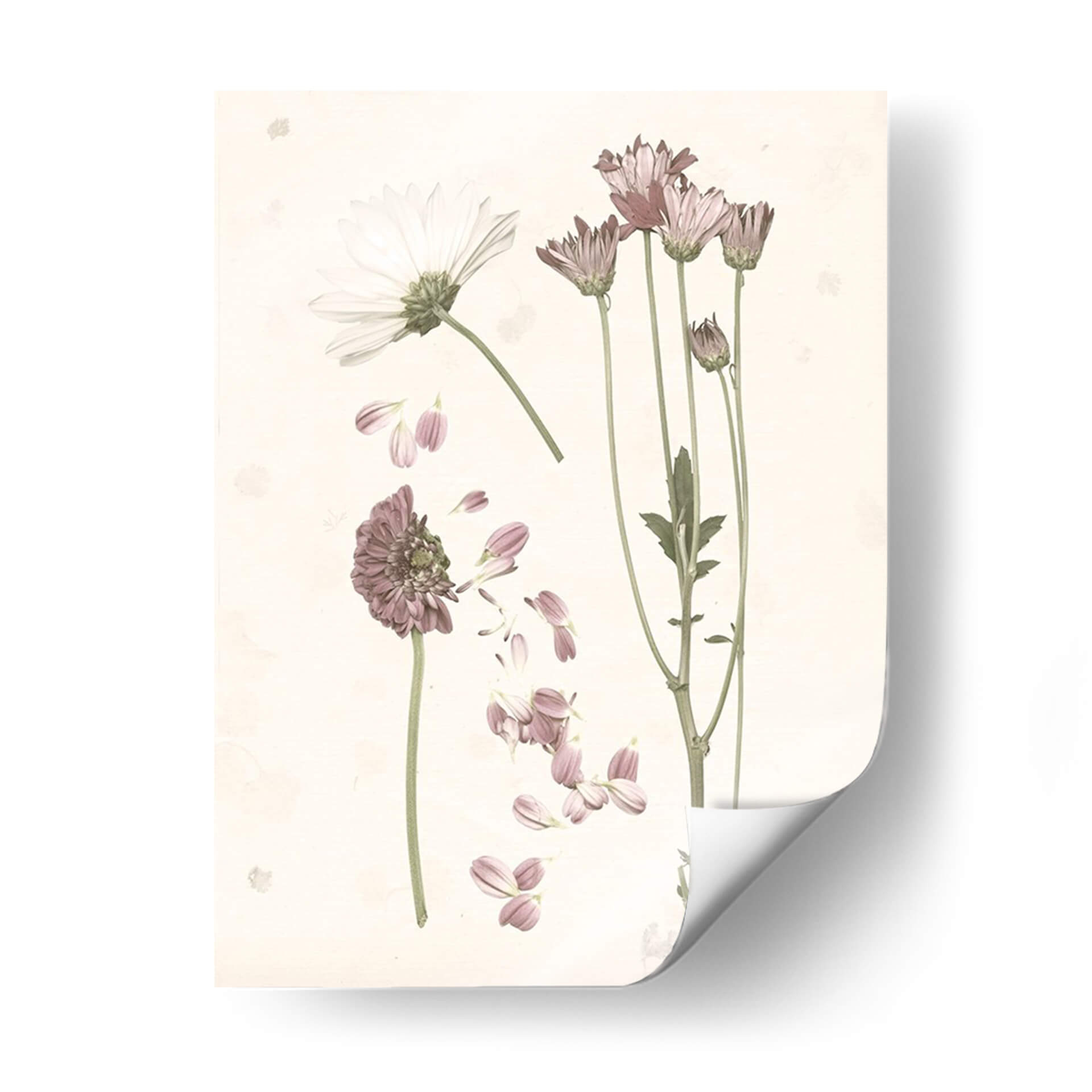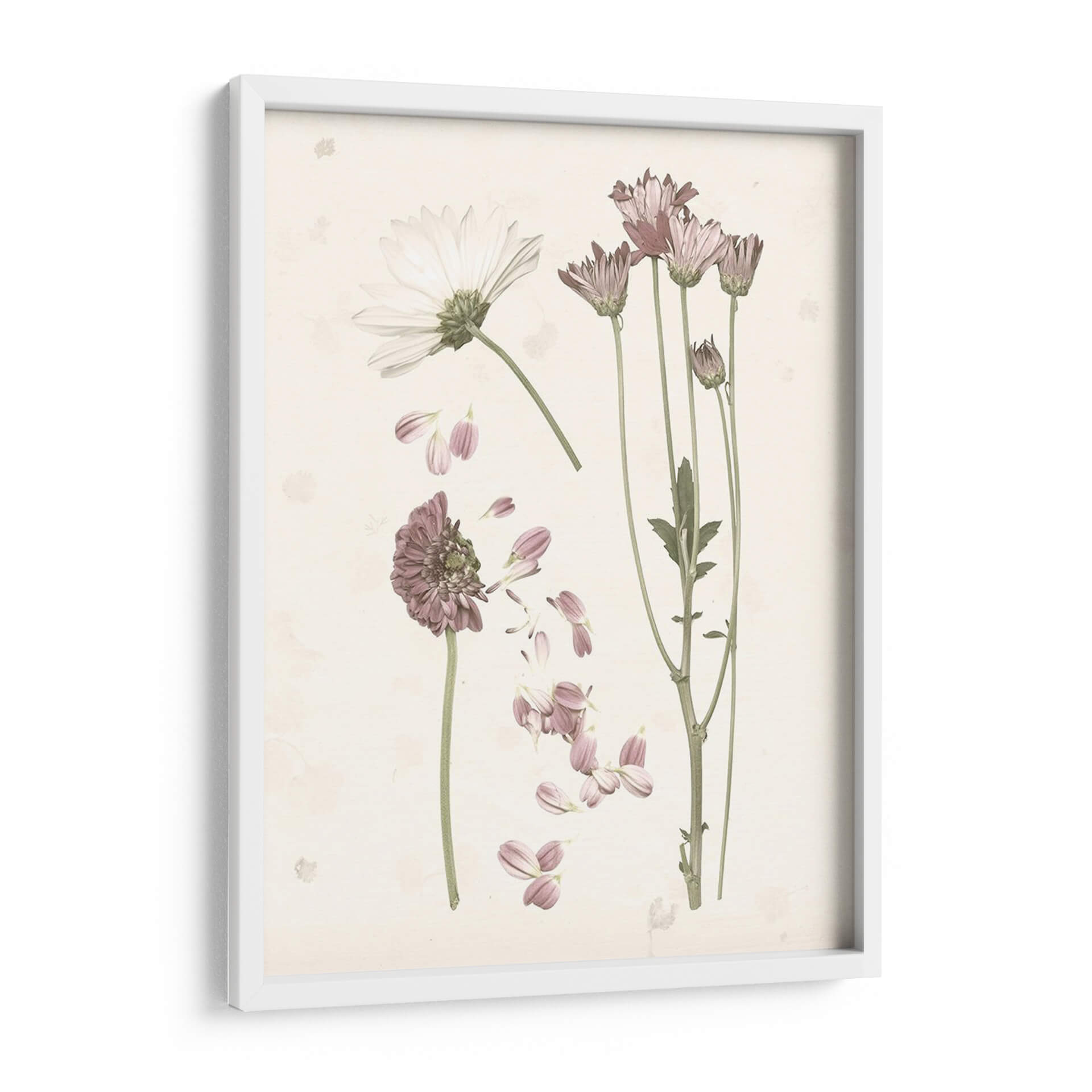 Sumérgete en la delicadeza botánica con "Floraciones Presionadas II", una obra de arte que captura la efímera belleza de las flores con una sensibilidad única. La pieza presenta un estudio detallado de crisantemos en diferentes etapas de su ciclo de vida. Una flor blanca, con sus pétalos desplegados en plena magnificencia, contrasta con otra de tonalidades púrpuras, cuyas hojas comienzan a desprenderse, creando un efecto visual de movimiento y fragilidad. La paleta de colores, dominada por tonos pastel suaves, beige y toques de verde terroso, evoca una atmósfera de calma, nostalgia y serenidad. El estilo, que recuerda a las ilustraciones botánicas clásicas con un toque contemporáneo, sitúa a esta obra como una elección perfecta para añadir un aire de sofisticación y tranquilidad a cualquier espacio. Ideal para dormitorios, salas de estar o estudios que busquen un punto de conexión con la naturaleza y un recordatorio visual de la belleza en la impermanencia. Este cuadro decorativo es una invitación a la contemplación y una adición elegante a la decoración de tu hogar u oficina, aportando una sensación de paz y refinamiento atemporal.