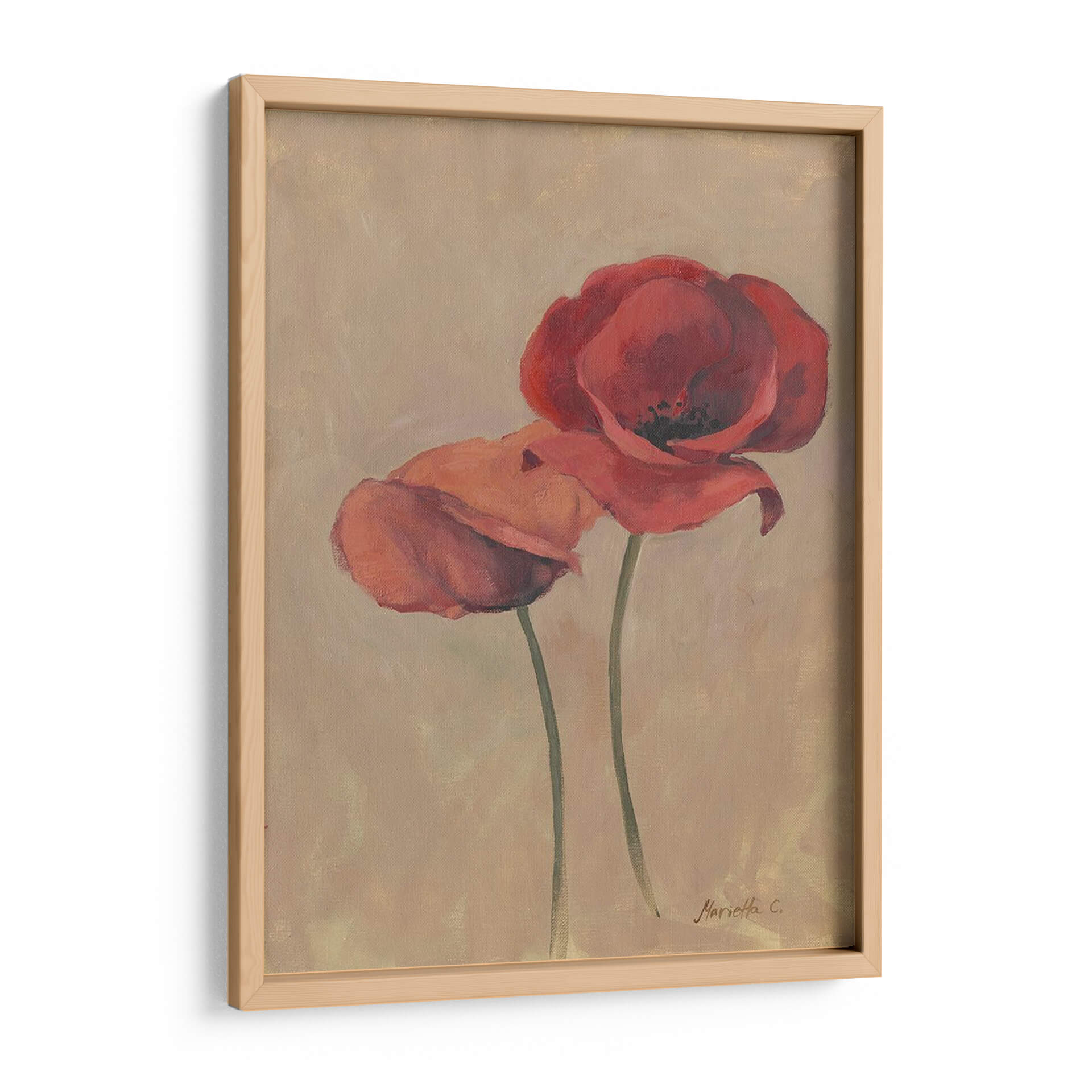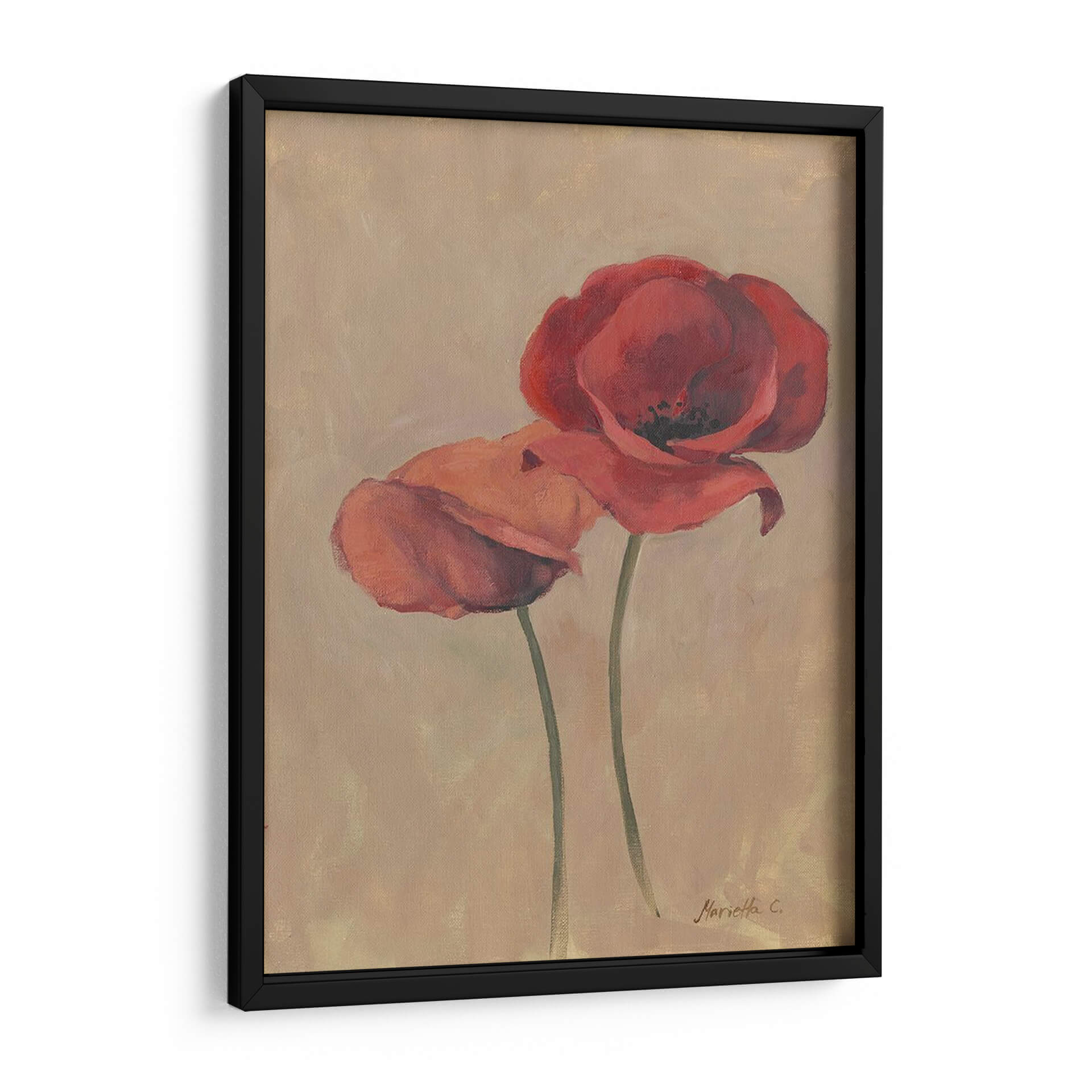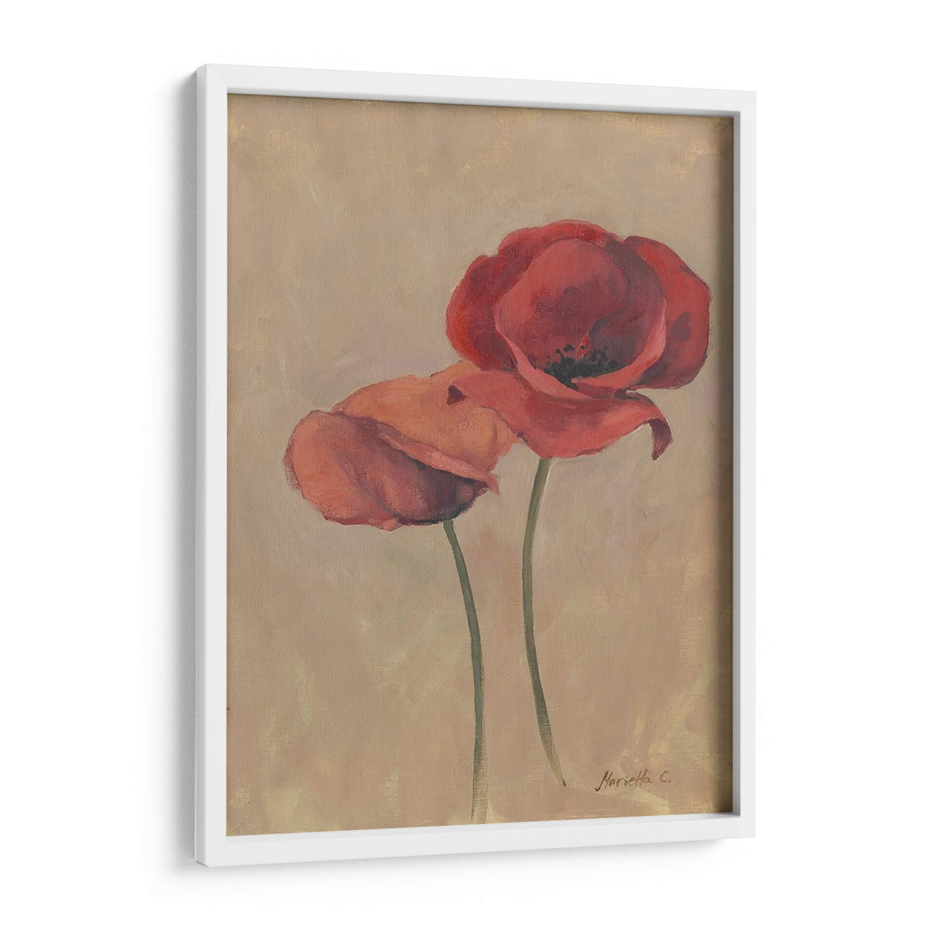 Sumérgete en la delicadeza floral con "Floraciones y Tallos II", una cautivadora obra de arte de Marietta Cohen que captura la esencia efímera de las amapolas. Este cuadro decorativo presenta dos amapolas rojas vibrantes que parecen bailar sobre un fondo de tonos tierra, evocando una sensación de calidez y serenidad. La técnica pictórica, con pinceladas suaves y un juego sutil de luces y sombras, aporta profundidad y realismo a los pétalos carnosos y los tallos esbeltos. La paleta de colores, dominada por rojos intensos y el suave beige del fondo, crea una armonía visual que se adapta a cualquier estilo de decoración, desde el moderno hasta el más clásico. Ideal para añadir un toque de color y vida a tu salón, dormitorio o incluso a un espacio de oficina, esta pieza es una invitación a la contemplación y a la apreciación de la belleza natural. Su composición vertical y el enfoque centrado en las flores la convierten en un punto focal elegante y atemporal. "Floraciones y Tallos II" no es solo un cuadro, es una ventana a un jardín interior, una pieza que respira elegancia y un profundo amor por la naturaleza, perfecta para quienes buscan añadir una pincelada de arte contemporáneo y sofisticado a su hogar.