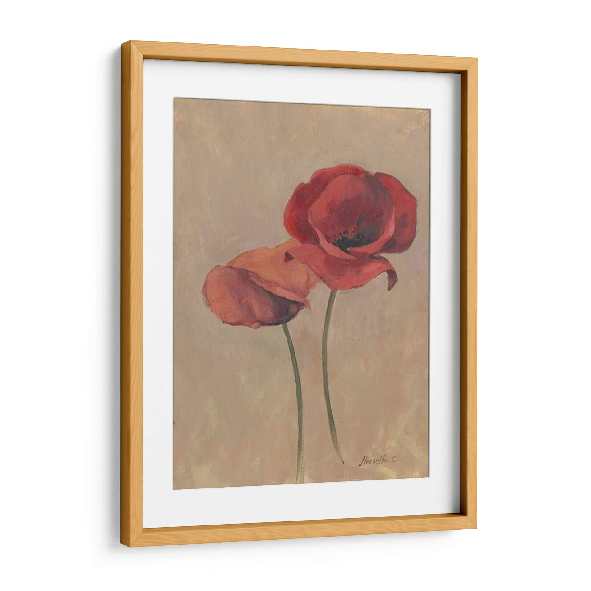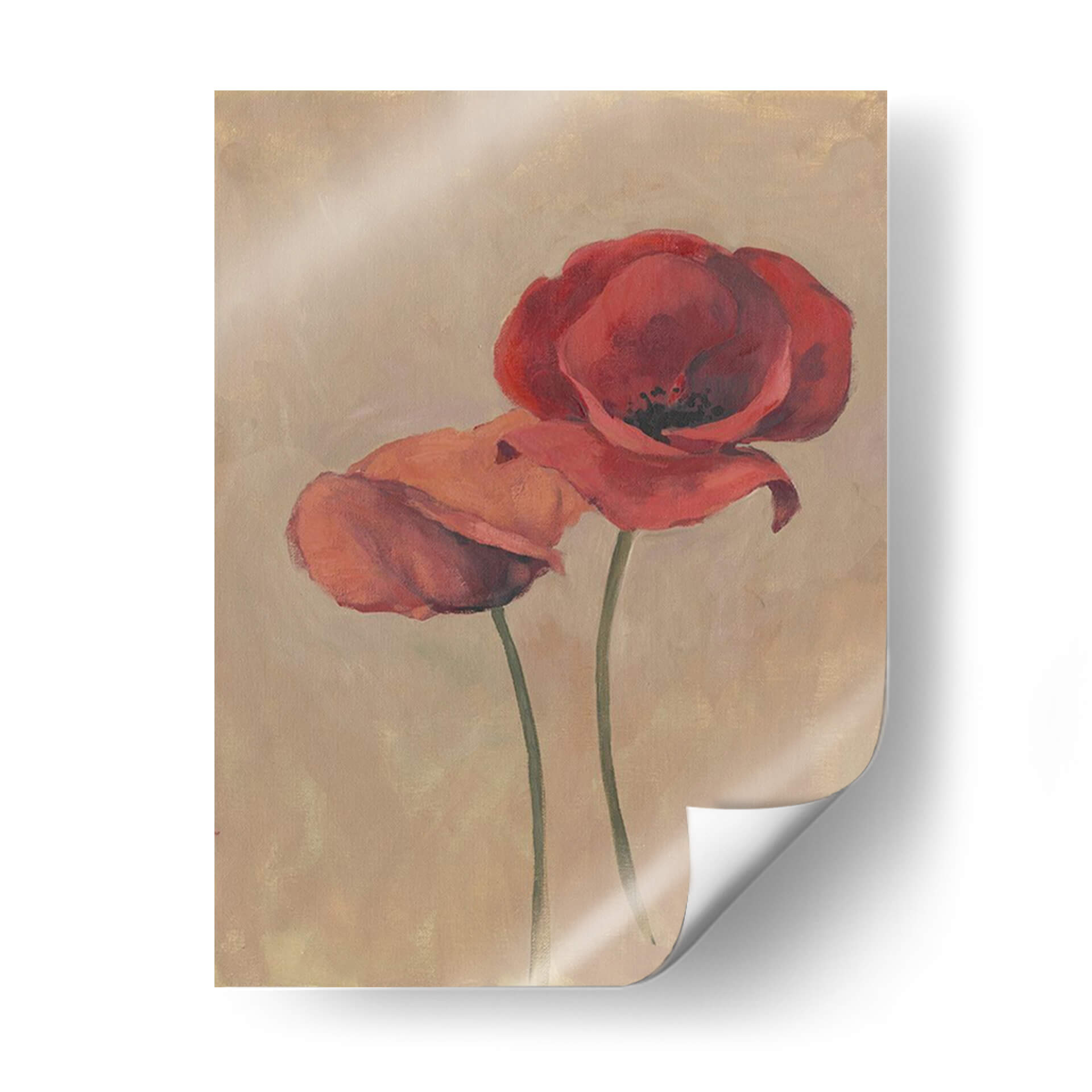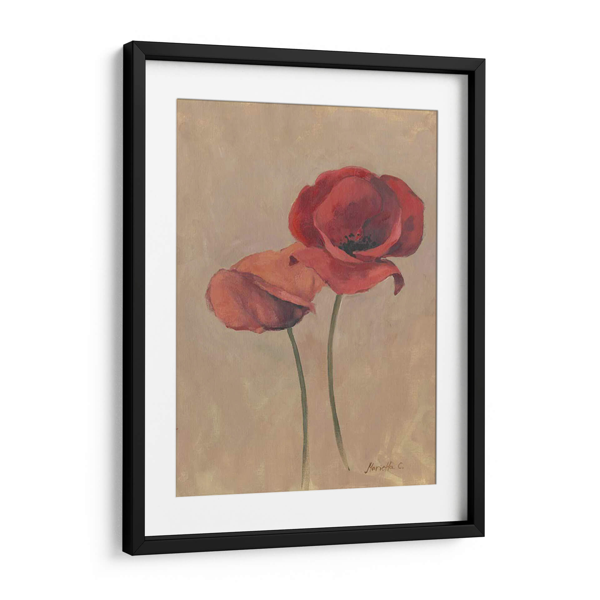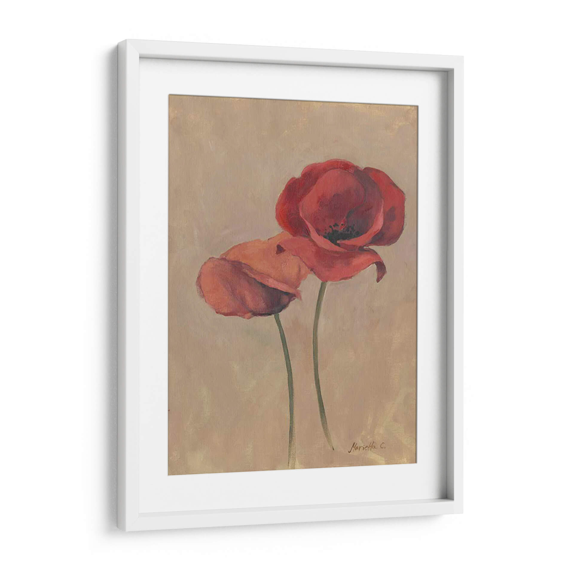 Sumérgete en la delicadeza floral con "Floraciones y Tallos II", una cautivadora obra de arte de Marietta Cohen que captura la esencia efímera de las amapolas. Este cuadro decorativo presenta dos amapolas rojas vibrantes que parecen bailar sobre un fondo de tonos tierra, evocando una sensación de calidez y serenidad. La técnica pictórica, con pinceladas suaves y un juego sutil de luces y sombras, aporta profundidad y realismo a los pétalos carnosos y los tallos esbeltos. La paleta de colores, dominada por rojos intensos y el suave beige del fondo, crea una armonía visual que se adapta a cualquier estilo de decoración, desde el moderno hasta el más clásico. Ideal para añadir un toque de color y vida a tu salón, dormitorio o incluso a un espacio de oficina, esta pieza es una invitación a la contemplación y a la apreciación de la belleza natural. Su composición vertical y el enfoque centrado en las flores la convierten en un punto focal elegante y atemporal. "Floraciones y Tallos II" no es solo un cuadro, es una ventana a un jardín interior, una pieza que respira elegancia y un profundo amor por la naturaleza, perfecta para quienes buscan añadir una pincelada de arte contemporáneo y sofisticado a su hogar.