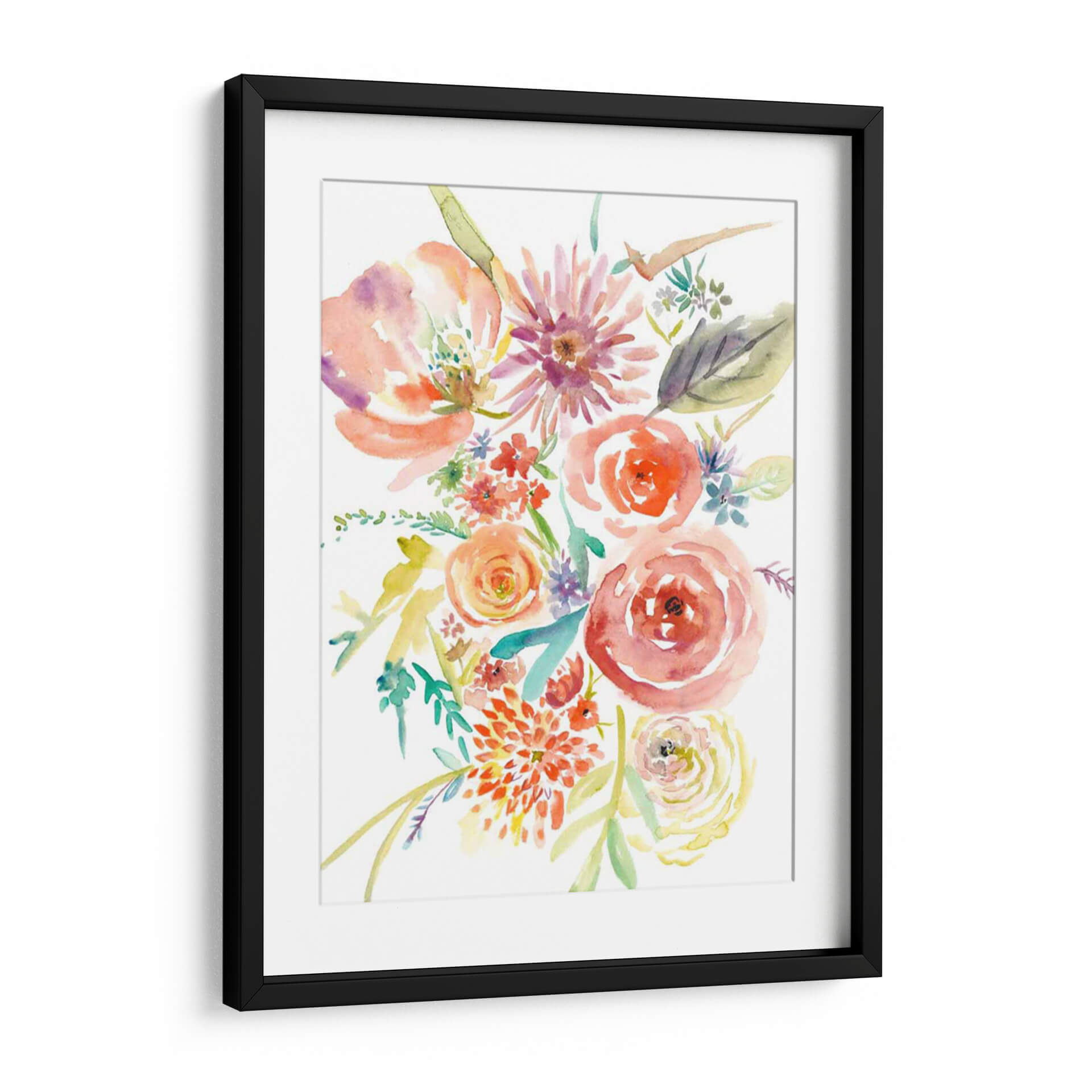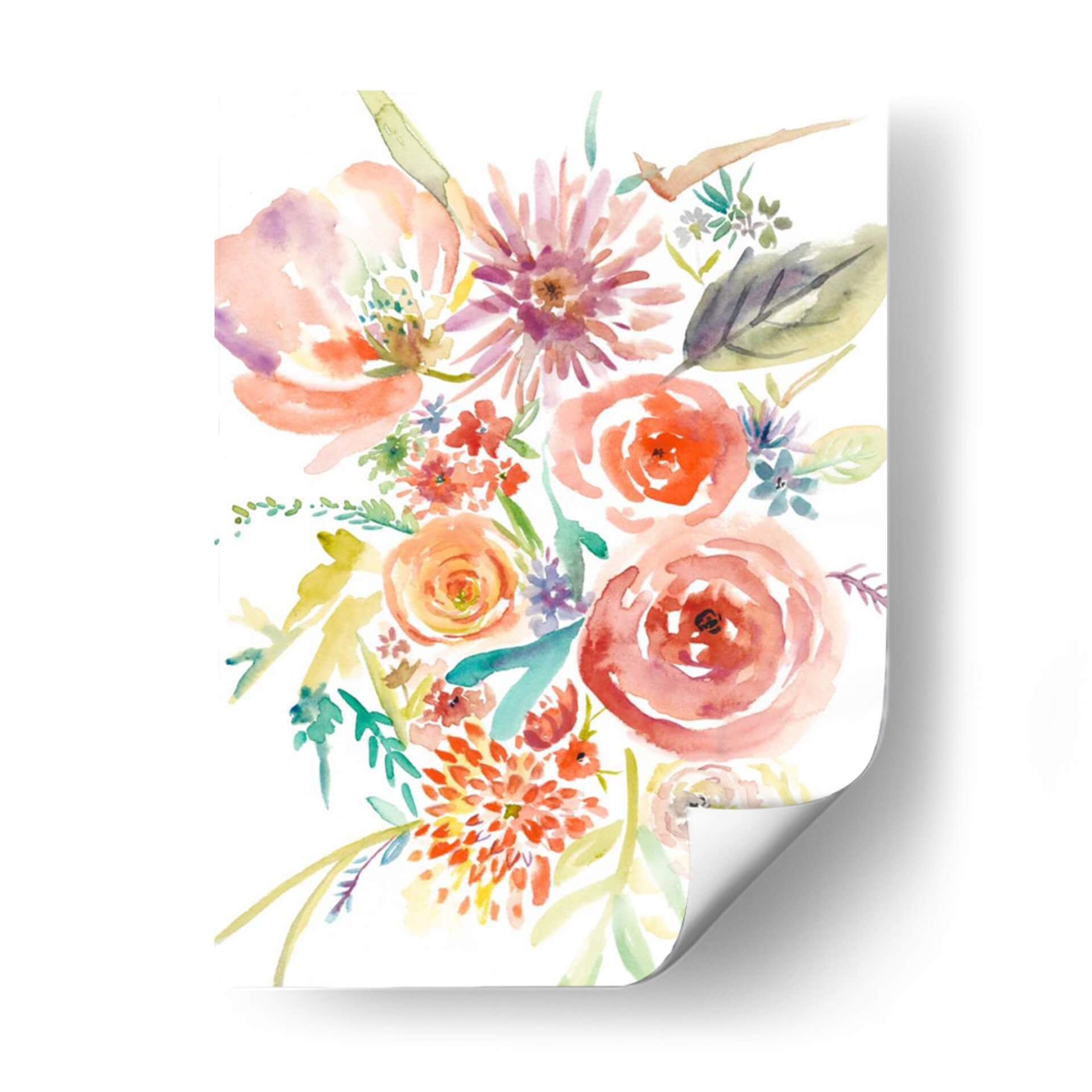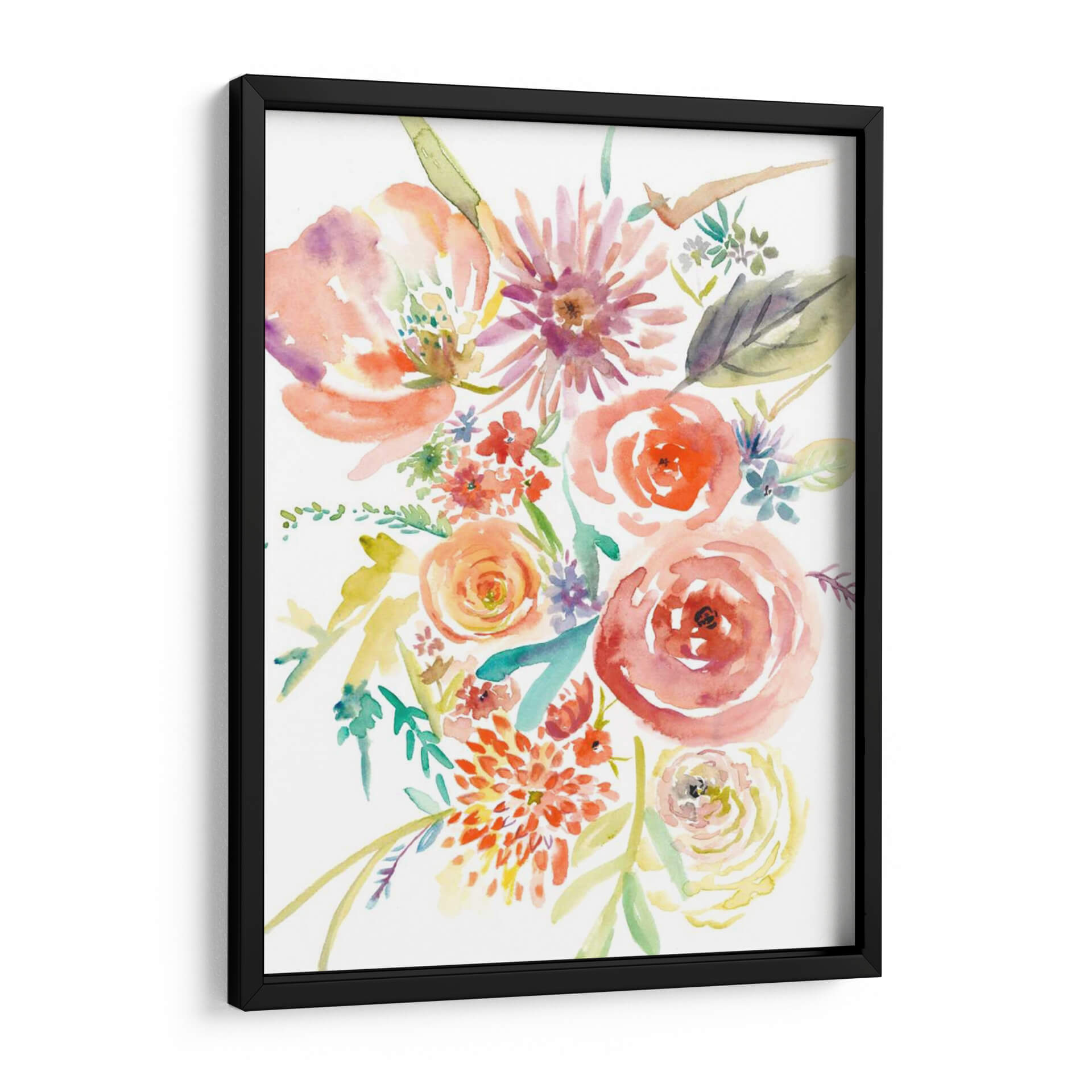 Embellece tu espacio con "Florales Flotantes II", una obra de arte acuarela que captura la delicadeza y el vibrante espíritu de la naturaleza. Este cuadro decorativo presenta un exuberante ramo de flores en tonos cálidos de coral, naranja, rosa y toques de púrpura, magistralmente pintado con la técnica de acuarela que otorga ligereza y fluidez a cada pétalo y hoja. La composición, con sus flores principales detalladas y flores secundarias que danzan alrededor, evoca una sensación de movimiento y alegría. Es una pieza ideal para infundir vitalidad y un toque de frescura en salones, dormitorios o estudios. Su estilo contemporáneo y su paleta de colores alegre la convierten en un punto focal perfecto para interiores modernos o clásicos. La transparencia y las sutiles transiciones de color propias de la acuarela crean una atmósfera etérea y soñadora, invitando a la contemplación y aportando serenidad. Añade un toque de arte floral que celebra la belleza efímera de las flores, transformando cualquier habitación en un oasis de color y estilo. Una elección exquisita para quienes buscan una decoración que transmita optimismo y sofisticación.