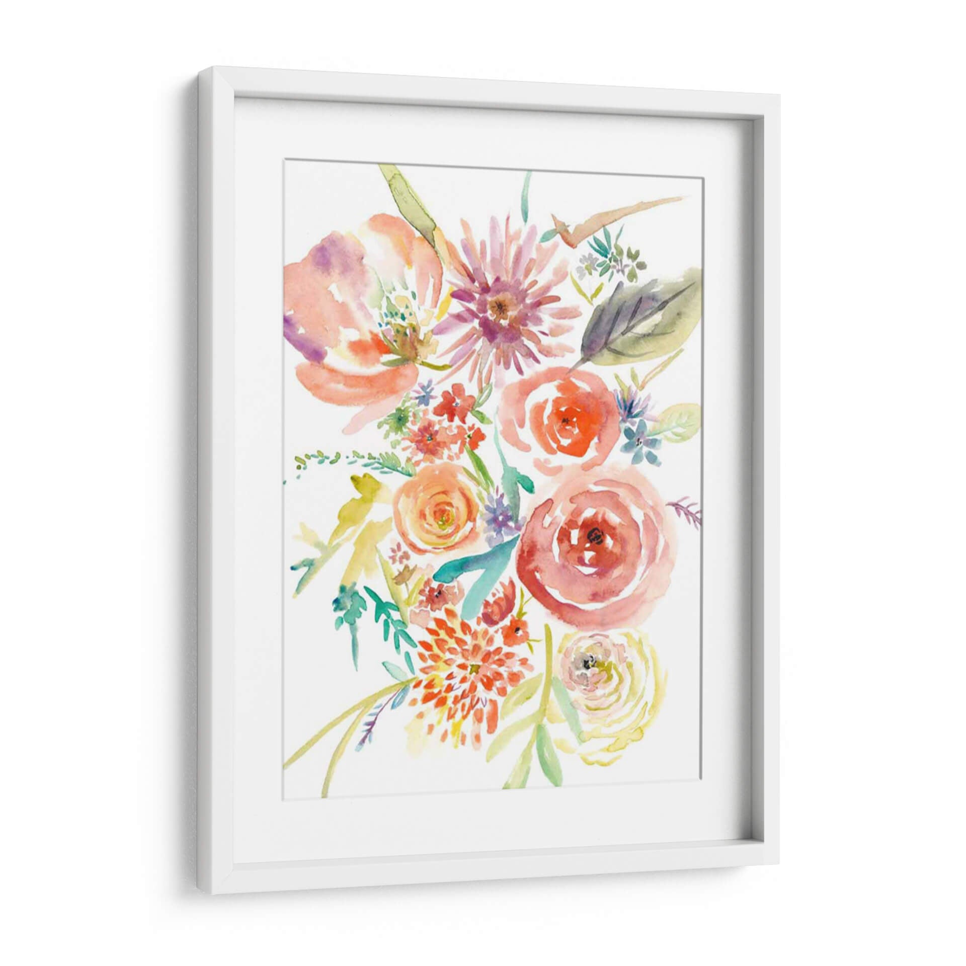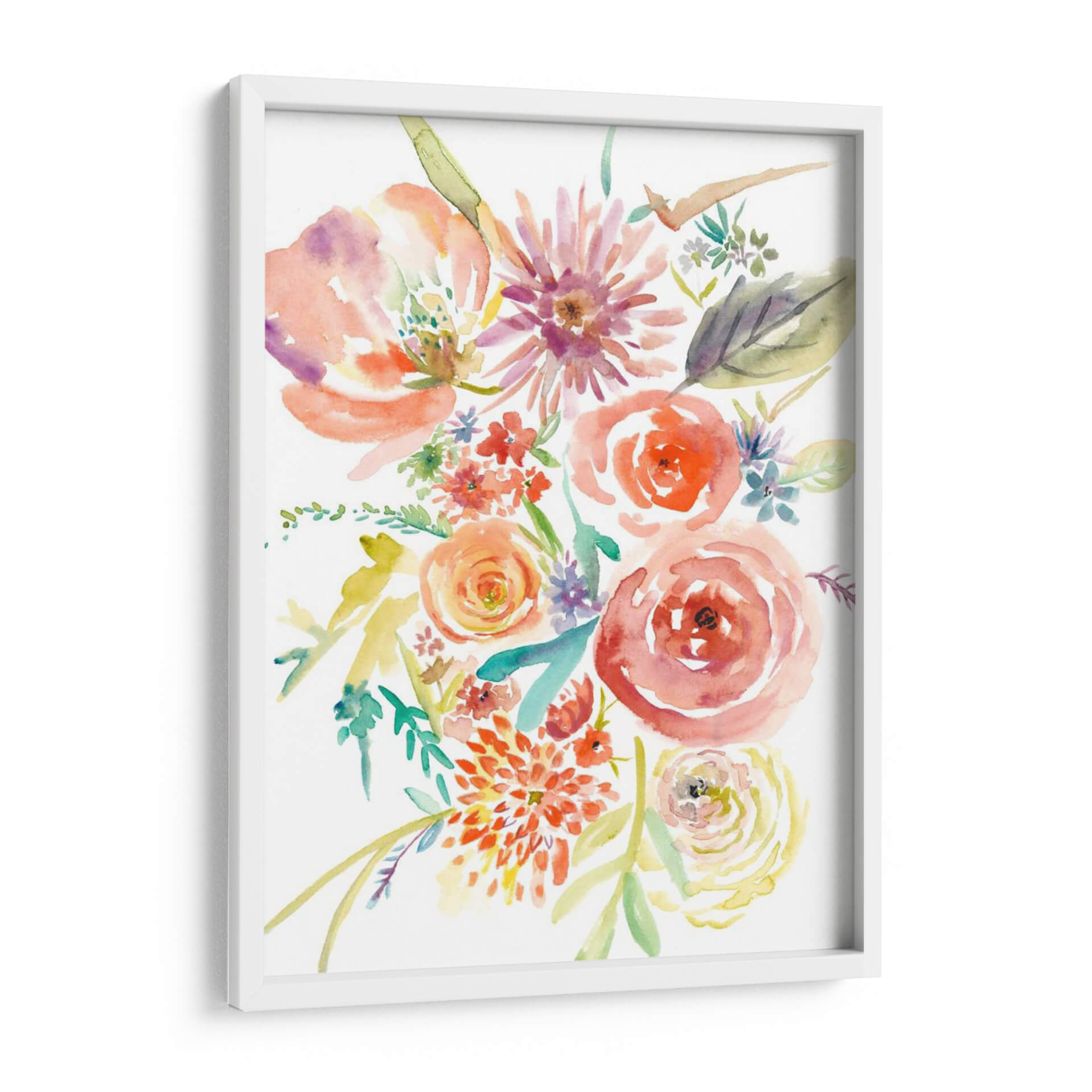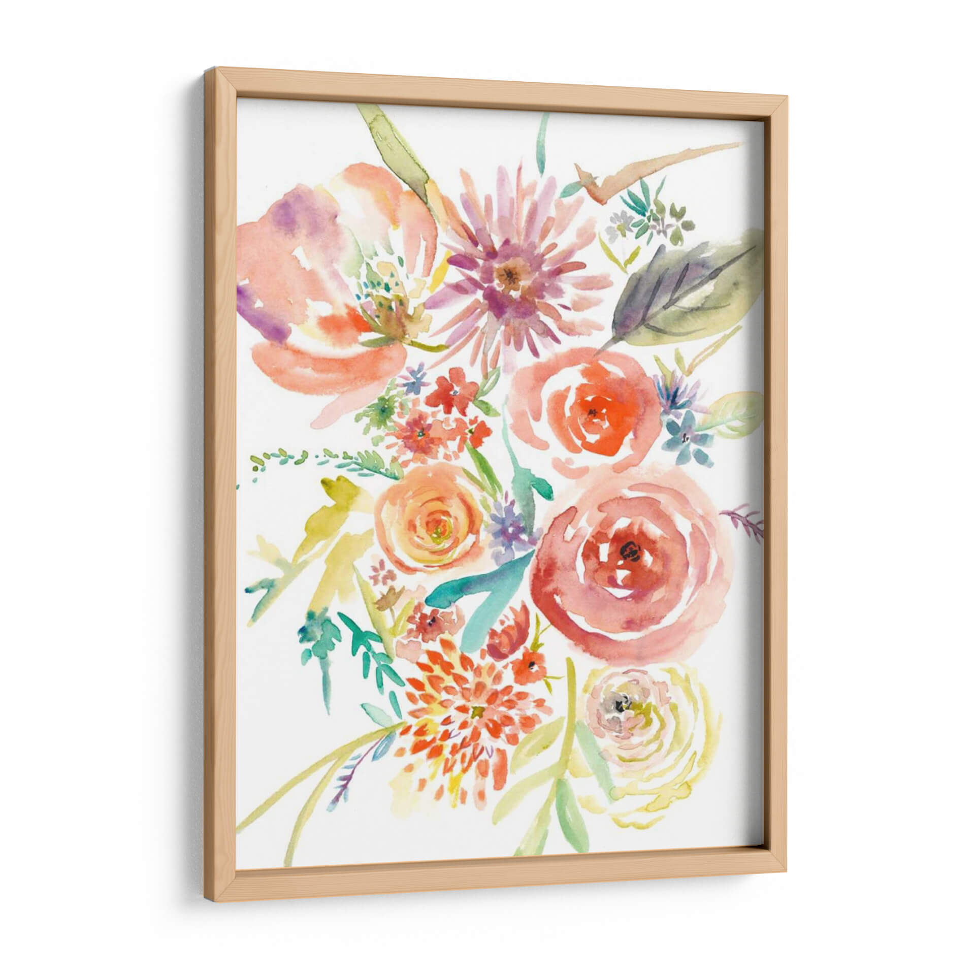 Embellece tu espacio con "Florales Flotantes II", una obra de arte acuarela que captura la delicadeza y el vibrante espíritu de la naturaleza. Este cuadro decorativo presenta un exuberante ramo de flores en tonos cálidos de coral, naranja, rosa y toques de púrpura, magistralmente pintado con la técnica de acuarela que otorga ligereza y fluidez a cada pétalo y hoja. La composición, con sus flores principales detalladas y flores secundarias que danzan alrededor, evoca una sensación de movimiento y alegría. Es una pieza ideal para infundir vitalidad y un toque de frescura en salones, dormitorios o estudios. Su estilo contemporáneo y su paleta de colores alegre la convierten en un punto focal perfecto para interiores modernos o clásicos. La transparencia y las sutiles transiciones de color propias de la acuarela crean una atmósfera etérea y soñadora, invitando a la contemplación y aportando serenidad. Añade un toque de arte floral que celebra la belleza efímera de las flores, transformando cualquier habitación en un oasis de color y estilo. Una elección exquisita para quienes buscan una decoración que transmita optimismo y sofisticación.