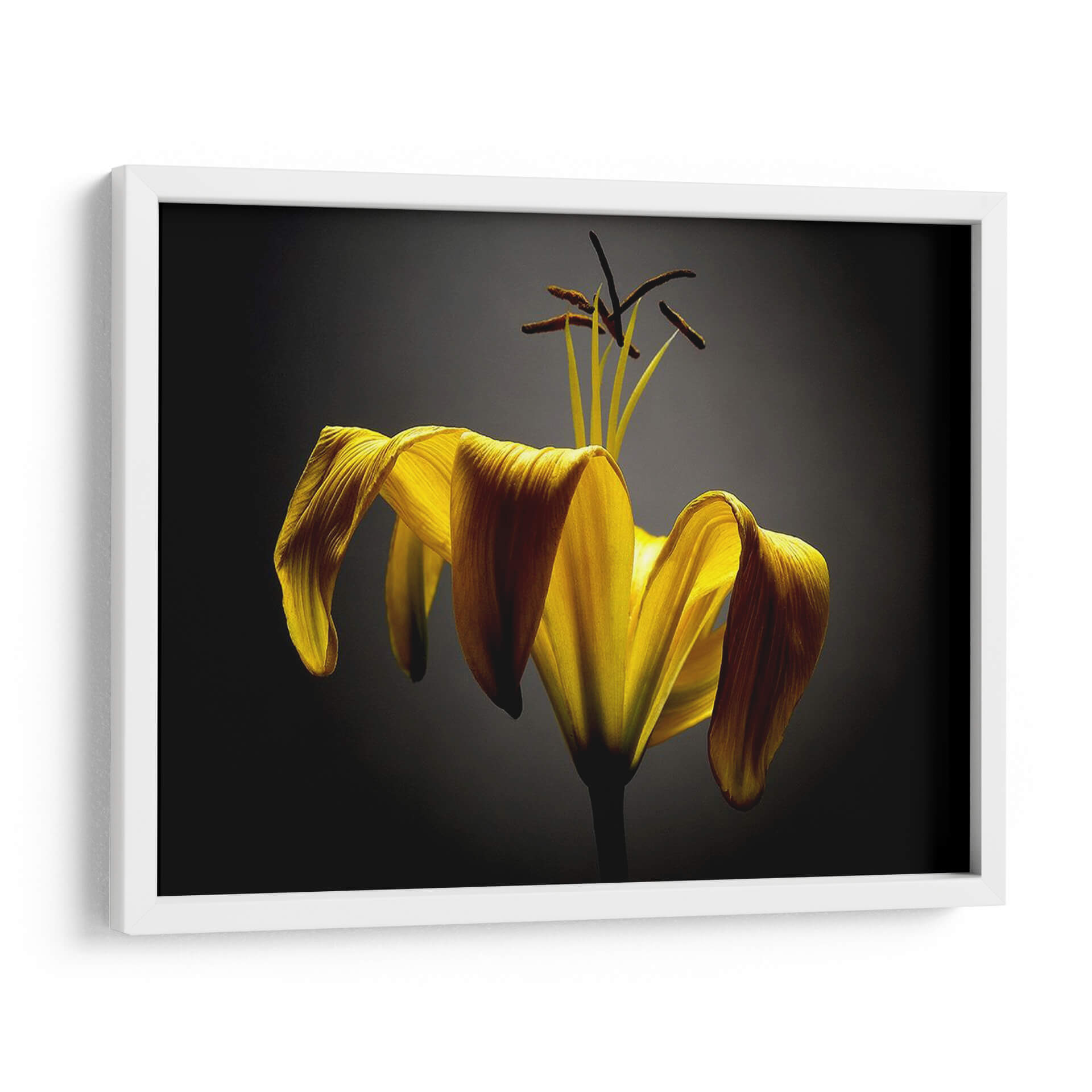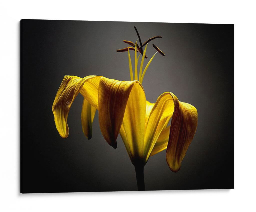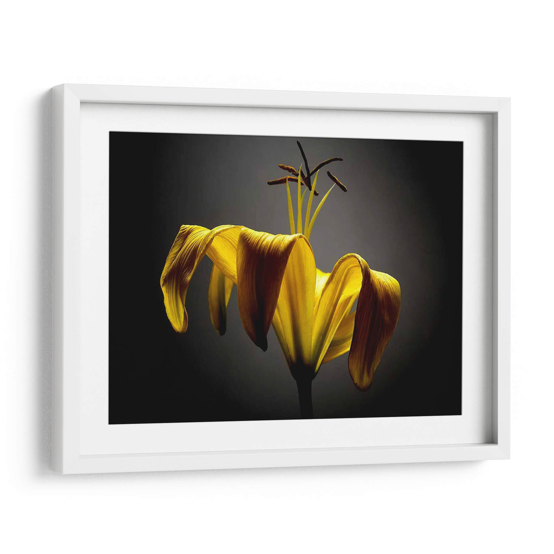 Sumérgete en la belleza melancólica de "Flores De Estudio V", una obra maestra de James McLoughlin que captura la esencia efímera de la naturaleza. Este cuadro decorativo presenta un lirio amarillo vibrante en un estado de delicada decadencia, con pétalos caídos que irradian una calidez dorada contra un fondo de carbón profundo. La iluminación dramática resalta la textura sutil y las suaves curvas de la flor, creando una atmósfera íntima y reflexiva. La composición se centra en la flor, permitiendo que su forma expresiva y su rica paleta de amarillos y marrones dominen el espacio visual. Ideal para añadir un toque de sofisticación botánica a cualquier hogar u oficina, esta pieza evoca una sensación de calma contemplativa y apreciación por la belleza transitoria. Es una adición perfecta para quienes buscan una decoración de pared que inspire introspección y añada un punto focal elegante a salas de estar, dormitorios o estudios. Descubre la poesía visual de las flores capturada en su momento más conmovedor.
