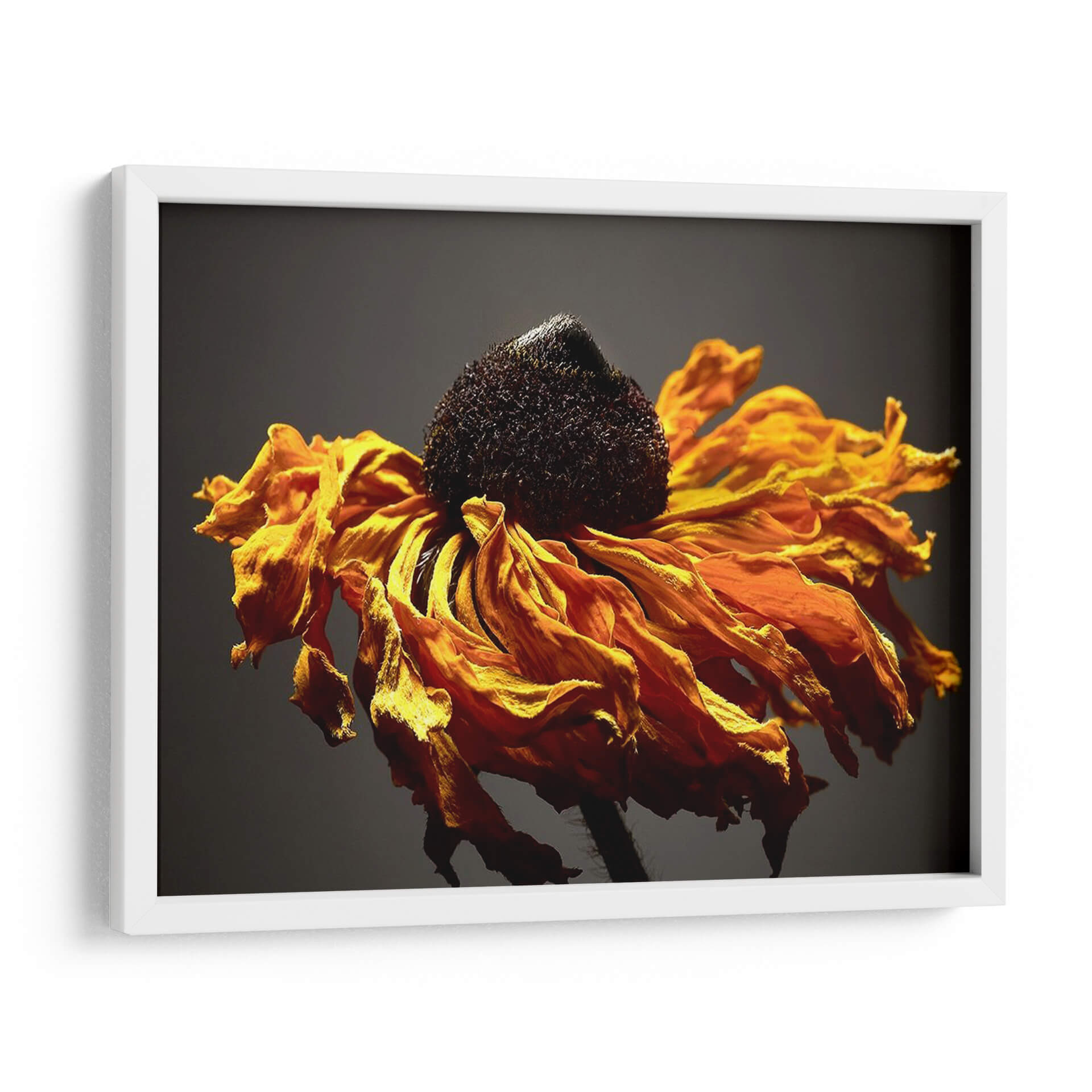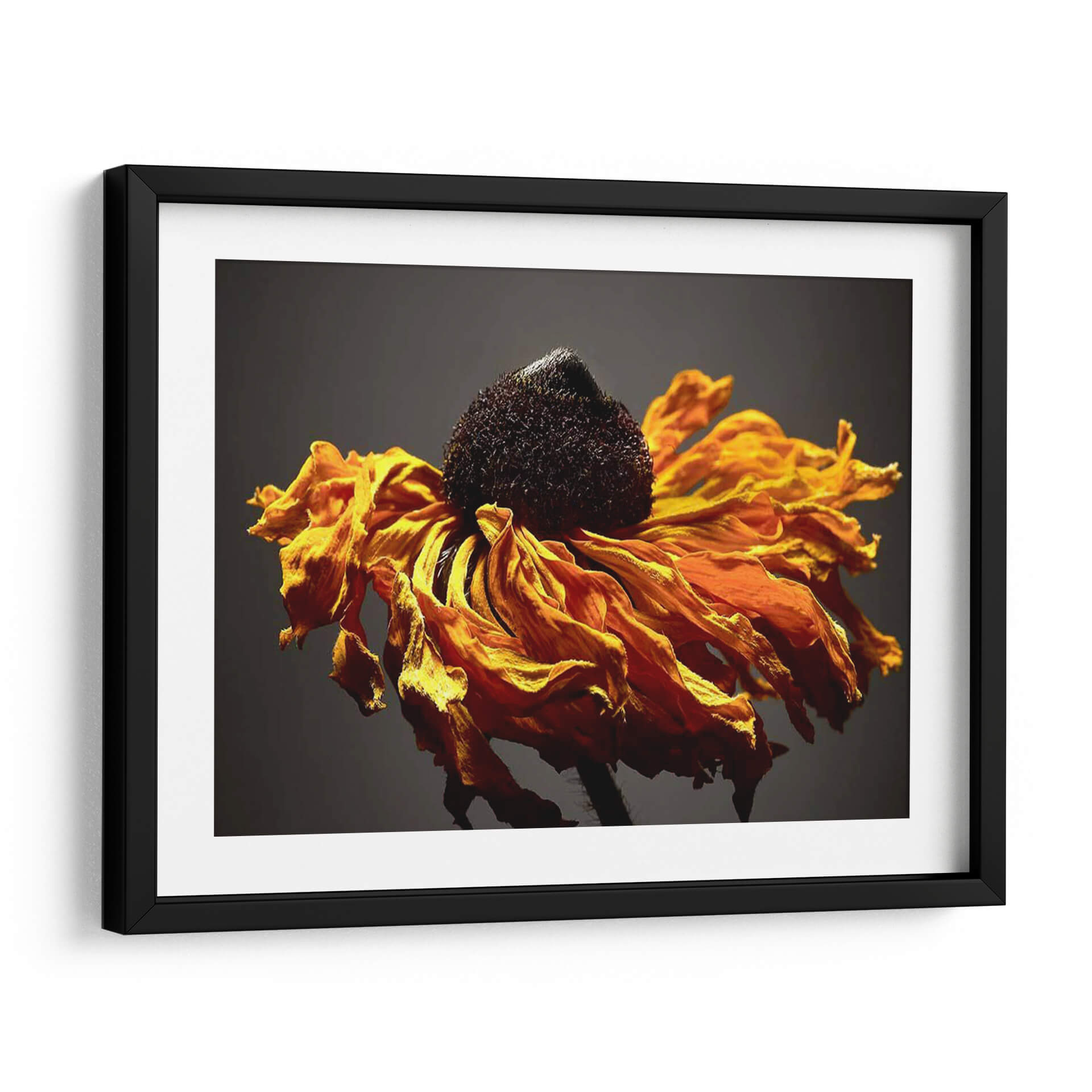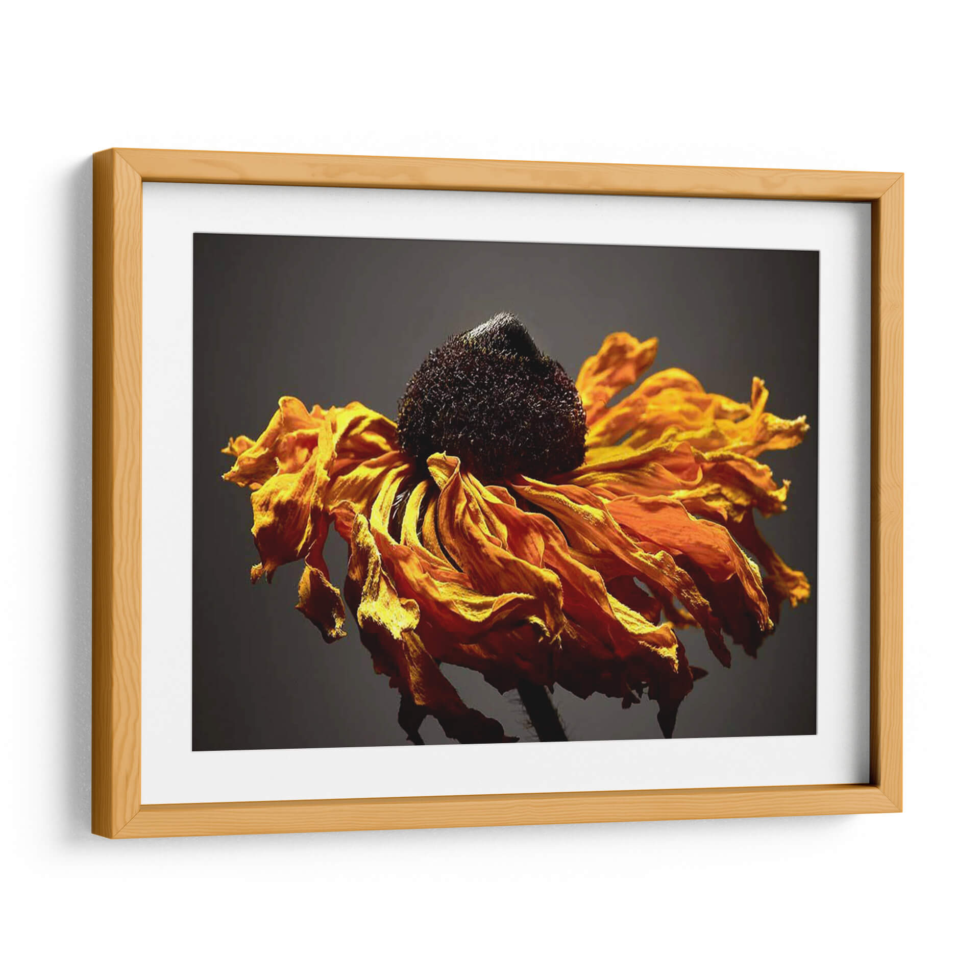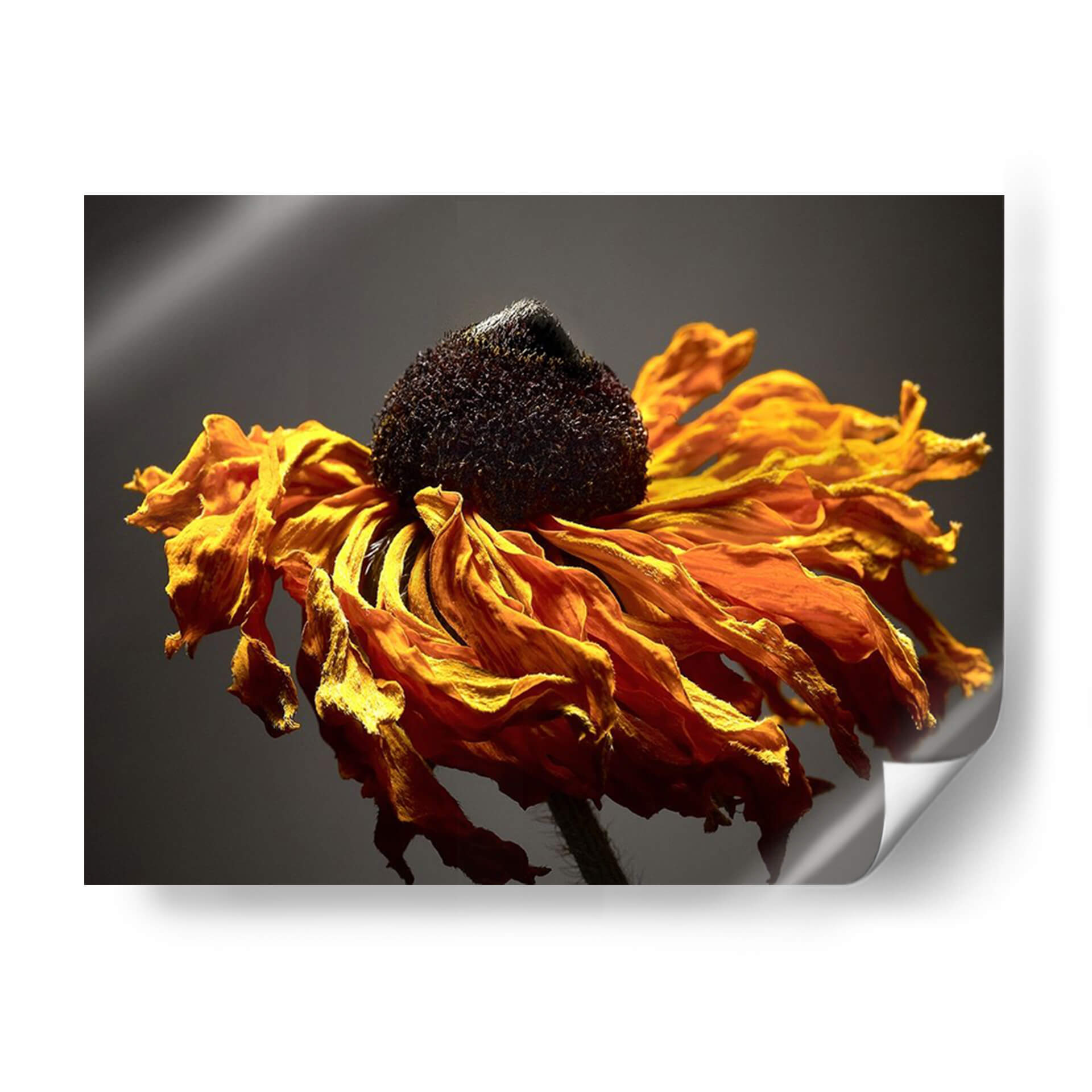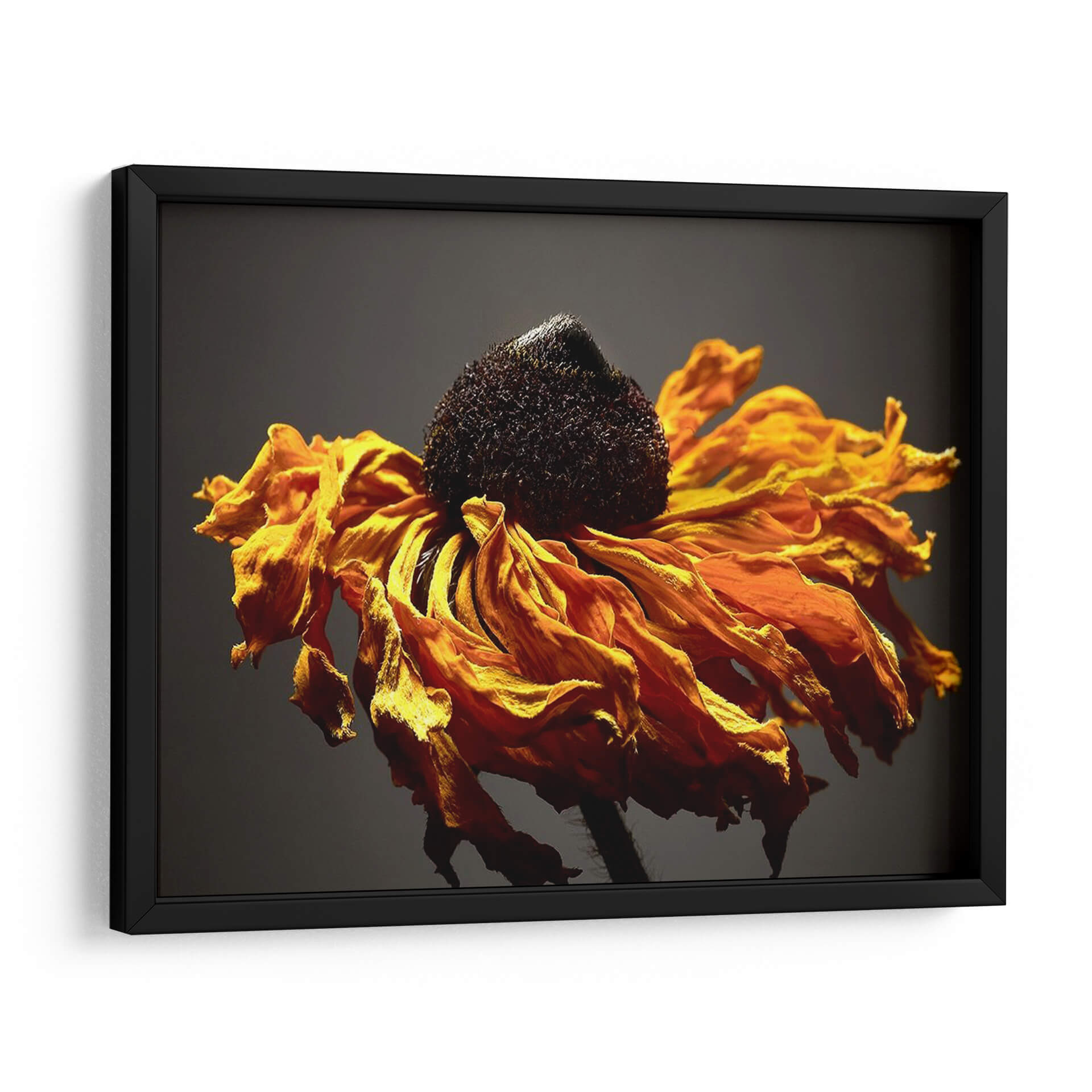 Sumérgete en la belleza melancólica de 'Flores De Estudio Viii', una obra de arte que captura la esencia efímera de la naturaleza con una intensidad cautivadora. Este cuadro decorativo, del artista James McLoughlin, presenta un primer plano de una flor en proceso de secado, cuyas pétalos amarillos y anaranjados, arrugados y deshidratados, evocan una sensación de tiempo y transformación. El contraste entre la textura detallada de los pétalos marchitos y el centro oscuro y aterciopelado de la flor crea una profundidad visual fascinante. La paleta de colores, dominada por cálidos tonos ocres y naranjas sobre un fondo oscuro y sombrío, genera una atmósfera íntima y contemplativa. Esta pieza es ideal para añadir un toque de sofisticación sutil y reflexión a cualquier espacio, ya sea una sala de estar moderna, un estudio tranquilo o un dormitorio acogedor. Su estilo fotográfico y el enfoque en la decadencia natural invitan a la meditación sobre la belleza encontrada en los ciclos de la vida. 'Flores De Estudio Viii' no es solo una decoración de pared, es una invitación a apreciar la imperfección y la elegancia en cada etapa de la existencia, convirtiéndose en un punto focal único y emotivo para tu hogar.