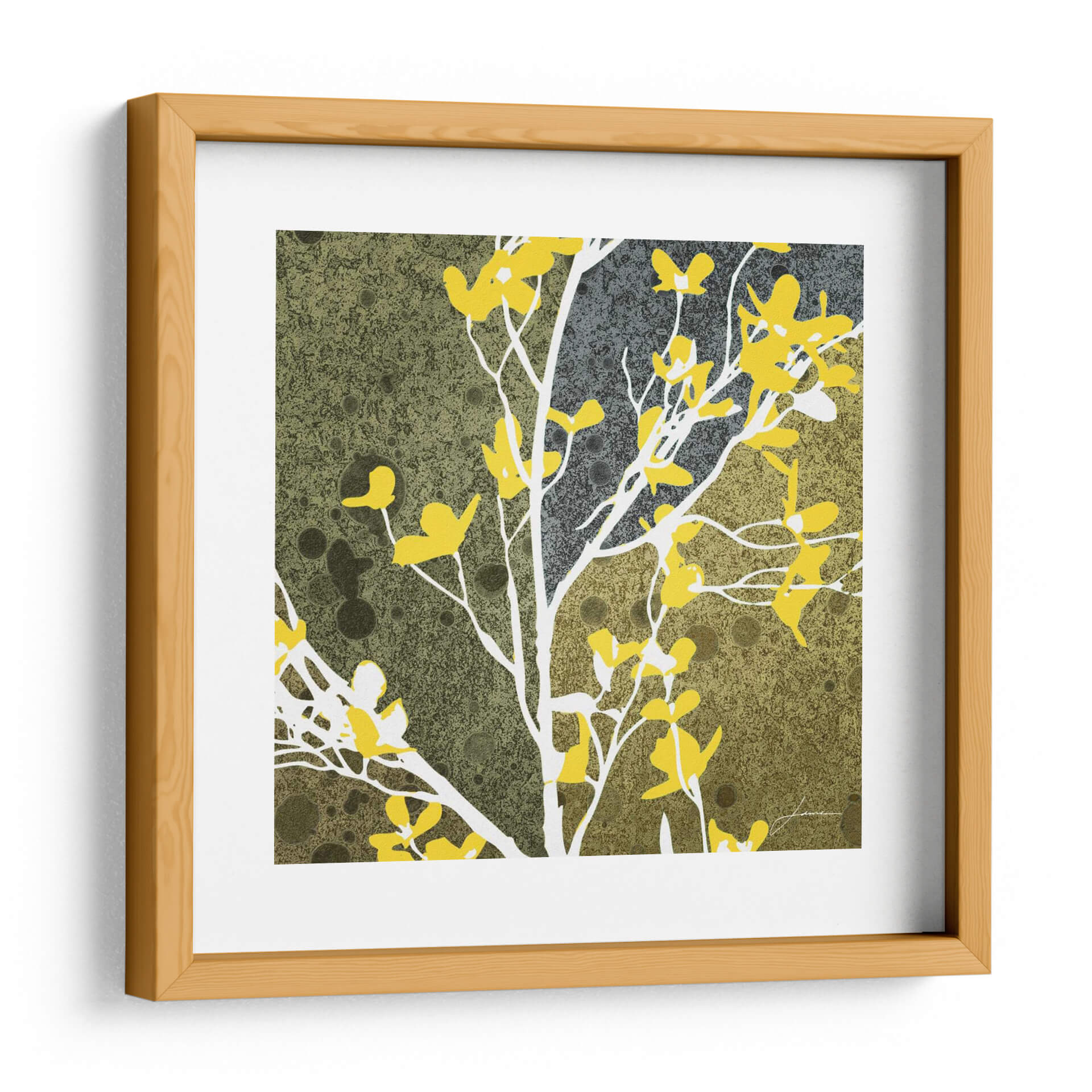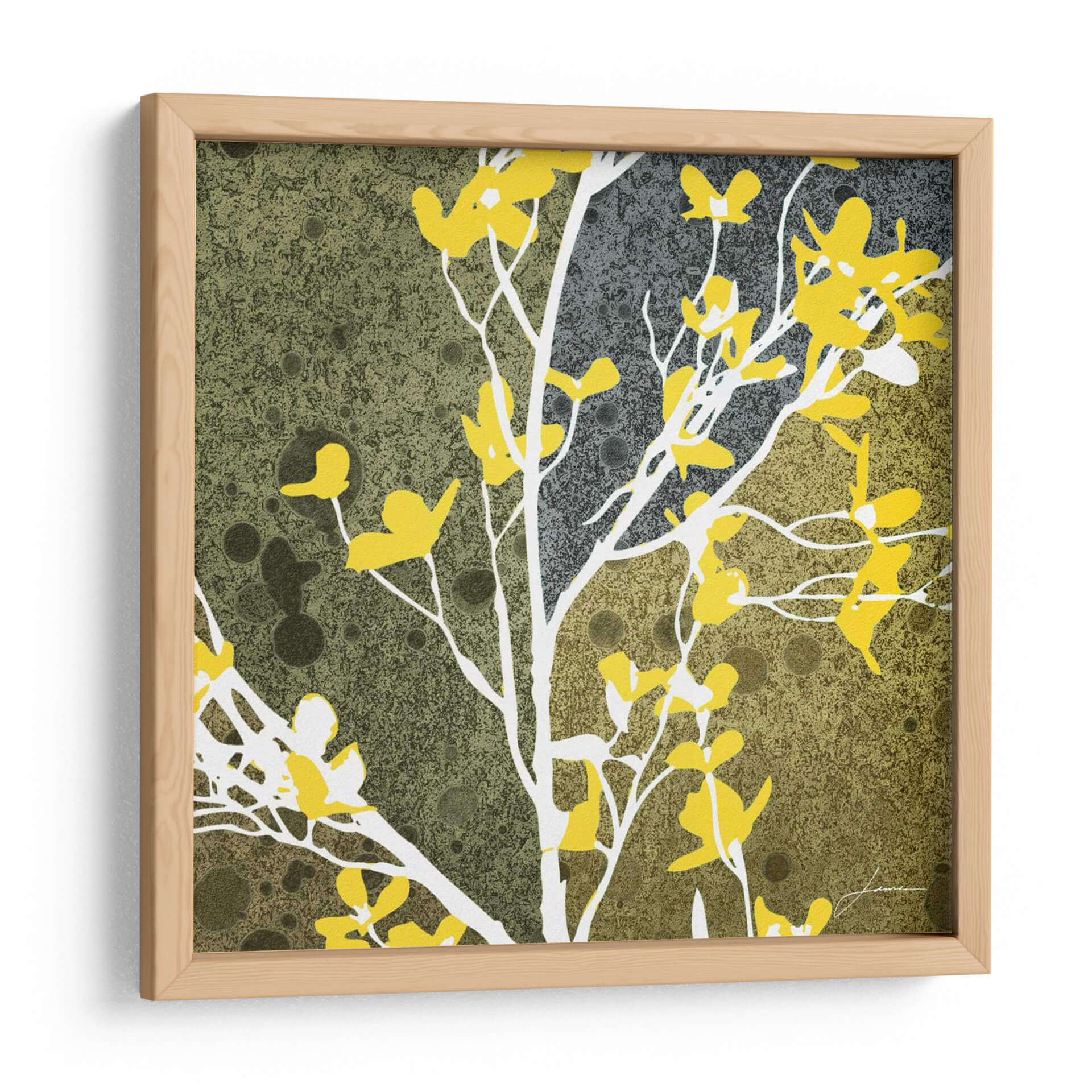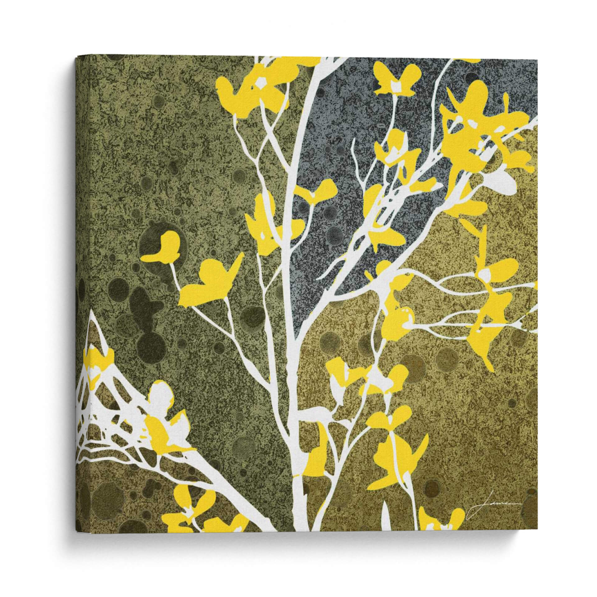 Sumérgete en la enigmática belleza de "Flores De La Luna Iv", una obra de arte contemporáneo que fusiona la delicadeza floral con un trasfondo abstracto y texturizado. Este cuadro decorativo presenta ramas esbeltas en blanco puro que se entrelazan elegantemente, adornadas con vibrantes flores en un tono amarillo intenso y luminoso. El fondo, una composición texturizada que transita entre tonos verdes musgo y grises profundos, crea una atmósfera de misterio y serenidad, evocando la calma de un jardín lunar al anochecer. Las salpicaduras y círculos sutiles en el fondo añaden una dimensión intrigante, sugiriendo un universo propio de texturas y luz. La composición estilizada y la paleta de colores contrastante hacen de "Flores De La Luna Iv" una pieza versátil, perfecta para añadir un toque de sofisticación y color a cualquier espacio. Ideal para salones modernos, dormitorios serenos u oficinas creativas, este cuadro decorativo es una invitación a la contemplación y un punto focal que inspirará conversaciones. La obra captura la esencia efímera de la naturaleza con un toque artístico audaz, haciendo de cada mirada una nueva experiencia.