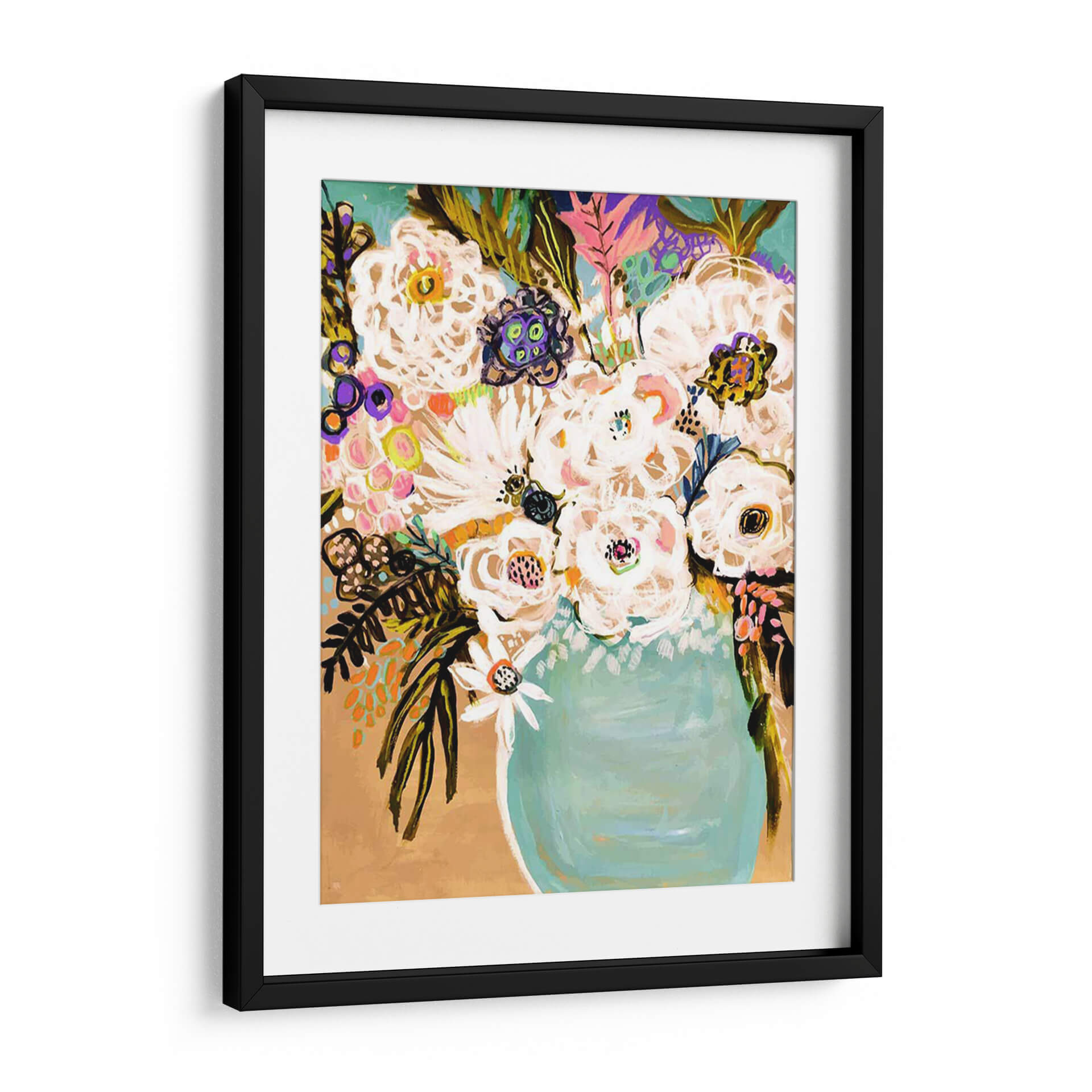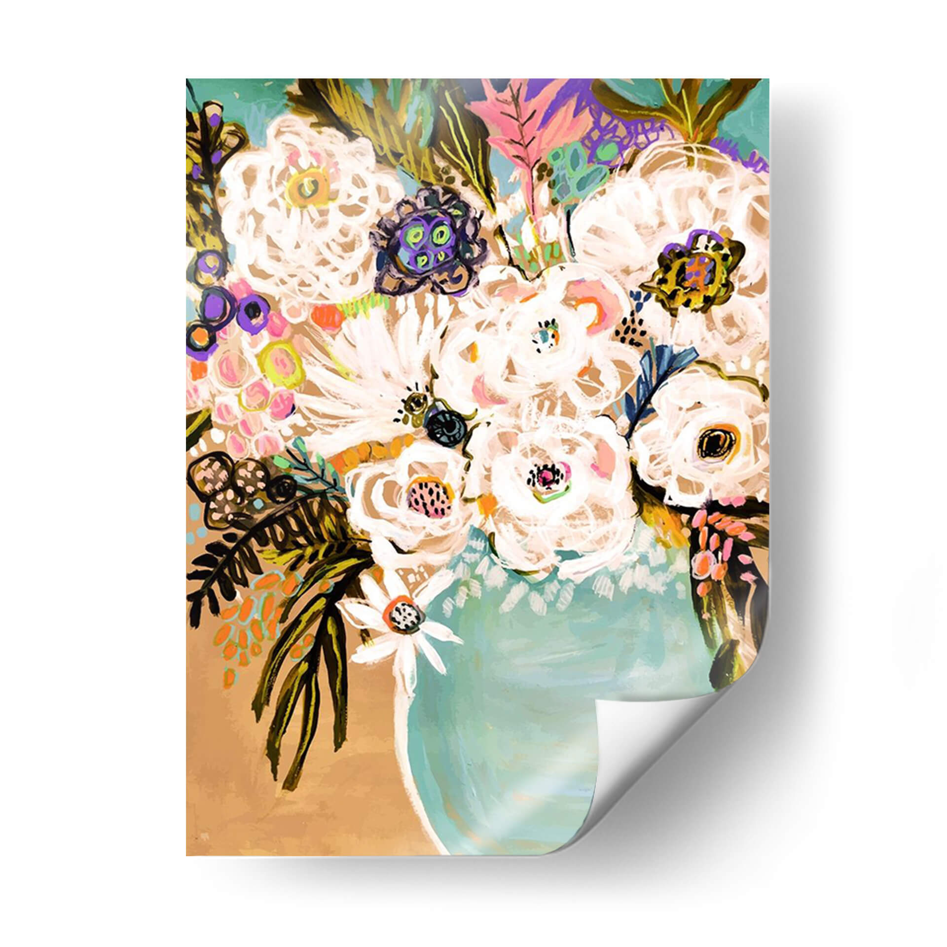 Inunde su hogar con la vibrante energía de "Flores De Verano En Un Jarrón I", una obra de arte contemporáneo que celebra la belleza de la naturaleza con un estilo audaz y expresivo. Creada por la talentosa Karen Fields, esta pieza presenta un exuberante ramo de flores blancas y coloridas dispuestas en un jarrón turquesa, sobre un fondo cálido y terroso. La técnica de pintura gestual y la paleta de colores vibrantes, que incluye toques de púrpura, rosa, naranja y verde azulado, crean una atmósfera alegre y optimista, perfecta para iluminar cualquier espacio. Los trazos enérgicos y las formas estilizadas otorgan a la obra un dinamismo cautivador, invitando a la contemplación y al disfrute. Este cuadro decorativo es ideal para añadir un punto focal de color y vitalidad a su sala de estar, comedor o incluso una oficina, transformando cualquier habitación en un oasis de frescura y estilo. La composición, centrada en el arreglo floral, es a la vez clásica y moderna, asegurando que esta pieza sea una adición atemporal a su decoración. Descubra la alegría y la frescura que "Flores De Verano En Un Jarrón I" puede aportar a su vida.