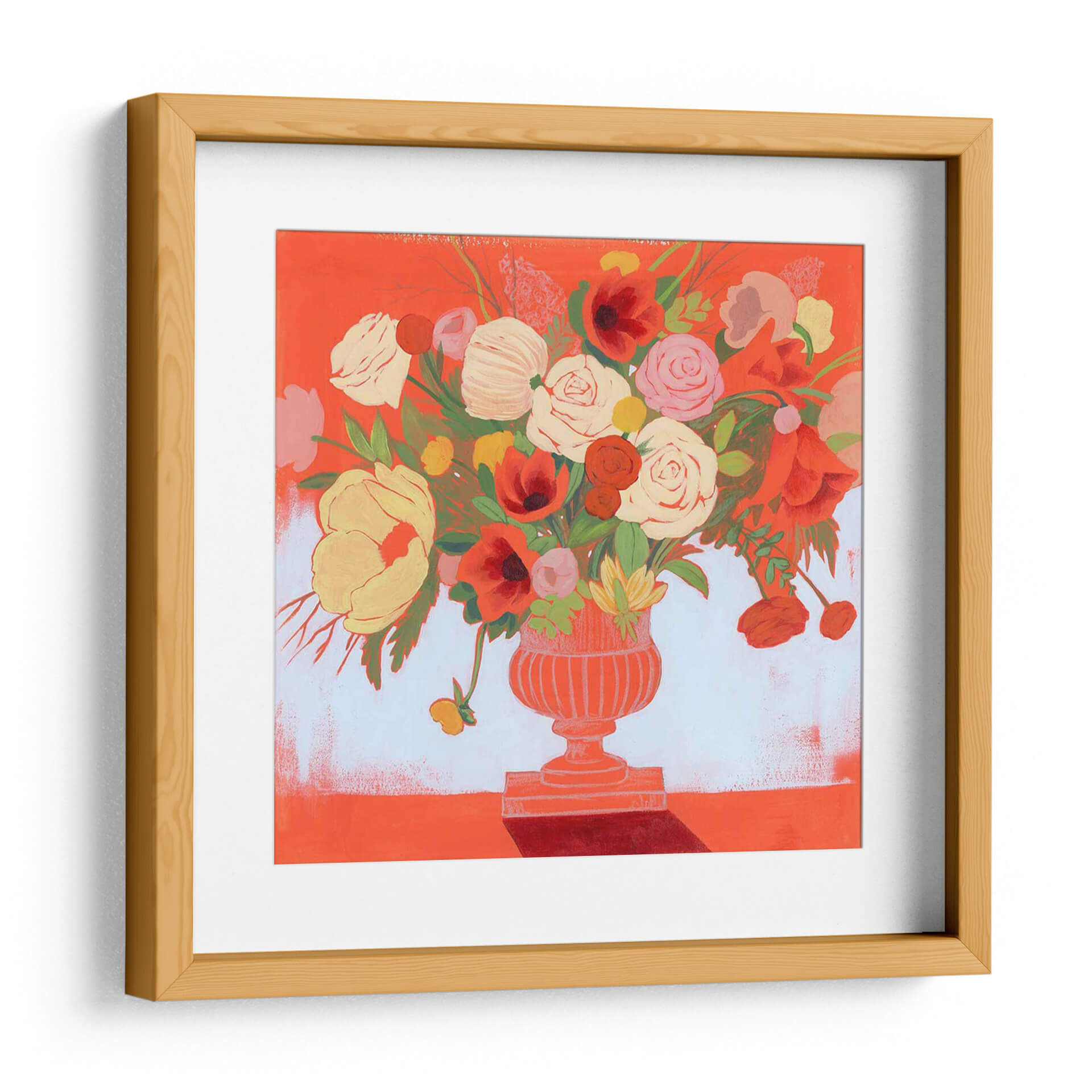 Sumérgete en la vibrante explosión de color y vida que ofrece "Flores En El Fuego II" de Grace Popp. Esta cautivadora obra de arte, con su audaz paleta de naranjas encendidos y toques de rosas, blancos y rojos intensos, captura la esencia efímera de un ramo en pleno apogeo. La composición, que presenta un jarrón clásico en el centro, se ve realzada por un fondo abstracto y texturizado en un suave azul pálido, creando un contraste dinámico que hace que las flores parezcan danzar. El estilo de Popp, con pinceladas sueltas y expresivas, transmite una sensación de energía y espontaneidad, invitando a la contemplación y la alegría. Este cuadro decorativo es perfecto para añadir un punto focal vibrante y sofisticado a cualquier sala de estar, comedor o estudio, infundiendo al espacio calidez y un toque de elegancia artística. "Flores En El Fuego II" no es solo una pieza decorativa, sino una celebración de la belleza natural y la pasión artística, lista para transformar tu hogar en una galería personal. Ideal para quienes buscan arte contemporáneo que hable de vitalidad y estilo.