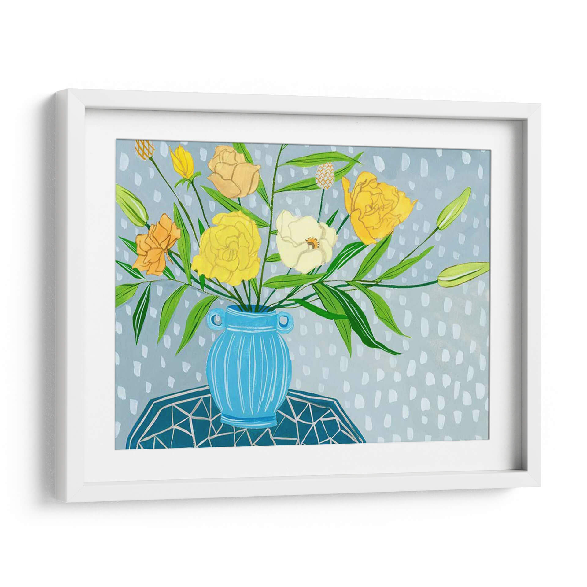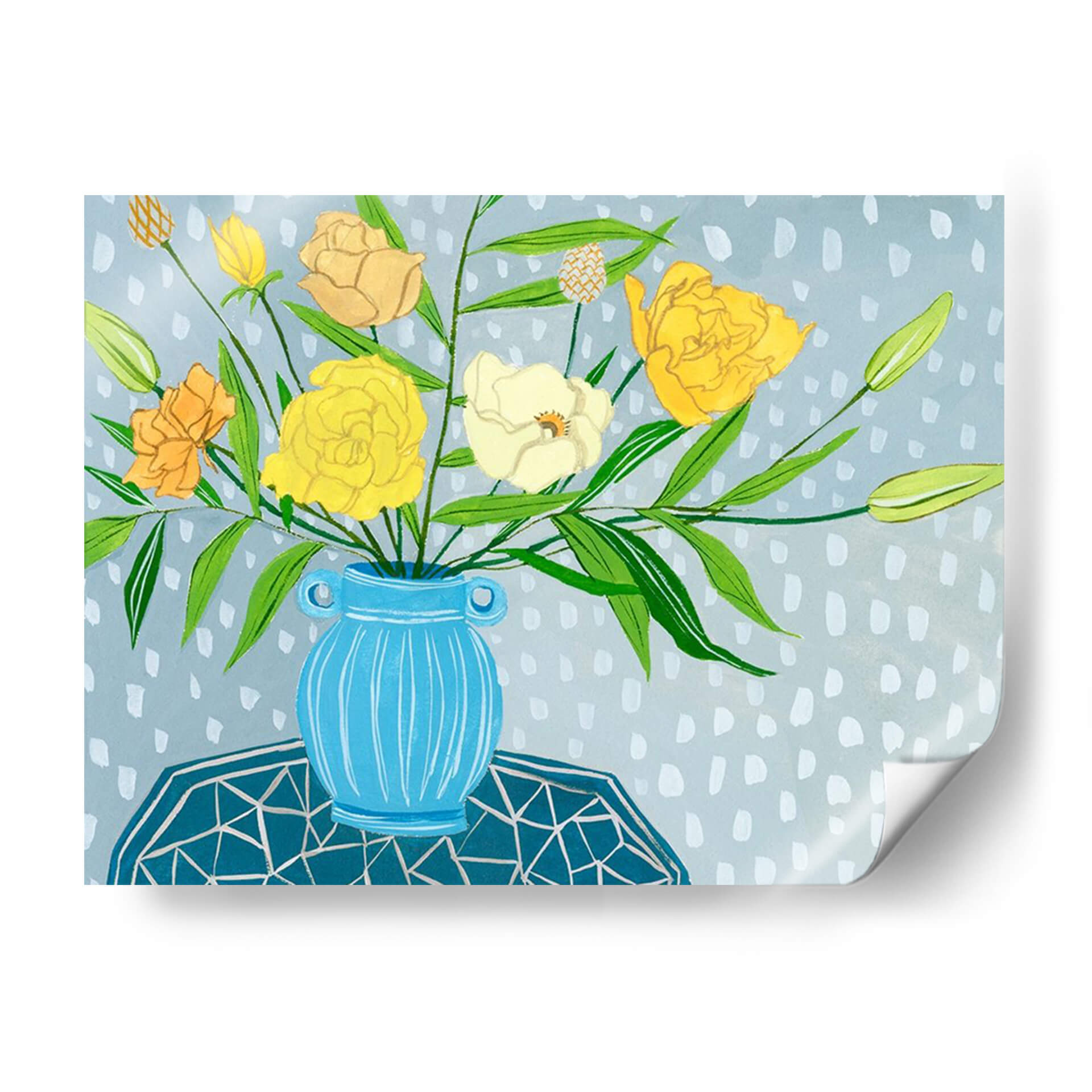 Embellece tu hogar con el encantador cuadro decorativo 'Flores En Jarrón Ii' de Melissa Wang. Esta obra de arte contemporáneo captura la belleza de un vibrante ramo de flores amarillas y naranjas, dispuestas elegantemente en un jarrón azul sobre una mesa con un diseño geométrico. El fondo, de un sereno tono azul claro salpicado de delicadas manchas blancas, crea una atmósfera aireada y luminosa, perfecta para cualquier estancia. El estilo distintivo de Wang, con trazos audaces y una paleta de colores optimista, aporta un toque de frescura y alegría a tu decoración. Ideal para la sala de estar, el comedor o incluso un dormitorio, este cuadro decorativo es una pieza versátil que infunde vitalidad y sofisticación. Su composición equilibrada y sus colores cálidos invitan a la contemplación y a la apreciación de la belleza floral en su máxima expresión. Añade un toque de arte moderno y natural a tus paredes con esta pieza única que transformará tu espacio en un oasis de color y estilo.