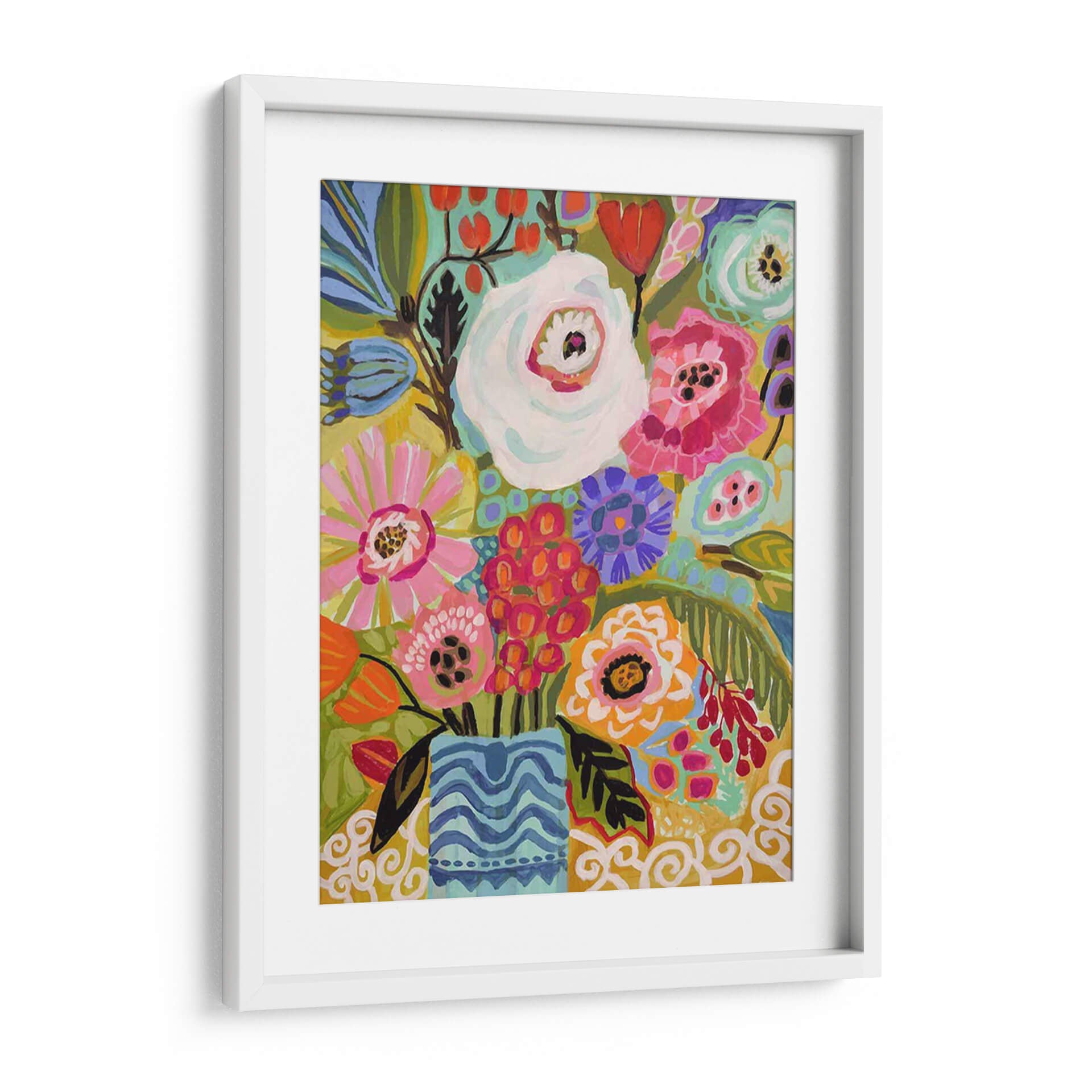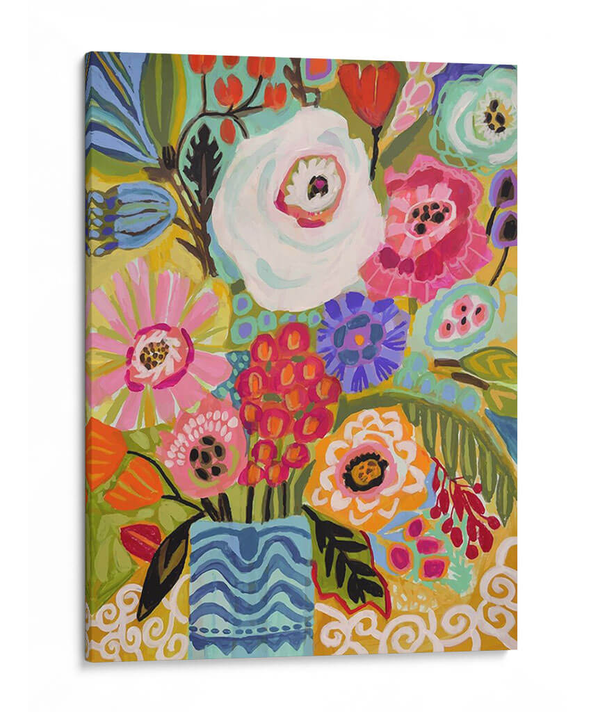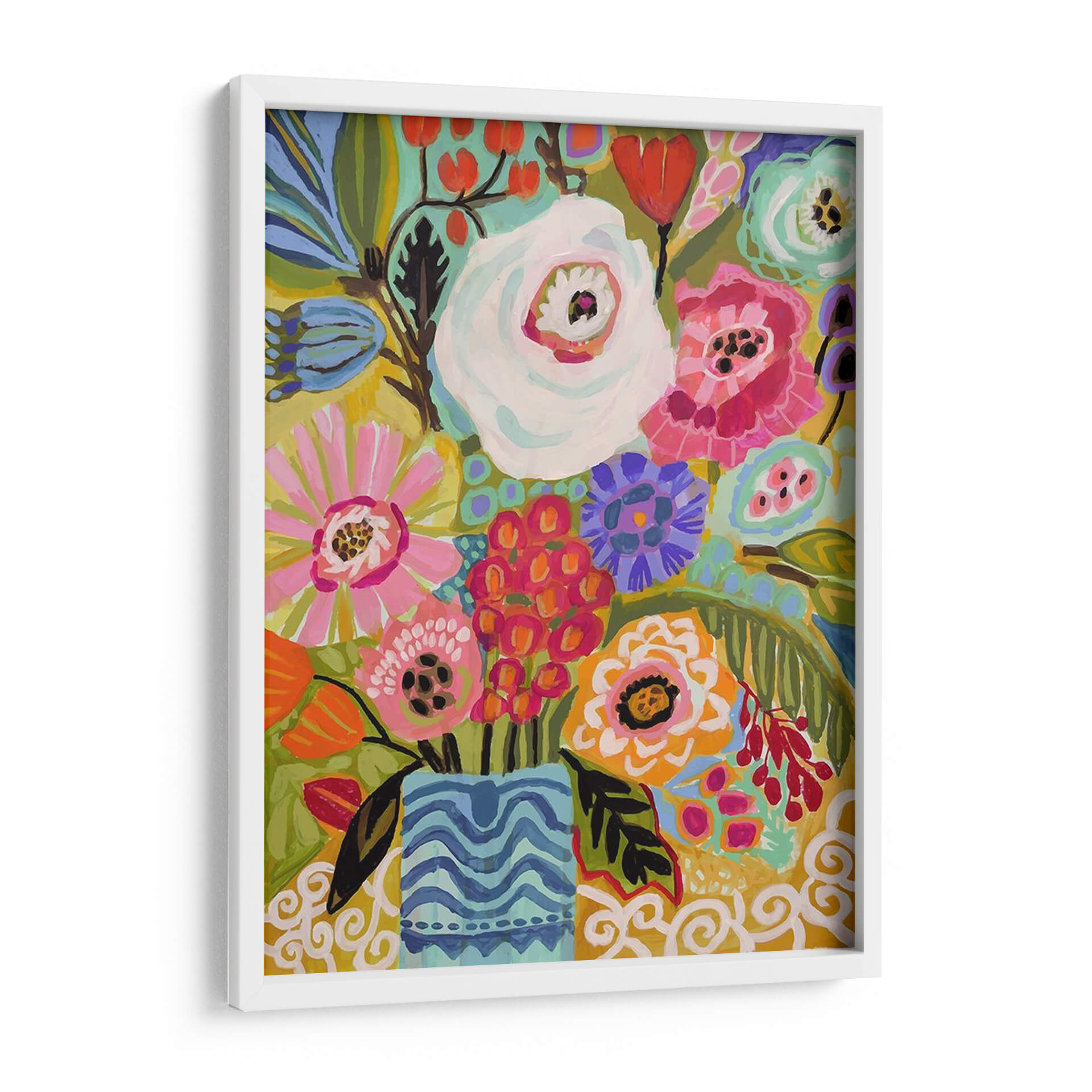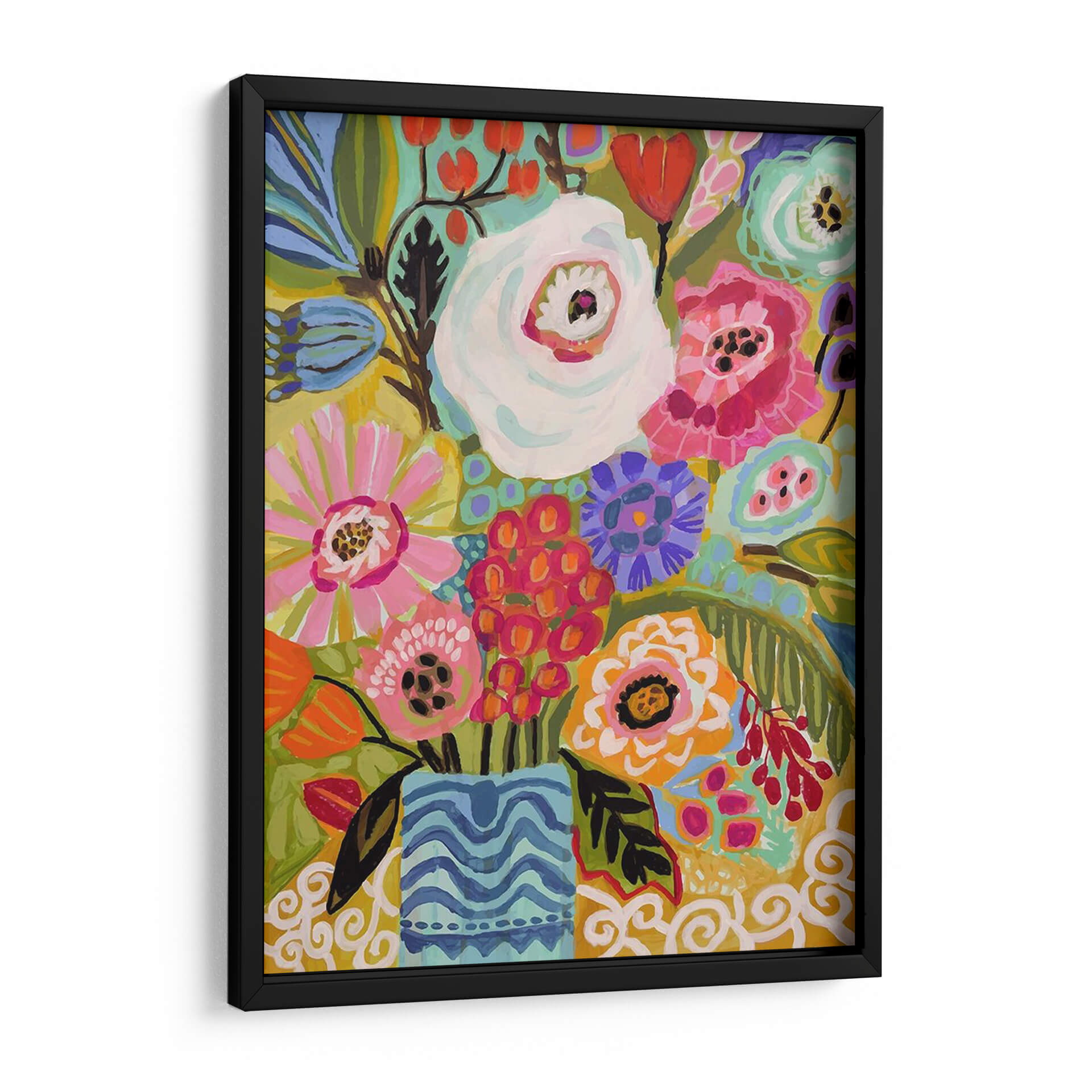 Embellece tu espacio con la vibrante y alegre obra 'Flores Frescas En Jarrón II' de Karen Fields. Este cautivador cuadro decorativo es una explosión de color y vida, presentando un exuberante arreglo floral que irradia energía positiva. La artista utiliza una paleta de colores audaz y juguetona, con tonos vibrantes de rosa, naranja, azul, verde y amarillo que capturan la esencia de un jardín en plena floración. Las pinceladas audaces y expresivas añaden textura y profundidad, creando una composición dinámica que atrae la mirada. Cada flor está representada con un encanto único, desde las grandes y llamativas flores blancas y fucsias hasta los delicados racimos de bayas rojas y las flores azules y púrpuras. El jarrón, con su distintivo patrón de ondas azules, ancla la composición y añade un toque de modernidad. Ideal para iluminar cualquier habitación, este cuadro es perfecto para salas de estar, comedores, oficinas o cualquier lugar que necesite un toque de alegría y sofisticación. Añade un toque de arte contemporáneo y optimismo a tu hogar con esta pieza inspiradora que celebra la belleza de la naturaleza en su máxima expresión.