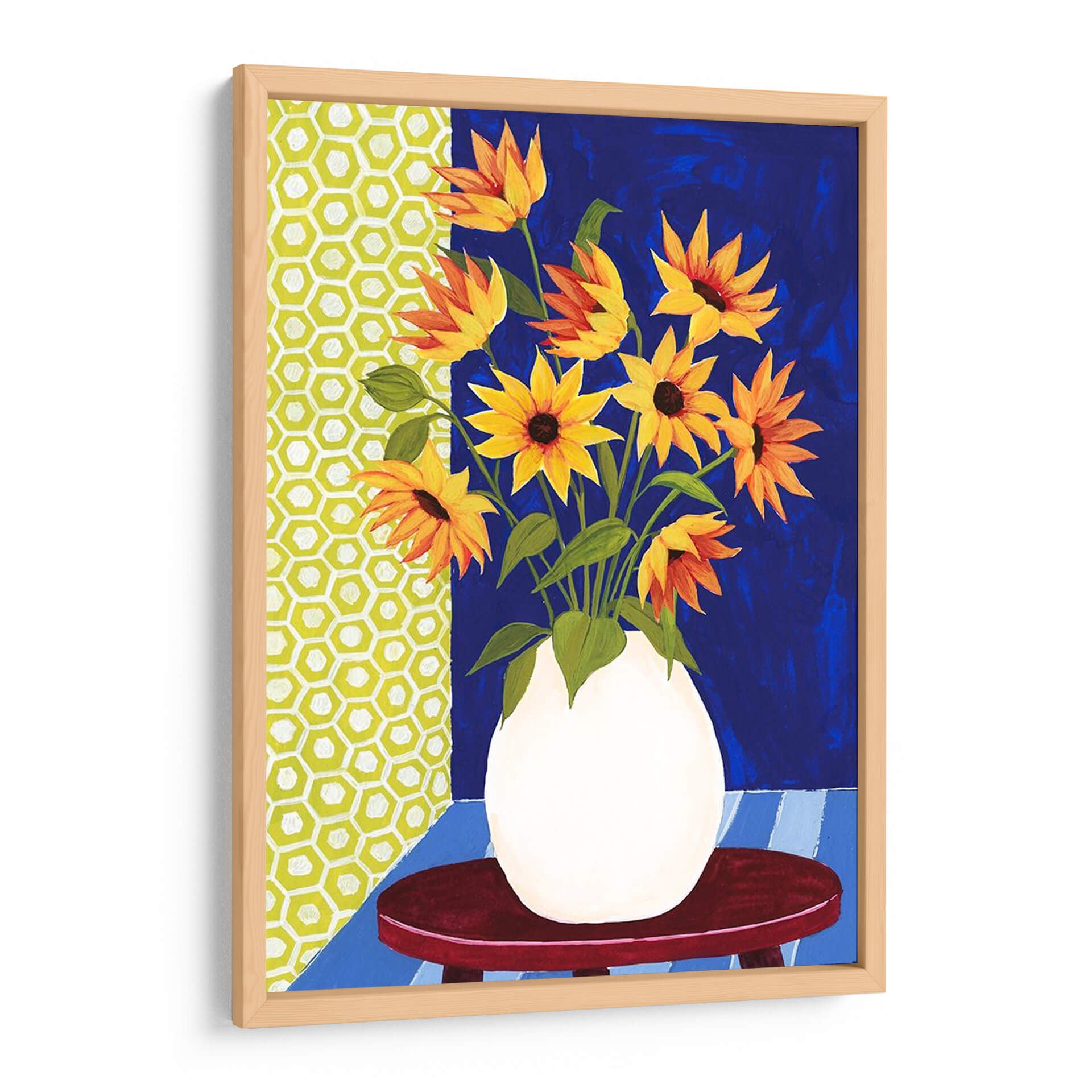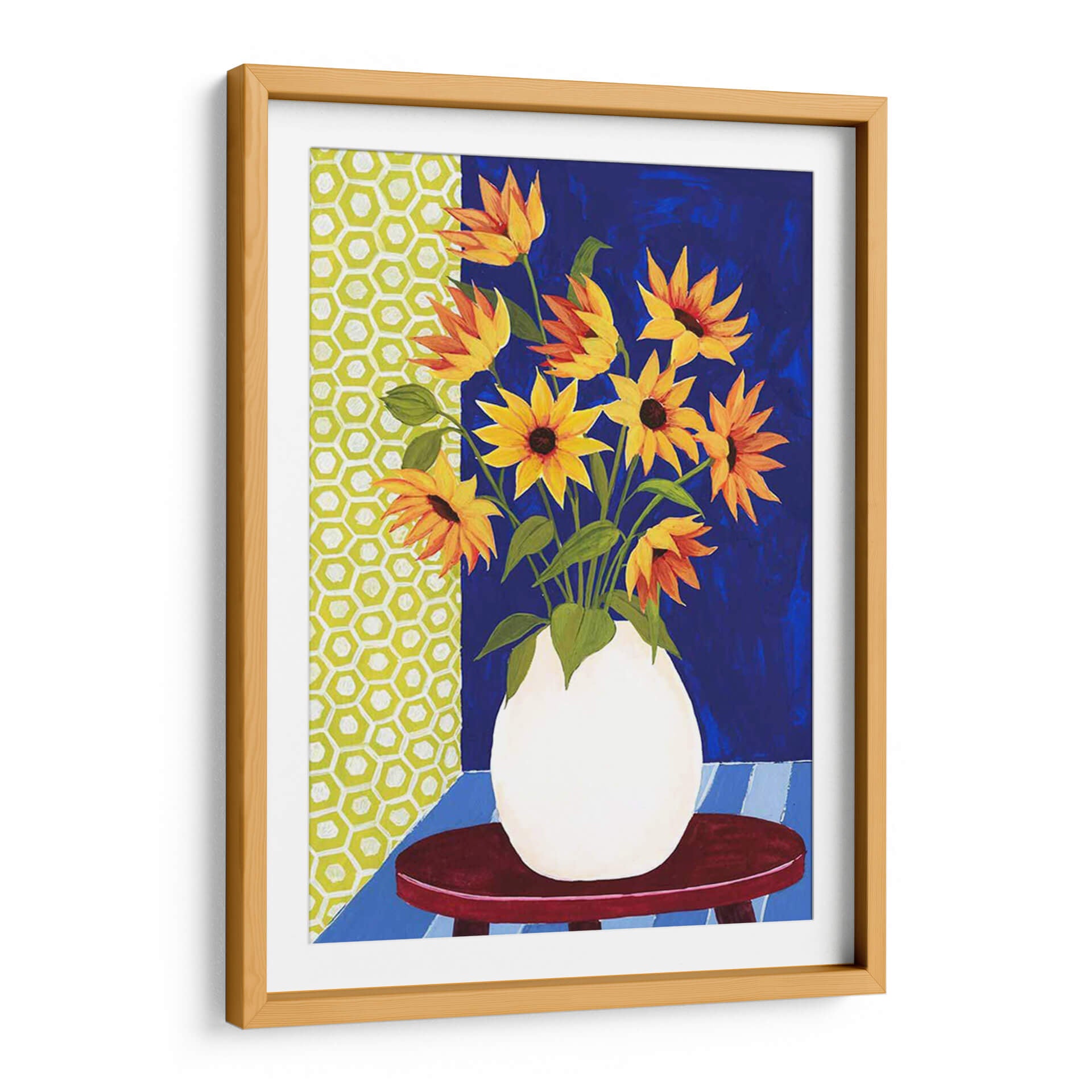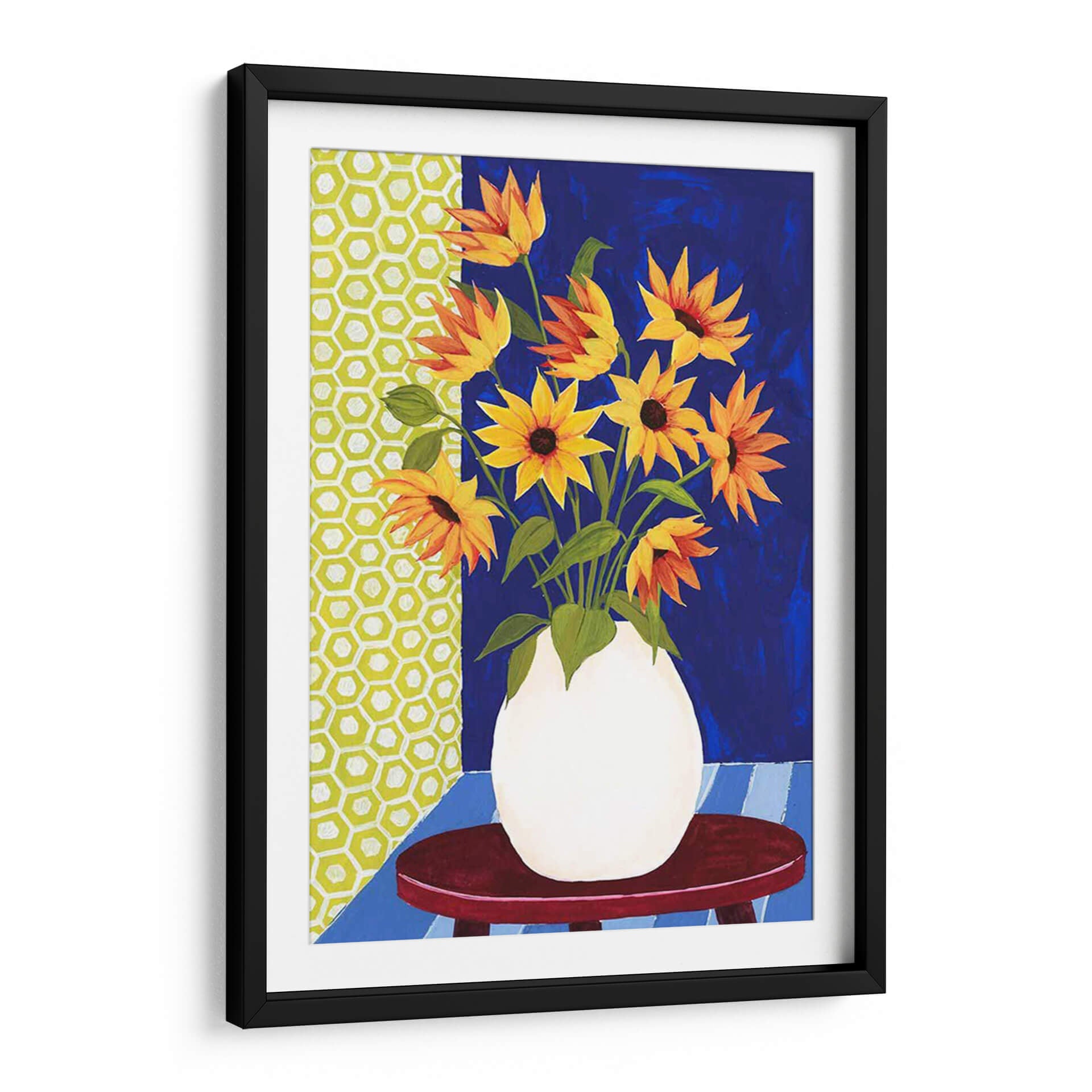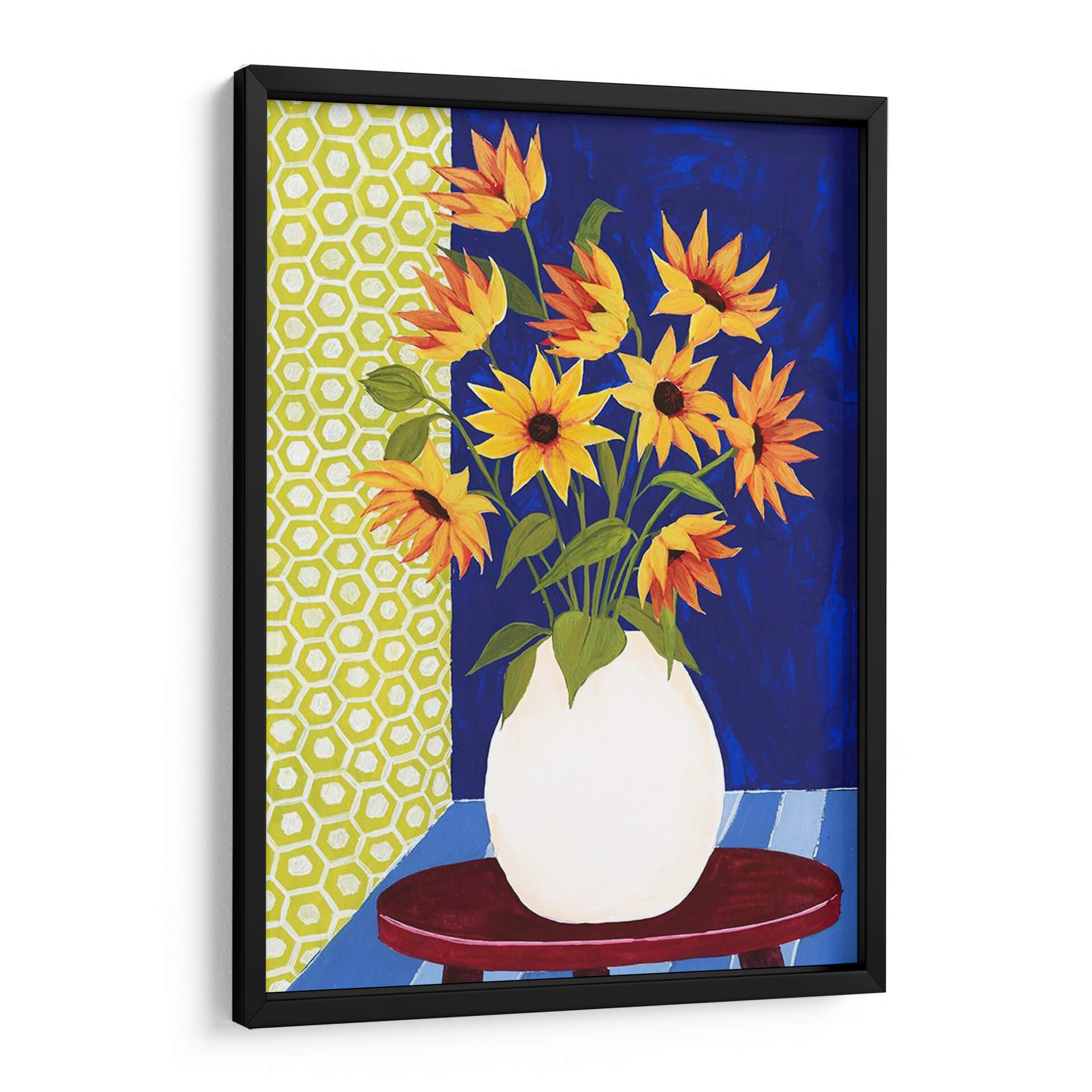 Transforma tu espacio con el vibrante cuadro decorativo "Flores Para El Viernes I" de Grace Popp. Esta obra cautivadora presenta un arreglo floral de girasoles radiantes en tonos amarillos y naranjas intensos, dispuestos en un jarrón blanco sobre un fondo azul profundo y enérgico. A la izquierda, un patrón geométrico en tonos verdes crea un contraste visual fascinante, aportando un toque moderno y fresco. La pincelada audaz y expresiva de Popp infunde vida y movimiento a las flores, celebrando la belleza de la naturaleza con una perspectiva contemporánea. Este cuadro decorativo es perfecto para añadir un estallido de color y alegría a cualquier habitación, desde la sala de estar hasta un estudio o una oficina. Su composición dinámica y su paleta de colores vibrantes invitan a la contemplación y la celebración, convirtiéndose en un punto focal que atrae todas las miradas y eleva la decoración de tu hogar. Ideal para quienes buscan arte que transmita optimismo y vitalidad, "Flores Para El Viernes I" es una elección excepcional para dar vida a tus paredes y reflejar tu personalidad.