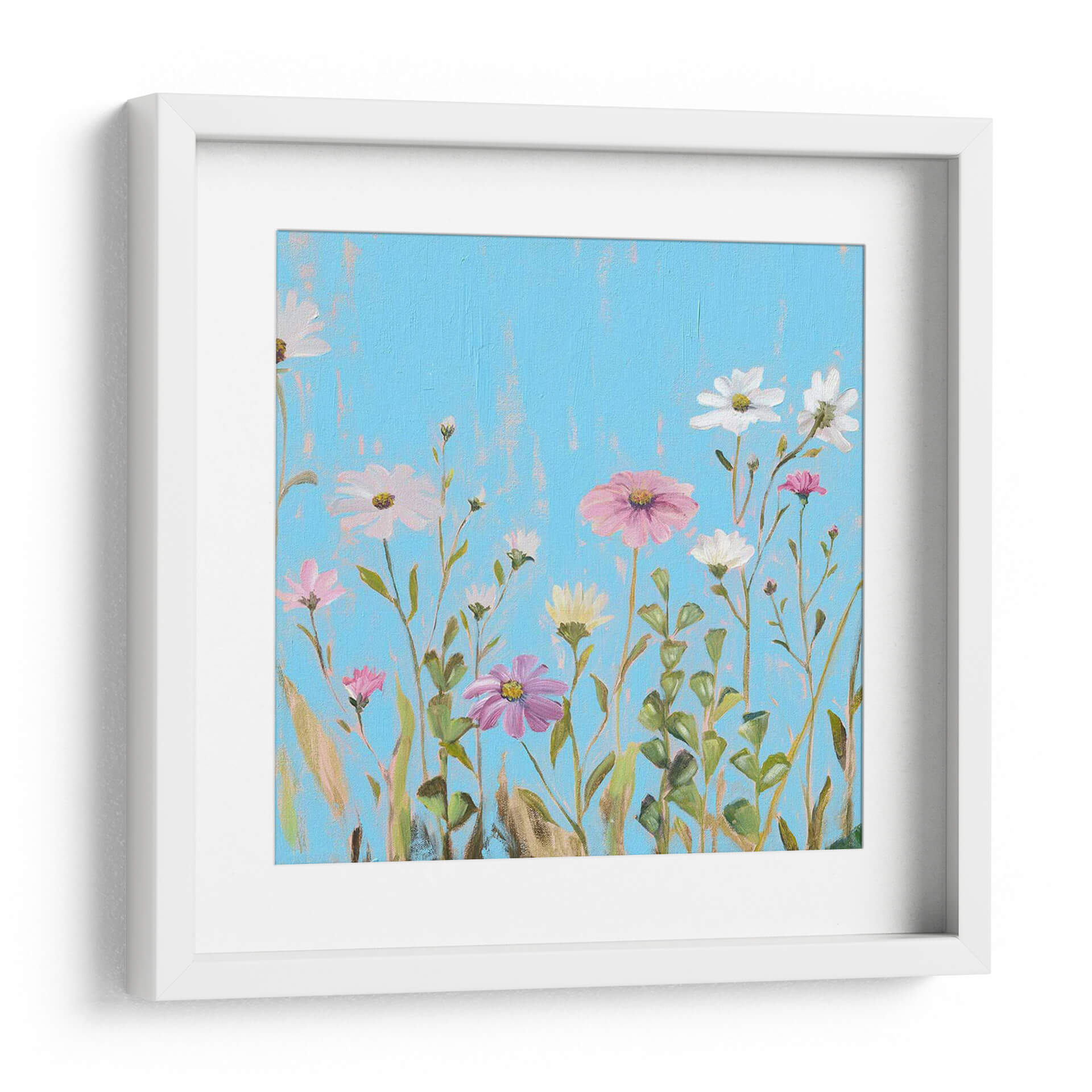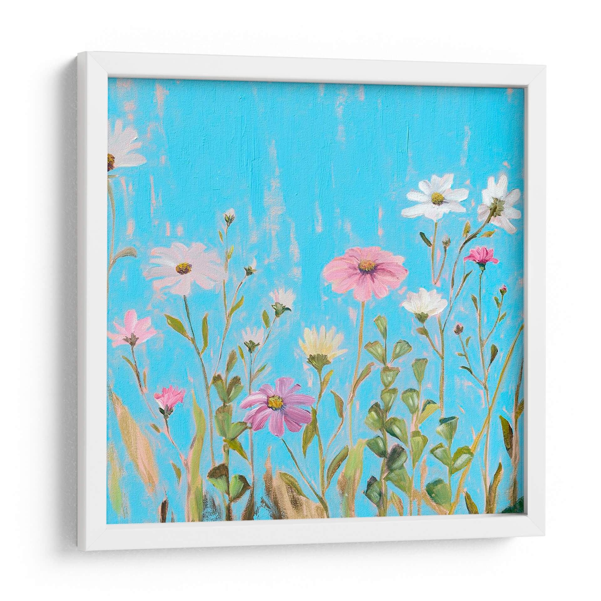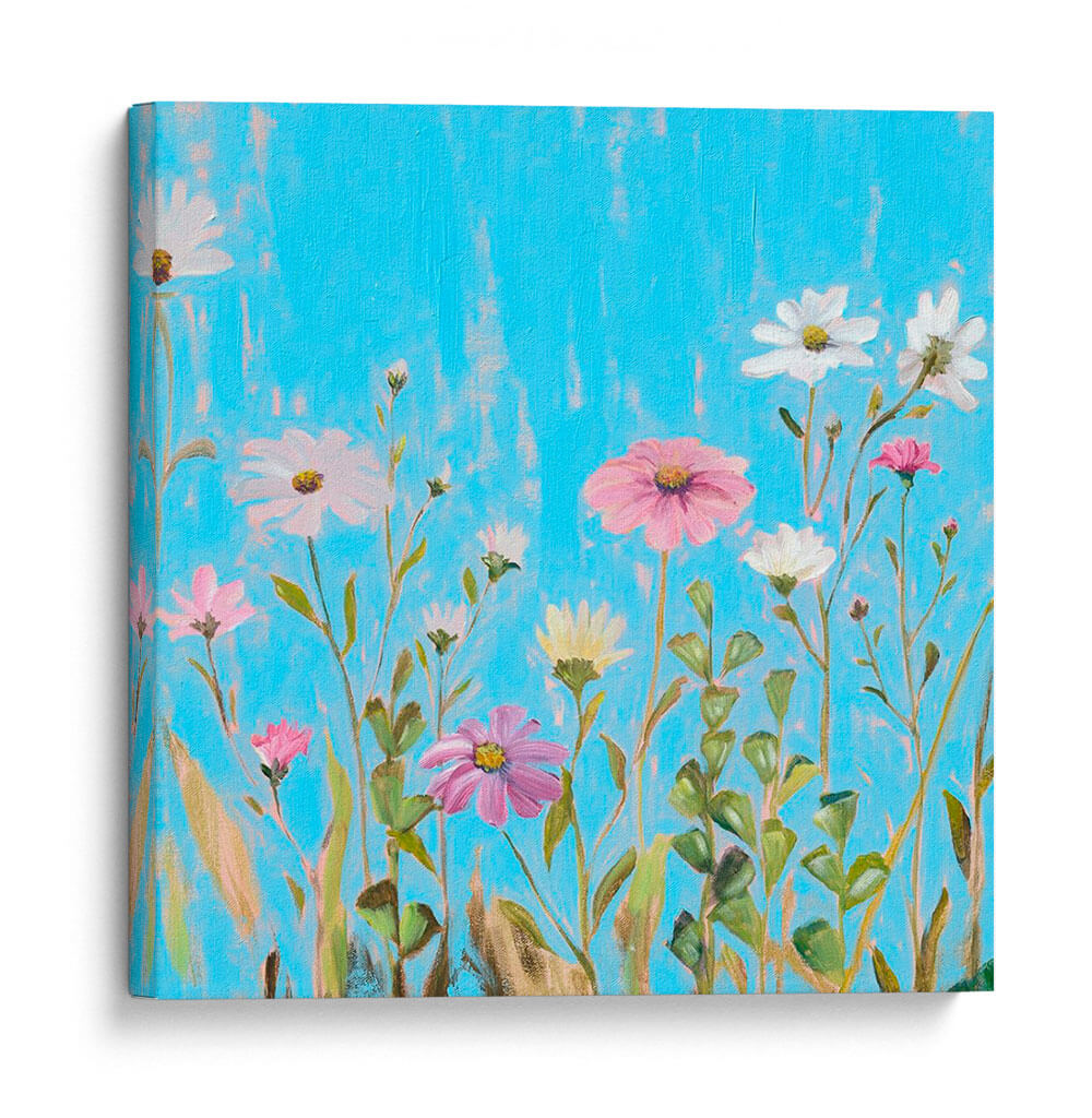 Sumérgete en la vibrante serenidad de "Flores Silvestres En Cerulean I", una obra de arte que captura la esencia de un prado florecido bajo un cielo azul intenso. El artista Christopher J. Trew nos presenta un lienzo donde delicadas flores silvestres, en tonos de rosa, blanco y amarillo pálido, emergen con gracia sobre un fondo cerúleo texturizado. Las pinceladas evocan un movimiento suave, como si el viento acariciara los pétalos y las hojas verdes que se entrelazan en una danza natural. Esta pieza transmite una sensación de calma y optimismo, ideal para infundir vitalidad a cualquier espacio. Su composición, que parece capturar un momento efímero en la naturaleza, la convierte en una adición perfecta para salas de estar, dormitorios o estudios que buscan un toque de frescura y color. El contraste entre los tonos vibrantes del fondo y la delicadeza de las flores crea un equilibrio visual cautivador, invitando a la contemplación y al disfrute de la belleza sencilla. Añade un toque de primavera duradera a tu hogar con este exquisito cuadro decorativo.