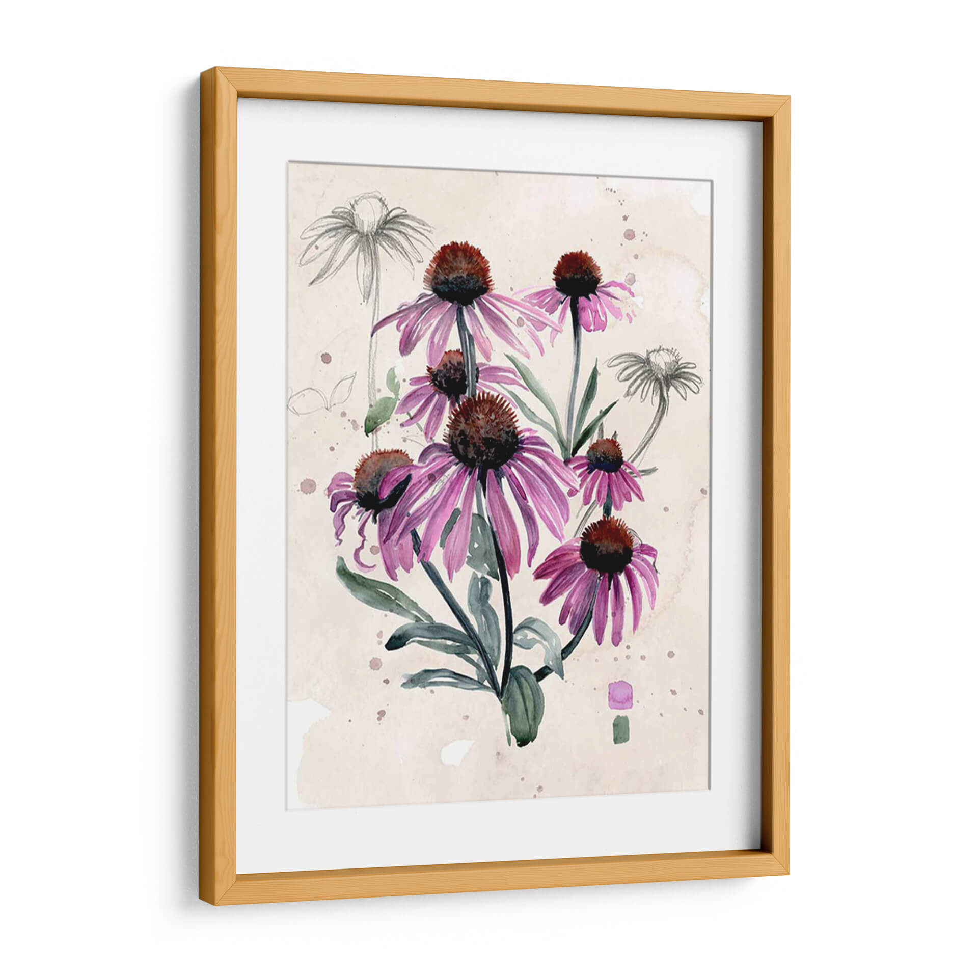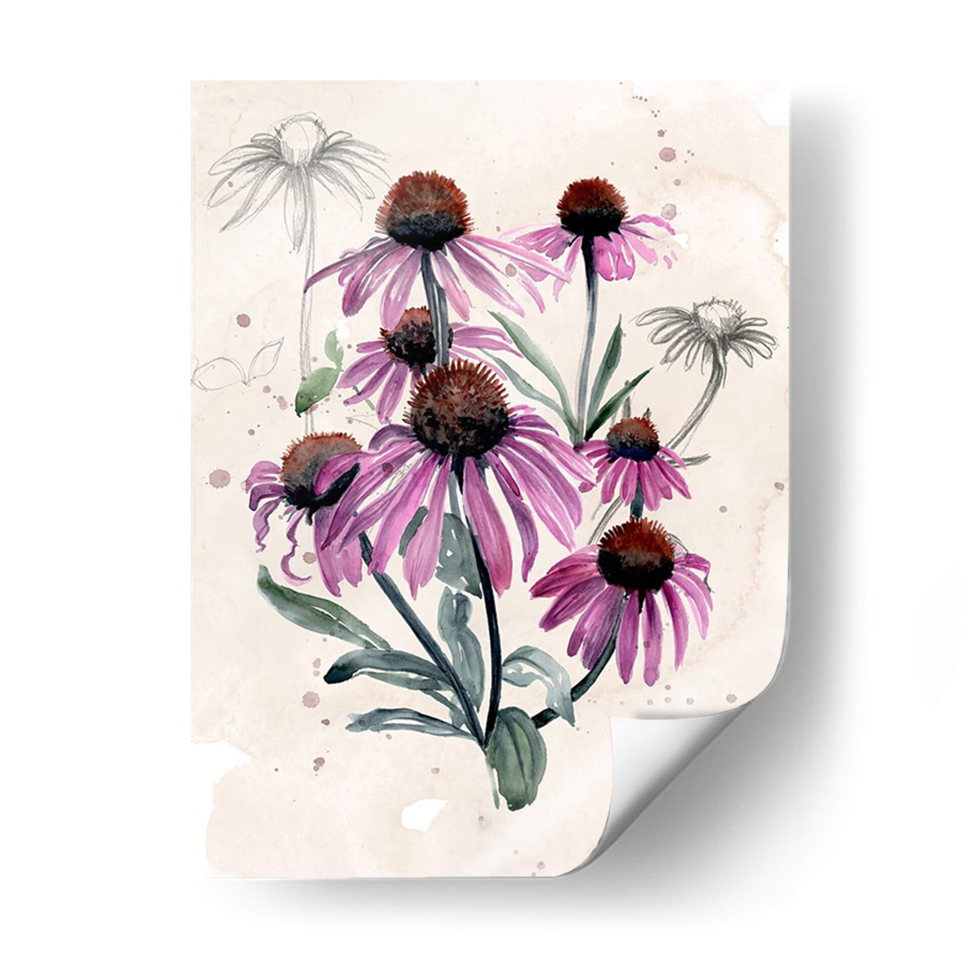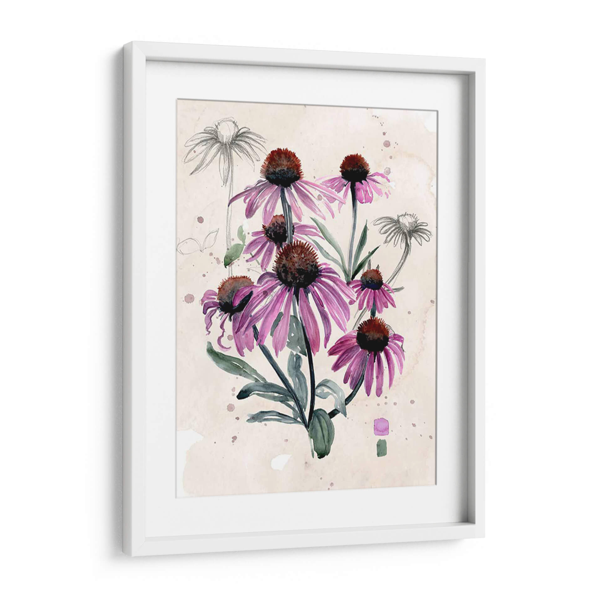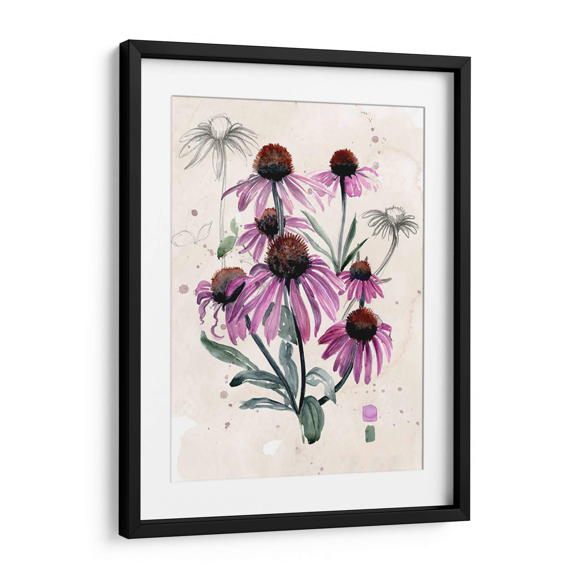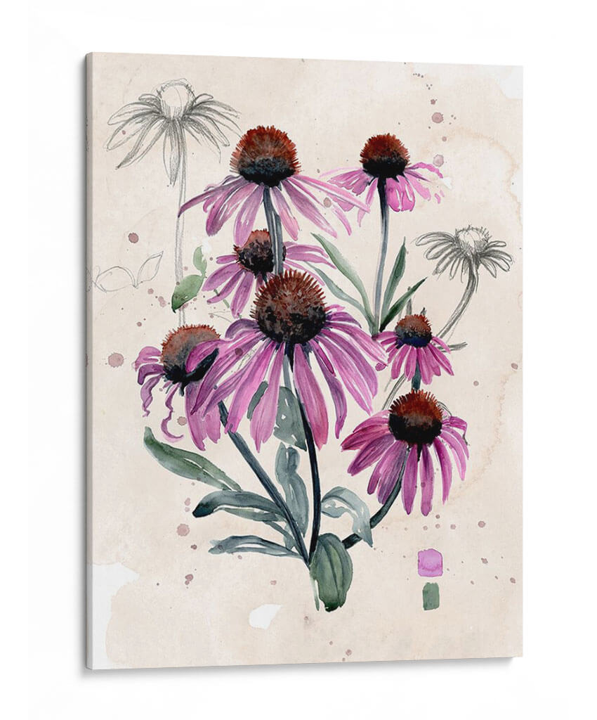 Embellece tu hogar con la delicadeza botánica de 'Flores Silvestres Púrpuras I', una obra de arte que captura la esencia de la naturaleza con una elegancia etérea. Este cuadro decorativo presenta un vibrante ramo de equináceas en tonos púrpuras intensos, con sus pétalos alargados y centros oscuros, contrastando armónicamente con el fondo de inspiración vintage con toques de acuarela y bocetos a lápiz. La técnica mixta, que combina la fluidez de la acuarela con la precisión del dibujo, aporta una textura visual rica y una profundidad cautivadora. La paleta de colores, dominada por púrpuras, verdes suaves y tonos tierra del fondo, crea una atmósfera de serenidad y conexión con la naturaleza. Ideal para quienes buscan añadir un toque de color y sofisticación botánica a su sala de estar, dormitorio o estudio. Este lienzo es una pieza decorativa versátil, perfecta para espacios que buscan transmitir calma, belleza y un aire de jardín encantado. Las sutiles manchas de acuarela y los bocetos a lápiz de fondo le otorgan un carácter único y artístico, convirtiéndola en una elección excepcional para elevar cualquier ambiente.