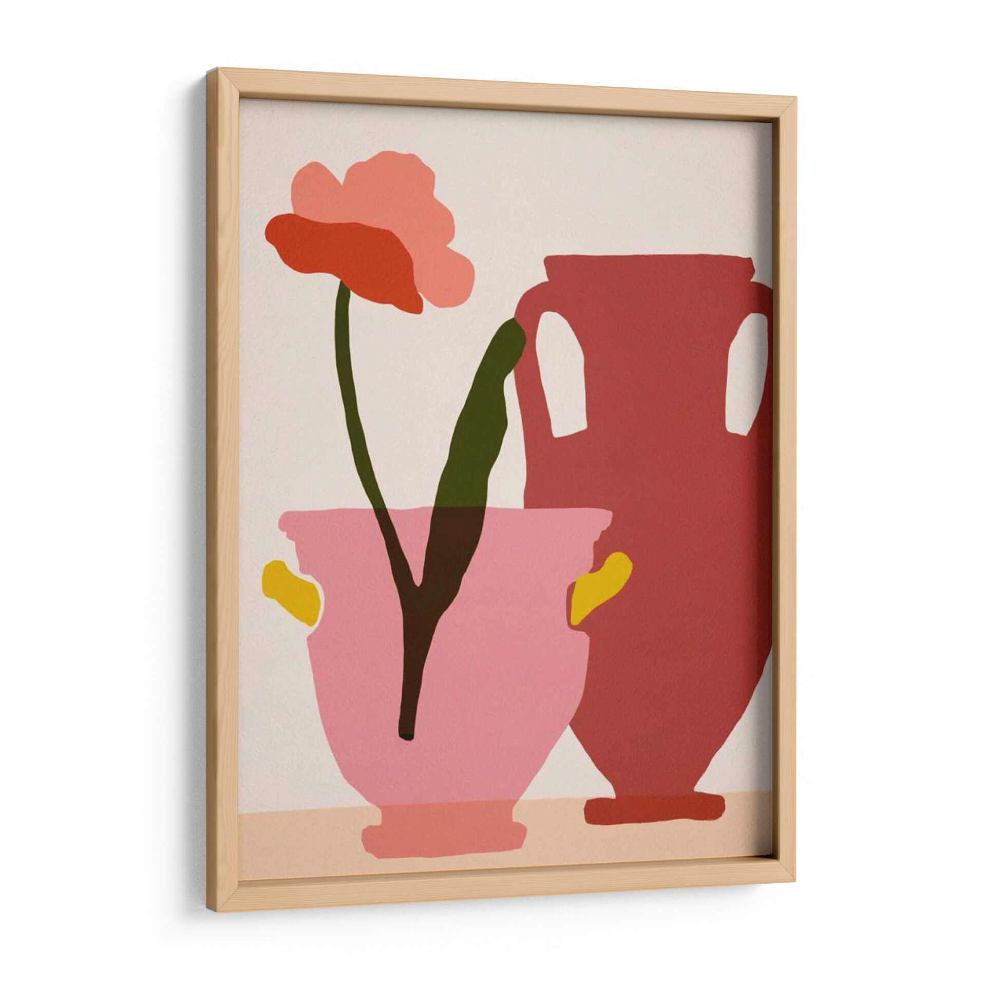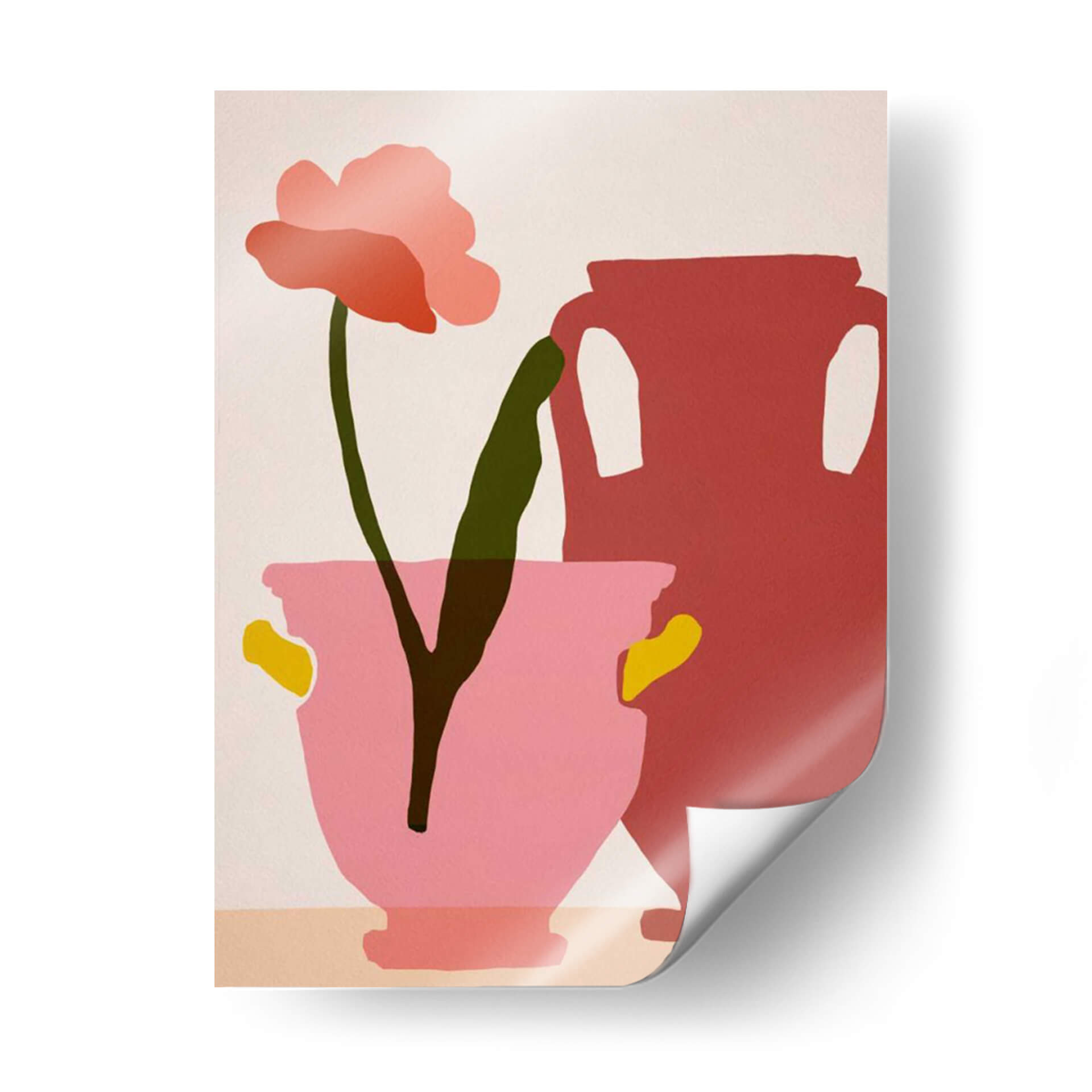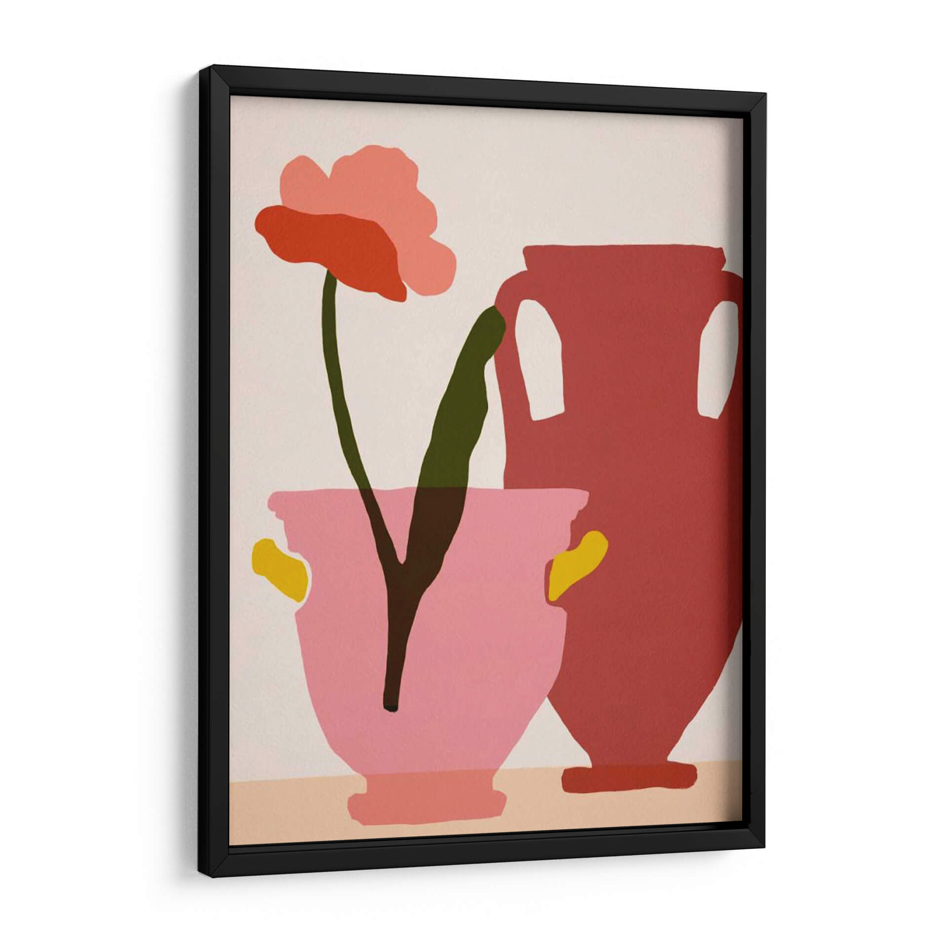 Sumérgete en la vibrante serenidad de "Flower Dance II", una obra de arte contemporáneo de Melissa Wang que captura la delicadeza de la naturaleza con un toque audaz y moderno. Esta pieza presenta una flor solitaria, representada en tonos de rosa y coral, con un tallo verde oscuro que se alza con gracia. A su lado, un jarrón de cerámica en un tono rojizo profundo complementa la composición, mientras que otro jarrón de color rosa pálido, adornado con detalles amarillos, alberga la flor. La paleta de colores, dominada por rosas, rojos, verdes y toques de amarillo sobre un fondo neutro, crea una atmósfera alegre y a la vez sofisticada. El estilo, que fusiona elementos figurativos con una abstracción audaz y formas planas, es ideal para quienes buscan un cuadro decorativo que aporte vida y personalidad a sus espacios. Este cuadro moderno es perfecto para decorar salones, dormitorios o estudios, añadiendo un punto focal de color y un aire de tranquilidad contemporánea. "Flower Dance II" es más que una simple imagen; es una invitación a la contemplación y a la apreciación de la belleza simple y elegante en el arte decorativo de pared. Su composición equilibrada y su paleta de colores cuidadosamente seleccionada la convierten en una adición exquisita a cualquier hogar u oficina, resonando con un estilo moderno y refinado.