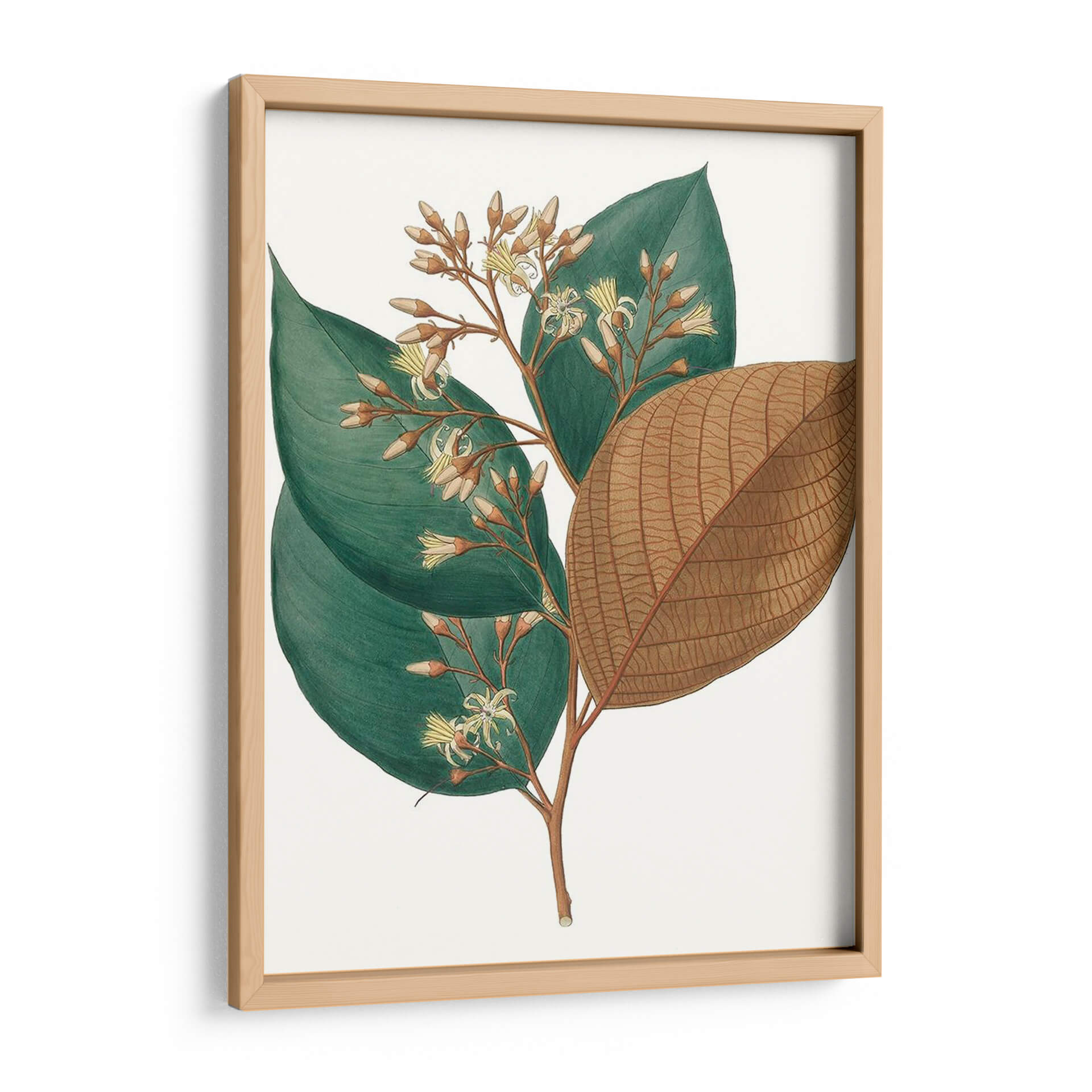 Sumérgete en la serena belleza de la naturaleza con este exquisito cuadro decorativo, 'Follaje De Otoño V'. Esta obra captura la delicadeza y la complejidad de una rama botánica, con hojas verdes vibrantes contrastando elegantemente con una hoja seca y texturizada en tonos tierra. La composición se centra en una intrincada exhibición de capullos y delicadas flores amarillas, invitando a la contemplación y aportando un toque de frescura y sofisticación a cualquier espacio. Su estilo detallado y realista evoca la precisión de las ilustraciones botánicas clásicas, pero con una sensibilidad contemporánea. Los colores, que van desde el verde profundo hasta los cálidos marrones y los sutiles toques de amarillo, crean una atmósfera de tranquilidad y conexión con el ciclo natural. Este cuadro decorativo es una elección perfecta para quienes buscan infundir calma y elegancia en su hogar u oficina, ideal para complementar decoraciones de estilo clásico, naturalista o moderno minimalista. Añade una pieza de arte que celebre la belleza intrínseca del mundo natural y transforma tu entorno en un santuario de paz y estilo.