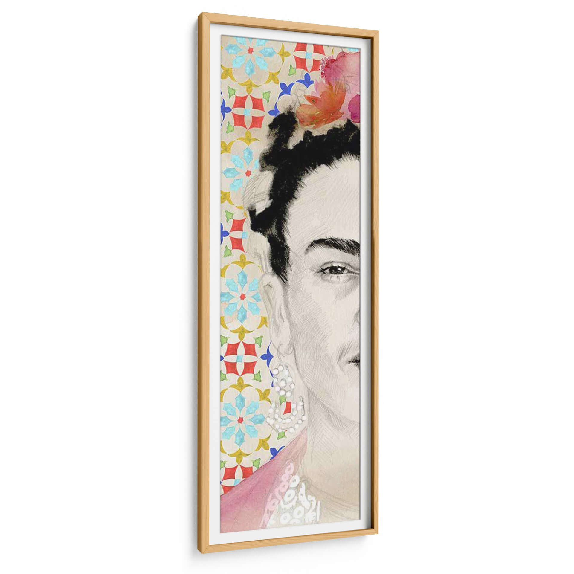 Sumérgete en la enigmática mirada de "Frida Diptych II", una obra de arte excepcional de Jennifer Paxton Parker. Este cuadro decorativo captura la esencia de un icono cultural a través de un estilo gráfico y detallado, fusionando el retrato con un vibrante fondo de patrones geométricos inspirados en azulejos. La técnica de dibujo a lápiz, sutilmente coloreada, aporta una textura y profundidad únicas, mientras que la paleta de colores, que combina tonos tierra suaves con estallidos de rojo, azul y amarillo, crea un contraste cautivador. La obra evoca una sensación de fortaleza, introspección y una elegancia atemporal. El detalle de las flores en el cabello y los elaborados pendientes añade un toque de sofisticación y carácter. "Frida Diptych II" es una pieza ideal para quienes buscan añadir un toque de personalidad y arte con historia a su hogar u oficina. Su formato vertical y su composición equilibrada la convierten en un punto focal perfecto para pasillos, entradas o para complementar una pared de galería con un aire artístico y distintivo. Esta obra trasciende el simple decorado, invitando a la reflexión y celebrando la individualidad. Descubre la magia de Jennifer Paxton Parker y transforma tu espacio con este cuadro de carácter inconfundible, perfecto para amantes del arte contemporáneo y admiradores de figuras icónicas.