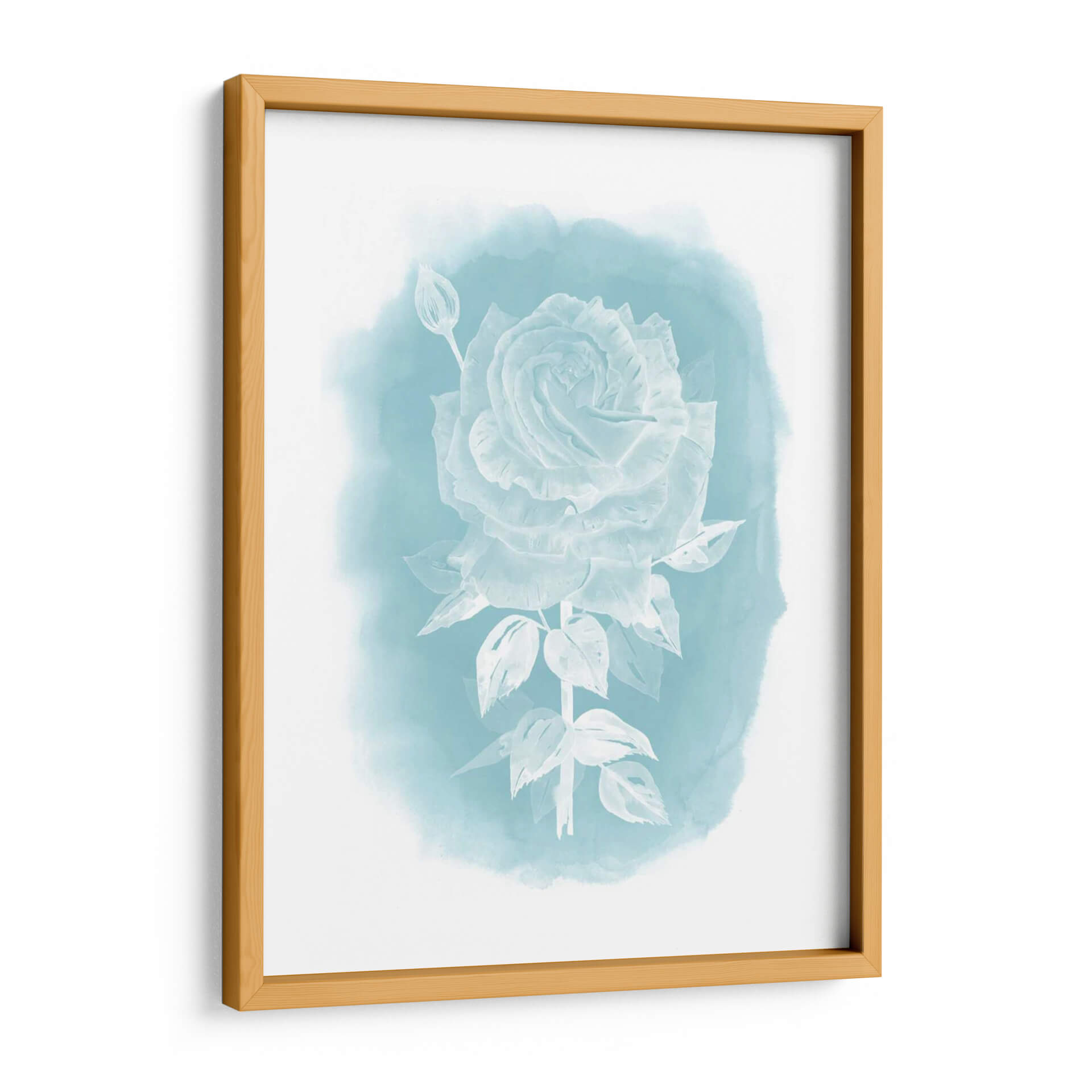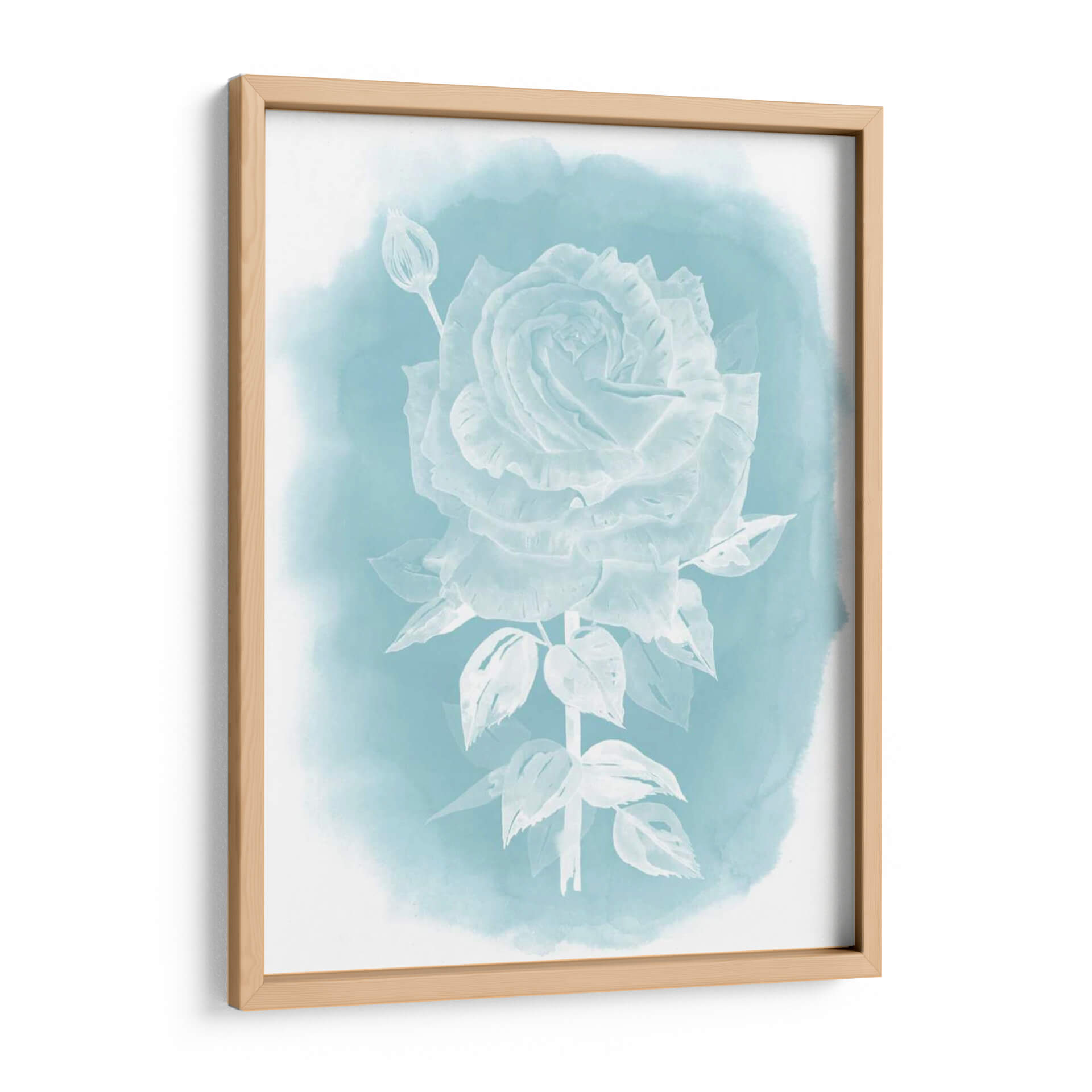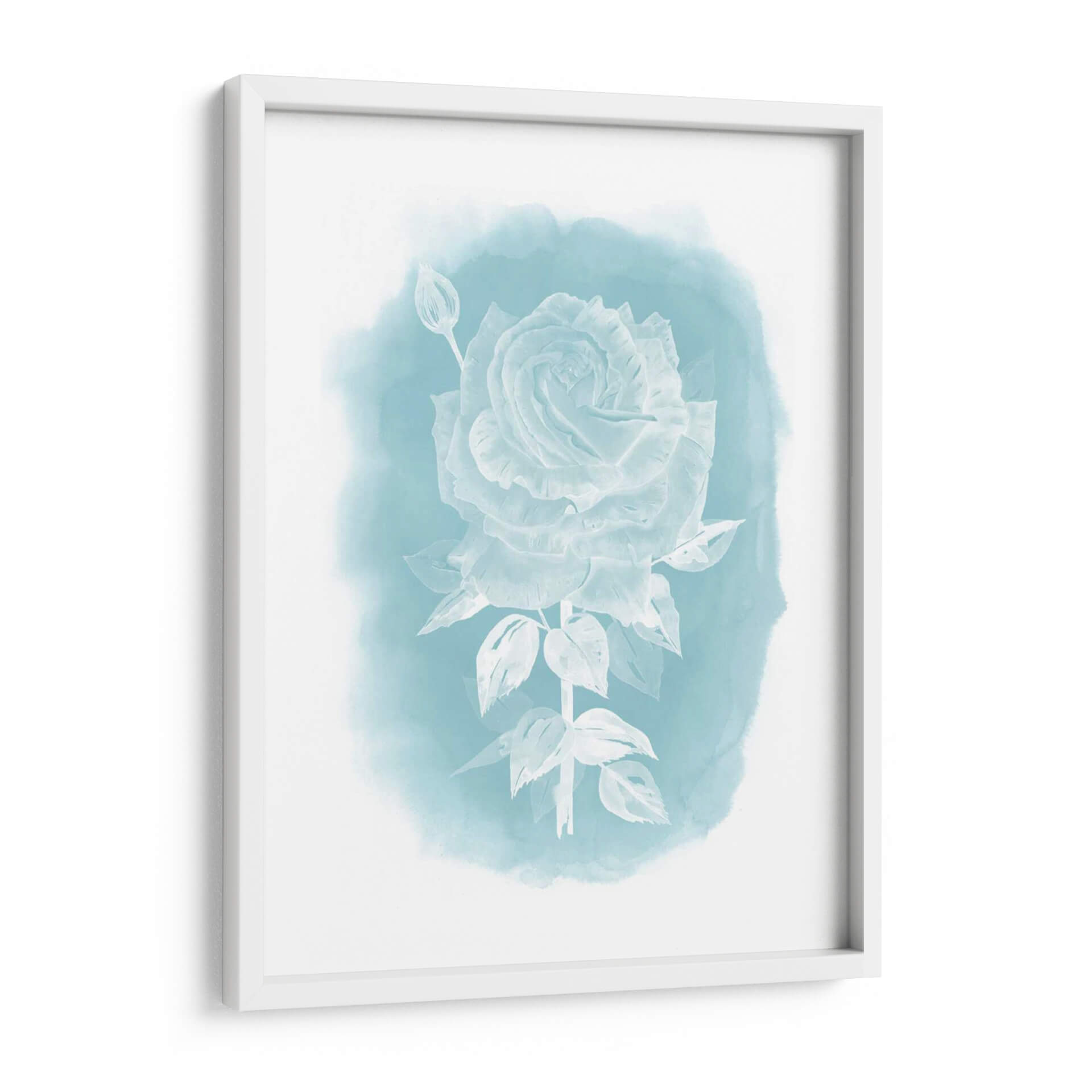 Sumérgete en la delicada belleza de "Ghost Rose II", una obra de arte que captura la esencia etérea de una rosa blanca sobre un fondo de acuarela en tonos celestes y turquesas. La detallada representación de los pétalos de la rosa, junto con un capullo cercano y hojas sutiles, evoca una sensación de tranquilidad y elegancia. El estilo, que roza lo impresionista con toques de realismo en la forma de la flor, se ve realzado por la técnica de acuarela que difumina suavemente los bordes, creando una atmósfera onírica y serena. Este cuadro decorativo es perfecto para aquellos que buscan añadir un toque de sofisticación sutil y un respiro visual a su hogar u oficina. Ideal para dormitorios, baños o salas de estar donde se desee crear un ambiente de calma y serenidad, "Ghost Rose II" es una pieza que invita a la contemplación. Su paleta de colores suaves y la composición centrada en la flor la convierten en un punto focal delicado pero cautivador, capaz de complementar una amplia gama de estilos decorativos, desde el moderno hasta el escandinavo o el bohemio.