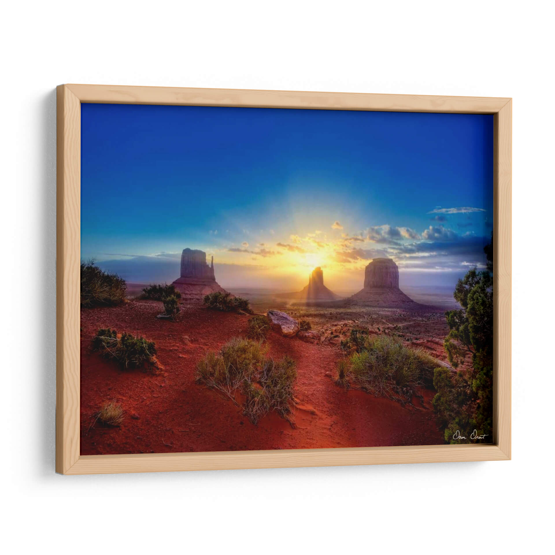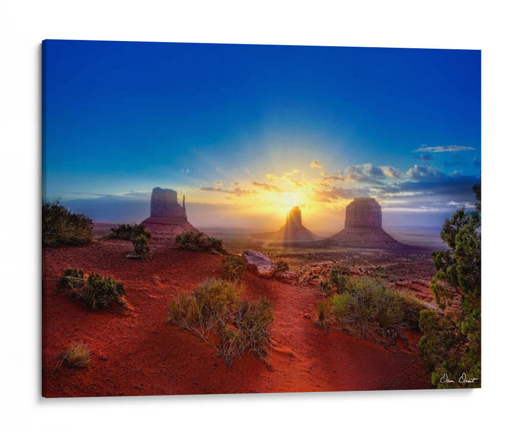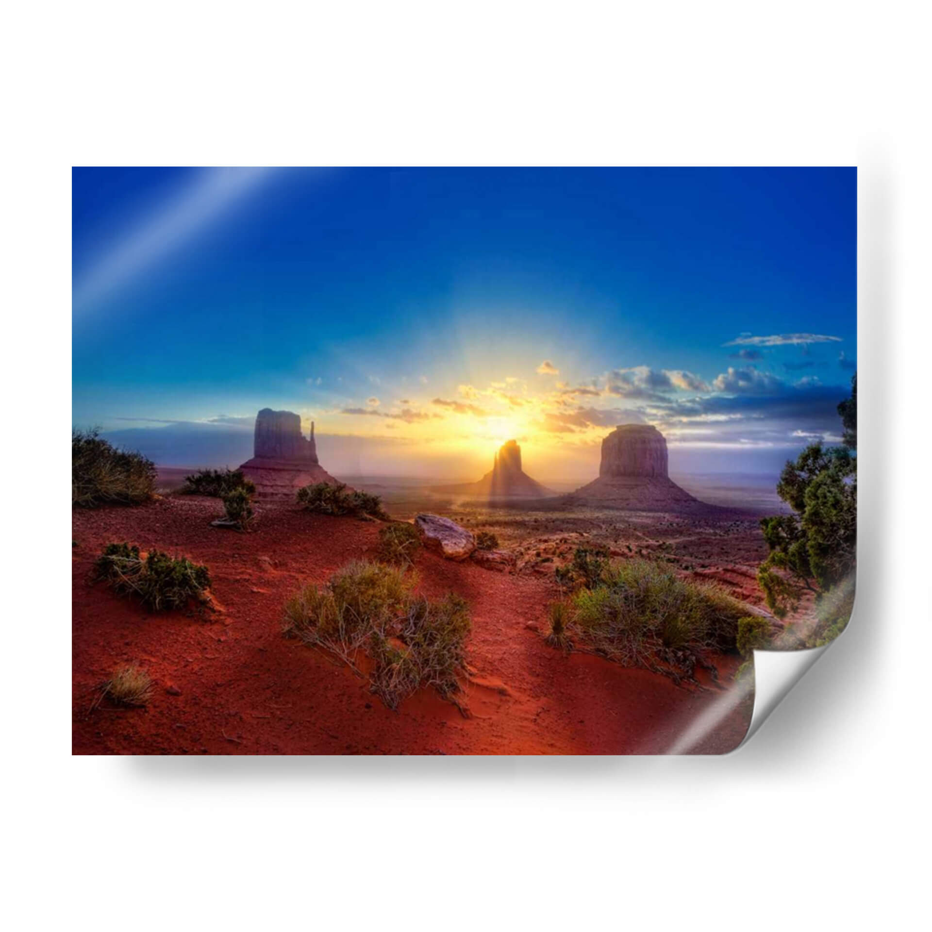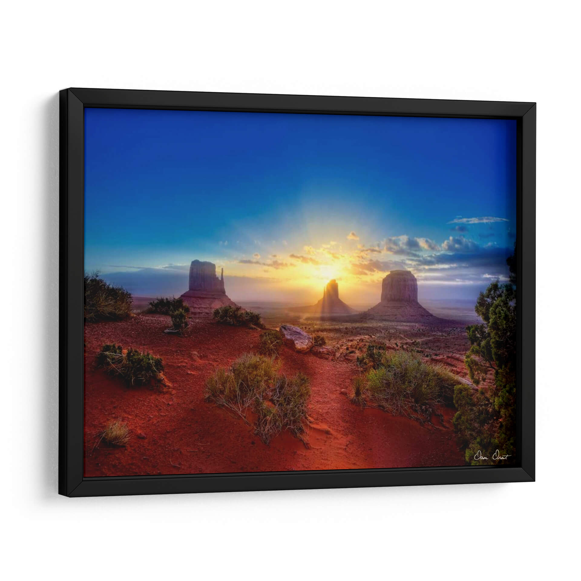 Captura la majestuosidad del desierto con este impresionante cuadro decorativo, "Gloria De La Mañana Rosa I", de David Drost. Esta obra maestra visual te transporta directamente al corazón de Monument Valley al amanecer, con el sol irrumpiendo entre formaciones rocosas icónicas y tiñendo el cielo de tonos vibrantes y cálidos. La paleta de colores, dominada por los intensos azules del cielo contrastando con los ocres y rojos del paisaje desértico, crea una atmósfera de paz y asombro. La composición, con las imponentes rocas y la vegetación árida en primer plano, invita a la contemplación y evoca una profunda conexión con la naturaleza salvaje. Ideal para aquellos que buscan infundir sus espacios con la grandeza de la naturaleza y una sensación de tranquilidad duradera, este cuadro decorativo es perfecto para salas de estar, oficinas o cualquier ambiente que se beneficie de un toque de serenidad y belleza monumental. Añade una pieza que celebre la magnificencia del mundo natural y la luz efímera del amanecer.