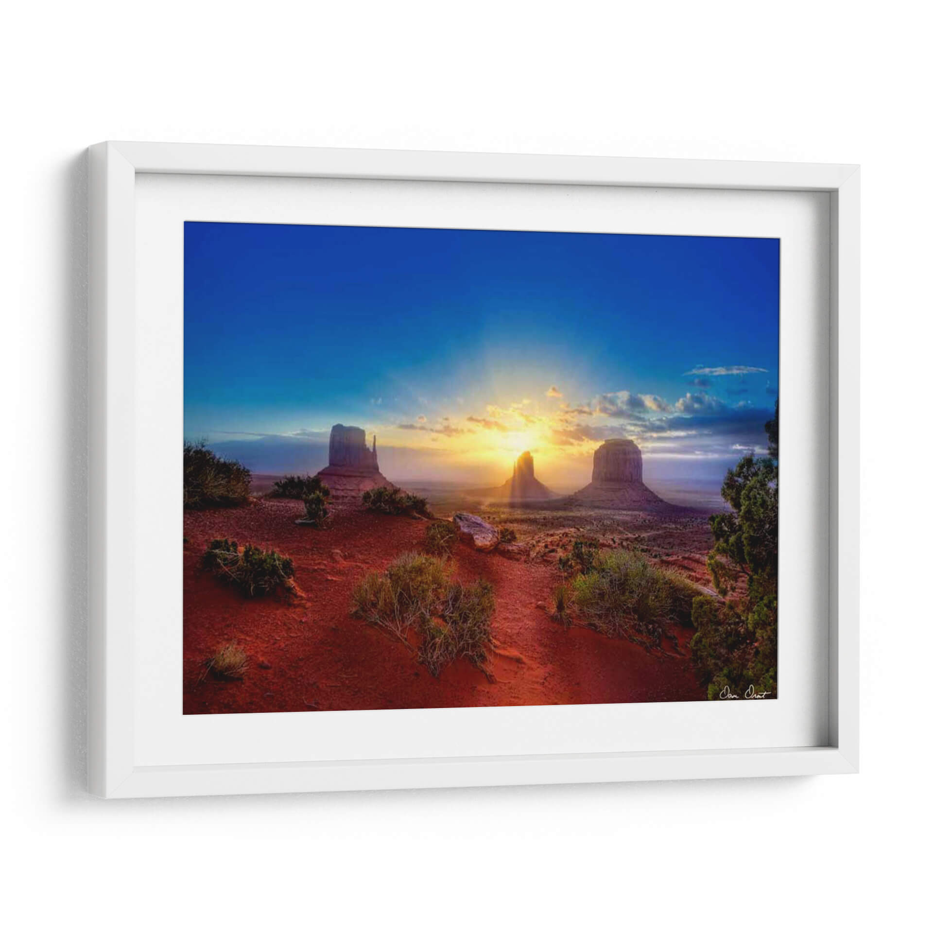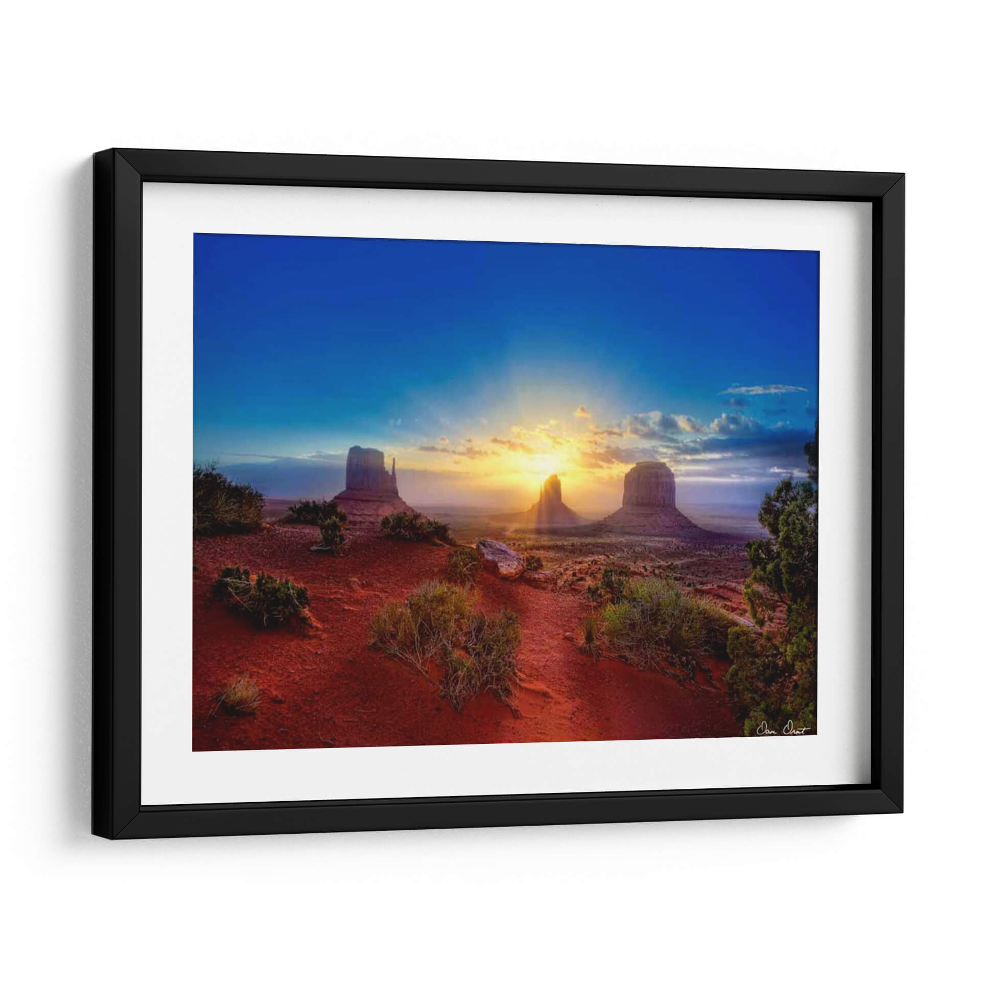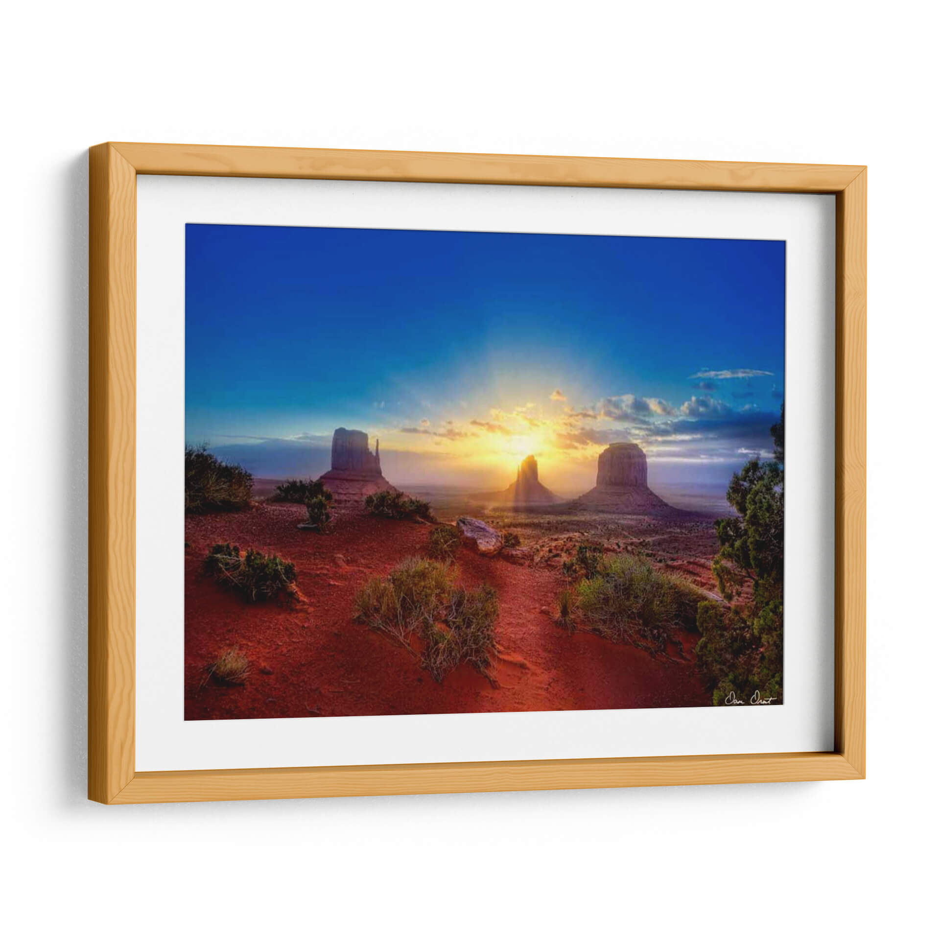 Captura la majestuosidad del desierto con este impresionante cuadro decorativo, "Gloria De La Mañana Rosa I", de David Drost. Esta obra maestra visual te transporta directamente al corazón de Monument Valley al amanecer, con el sol irrumpiendo entre formaciones rocosas icónicas y tiñendo el cielo de tonos vibrantes y cálidos. La paleta de colores, dominada por los intensos azules del cielo contrastando con los ocres y rojos del paisaje desértico, crea una atmósfera de paz y asombro. La composición, con las imponentes rocas y la vegetación árida en primer plano, invita a la contemplación y evoca una profunda conexión con la naturaleza salvaje. Ideal para aquellos que buscan infundir sus espacios con la grandeza de la naturaleza y una sensación de tranquilidad duradera, este cuadro decorativo es perfecto para salas de estar, oficinas o cualquier ambiente que se beneficie de un toque de serenidad y belleza monumental. Añade una pieza que celebre la magnificencia del mundo natural y la luz efímera del amanecer.