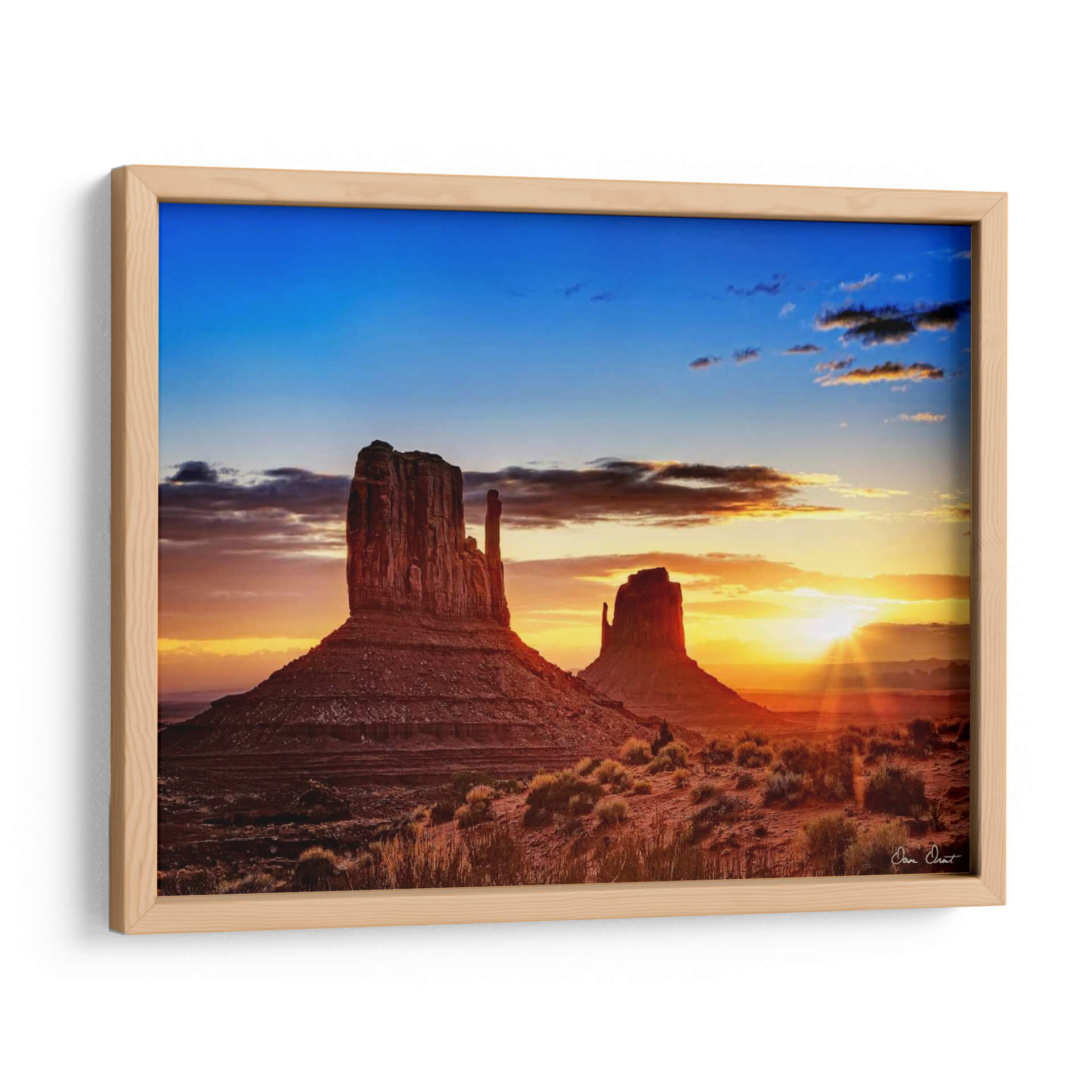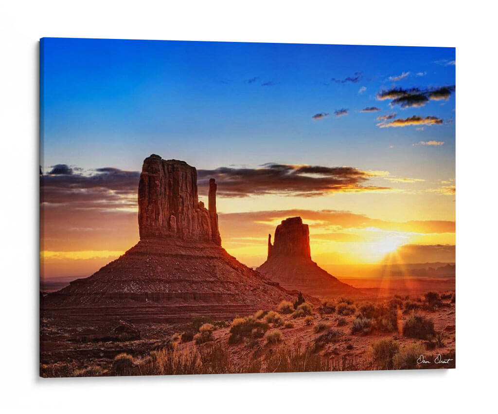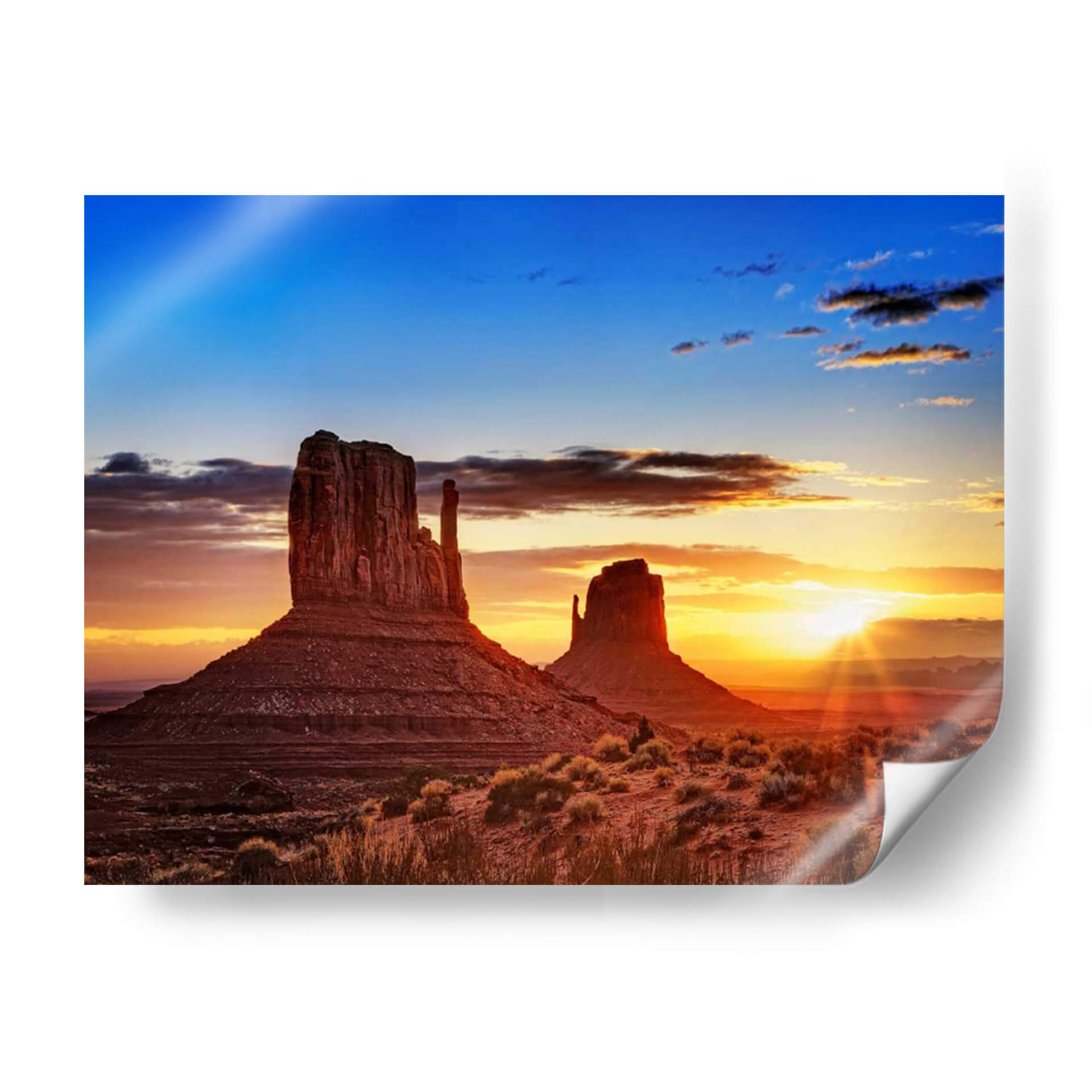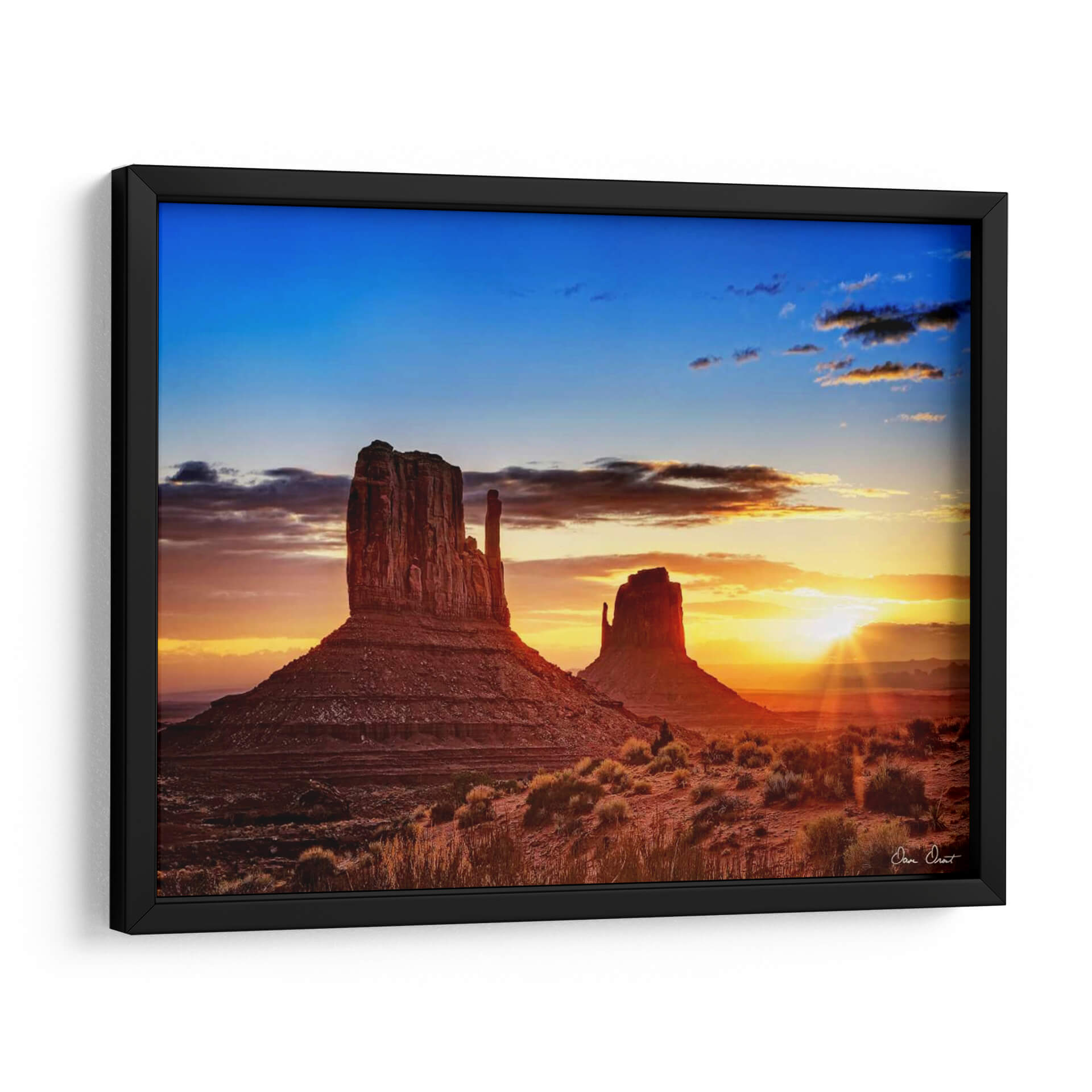 Captura la majestuosidad del desierto con "Gloria de la Mañana Rosa III", una obra de arte que evoca la imponente belleza de los icónicos monumentos de piedra al amanecer. El artista David Drost ha inmortalizado un paisaje dramático donde las formaciones rocosas se alzan contra un cielo vibrante, teñido de tonos cálidos de naranja, rosa y azul profundo. La luz del sol naciente se filtra entre las nubes y baña la escena en un resplandor etéreo, resaltando las texturas y las profundidades de la tierra árida y la vegetación escasa. La composición, centrada en las imponentes estructuras rocosas, crea una sensación de escala y grandeza, invitando a la contemplación de la naturaleza en su estado más puro y poderoso. Este cuadro decorativo es perfecto para añadir un toque de serenidad y aventura a cualquier espacio, ya sea una sala de estar moderna, un estudio o un dormitorio. Su atmósfera inspiradora lo convierte en un punto focal ideal para aquellos que aprecian la fotografía de paisajes y el arte que celebra la grandeza del mundo natural. La paleta de colores cálidos y el contraste dramático entre luz y sombra aseguran que esta pieza aportará vida y carácter a tu decoración.