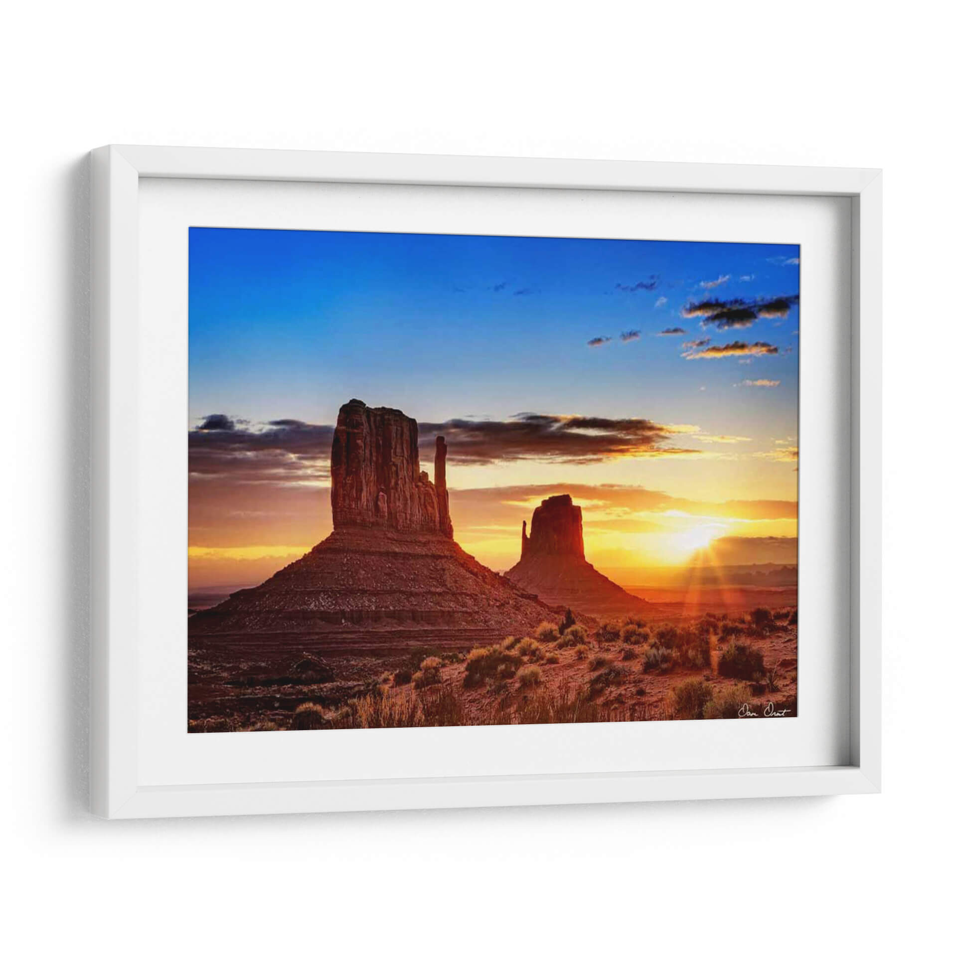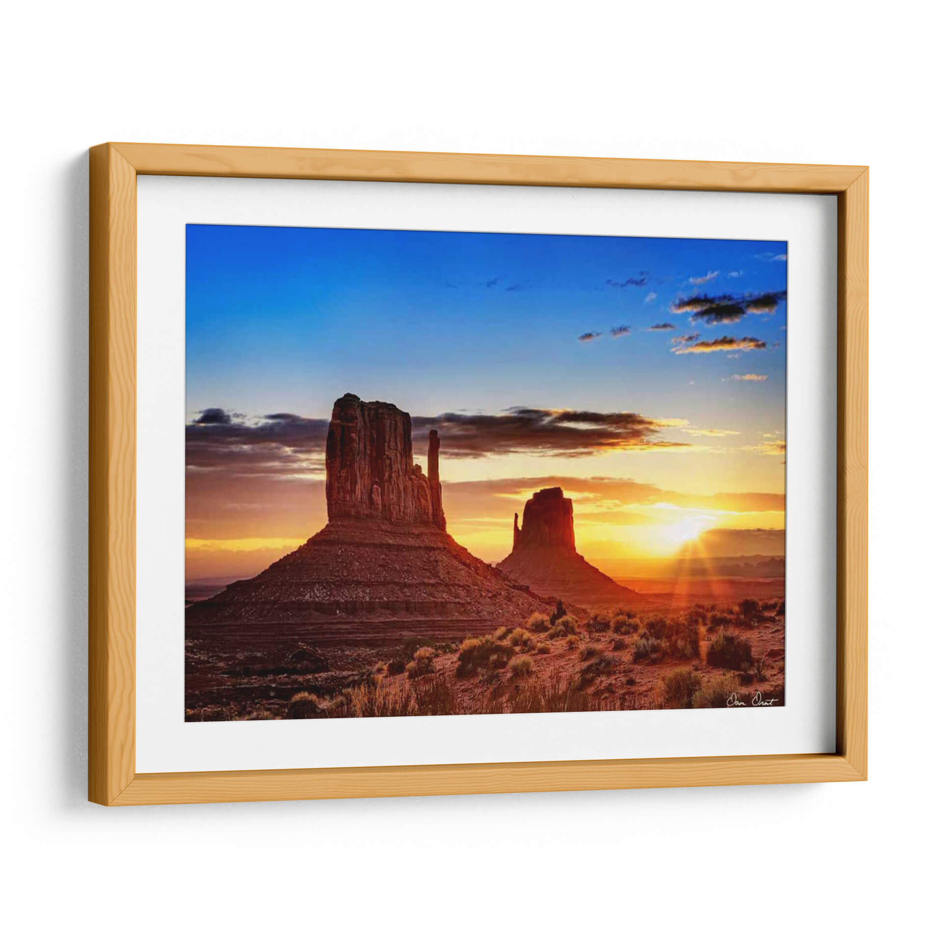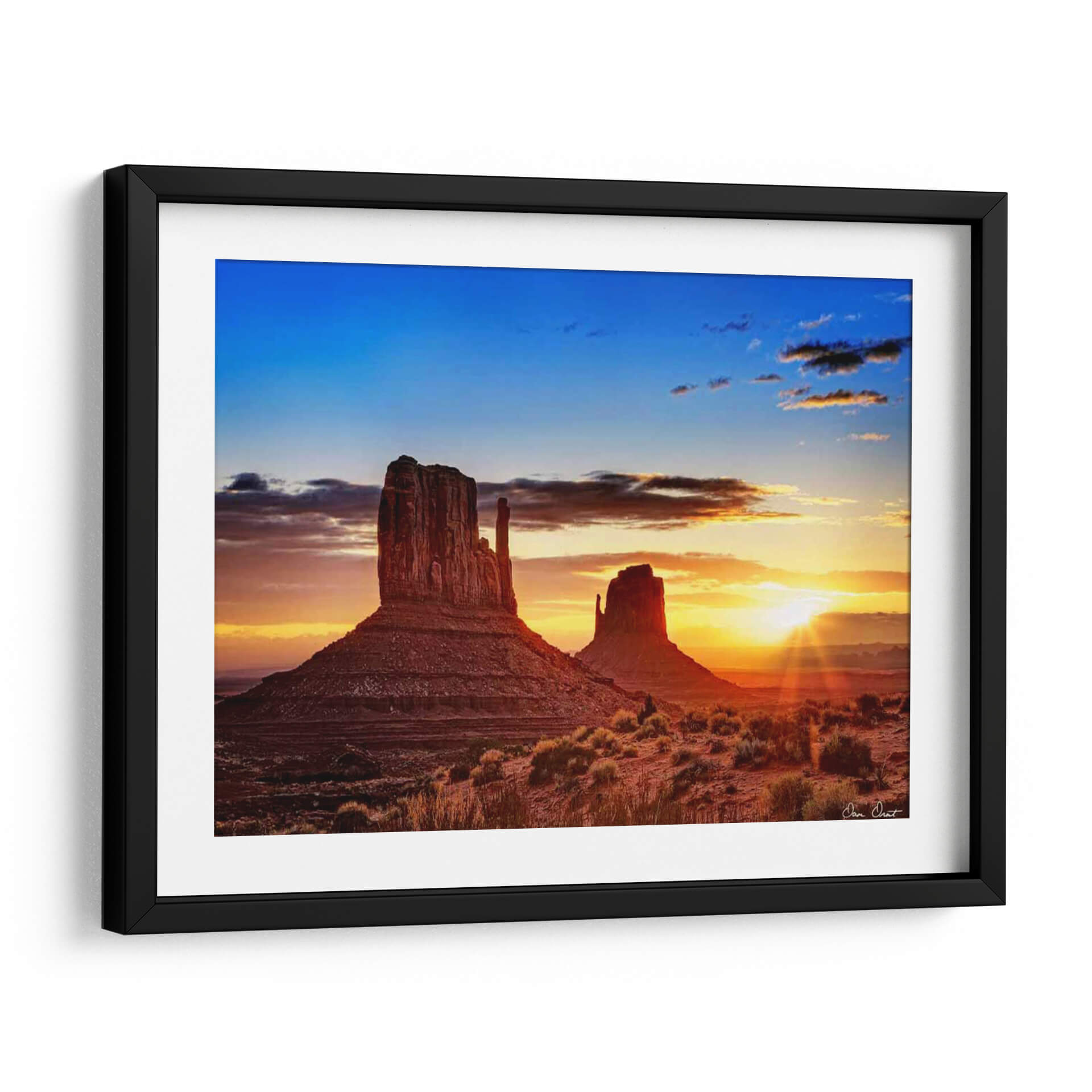Captura la majestuosidad del desierto con "Gloria de la Mañana Rosa III", una obra de arte que evoca la imponente belleza de los icónicos monumentos de piedra al amanecer. El artista David Drost ha inmortalizado un paisaje dramático donde las formaciones rocosas se alzan contra un cielo vibrante, teñido de tonos cálidos de naranja, rosa y azul profundo. La luz del sol naciente se filtra entre las nubes y baña la escena en un resplandor etéreo, resaltando las texturas y las profundidades de la tierra árida y la vegetación escasa. La composición, centrada en las imponentes estructuras rocosas, crea una sensación de escala y grandeza, invitando a la contemplación de la naturaleza en su estado más puro y poderoso. Este cuadro decorativo es perfecto para añadir un toque de serenidad y aventura a cualquier espacio, ya sea una sala de estar moderna, un estudio o un dormitorio. Su atmósfera inspiradora lo convierte en un punto focal ideal para aquellos que aprecian la fotografía de paisajes y el arte que celebra la grandeza del mundo natural. La paleta de colores cálidos y el contraste dramático entre luz y sombra aseguran que esta pieza aportará vida y carácter a tu decoración.