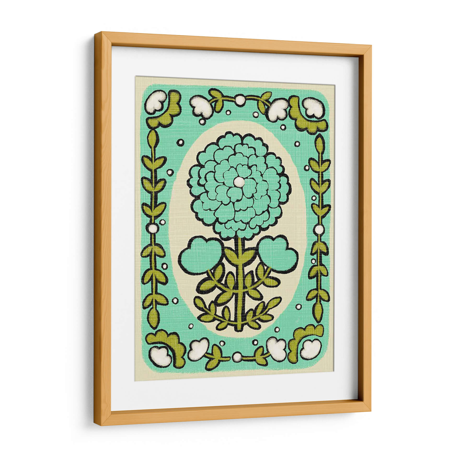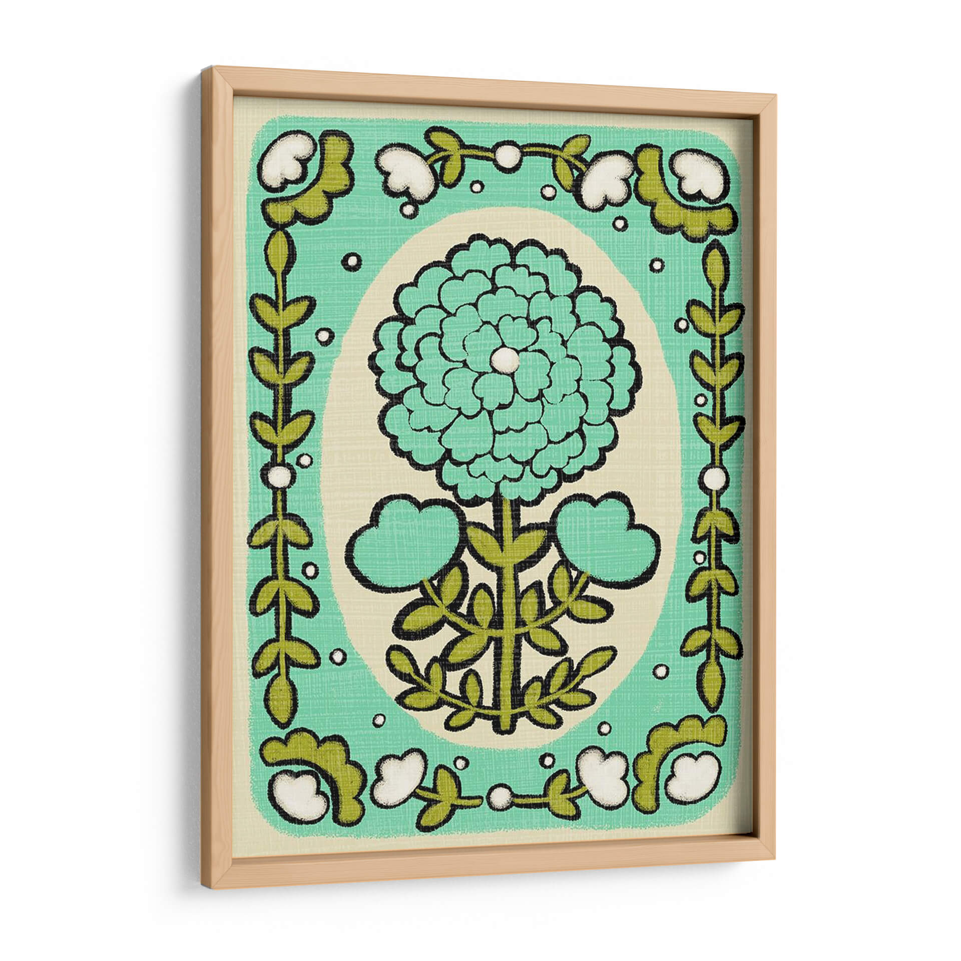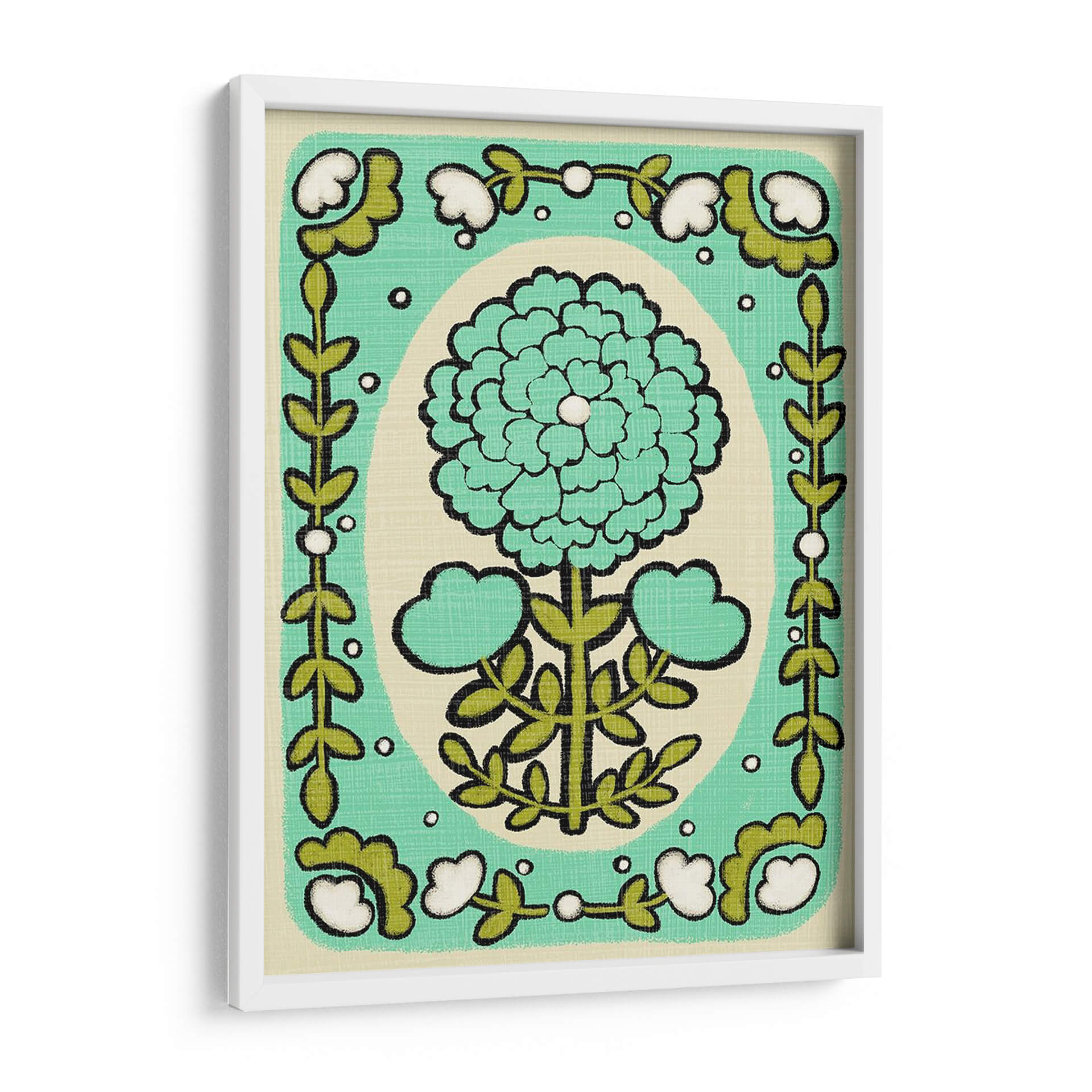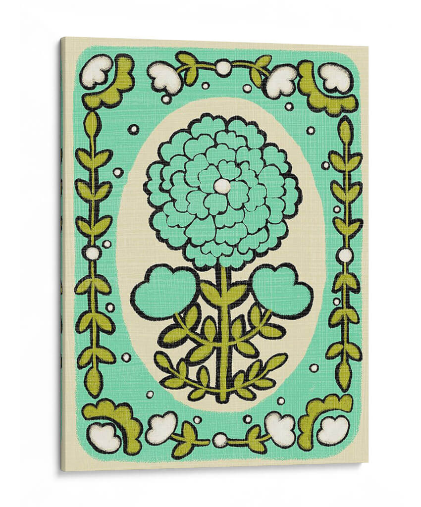 Embellece tu hogar con el encantador cuadro decorativo "Gouache Florals I" de Chariklia Zarris. Esta obra captura la esencia de la naturaleza a través de un diseño floral estilizado y vibrante. Predominan los tonos verdes y turquesas, con un delicado acento blanco en el centro de la flor principal, creando una atmósfera de frescura y vitalidad. El fondo de color crema suave aporta calidez y permite que los motivos florales resalten, generando un contraste visual armonioso. La composición presenta una gran flor central rodeada por un marco decorativo de hojas y pequeñas flores blancas, evocando un estilo que combina lo moderno con un toque retro, reminiscent de patrones textiles o ilustraciones botánicas vintage. Su estilo gráfico y las líneas definidas le otorgan una presencia única, ideal para espacios que buscan un toque de color y optimismo. Este cuadro es perfecto para añadir un acento de naturaleza y arte contemporáneo a tu sala de estar, dormitorio, oficina o cualquier rincón que necesite ser transformado con una pieza artística llena de carácter y buen gusto. Deja que "Gouache Florals I" inspire alegría y serenidad en tu día a día.