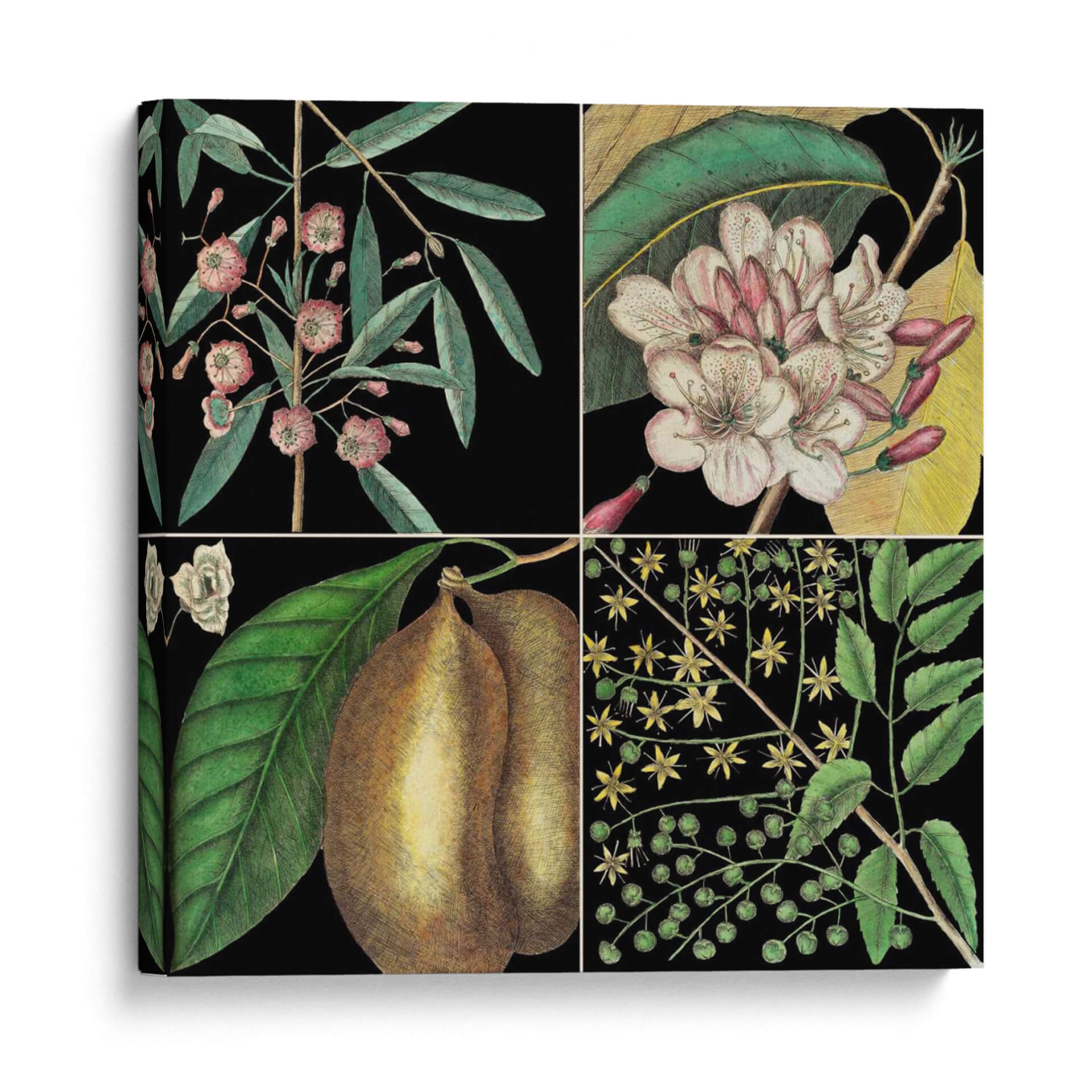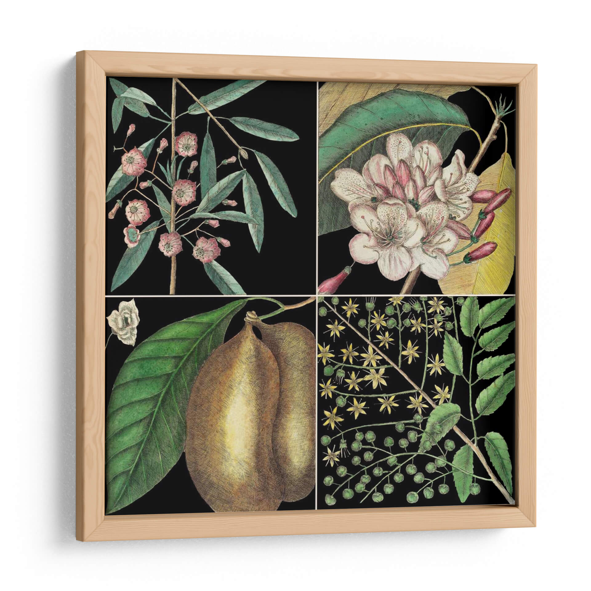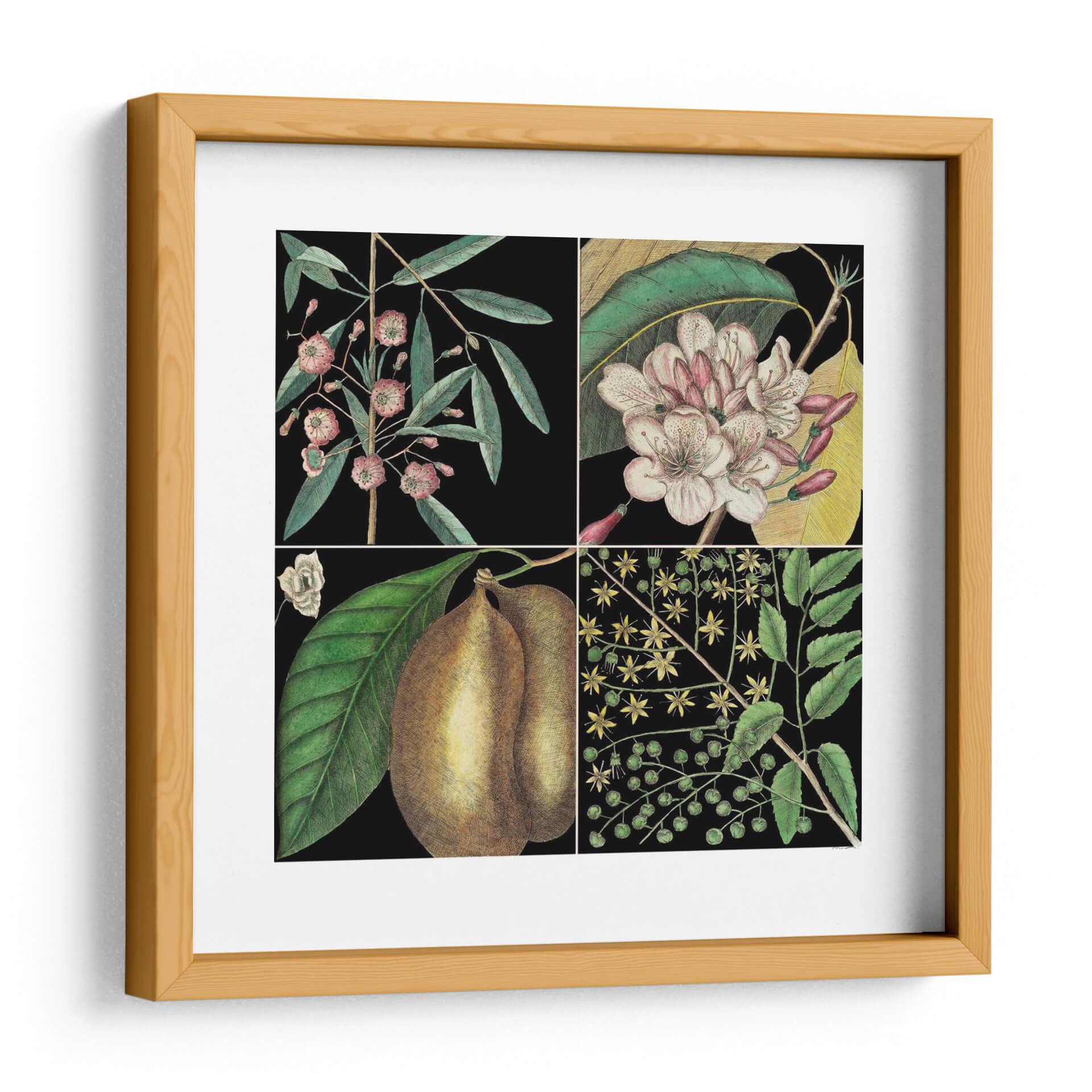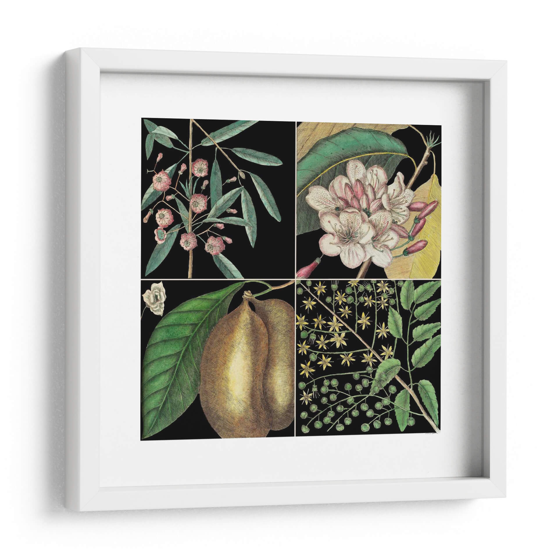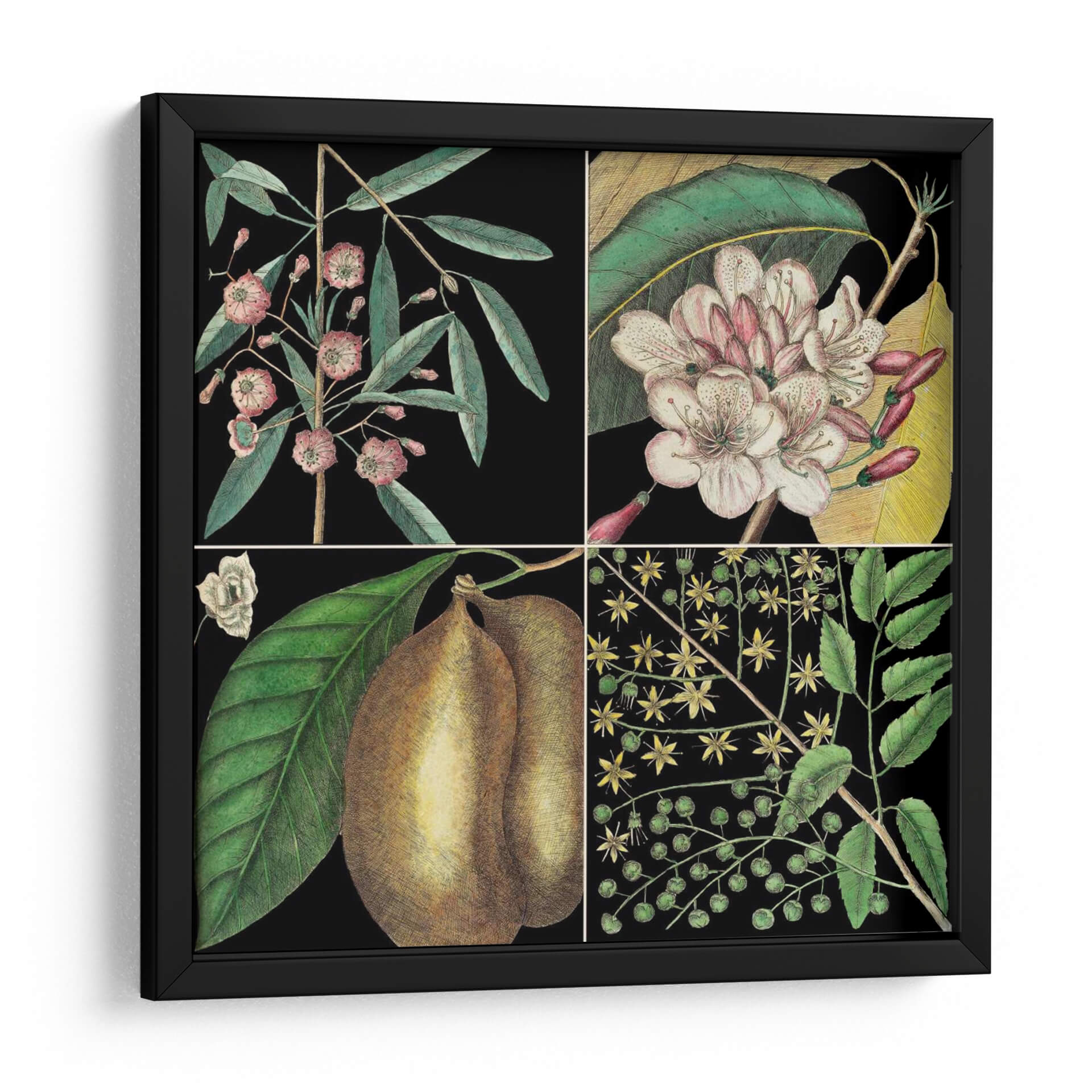 Embellece tu hogar con 'Gráfica Botánica Gráfica II', una obra de arte que captura la delicadeza y el detalle de la flora. Este cuadro decorativo presenta una composición dividida en cuatro paneles, cada uno mostrando una representación exquisita de elementos botánicos. Los tonos verdes profundos de las hojas contrastan maravillosamente con las flores en tonos rosados y blancos, así como con la textura terrosa de los frutos representados. El fondo negro profundo realza la vitalidad de cada elemento, creando un efecto visual cautivador y elegante. Inspirada en las ilustraciones naturalistas, esta pieza evoca una sensación de calma y aprecio por la naturaleza, aportando un toque de sofisticación atemporal a cualquier estancia. Es ideal para salas de estar, comedores o estudios que buscan un acento de color y un guiño al mundo natural. Añade una dimensión de elegancia botánica a tu decoración con este impresionante cuadro decorativo, perfecto para los amantes de la naturaleza y el arte detallado.