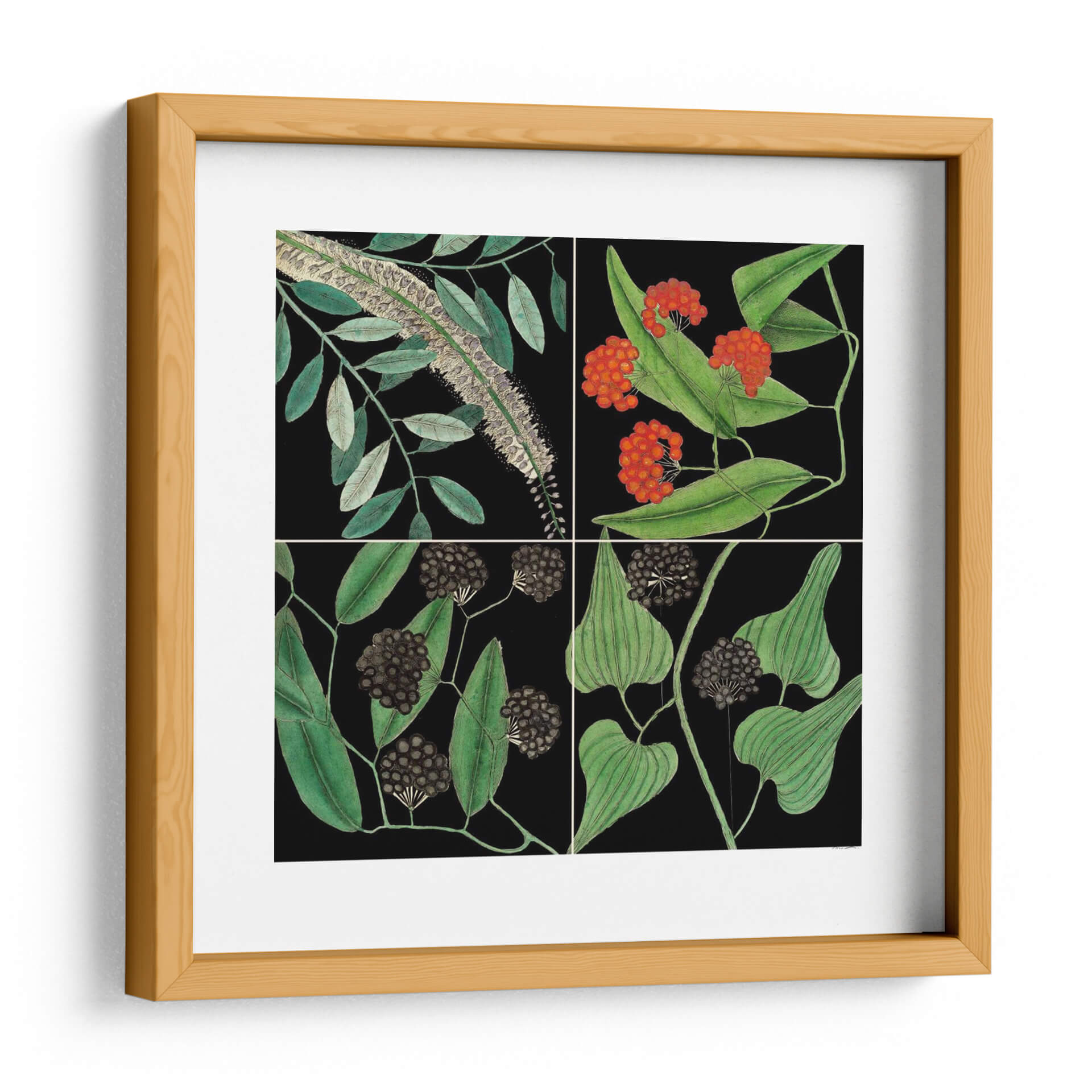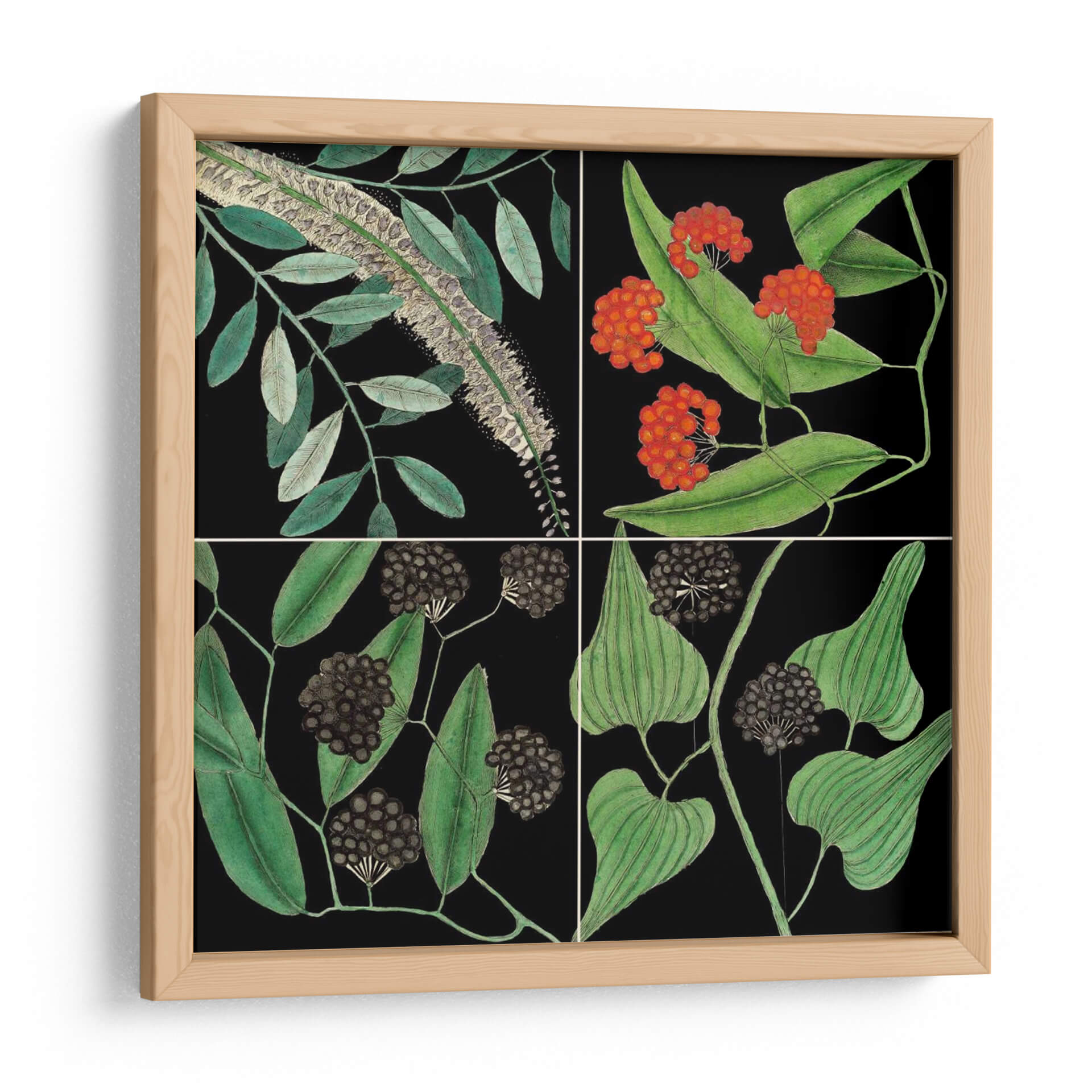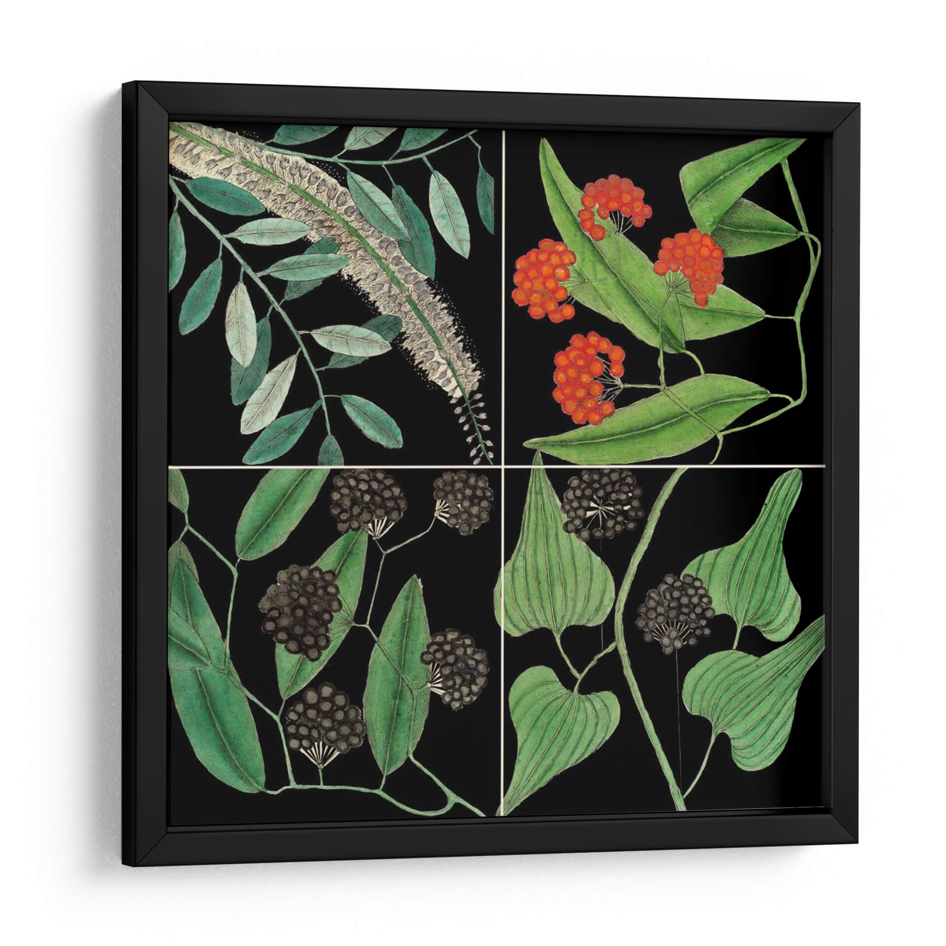 Sumérgete en la serenidad botánica con "Gráfica Botánica Grid IV" de Mark Catesby, un cuadro decorativo que captura la delicadeza de la naturaleza con una sofisticación atemporal. Esta obra de arte, dividida en cuatro paneles, presenta una detallada representación de especímenes botánicos sobre un fondo negro intenso, creando un contraste visual que realza la vibrante vida vegetal. Cada sección de la composición ofrece una perspectiva única: desde el exuberante follaje verde y las enigmáticas bayas oscuras hasta las etéreas espigas de flores y las llamativas racimos de frutos rojos. Los colores, dominados por verdes profundos, toques de rojo carmesí y grises sutiles, evocan una sensación de calma y conexión con el mundo natural, a la vez que aportan un aire de elegancia clásica. El estilo, que recuerda a las ilustraciones científicas de antaño, confiere a la pieza un carácter educativo y estético, ideal para aquellos que aprecian la belleza intrínseca de la flora. "Gráfica Botánica Grid IV" es más que una simple decoración; es una ventana a la maravilla botánica, perfecta para añadir un toque de refinamiento natural a tu sala de estar, estudio u oficina, inspirando tranquilidad y admiración en cada mirada. Este cuadro decorativo es una elección excepcional para quienes buscan una pieza de arte que sea a la vez informativa y estéticamente cautivadora, aportando un aire de sofisticación botánica a cualquier ambiente.