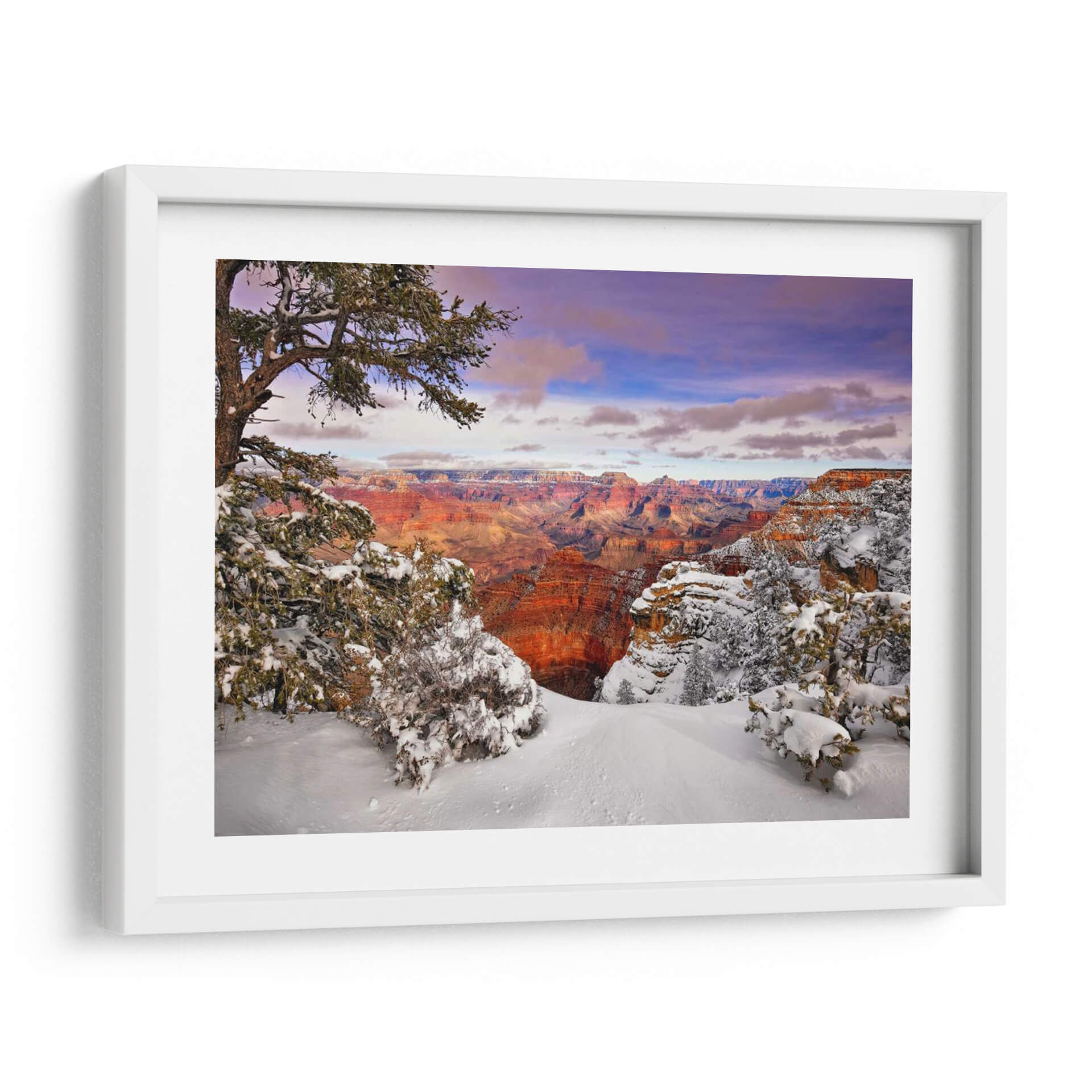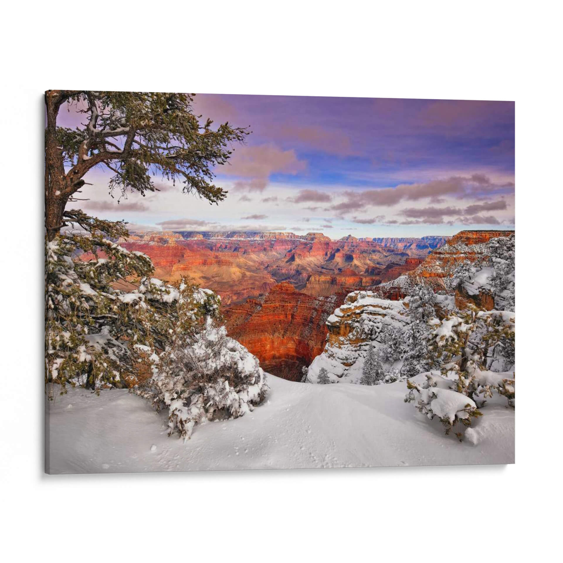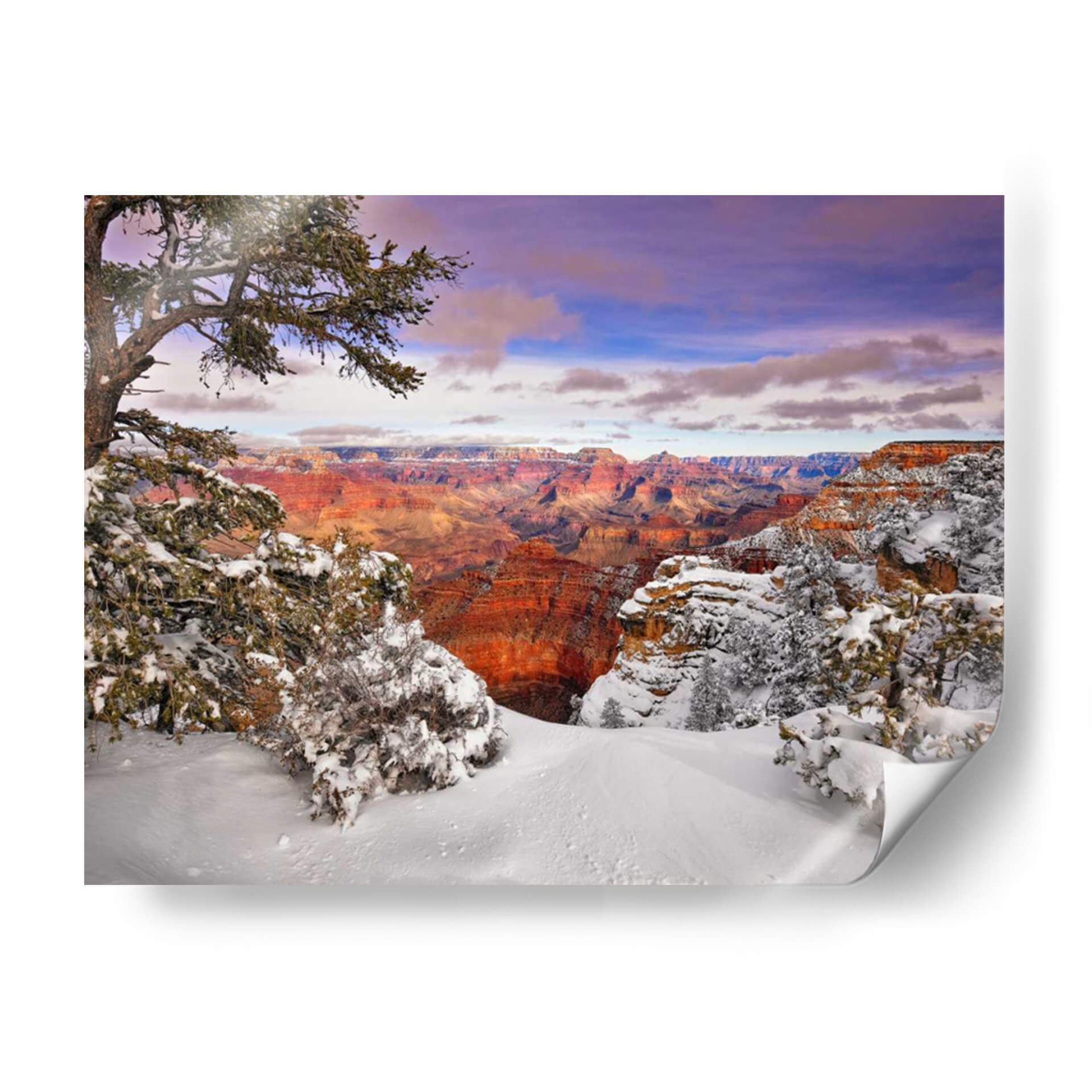 Sumérgete en la majestuosidad de la naturaleza con 'Gran Cañón Nevado II', una obra de David Drost que captura la imponente belleza del cañón en un día invernal. El lienzo despliega una paleta de colores contrastantes donde los ocres profundos y naranjas de las formaciones rocosas se encuentran con el blanco puro de la nieve que cubre el paisaje. La vegetación, cubierta de escarcha y nieve, añade un toque de vida y textura, enmarcando la vasta extensión del cañón que se pierde en el horizonte. El cielo, teñido de púrpuras y azules suaves, con nubes dispersas, crea una atmósfera serena y contemplativa, invitando a la reflexión. La composición panorámica, con un árbol solitario en primer plano que actúa como centinela, dirige la mirada hacia la profundidad del cañón, ofreciendo una perspectiva única y poderosa. Este cuadro decorativo es ideal para espacios que buscan evocar tranquilidad y asombro, como un salón de estar moderno o una oficina ejecutiva. Su realismo y la captura del instante efímero de la nieve sobre la roca lo convierten en una pieza excepcional para añadir carácter y una conexión con la grandiosidad del mundo natural a tu hogar o lugar de trabajo. Descubre la fuerza serena de un paisaje icónico transformado por el invierno.
