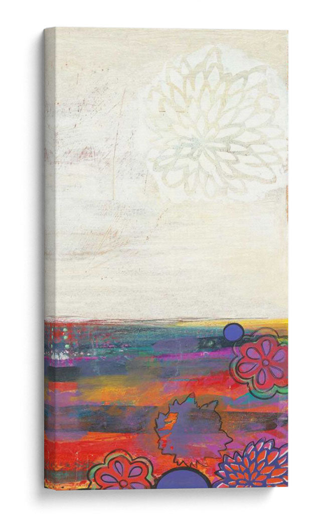 Sumérgete en la vibrante y etérea obra de arte "Hecho Para Amarte II", una pieza contemporánea que captura la esencia de la naturaleza y la abstracción. La parte superior de este cuadro decorativo presenta un delicado y translúcido motivo floral en tonos crudos, contrastando sutilmente con un fondo texturizado que evoca capas de pintura y tiempo. Esta zona superior transmite una sensación de calma y serenidad, creando un espacio visual para la contemplación. La mitad inferior de la obra explota en un vibrante lienzo de rayas horizontales en una gama de colores intensos: rojos ardientes, naranjas cálidos, azules profundos y púrpuras intensos, salpicados con toques de verde y amarillo. Sobre este fondo dinámico, emergen formas florales estilizadas en tonos morados y rojos, aportando un toque lúdico y orgánico. El contraste entre la suavidad de la parte superior y la energía de la inferior crea una composición dinámica y cautivadora. "Hecho Para Amarte II" es ideal para espacios que buscan un toque de color y vida, como salas de estar modernas, comedores o incluso un estudio creativo. Su estilo abstracto-floral lo hace versátil para una variedad de decoraciones, añadiendo un punto focal que inspira y alegra.