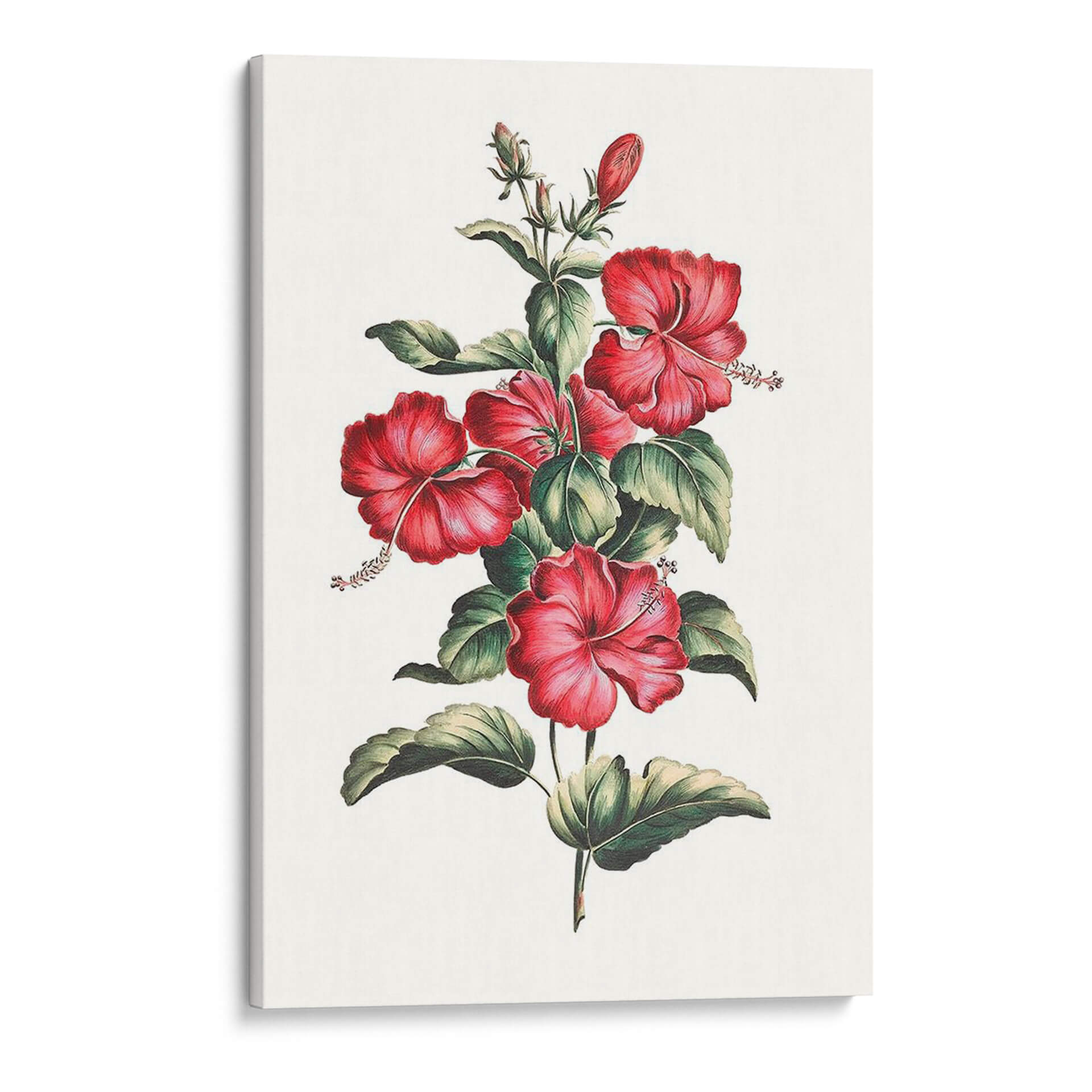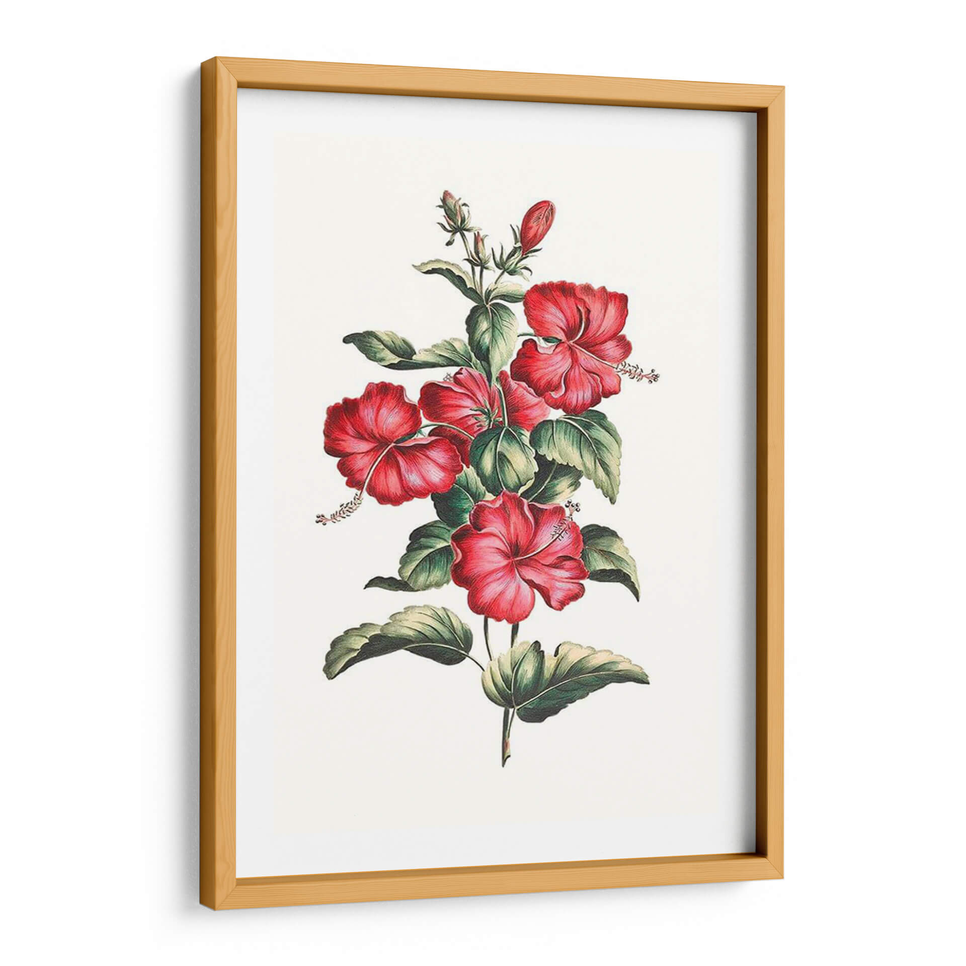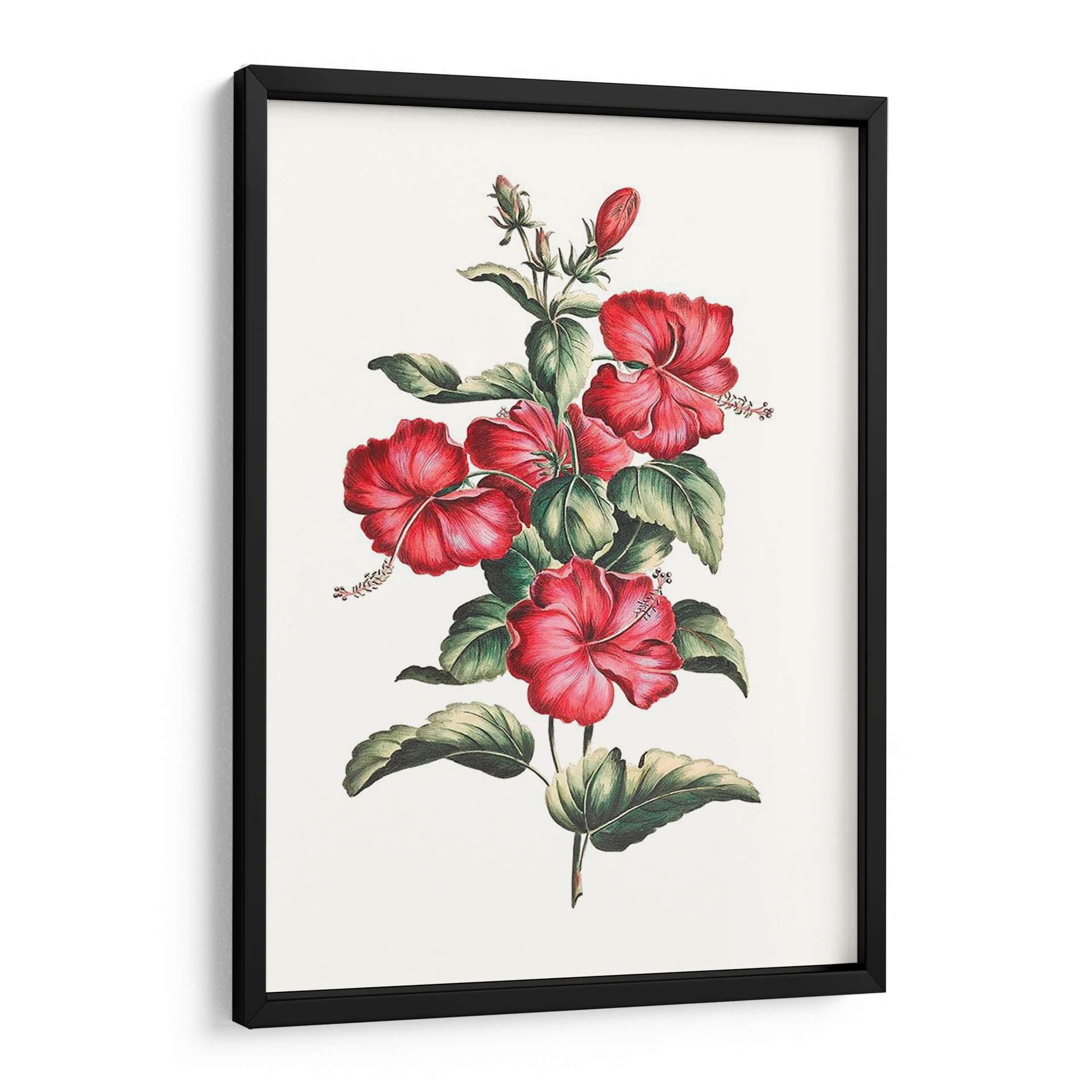 Embellezca su hogar con "Hibisco Floreciente III", un cuadro decorativo que captura la exuberancia y la vitalidad de la naturaleza. Esta obra presenta un racimo de vibrantes flores de hibisco en tonos rojos intensos, delicadamente dispuestas sobre un fondo neutro que realza su belleza. Las hojas verdes oscuras y detalladas aportan un contraste sutil, creando una composición equilibrada y armoniosa. El estilo de la ilustración evoca la precisión de las botanical studies clásicas, pero con un toque moderno que la hace perfecta para una amplia gama de decoraciones interiores, desde lo clásico hasta lo contemporáneo. Ideal para infundir un aire de frescura tropical y elegancia en su sala de estar, dormitorio o cualquier espacio que desee revitalizar. Este cuadro decorativo no solo añade un toque de color, sino que también invita a la contemplación y a la admiración de la belleza floral. Es una pieza versátil que puede ser el punto focal de una pared o complementar un arreglo de arte existente, aportando vida y sofisticación a su entorno. Descubra la serenidad y el encanto de esta representación artística del hibisco.