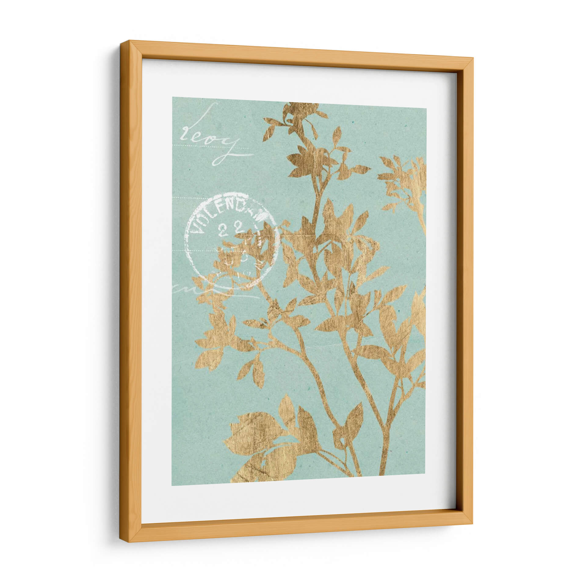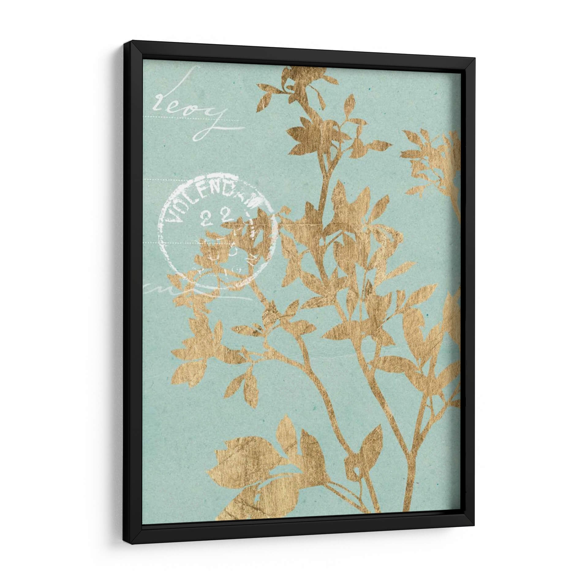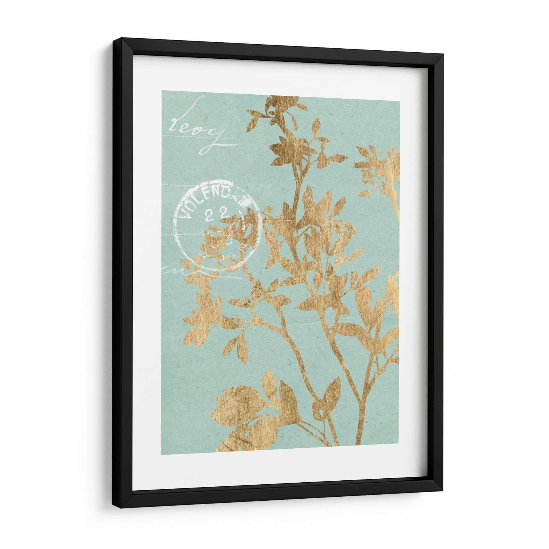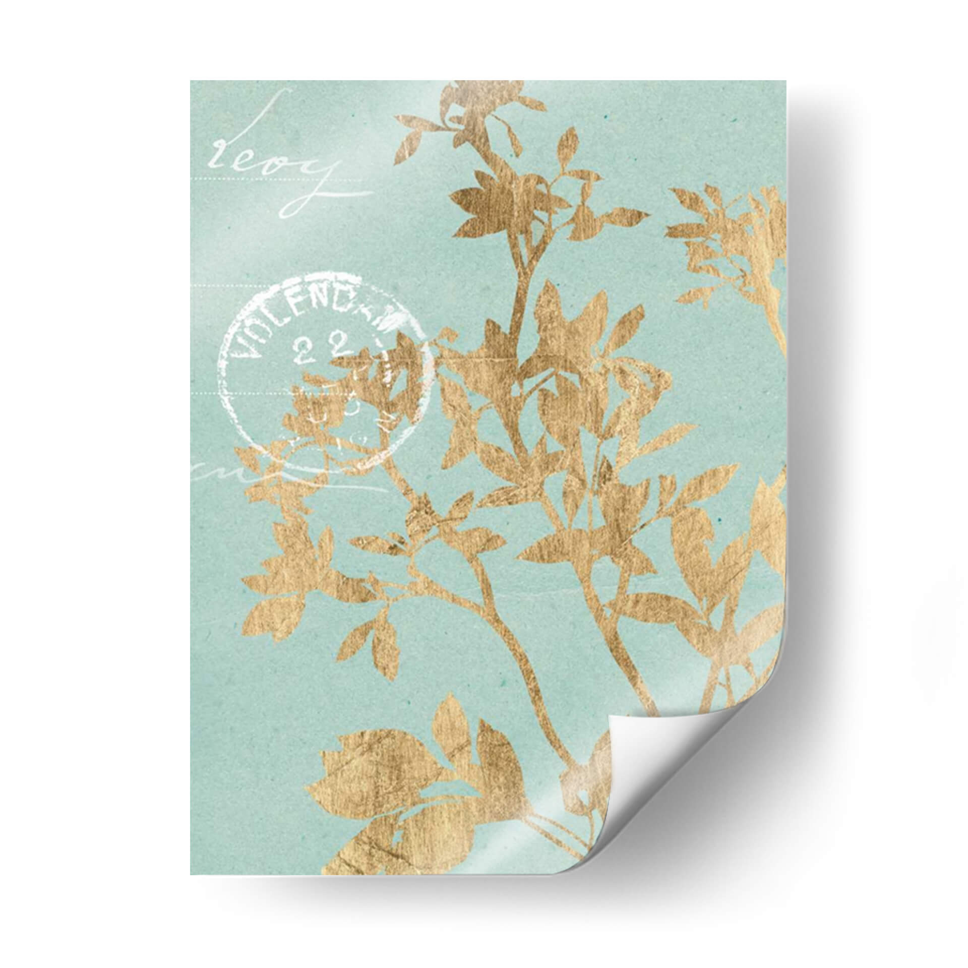 Este cautivador cuadro decorativo, 'Hojas Doradas II' de Jennifer Goldberger, introduce una elegancia botánica etérea en cualquier espacio. La obra presenta delicadas siluetas de hojas y ramas en un vibrante tono dorado, contrastando sutilmente con un fondo de color aguamarina suave y texturizado. La composición evoca una sensación de calma y naturaleza, como si una brisa suave agitara la vegetación. Pequeños toques de escritura estilizada y un sello postal vintage añaden un aire de nostalgia y encanto, sugiriendo una historia o un recuerdo. Este cuadro es ideal para aquellos que buscan infundir serenidad y un toque de sofisticación en sus hogares u oficinas. Su paleta de colores, que combina el brillo del oro con la tranquilidad del aguamarina, lo hace versátil para una variedad de estilos de decoración, desde el moderno hasta el clásico o bohemio. Un punto focal sutil pero impactante, 'Hojas Doradas II' invita a la contemplación y añade un toque de lujo discreto a tus paredes.