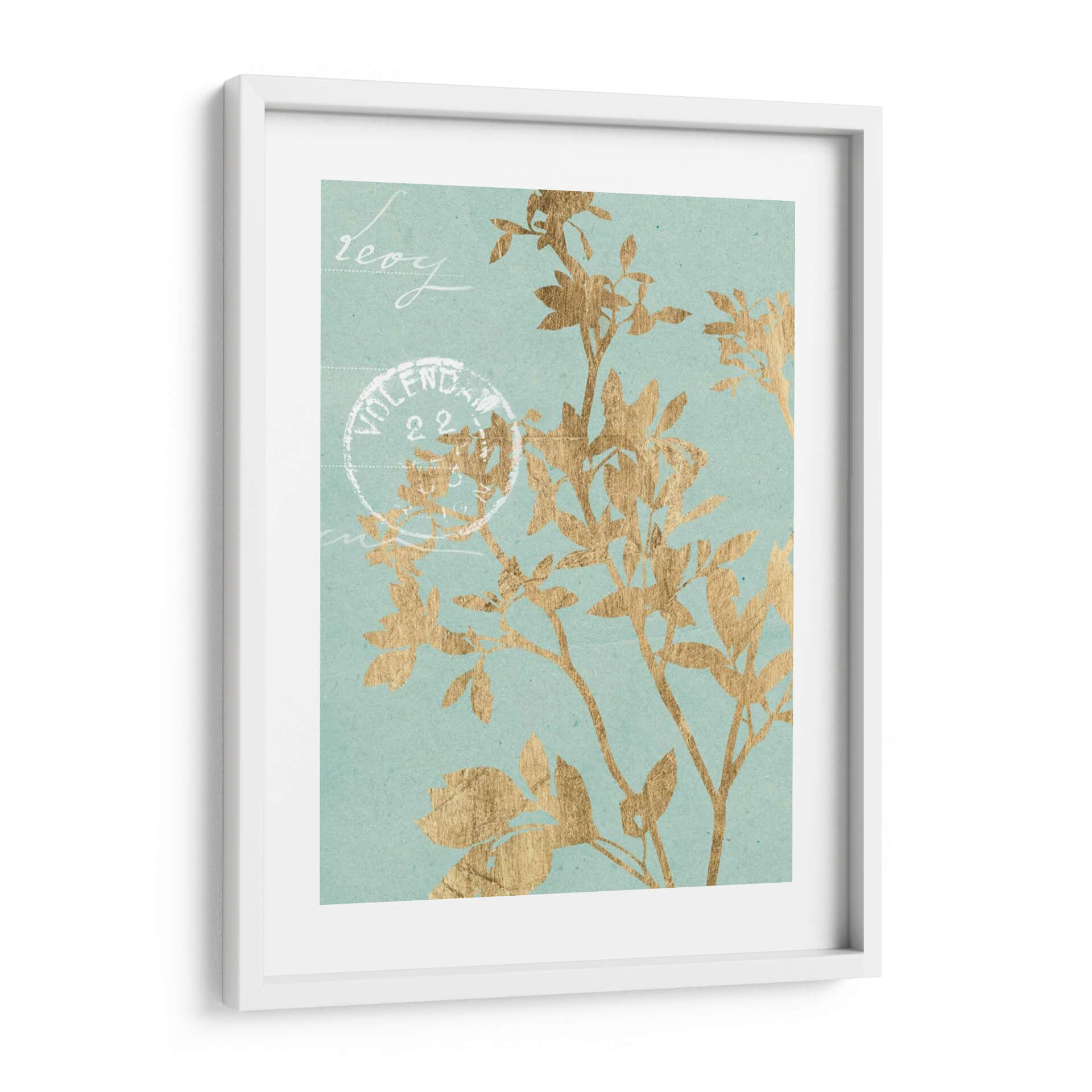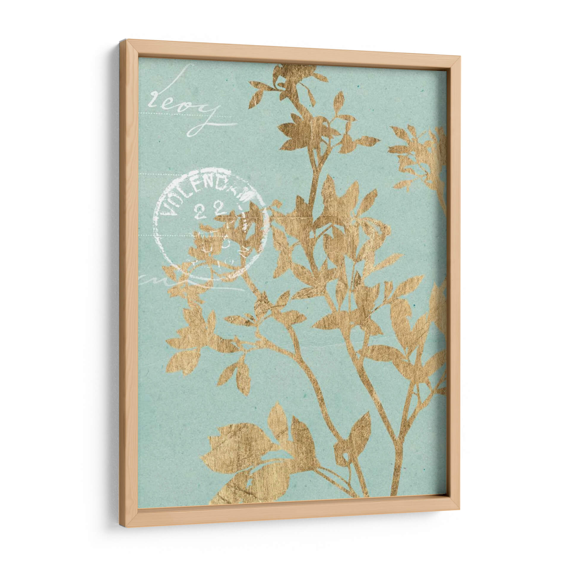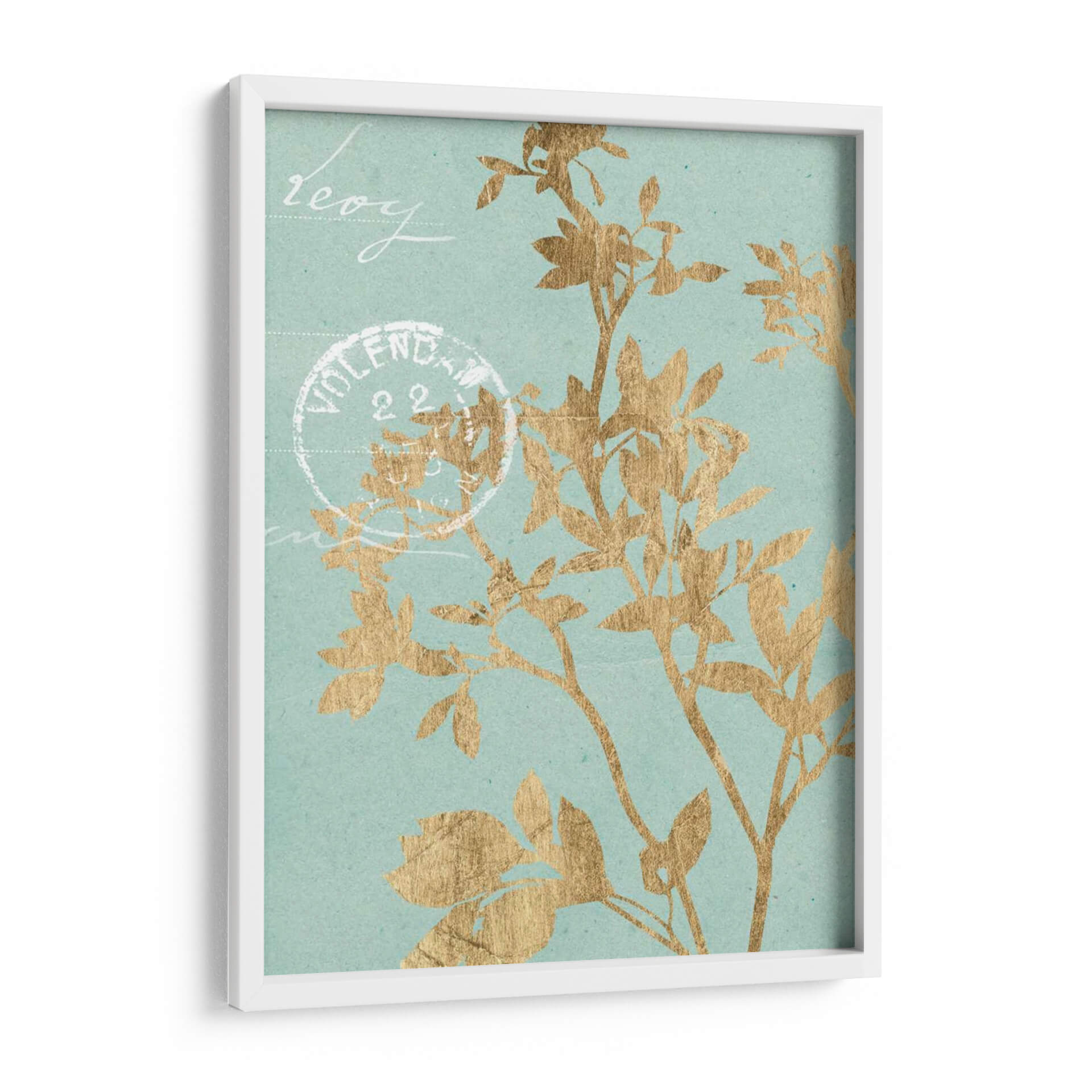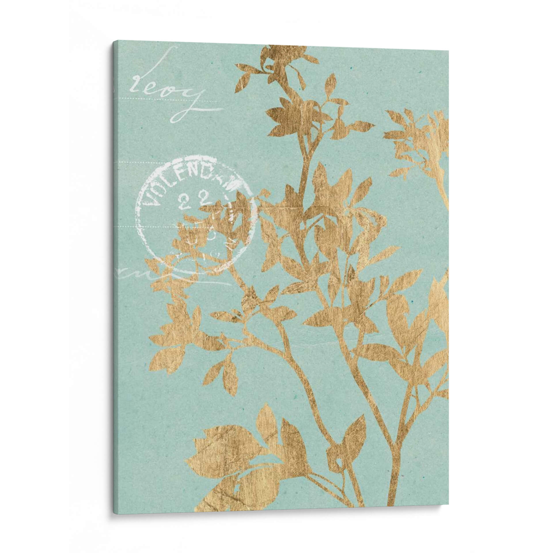 Este cautivador cuadro decorativo, 'Hojas Doradas II' de Jennifer Goldberger, introduce una elegancia botánica etérea en cualquier espacio. La obra presenta delicadas siluetas de hojas y ramas en un vibrante tono dorado, contrastando sutilmente con un fondo de color aguamarina suave y texturizado. La composición evoca una sensación de calma y naturaleza, como si una brisa suave agitara la vegetación. Pequeños toques de escritura estilizada y un sello postal vintage añaden un aire de nostalgia y encanto, sugiriendo una historia o un recuerdo. Este cuadro es ideal para aquellos que buscan infundir serenidad y un toque de sofisticación en sus hogares u oficinas. Su paleta de colores, que combina el brillo del oro con la tranquilidad del aguamarina, lo hace versátil para una variedad de estilos de decoración, desde el moderno hasta el clásico o bohemio. Un punto focal sutil pero impactante, 'Hojas Doradas II' invita a la contemplación y añade un toque de lujo discreto a tus paredes.