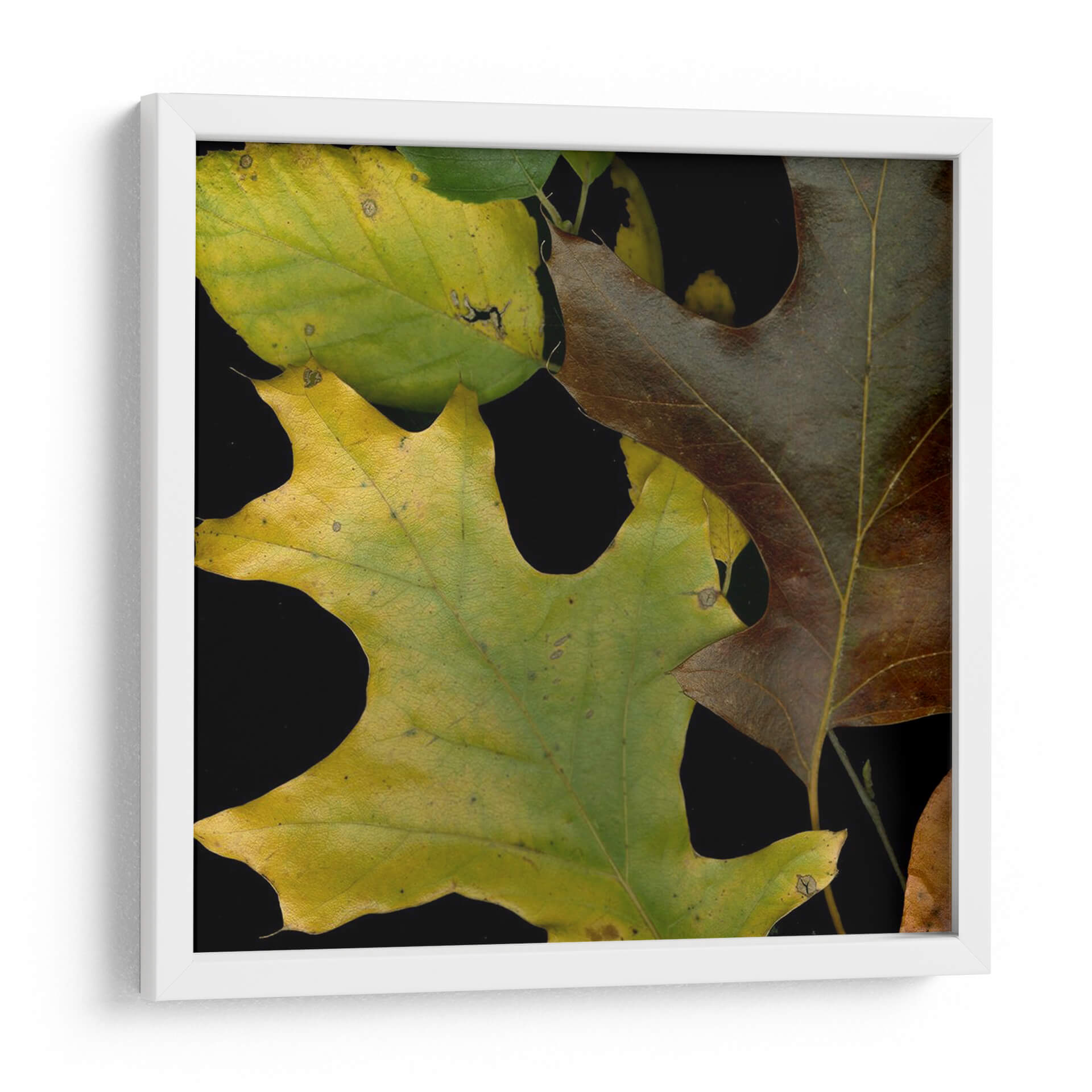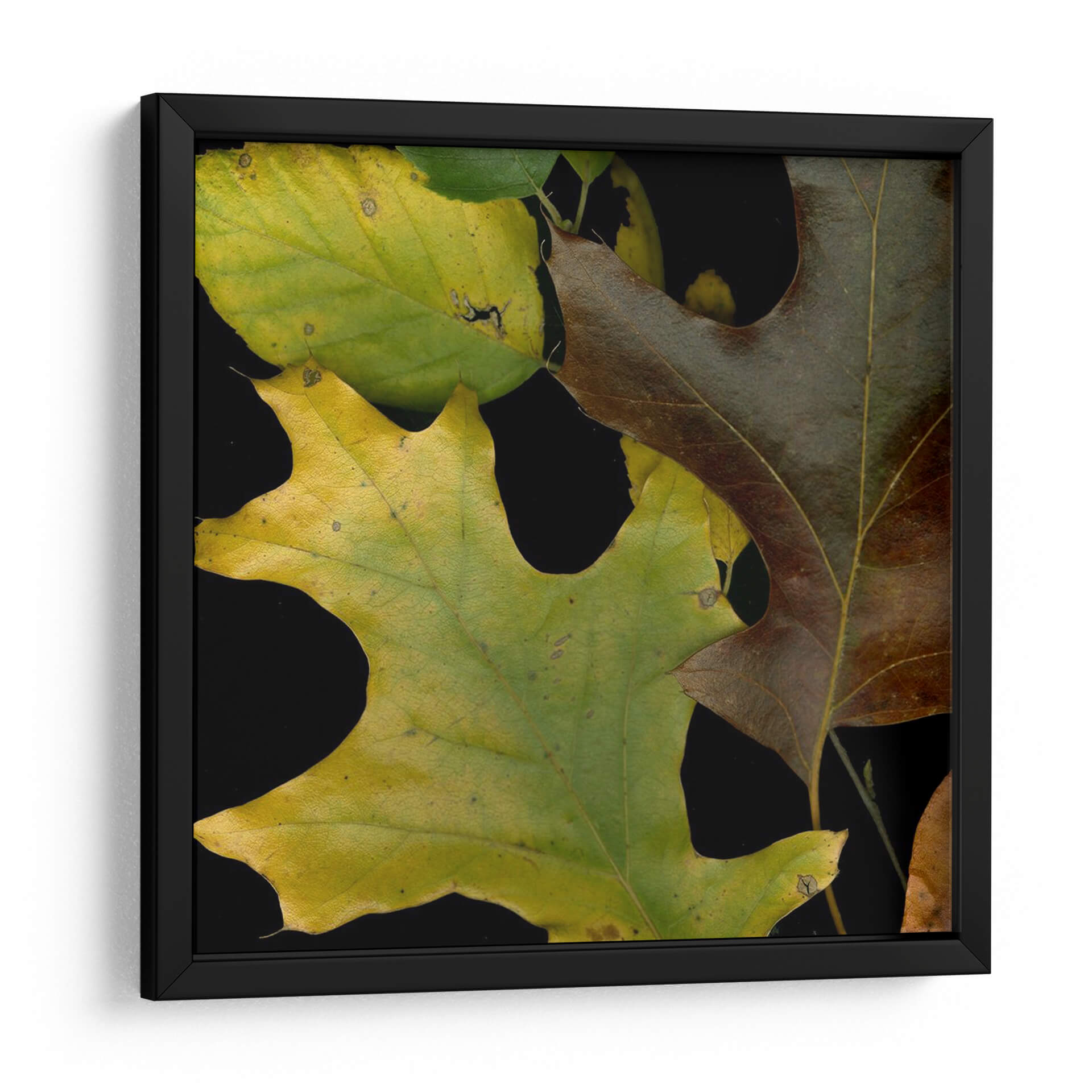 Sumérgete en la belleza otoñal con "Hojas Vívidas II", una obra de arte que captura la esencia de la naturaleza en su máxima expresión. Este cuadro decorativo presenta un primer plano detallado de hojas de roble, en transición de verdes vibrantes a marrones profundos, evocando la riqueza y el ciclo de la vida. La composición, con un fondo negro intenso, resalta la textura y las venas de cada hoja, creando un contraste impactante y moderno. La paleta de colores terrosos y dorados aporta calidez y serenidad, transformando cualquier espacio en un refugio acogedor. Ideal para quienes buscan añadir un toque orgánico y sofisticado a su hogar u oficina, "Hojas Vívidas II" es una pieza que inspira contemplación y conexión con el entorno natural. Su estilo fotográfico y realista, combinado con la simplicidad del tema, la convierte en una adición versátil para decoraciones contemporáneas, rústicas o minimalistas. Permite que la vitalidad y la elegancia de estas hojas enmarcadas traigan un pedazo de la serenidad del bosque a tu vida diaria, convirtiéndose en un punto focal que invita a la calma y la reflexión.