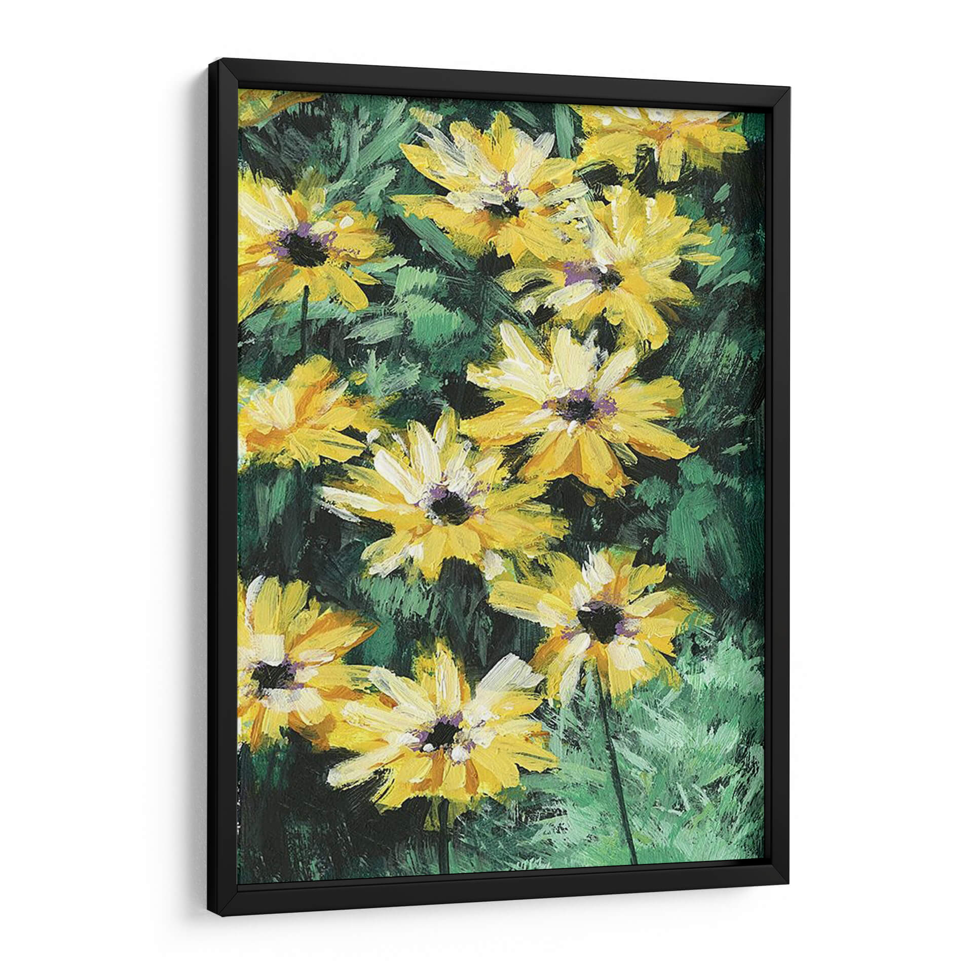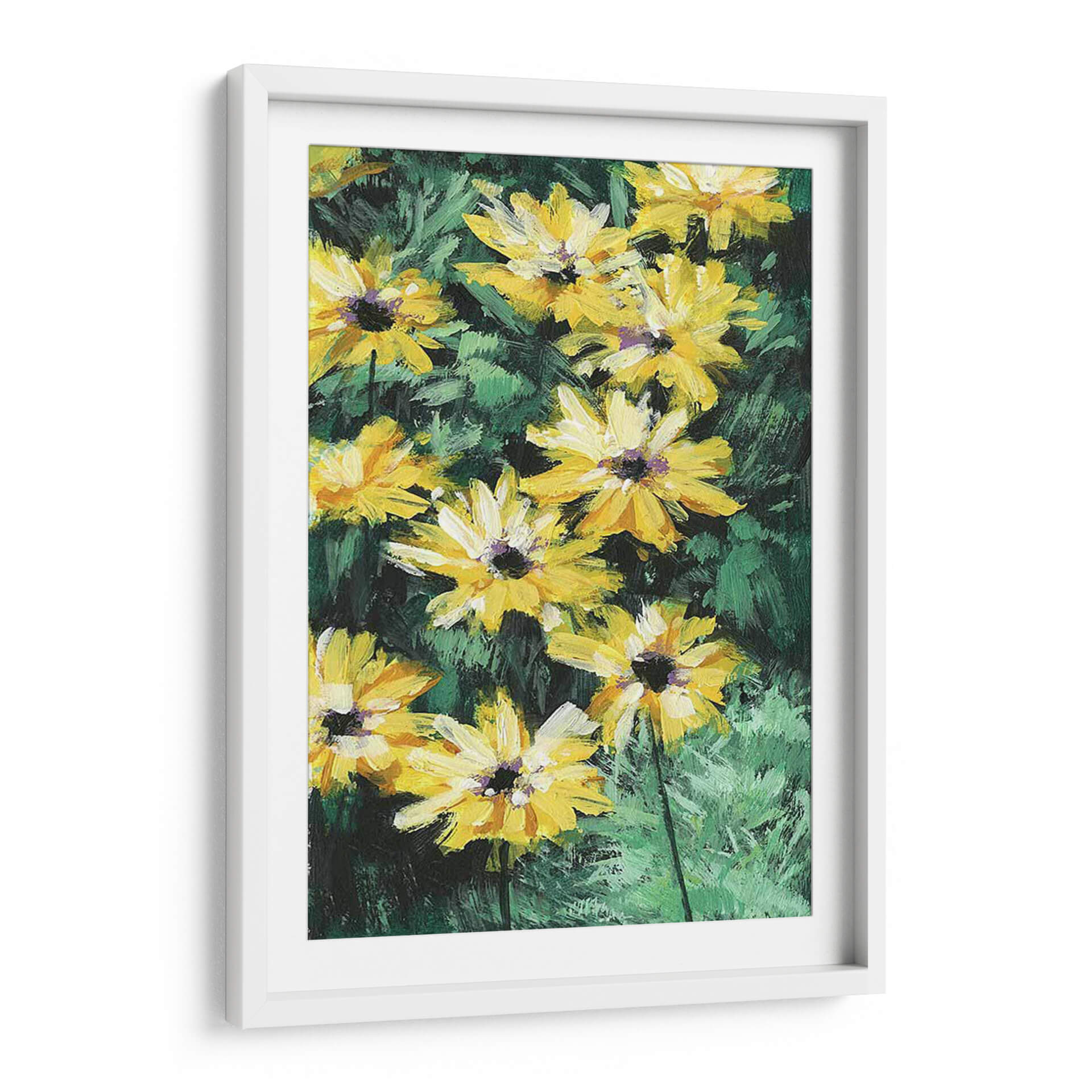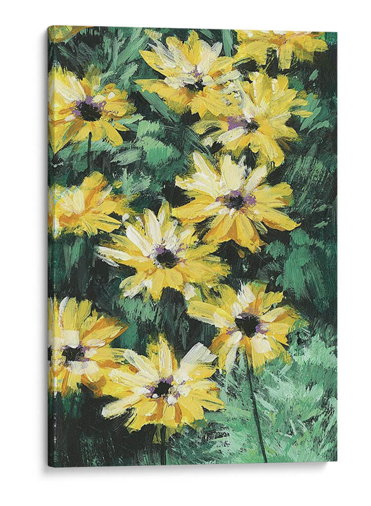 Inunda tu hogar con la vitalidad y el color de "Impresiones Florales I", una obra de arte contemporáneo de Melissa Wang que captura la esencia de la naturaleza con pinceladas audaces y vibrantes. Este cuadro decorativo presenta un grupo de flores amarillas radiantes, con pétalos desplegados que parecen capturar la luz del sol, contrastando con un fondo de follaje verde oscuro y texturizado. El estilo pictórico, con su aplicación de pintura visible y expresiva, evoca una sensación de movimiento y vida, trayendo la frescura de un jardín a cualquier espacio. Los tonos amarillos intensos transmiten alegría y optimismo, mientras que los verdes profundos añaden una base de serenidad y conexión con la tierra. Ideal para salas de estar, comedores o incluso oficinas, "Impresiones Florales I" es una pieza versátil que puede adaptarse a diversos estilos de decoración, desde el moderno hasta el rústico, aportando un toque de sofisticación natural y energía positiva. Descubre cómo este cuadro transformará tu pared en una ventana a un prado florecido, añadiendo calidez y un acento visual inolvidable a tu ambiente.
