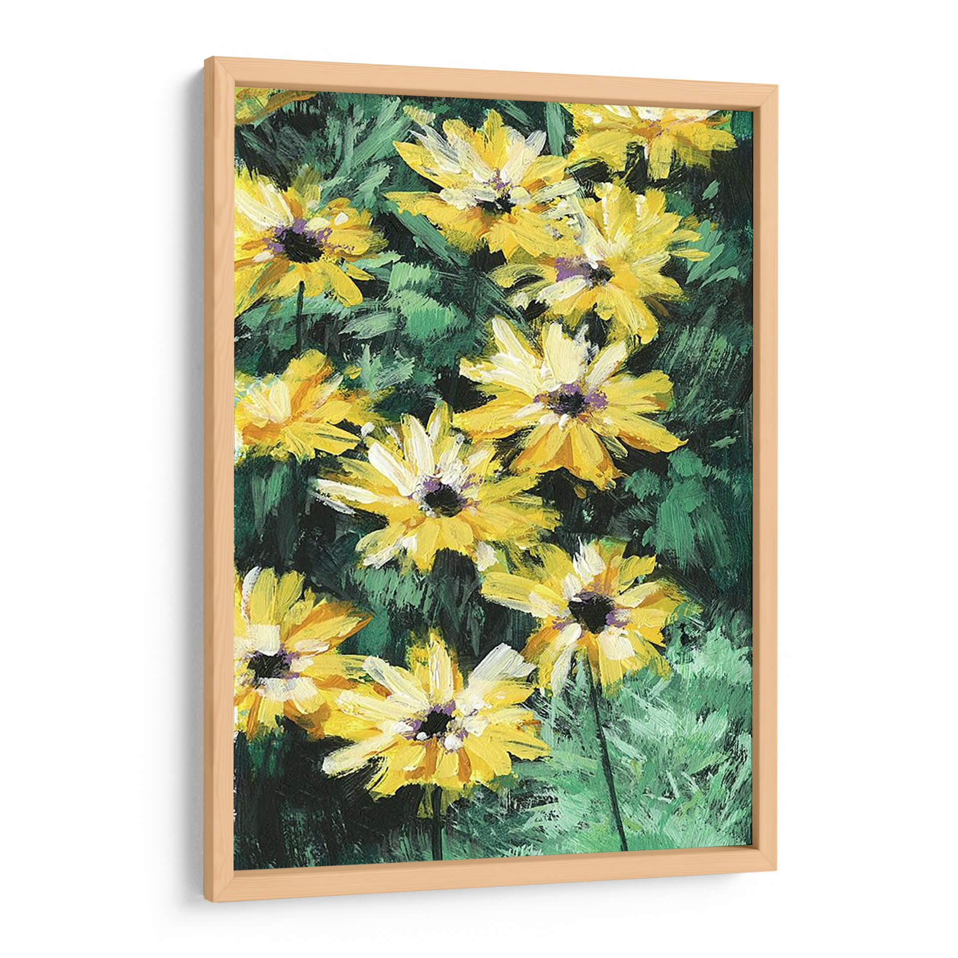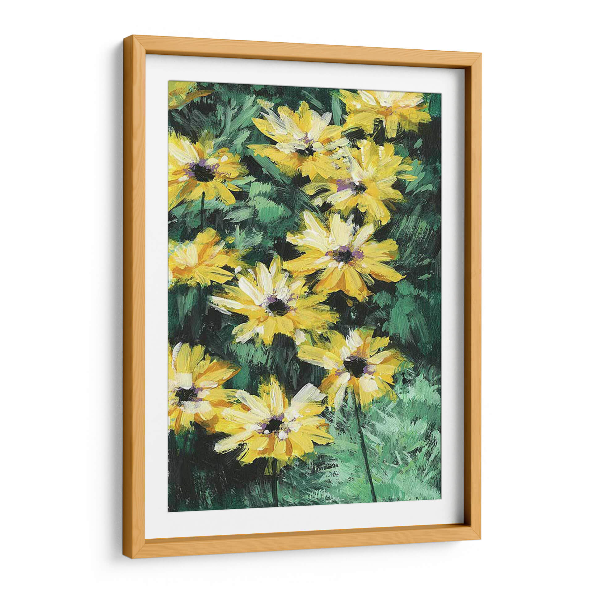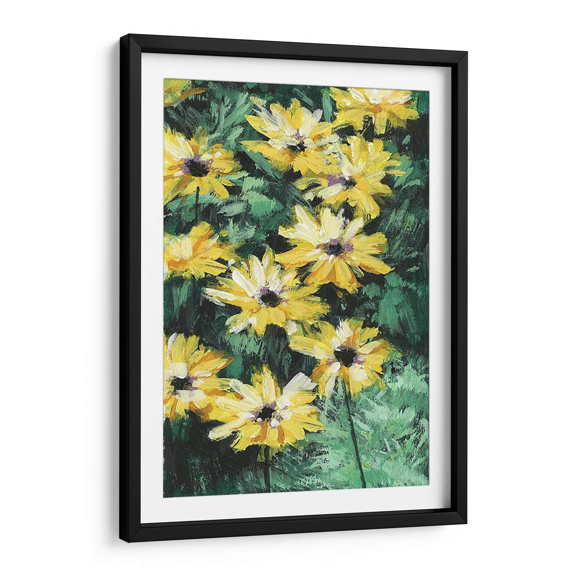 Inunda tu hogar con la vitalidad y el color de "Impresiones Florales I", una obra de arte contemporáneo de Melissa Wang que captura la esencia de la naturaleza con pinceladas audaces y vibrantes. Este cuadro decorativo presenta un grupo de flores amarillas radiantes, con pétalos desplegados que parecen capturar la luz del sol, contrastando con un fondo de follaje verde oscuro y texturizado. El estilo pictórico, con su aplicación de pintura visible y expresiva, evoca una sensación de movimiento y vida, trayendo la frescura de un jardín a cualquier espacio. Los tonos amarillos intensos transmiten alegría y optimismo, mientras que los verdes profundos añaden una base de serenidad y conexión con la tierra. Ideal para salas de estar, comedores o incluso oficinas, "Impresiones Florales I" es una pieza versátil que puede adaptarse a diversos estilos de decoración, desde el moderno hasta el rústico, aportando un toque de sofisticación natural y energía positiva. Descubre cómo este cuadro transformará tu pared en una ventana a un prado florecido, añadiendo calidez y un acento visual inolvidable a tu ambiente.