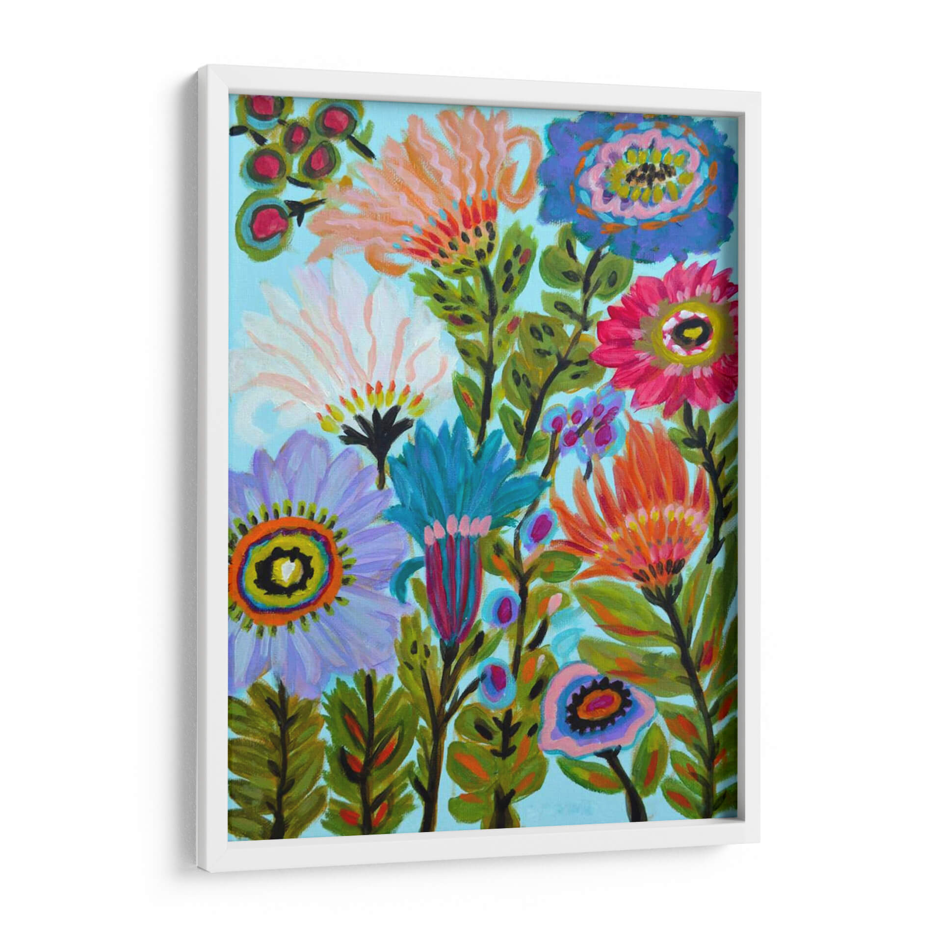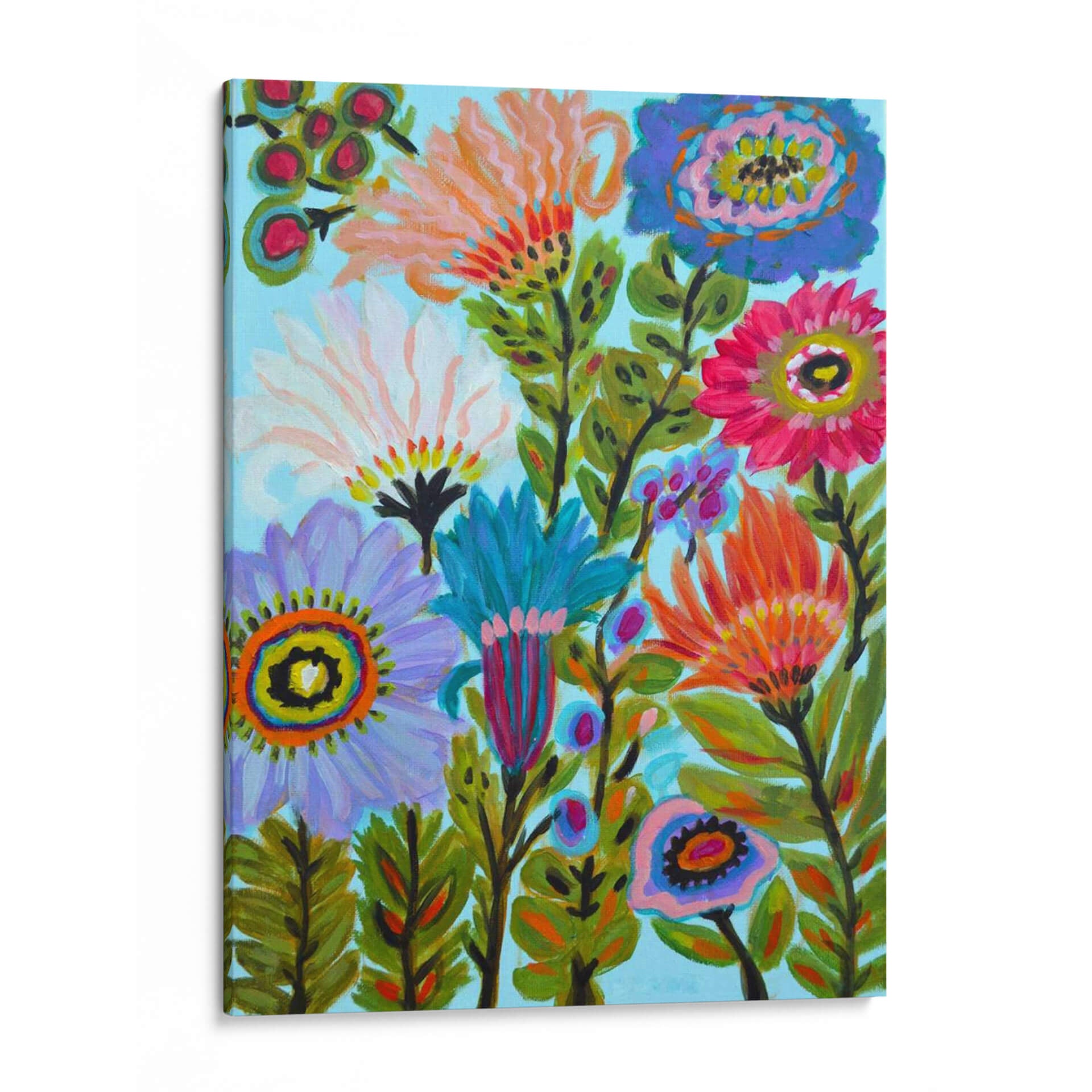Sumérgete en la exuberancia vibrante del 'Jardín Secreto Floral Iv', una cautivadora obra de arte de Karen Fields que trae la alegría de la naturaleza al interior. Este cuadro decorativo presenta un arreglo dinámico de flores estilizadas y follaje, ejecutado con pinceladas audaces y una paleta de colores electrizante. Los tonos azules celestes del fondo crean un lienzo sereno para el estallido de rosas intensos, naranjas ardientes, púrpuras profundos y amarillos brillantes que componen las flores. Cada pétalo y hoja está representado con un toque expresivo, dando a la pieza una energía contemporánea y un aire de ensueño. La composición, llena y detallada, invita a la contemplación de las formas únicas y los centros intrincados de cada flor, evocando una sensación de descubrimiento y maravilla. Ideal para añadir un toque de color y vitalidad a cualquier sala de estar, dormitorio o estudio, este cuadro es una celebración de la belleza floral en su forma más artística y enérgica. Transforma tu espacio con este jardín secreto lleno de vida, una pieza que resonará con amantes del arte y la naturaleza por igual.