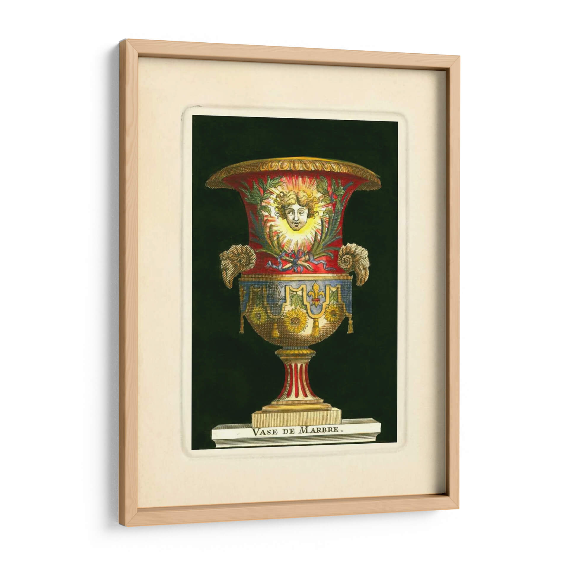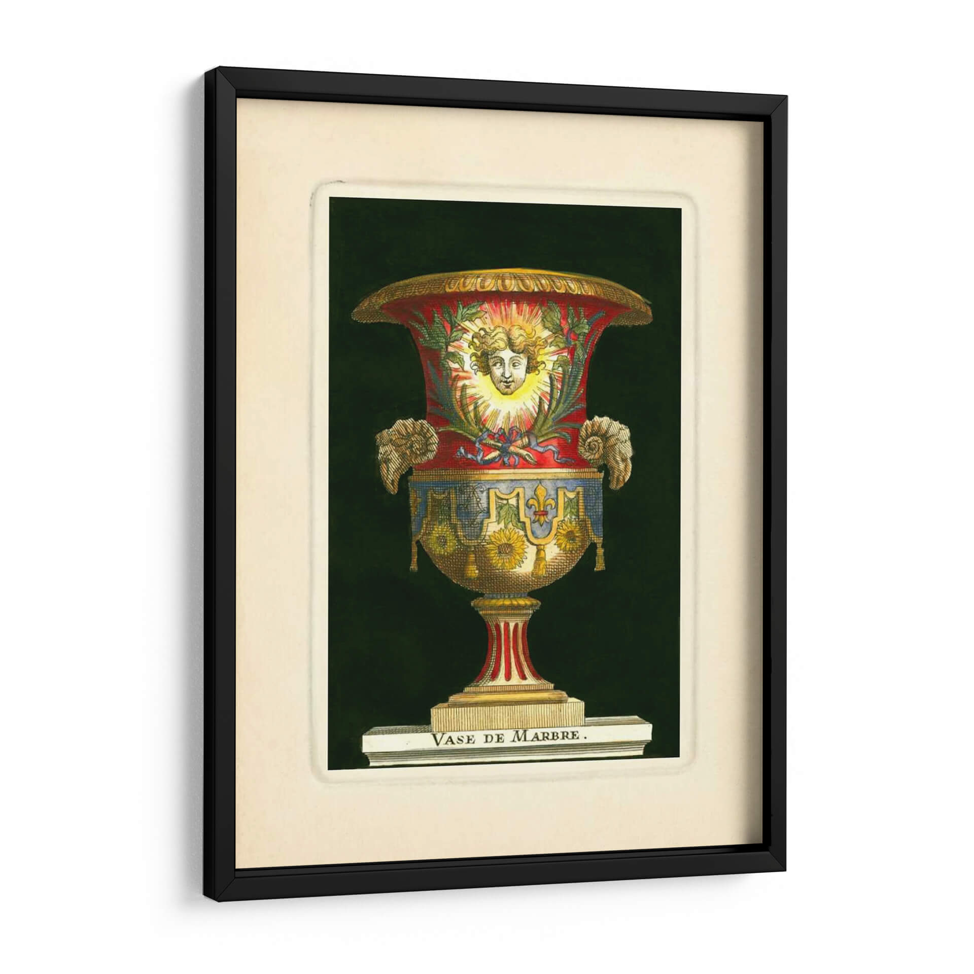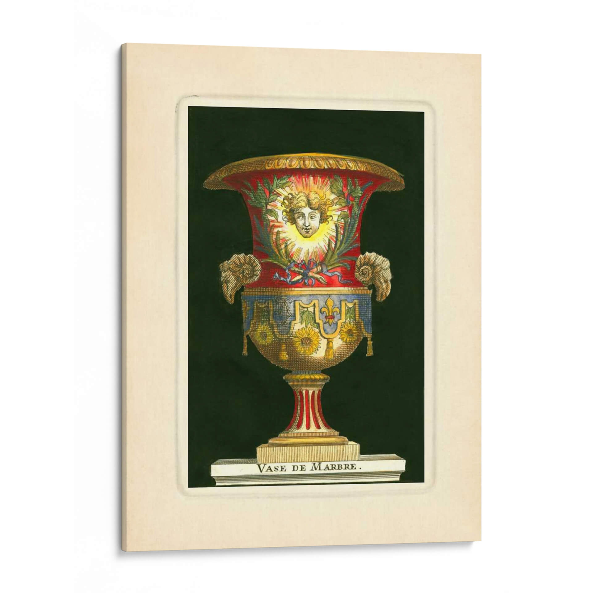 Emb uevo en un viaje visual al Renacimiento con nuestro impresionante cuadro decorativo "Jarrón Con Girasoles" del artista S. Thomassin. Esta obra maestra captura la opulencia y el detalle de un jarrón ornamentado, cuya forma se realza con una paleta de colores rica y vibrante. Los tonos rojos profundos se entrelazan con azules intensos y dorados resplandecientes, creando un contraste cautivador sobre un fondo oscuro y misterioso. El jarrón en sí está adornado con motivos florales, destacando la presencia de girasoles, que aportan un toque de calidez y vitalidad. La figura central, un rostro sereno enmarcado por rayos solares, evoca una sensación de divinidad y luz, mientras que los detalles intrincados, como las volutas y los adornos laterales, añaden una dimensión de riqueza y sofisticación. Este cuadro es una pieza que no solo decora, sino que también cuenta una historia de arte y cultura. Ideal para aquellos que buscan añadir un punto de interés clásico pero audaz a su sala de estar, estudio u oficina, este cuadro decorativo "Jarrón Con Girasoles" es una invitación a la contemplación y al disfrute de la belleza atemporal.