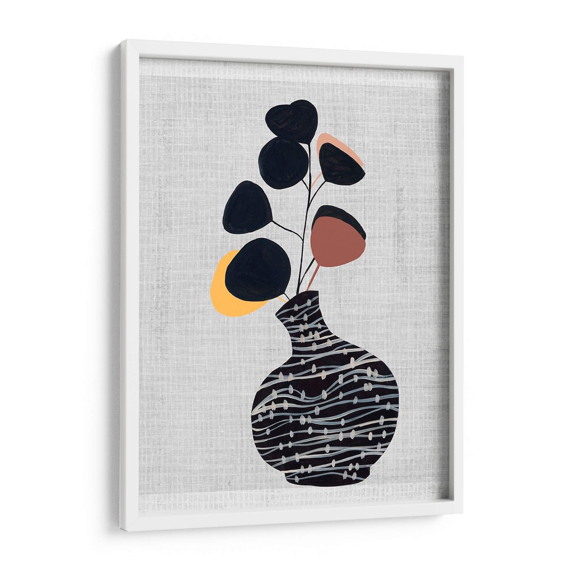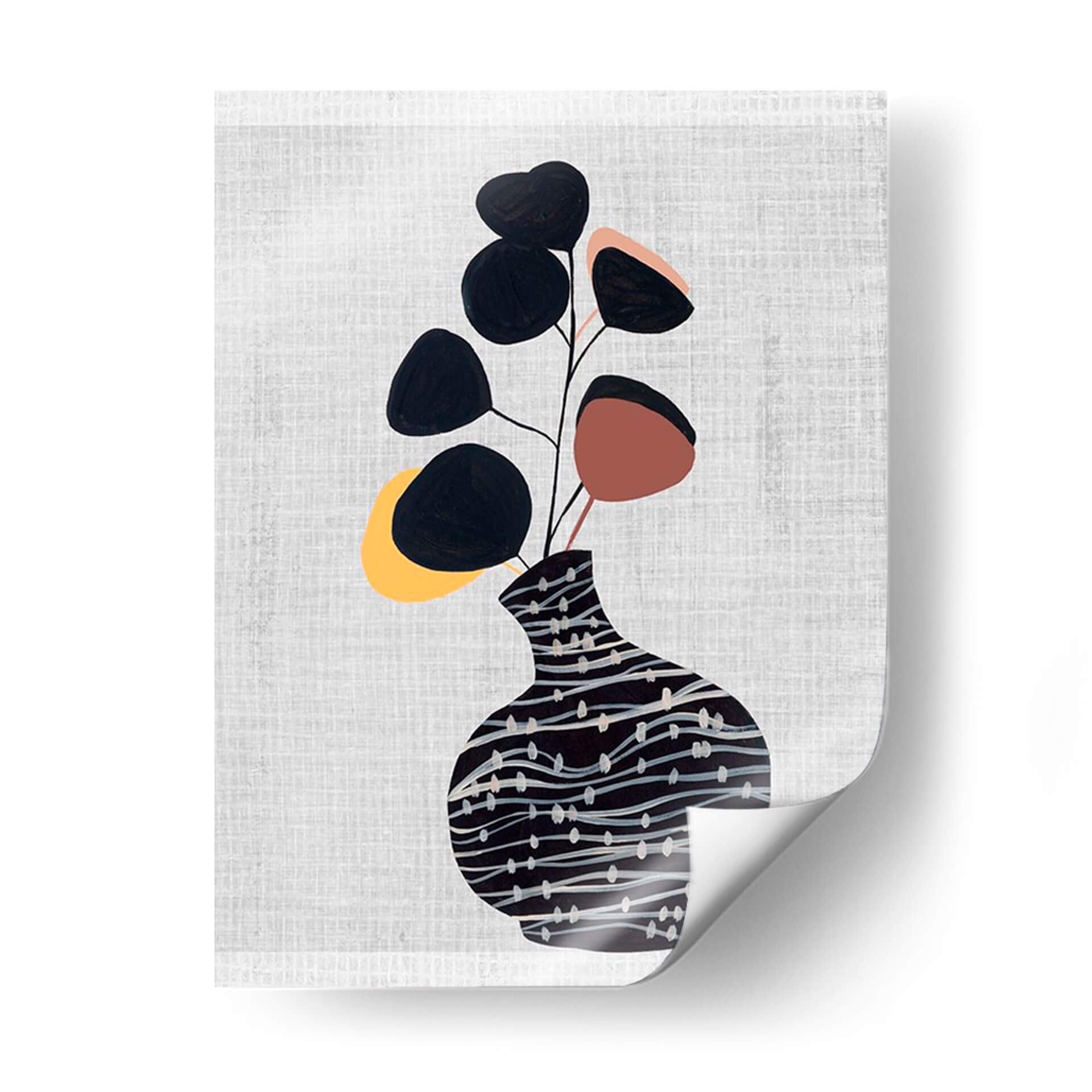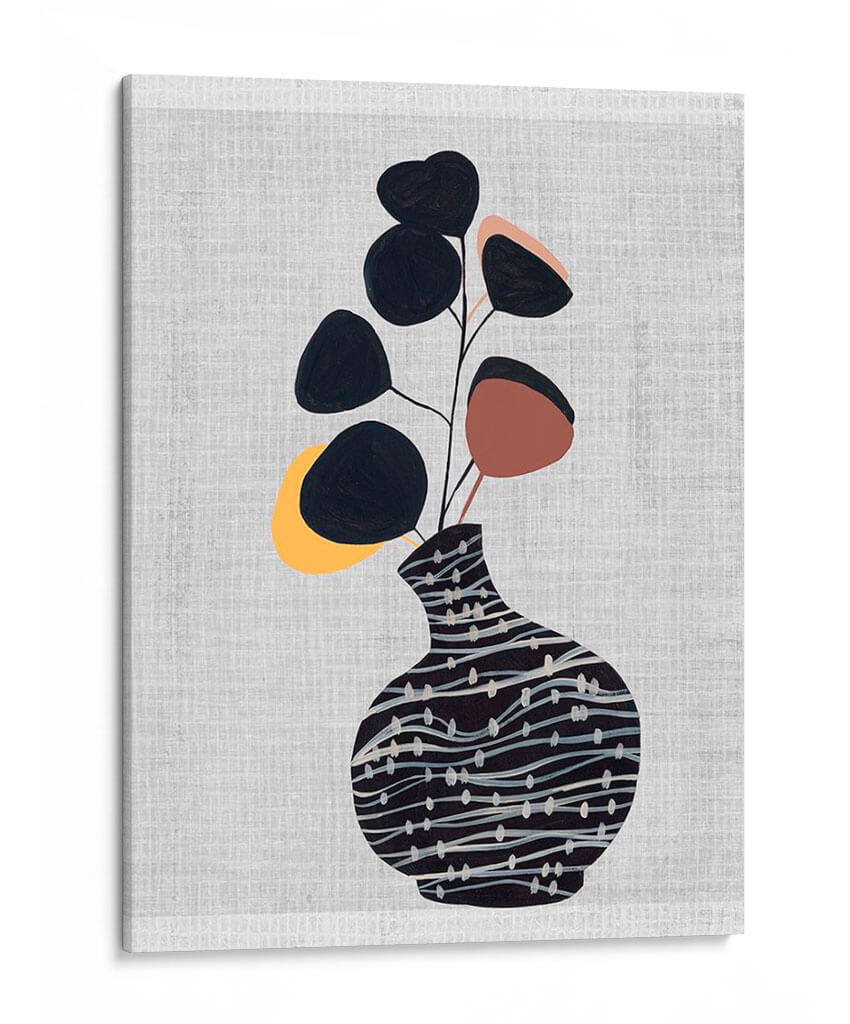 Transforma tu hogar con el cautivador cuadro decorativo "Jarrón Decorado Con Planta I", una obra de arte contemporáneo de Melissa Wang que combina elegancia botánica y diseño moderno. Esta pieza presenta un estilizado jarrón adornado con un patrón de líneas sinuosas y puntos sutiles en tonos oscuros, que sirve de base para un delicado arreglo de hojas abstractas en negro, terracota y toques amarillos. El fondo texturizado en gris claro aporta una sensación de calma y sofisticación, haciendo que los elementos centrales resalten con sutileza. La composición, de estilo minimalista y orgánico, evoca una atmósfera de serenidad y conexión con la naturaleza, ideal para espacios que buscan un toque de frescura y diseño. Este cuadro decorativo es perfecto para añadir un punto de interés visual a tu sala de estar, dormitorio, oficina o cualquier rincón que necesite una dosis de arte contemporáneo y tranquilidad. Su paleta de colores versátil y su diseño limpio lo convierten en una adición armoniosa a una variedad de estilos decorativos, desde el escandinavo hasta el moderno y el ecléctico. Permite que esta obra de Melissa Wang insufla vida y estilo a tus paredes, creando un ambiente acogedor y lleno de personalidad.