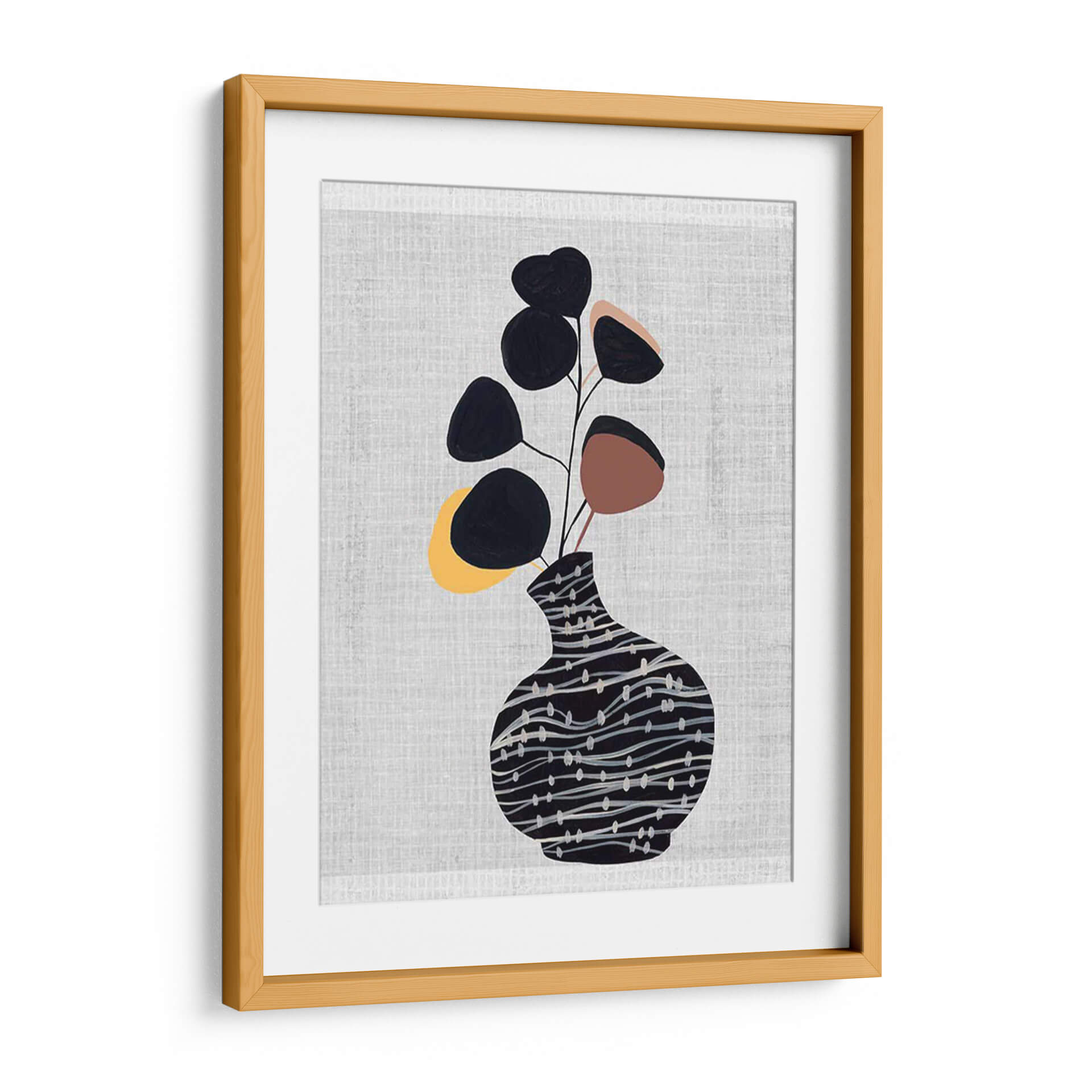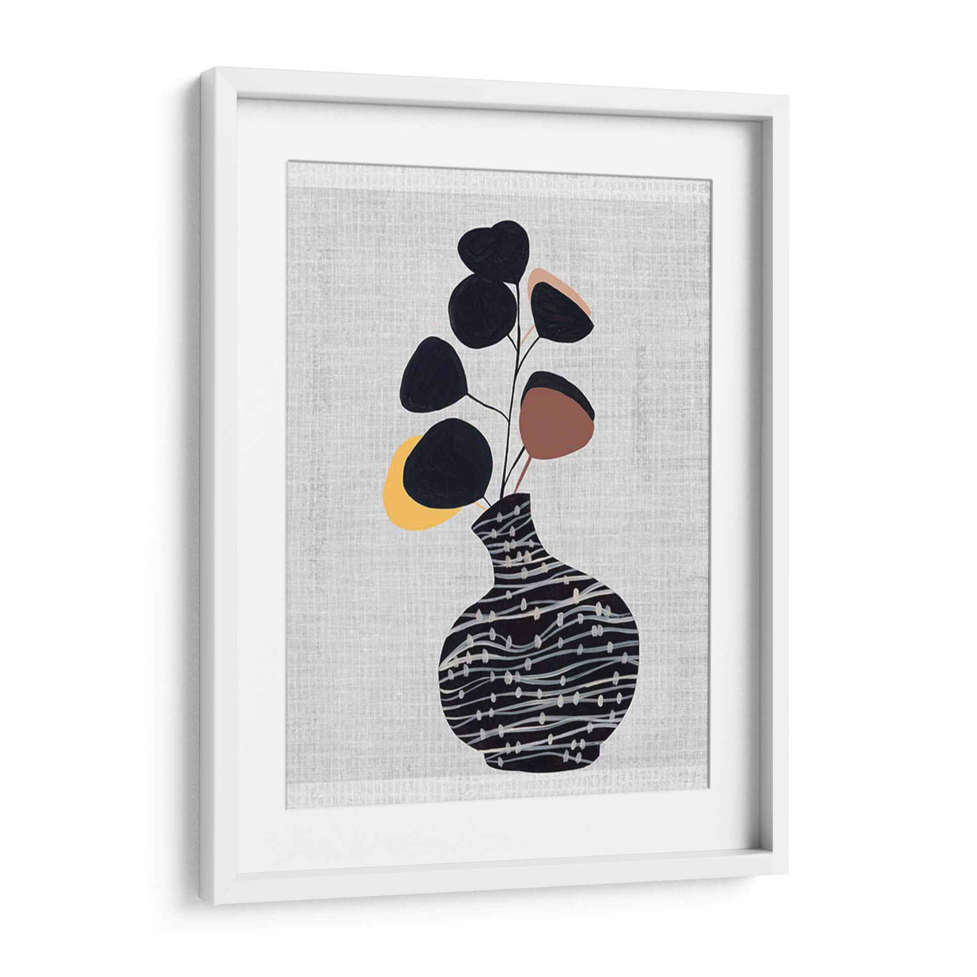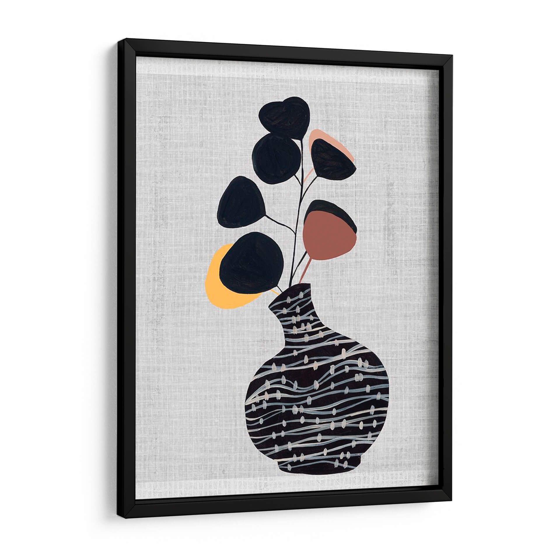 Transforma tu hogar con el cautivador cuadro decorativo "Jarrón Decorado Con Planta I", una obra de arte contemporáneo de Melissa Wang que combina elegancia botánica y diseño moderno. Esta pieza presenta un estilizado jarrón adornado con un patrón de líneas sinuosas y puntos sutiles en tonos oscuros, que sirve de base para un delicado arreglo de hojas abstractas en negro, terracota y toques amarillos. El fondo texturizado en gris claro aporta una sensación de calma y sofisticación, haciendo que los elementos centrales resalten con sutileza. La composición, de estilo minimalista y orgánico, evoca una atmósfera de serenidad y conexión con la naturaleza, ideal para espacios que buscan un toque de frescura y diseño. Este cuadro decorativo es perfecto para añadir un punto de interés visual a tu sala de estar, dormitorio, oficina o cualquier rincón que necesite una dosis de arte contemporáneo y tranquilidad. Su paleta de colores versátil y su diseño limpio lo convierten en una adición armoniosa a una variedad de estilos decorativos, desde el escandinavo hasta el moderno y el ecléctico. Permite que esta obra de Melissa Wang insufla vida y estilo a tus paredes, creando un ambiente acogedor y lleno de personalidad.