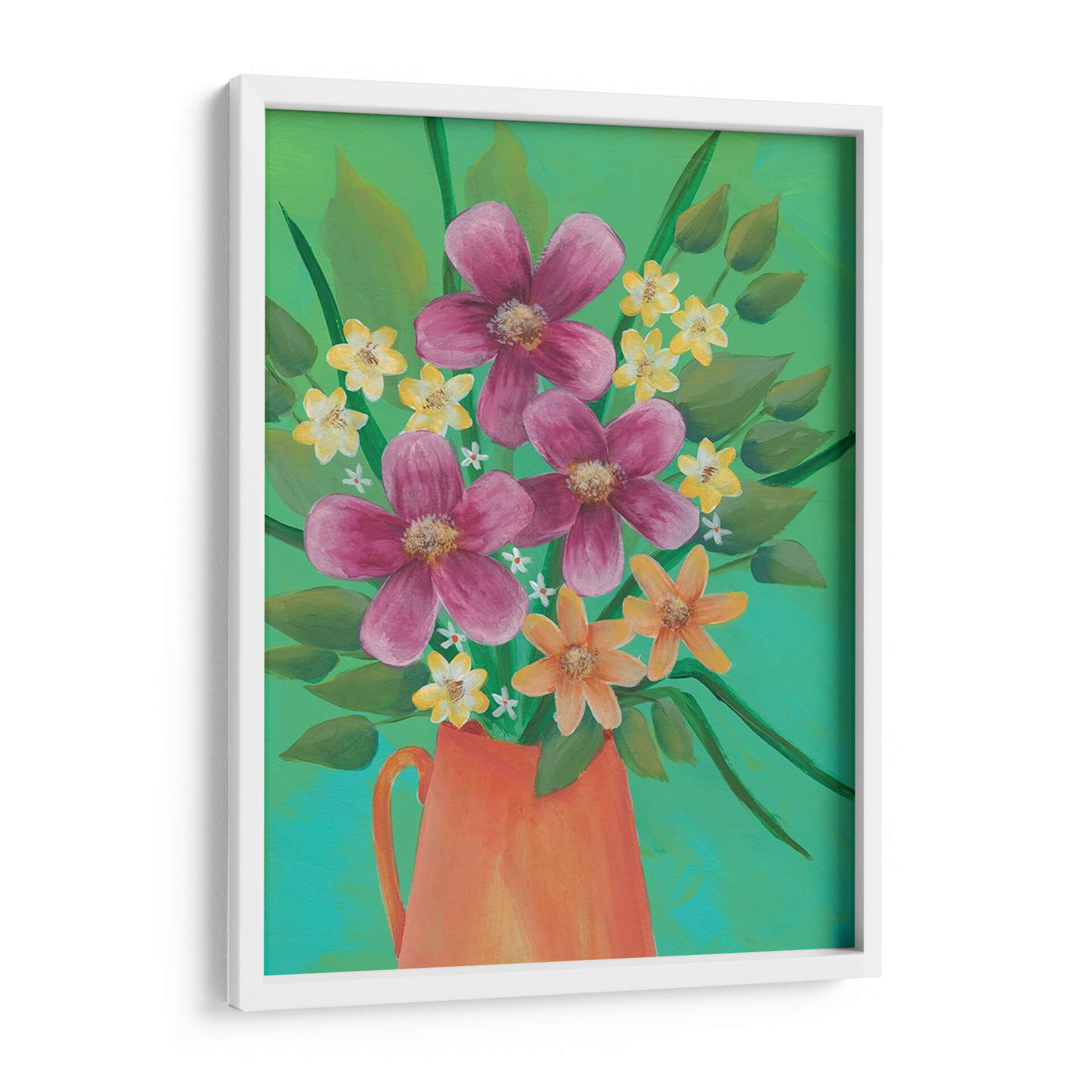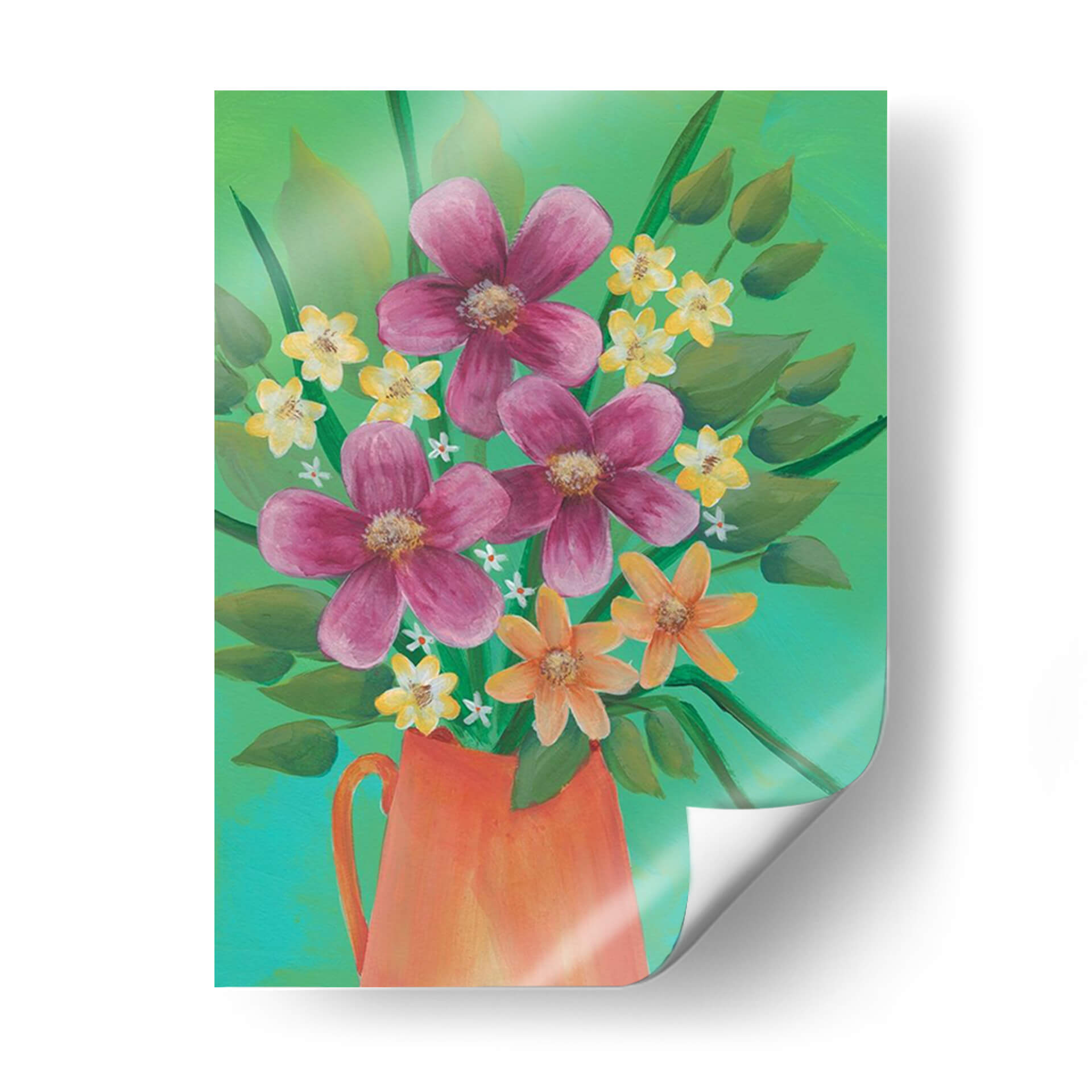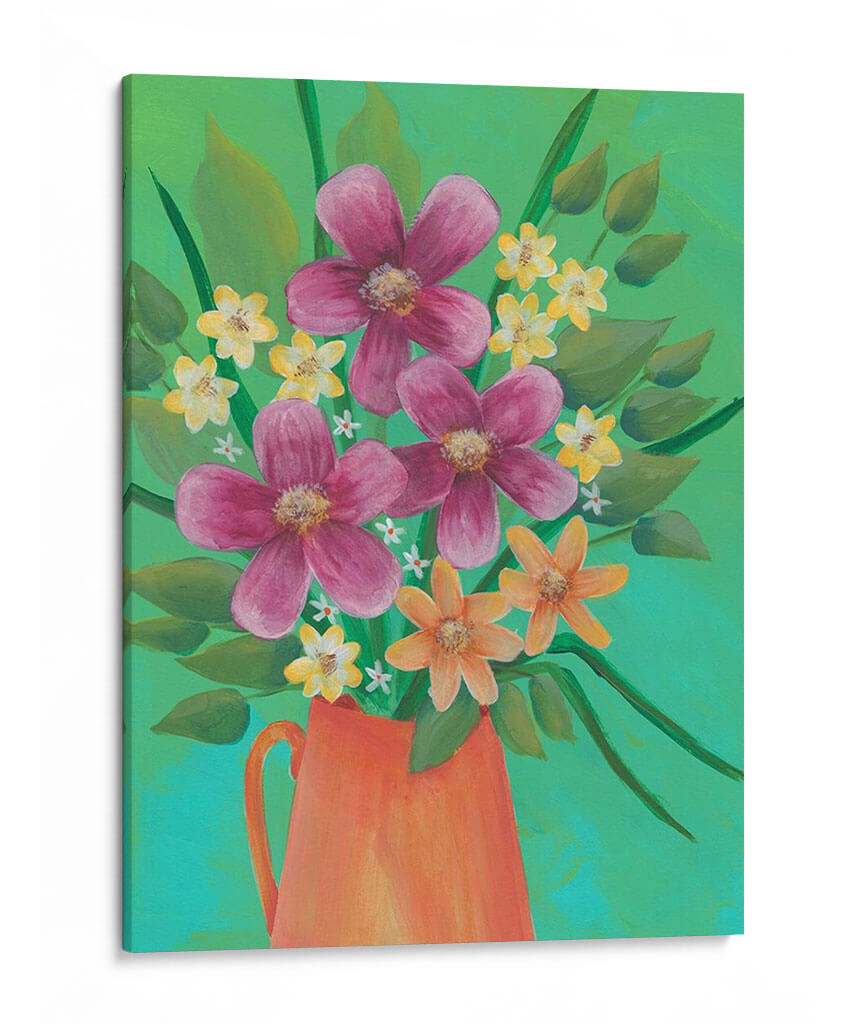Añada un estallido de alegría y color a su hogar con "Jubilante Floral II", una cautivadora obra de arte de Regina Moore. Esta pieza vibrante presenta un exuberante ramo de flores en tonos fucsia, naranja y amarillo, dispuestas con un estilo audaz y expresivo que evoca la vitalidad de la naturaleza. El fondo, una mezcla de verdes brillantes y turquesas, realza la vivacidad de las flores, creando una atmósfera de energía positiva y optimismo. La composición, centrada en un jarrón de terracota rústico, aporta un toque terrenal que equilibra la explosión floral. La técnica de pintura, que sugiere pinceladas sueltas y una aproximación casi impresionista, añade profundidad y textura, invitando al espectador a sumergirse en la escena. "Jubilante Floral II" es ideal para espacios que buscan un toque de carácter y luminosidad, como una sala de estar moderna, un comedor luminoso o incluso un estudio creativo. Transforma su espacio con esta pieza que celebra la belleza efímera de las flores y la fuerza expresiva del arte contemporáneo.