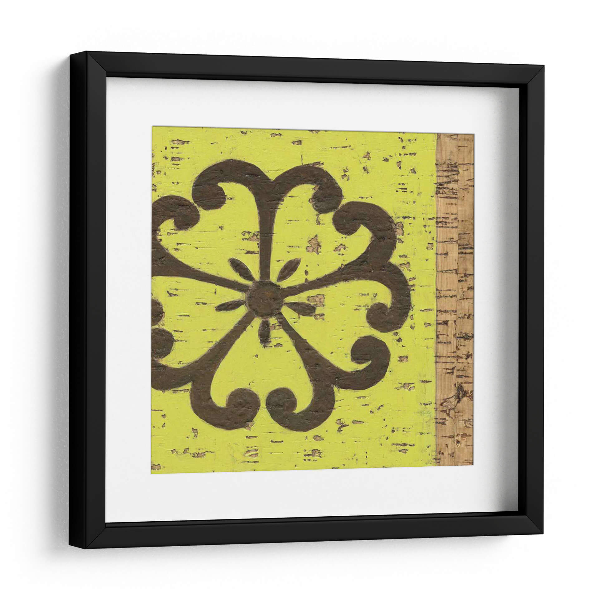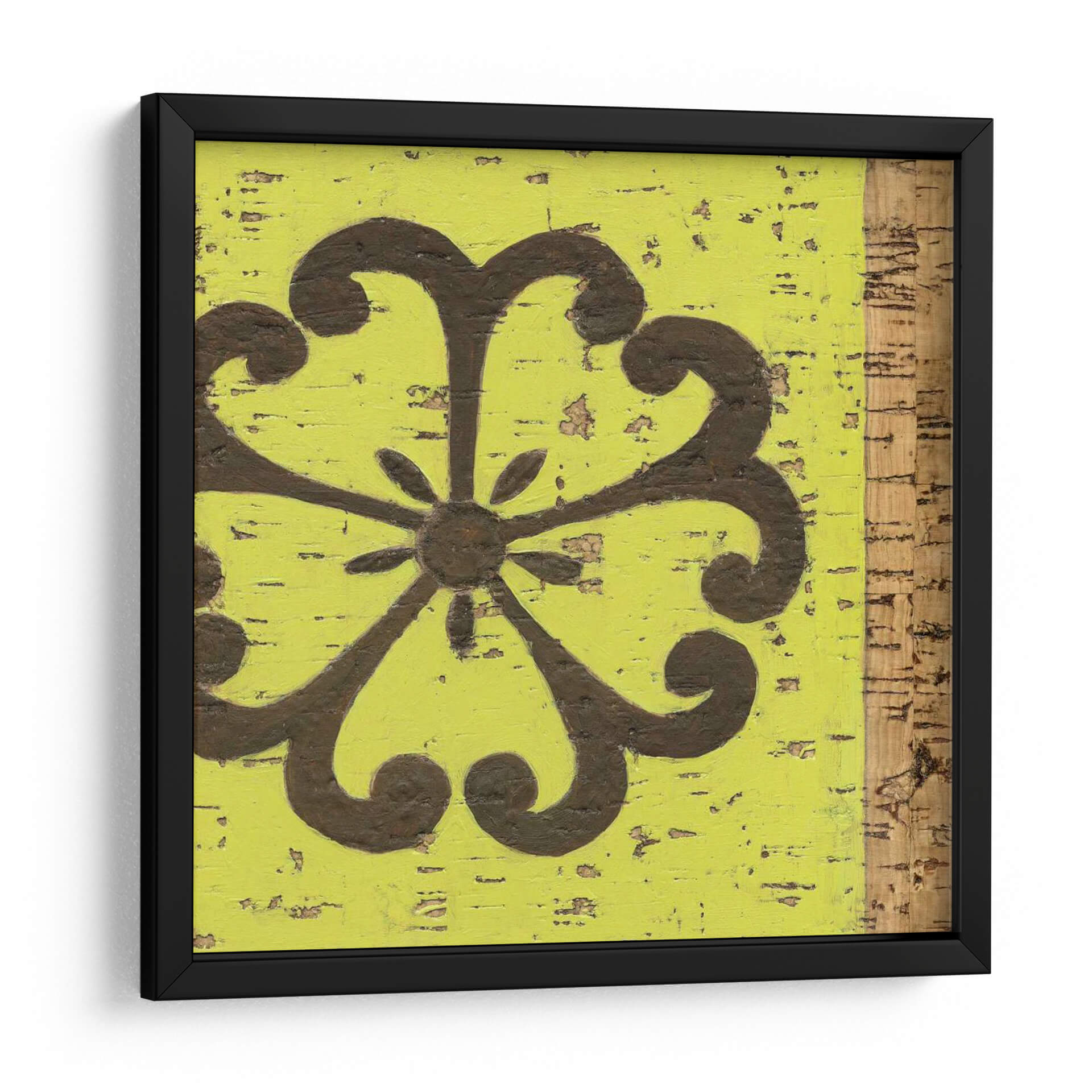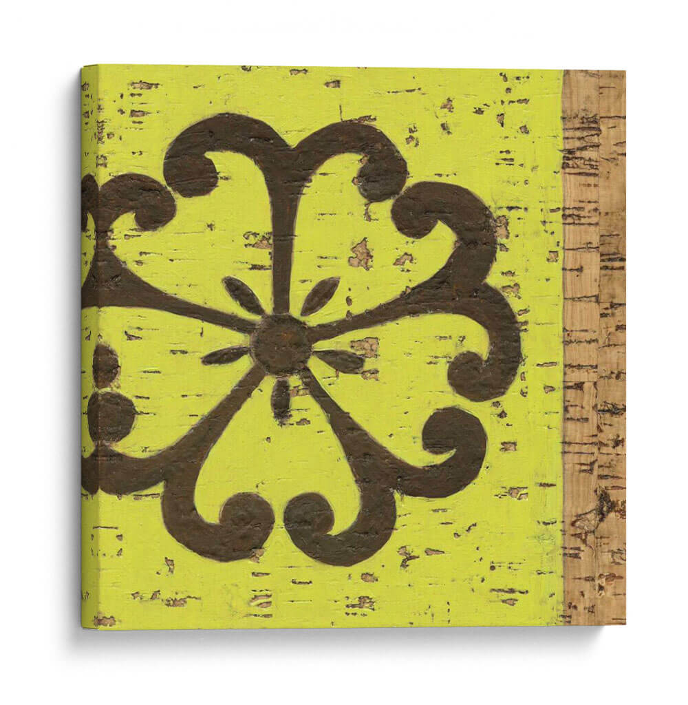 Sumérgete en la vibrante energía de 'Key Lime Rosette III', una obra de arte contemporáneo que captura la esencia de un diseño floral estilizado con un toque orgánico. El fondo de un vibrante tono verde lima, salpicado de sutiles texturas que evocan la corteza de un árbol o un corcho natural, crea una base audaz y terrenal. Sobre este lienzo luminoso, un intrincado motivo en forma de rosetón de color marrón oscuro se despliega con gracia. Sus volutas fluidas y pétalos delicados irradian un aire de sofisticación rústica, recordando a antiguos patrones de azulejos o intrincados trabajos de hierro forjado. Esta pieza es una celebración de la forma y la textura, combinando la frescura del color lima con la calidez y profundidad del marrón, logrando un equilibrio visual cautivador. Ideal para espacios que buscan un toque de vitalidad y un guiño a la naturaleza con un diseño moderno y atemporal. Este cuadro decorativo es perfecto para iluminar una sala de estar, añadir carácter a un comedor o insuflar vida a una oficina.