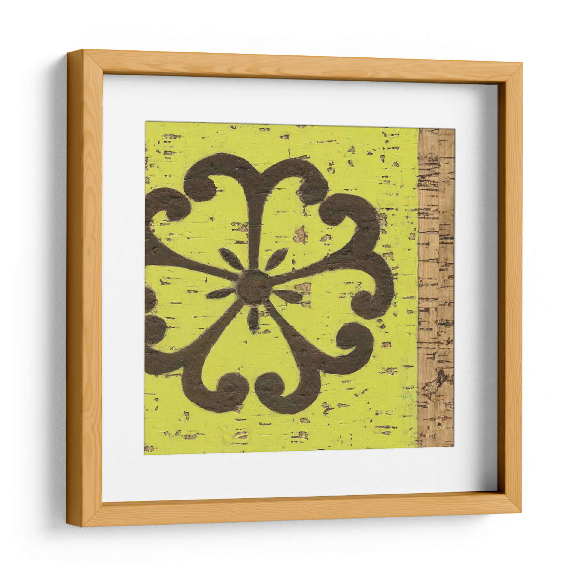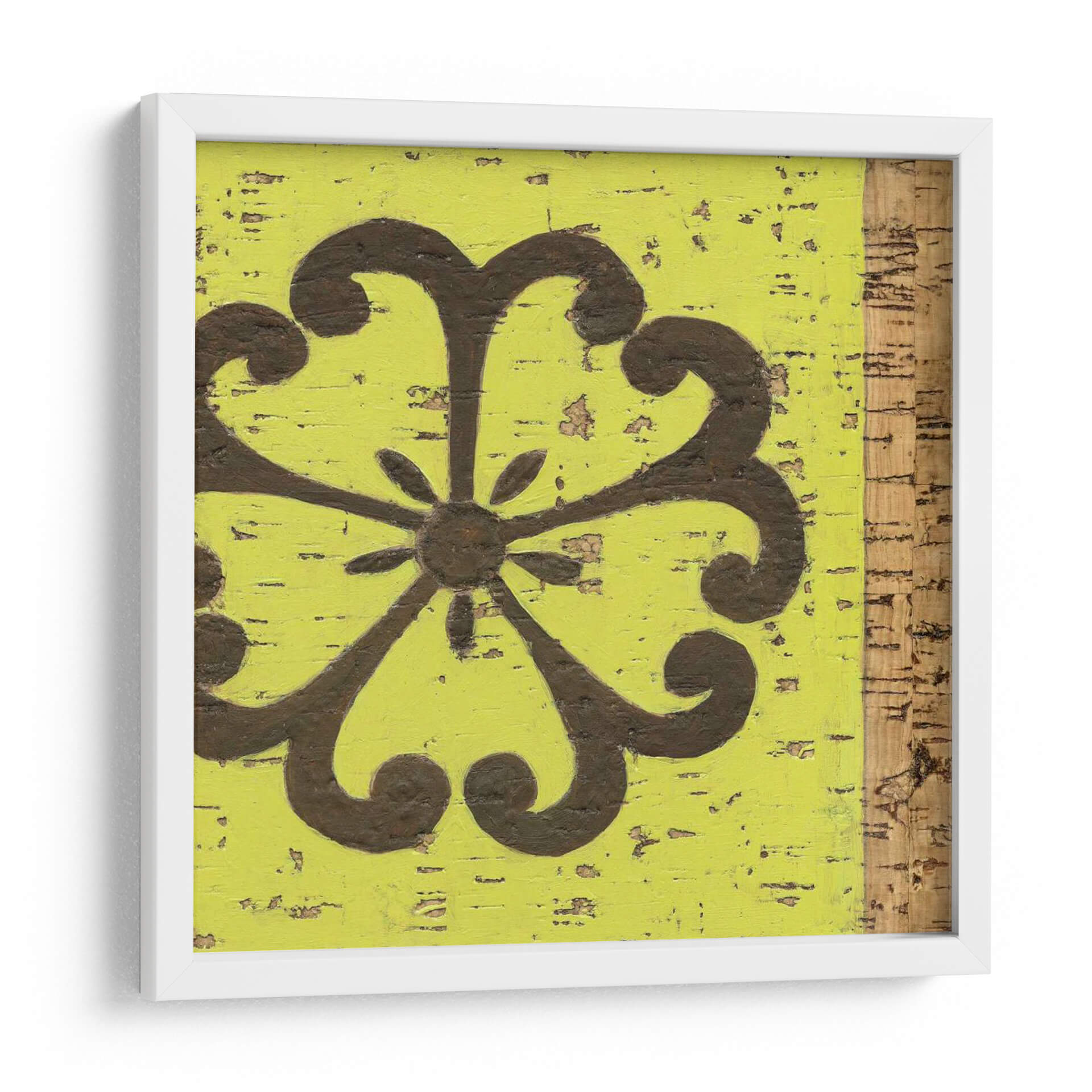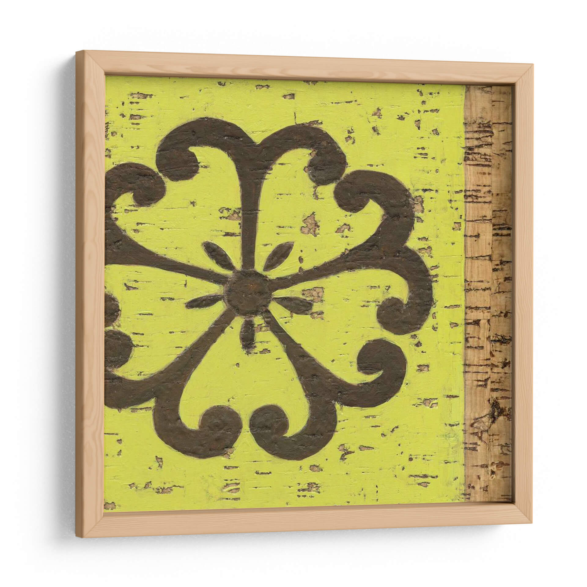 Sumérgete en la vibrante energía de 'Key Lime Rosette III', una obra de arte contemporáneo que captura la esencia de un diseño floral estilizado con un toque orgánico. El fondo de un vibrante tono verde lima, salpicado de sutiles texturas que evocan la corteza de un árbol o un corcho natural, crea una base audaz y terrenal. Sobre este lienzo luminoso, un intrincado motivo en forma de rosetón de color marrón oscuro se despliega con gracia. Sus volutas fluidas y pétalos delicados irradian un aire de sofisticación rústica, recordando a antiguos patrones de azulejos o intrincados trabajos de hierro forjado. Esta pieza es una celebración de la forma y la textura, combinando la frescura del color lima con la calidez y profundidad del marrón, logrando un equilibrio visual cautivador. Ideal para espacios que buscan un toque de vitalidad y un guiño a la naturaleza con un diseño moderno y atemporal. Este cuadro decorativo es perfecto para iluminar una sala de estar, añadir carácter a un comedor o insuflar vida a una oficina.