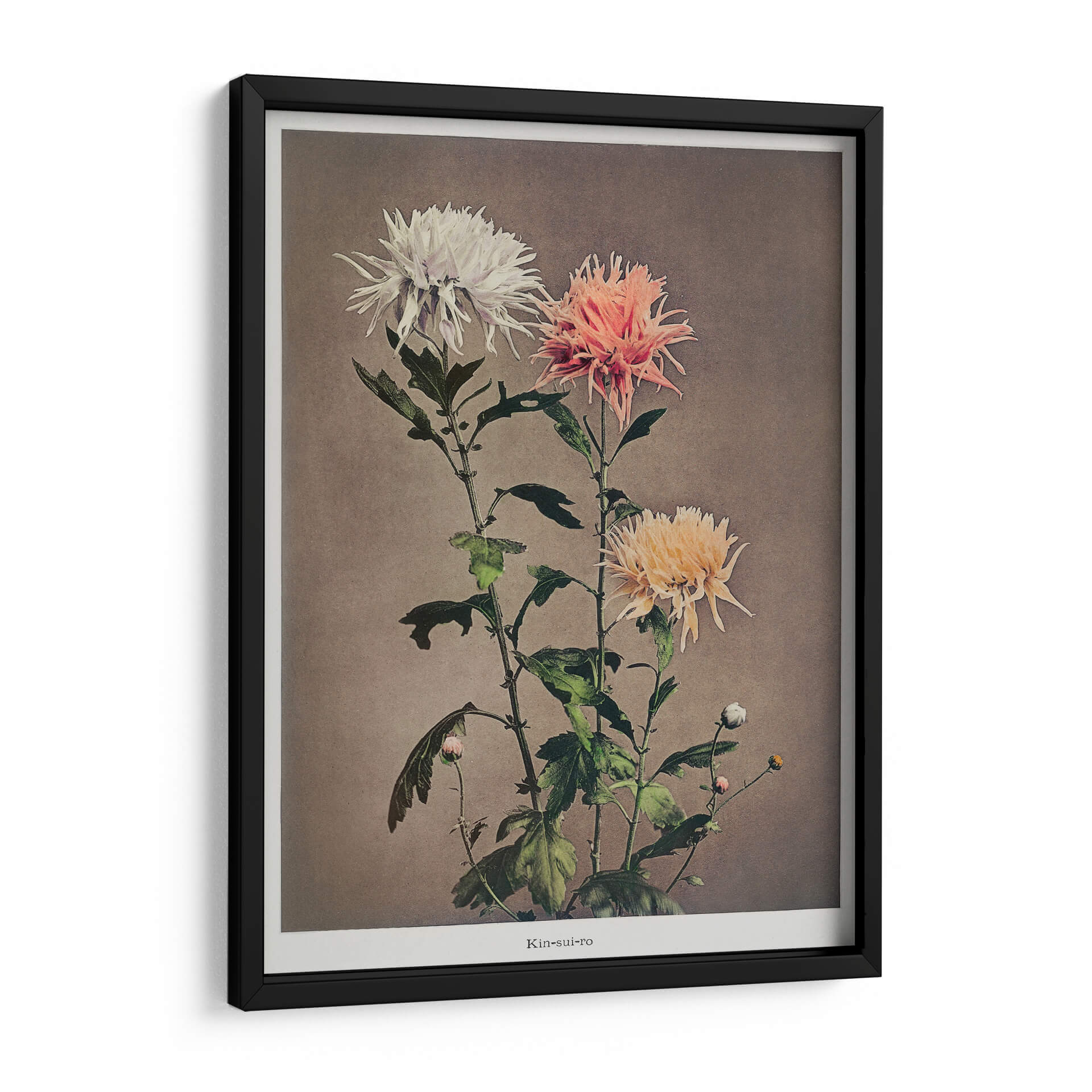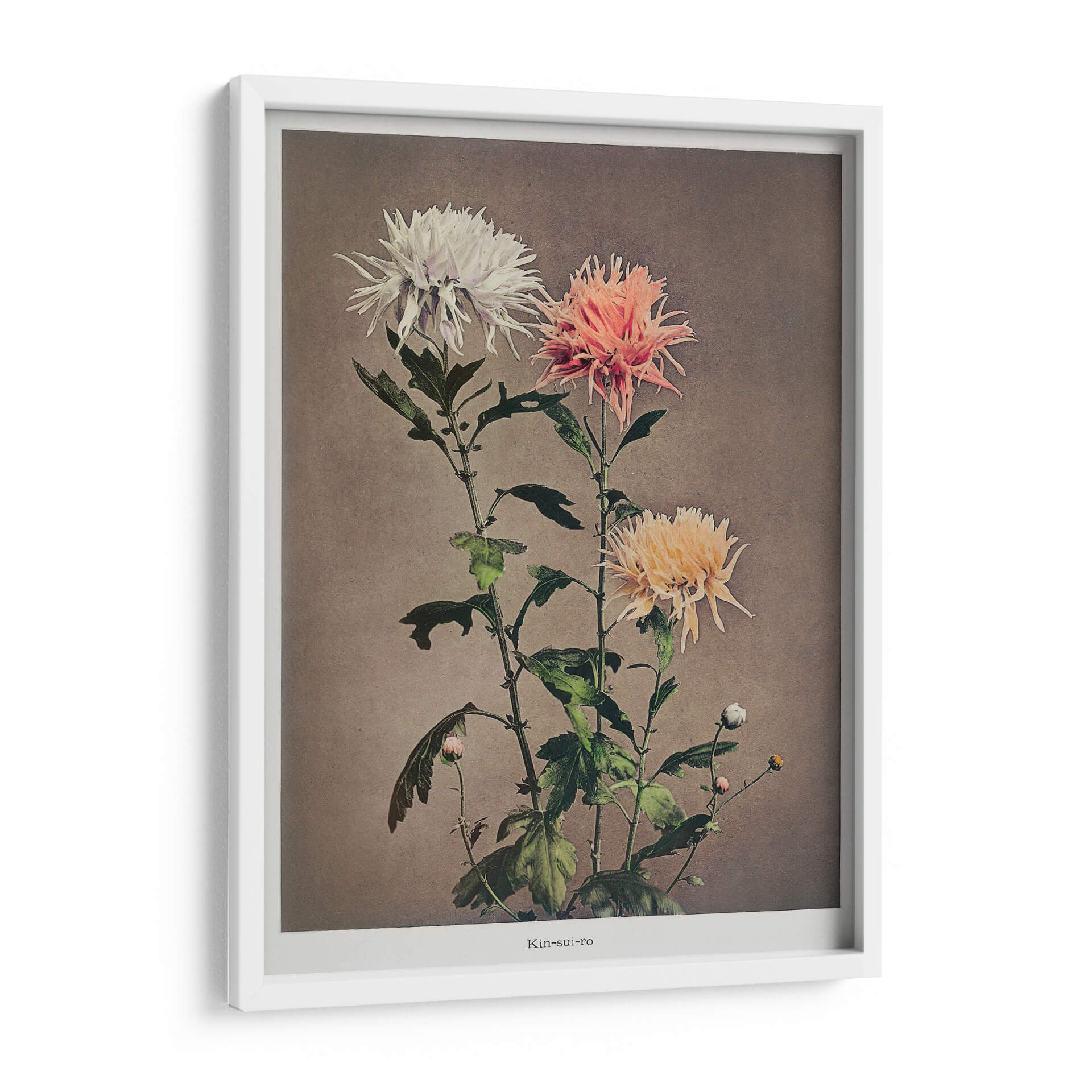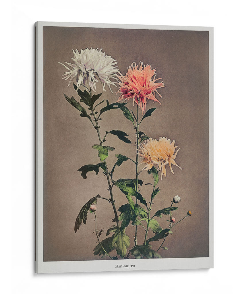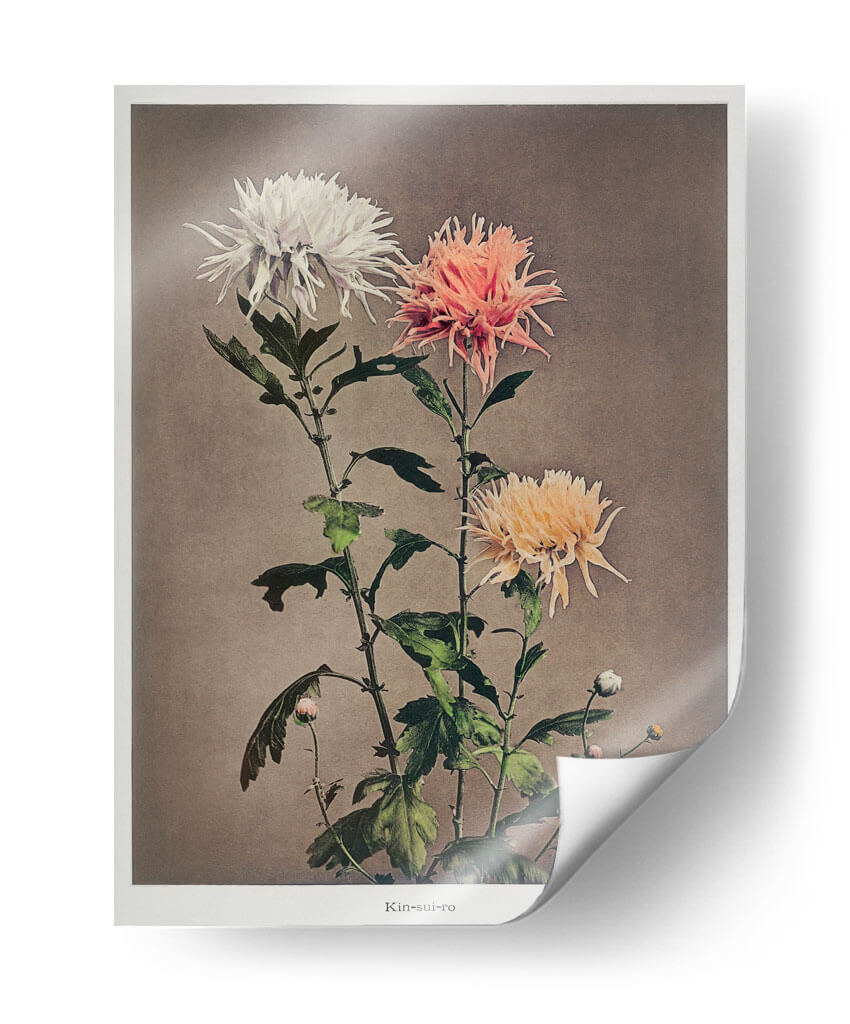 Sumérgete en la delicada belleza de "Kin–sui–ro", una cautivadora obra de arte floral del reconocido artista Ogawa Kazumasa. Este cuadro decorativo presenta un estudio detallado de crisantemos, capturando la intrincada textura de sus pétalos en una paleta de colores suave y armoniosa. Los tonos blanquecinos, rosados y amarillentos de las flores contrastan delicadamente con el fondo neutro, creando una atmósfera de serenidad y elegancia atemporal. La composición vertical, con sus tallos esbeltos y hojas frondosas, añade un toque de dinamismo y naturalidad a la pieza. Ideal para quienes buscan infundir calma y sofisticación en su hogar u oficina, este cuadro decorativo es una celebración de la naturaleza en su máxima expresión. Su estilo, que evoca la precisión botánica con un toque artístico, lo convierte en una adición perfecta para espacios que buscan un punto focal de tranquilidad y belleza refinada. Añade un toque de arte clásico y sereno a tu decoración.