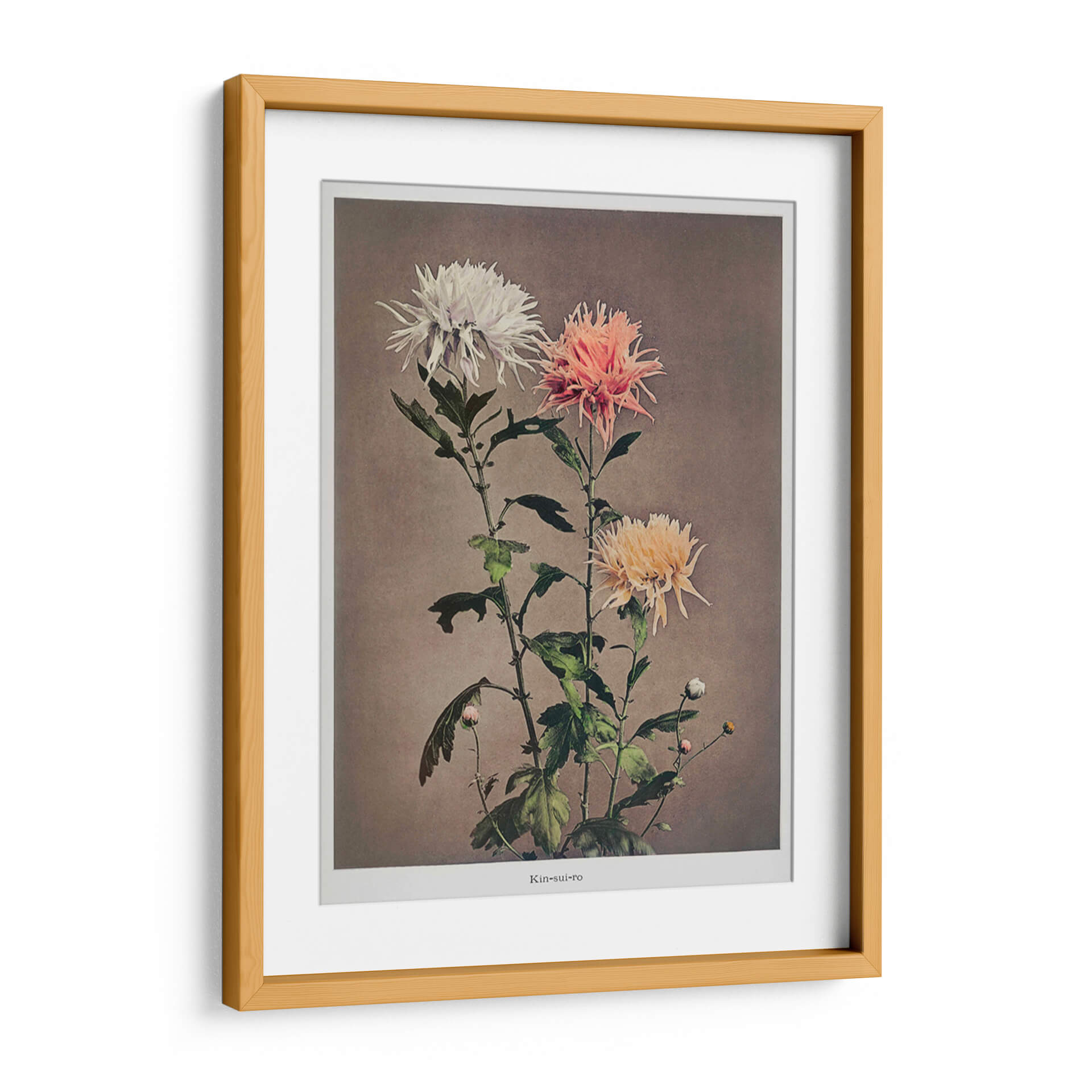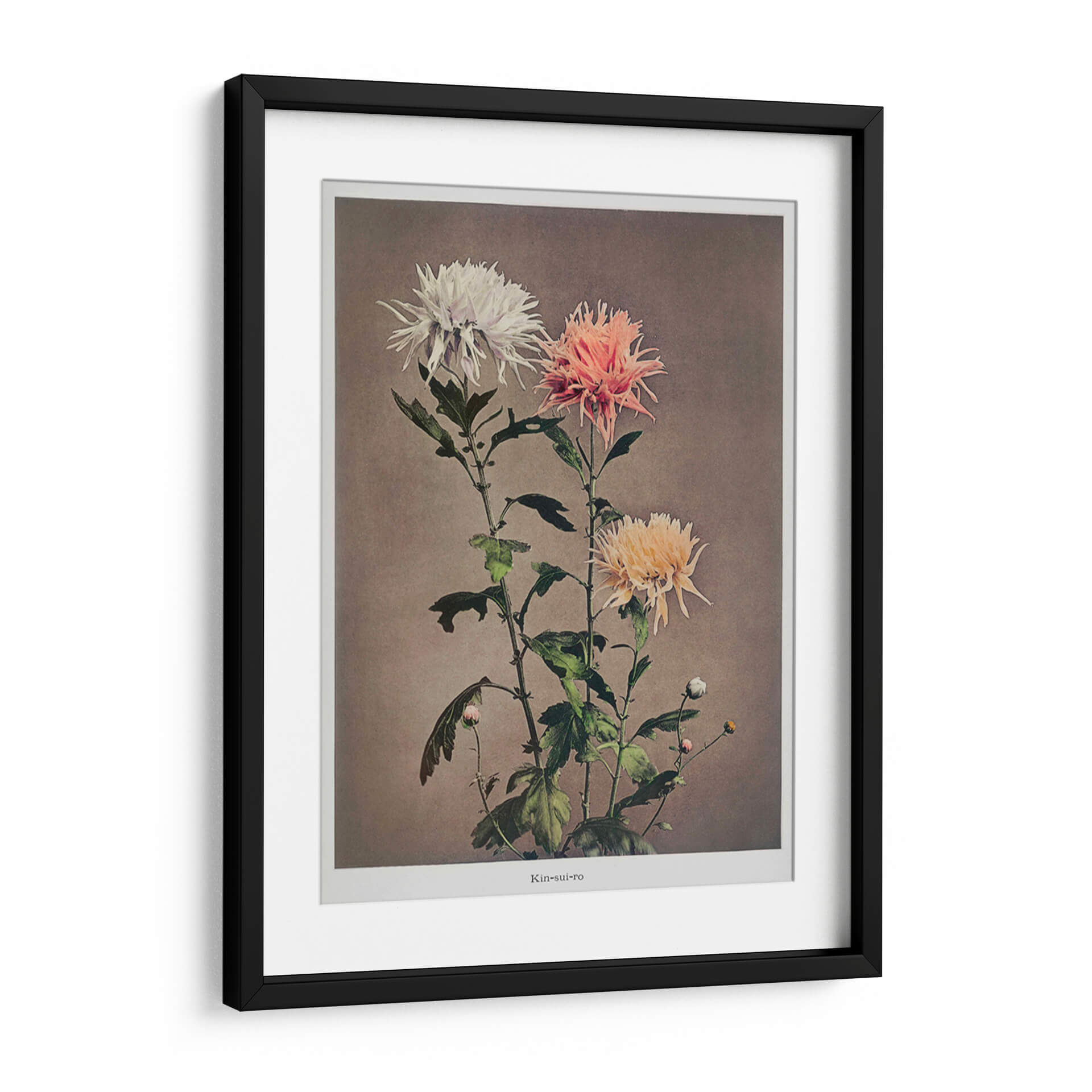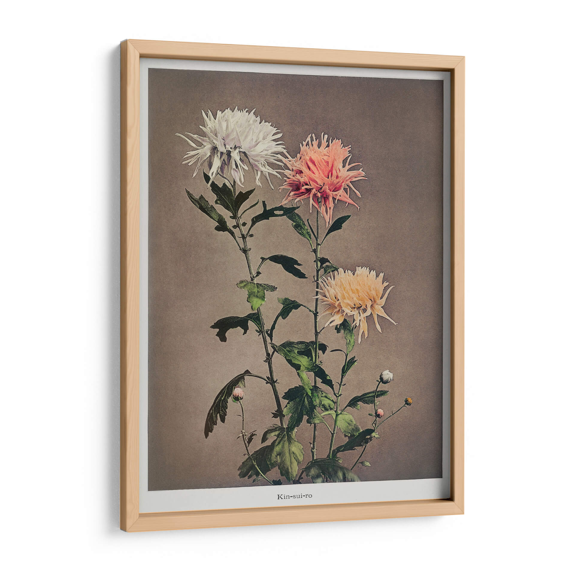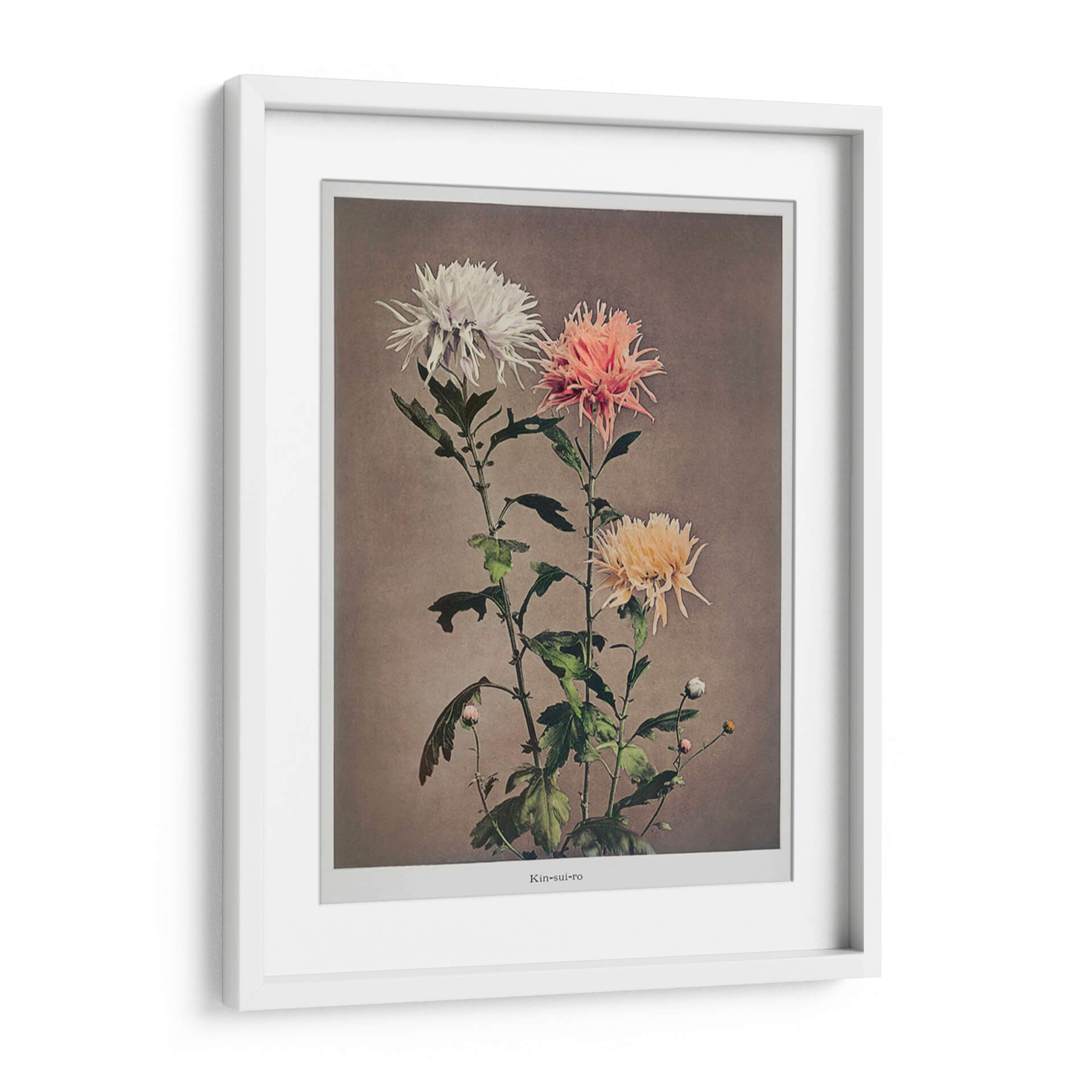 Sumérgete en la delicada belleza de "Kin–sui–ro", una cautivadora obra de arte floral del reconocido artista Ogawa Kazumasa. Este cuadro decorativo presenta un estudio detallado de crisantemos, capturando la intrincada textura de sus pétalos en una paleta de colores suave y armoniosa. Los tonos blanquecinos, rosados y amarillentos de las flores contrastan delicadamente con el fondo neutro, creando una atmósfera de serenidad y elegancia atemporal. La composición vertical, con sus tallos esbeltos y hojas frondosas, añade un toque de dinamismo y naturalidad a la pieza. Ideal para quienes buscan infundir calma y sofisticación en su hogar u oficina, este cuadro decorativo es una celebración de la naturaleza en su máxima expresión. Su estilo, que evoca la precisión botánica con un toque artístico, lo convierte en una adición perfecta para espacios que buscan un punto focal de tranquilidad y belleza refinada. Añade un toque de arte clásico y sereno a tu decoración.