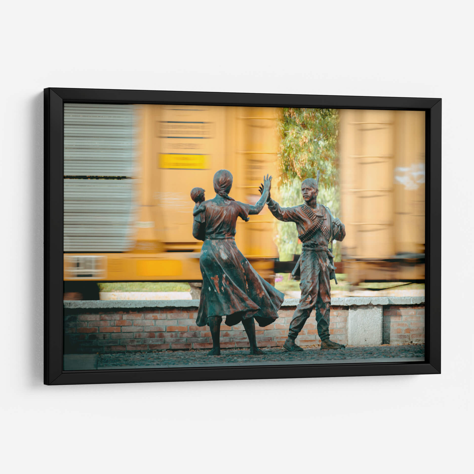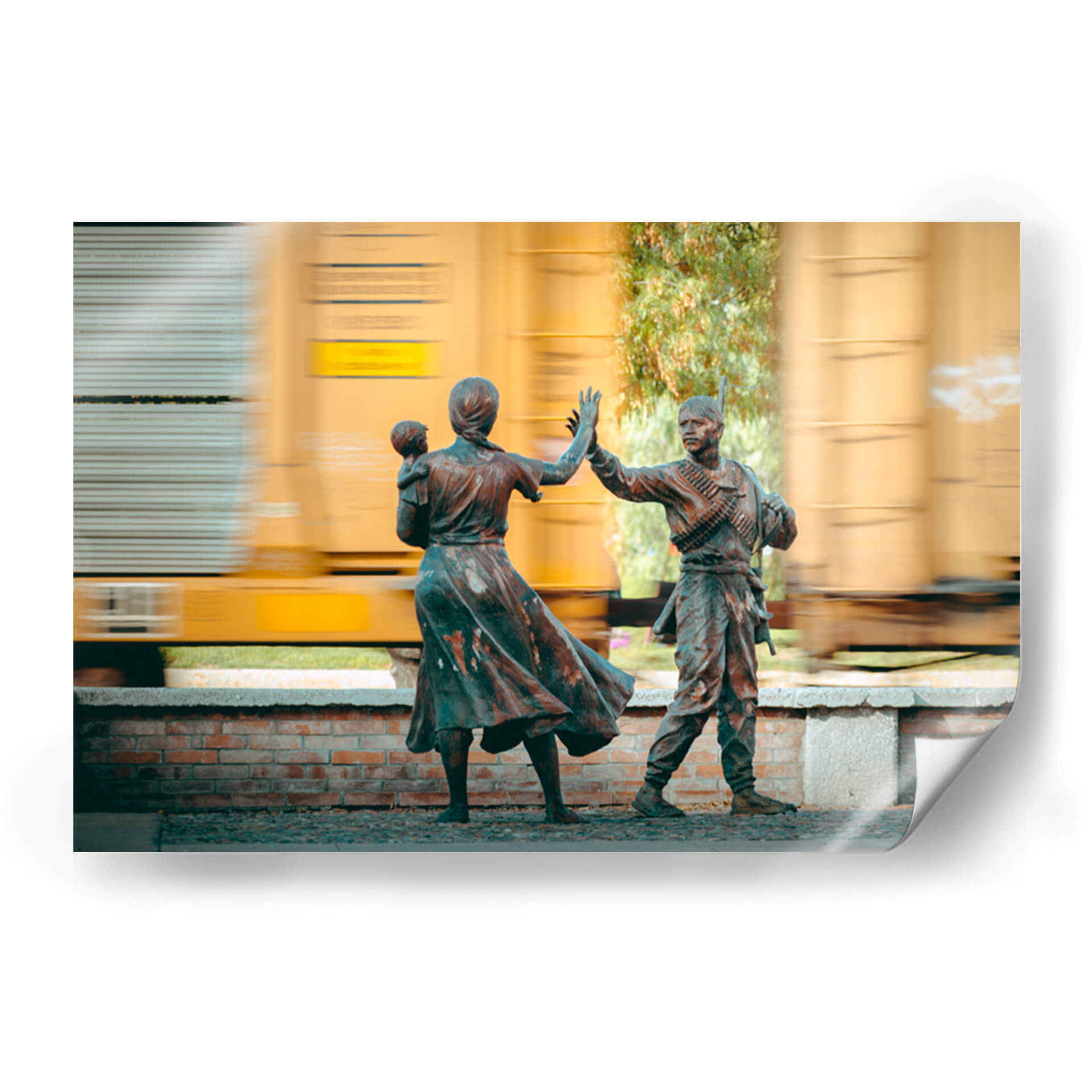 Captura la esencia de un momento efímero con "La Despedida", una obra de arte que evoca profundas emociones y reflexiones. Este cuadro decorativo presenta una escena conmovedora donde una figura femenina, portando un niño en brazos, se encuentra con una figura masculina, sugiriendo una separación o un emotivo reencuentro. La composición se desarrolla ante el fondo de un tren en movimiento, cuya estela borrosa añade una dinámica de tiempo y transición a la pieza. Los tonos terrosos y verdosos predominantes en las figuras, contrastando con el amarillo vibrante y difuminado del tren, crean una atmósfera visualmente rica y cargada de significado. El estilo, que podría interpretarse como una forma de realismo con toques expresionistas, se centra en la narrativa y la conexión humana. "La Despedida" es ideal para añadir un punto focal lleno de historia y sentimiento a un salón, un recibidor o incluso una oficina, invitando a la contemplación sobre el paso del tiempo, las relaciones y los momentos clave de la vida. Esta pieza es perfecta para quienes buscan arte que cuente una historia y despierte conversaciones, aportando profundidad y carácter a cualquier espacio decorativo.