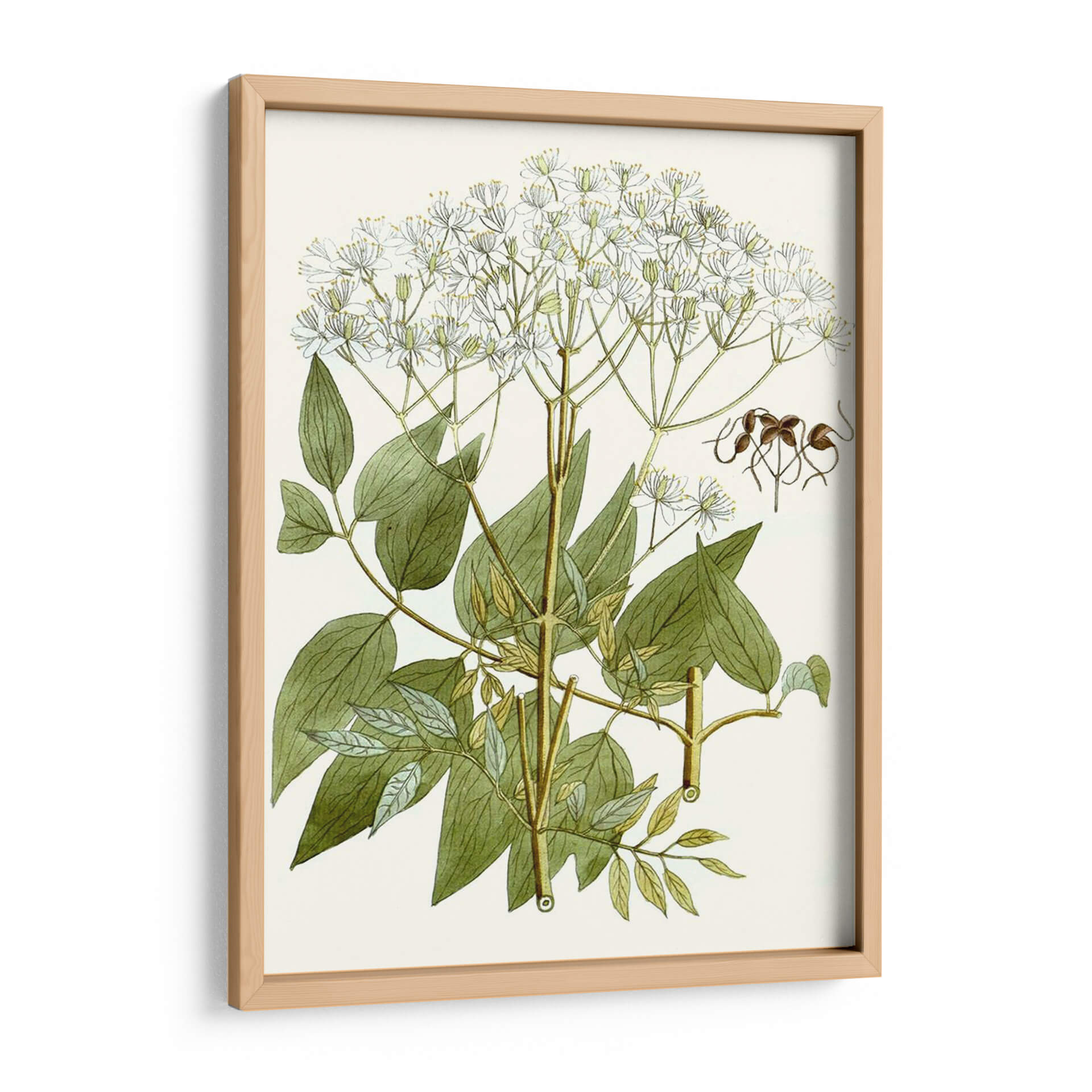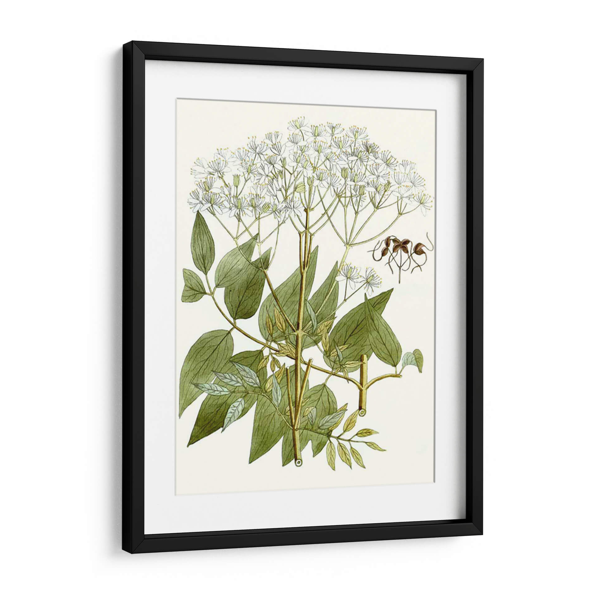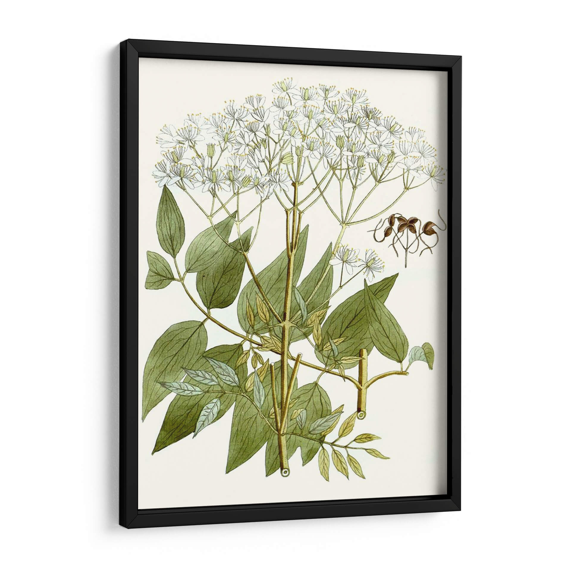 Sumérgete en la delicadeza botánica con "Lacy Deja V", un cuadro decorativo que captura la esencia de la naturaleza con un detalle exquisito. Esta obra presenta una detallada ilustración de una planta en flor, con racimos de pequeñas flores blancas que se despliegan elegantemente sobre tallos verdes y hojas frondosas. La paleta de colores se centra en tonos naturales y serenos: verdes profundos y variados para la vegetación, blancos puros para las delicadas corolas, y toques sutiles de marrón y amarillo en los tallos y algunos detalles, todo sobre un fondo cremoso que realza la vivacidad de la composición. El estilo se asemeja a las ilustraciones científicas clásicas, ofreciendo una precisión artística que invita a la contemplación y al aprecio por los detalles más finos del mundo natural. La atmósfera general es de calma, serenidad y un toque de elegancia orgánica. Este cuadro decorativo es ideal para espacios que buscan un aire de tranquilidad y conexión con la naturaleza, como un dormitorio, una sala de estar con decoración clásica o incluso un estudio o consulta médica. "Lacy Deja V" es una pieza que aporta sofisticación y un respiro visual a cualquier ambiente.