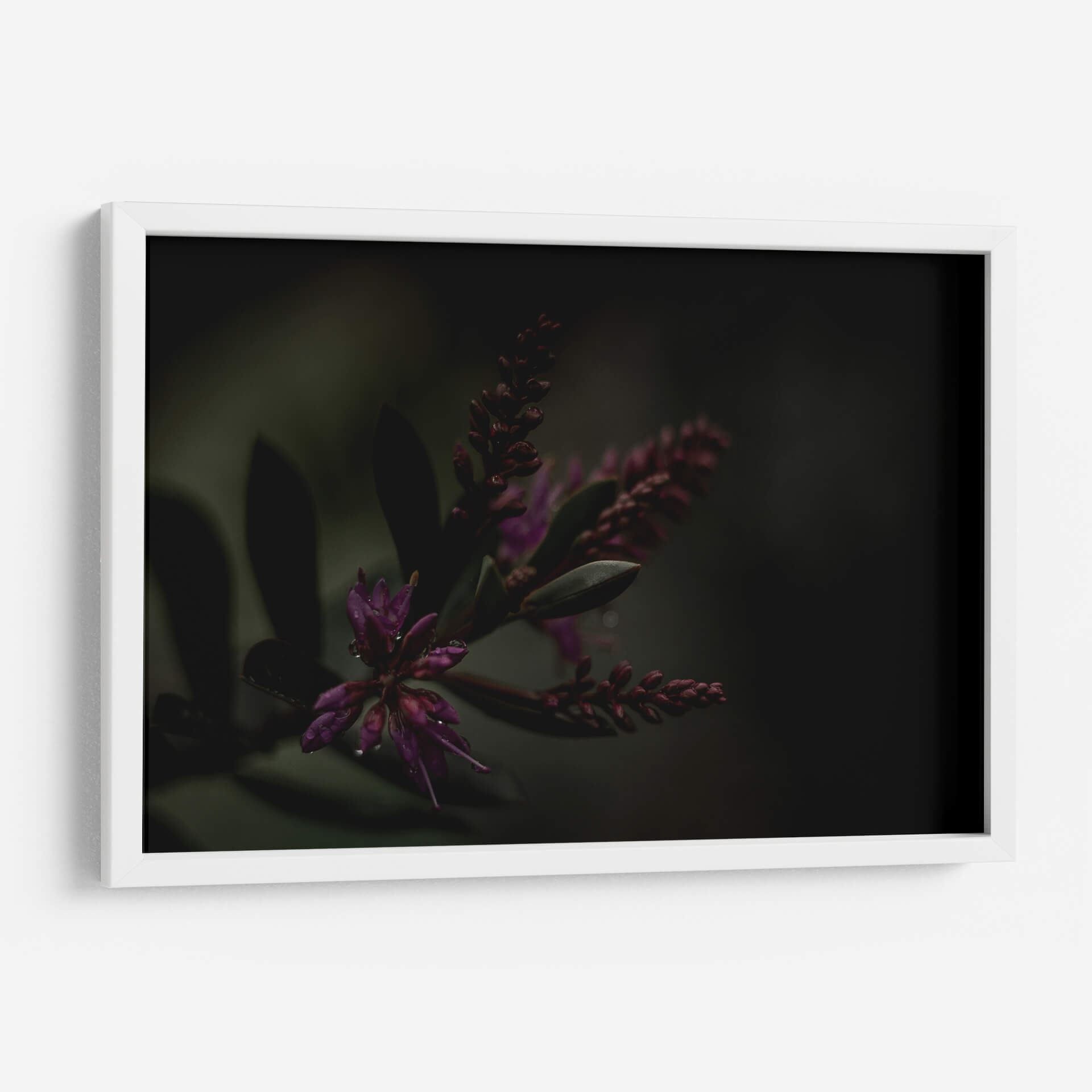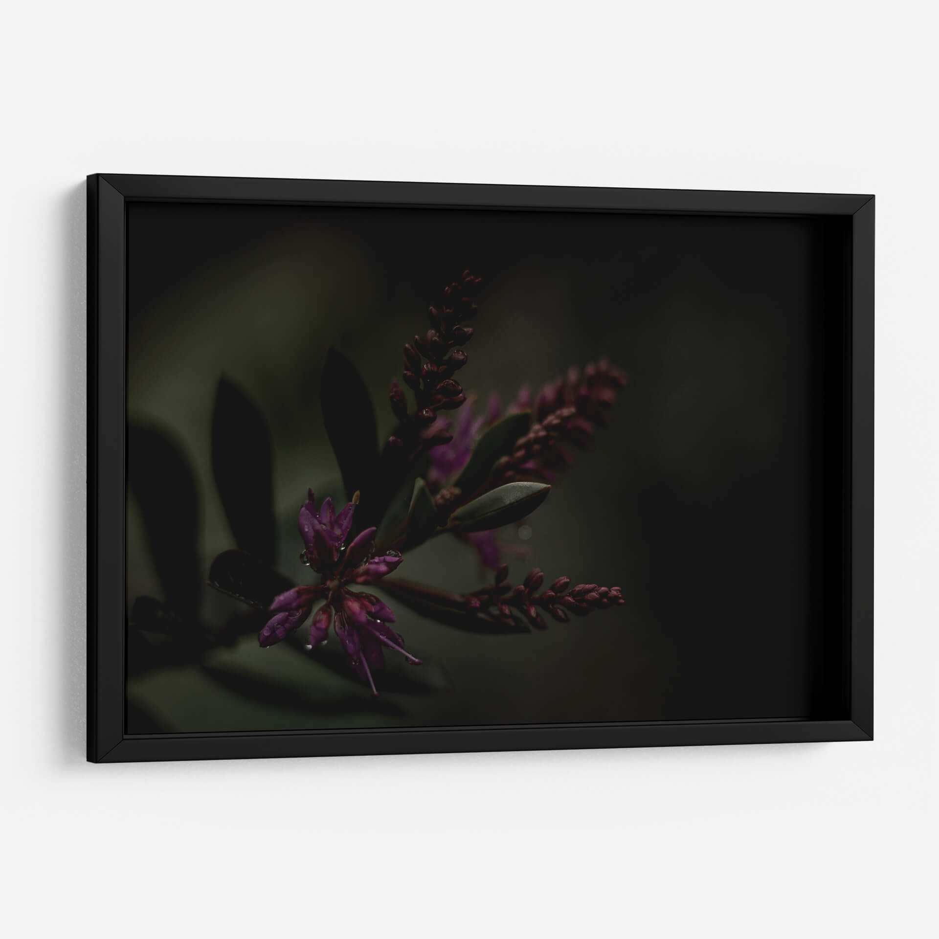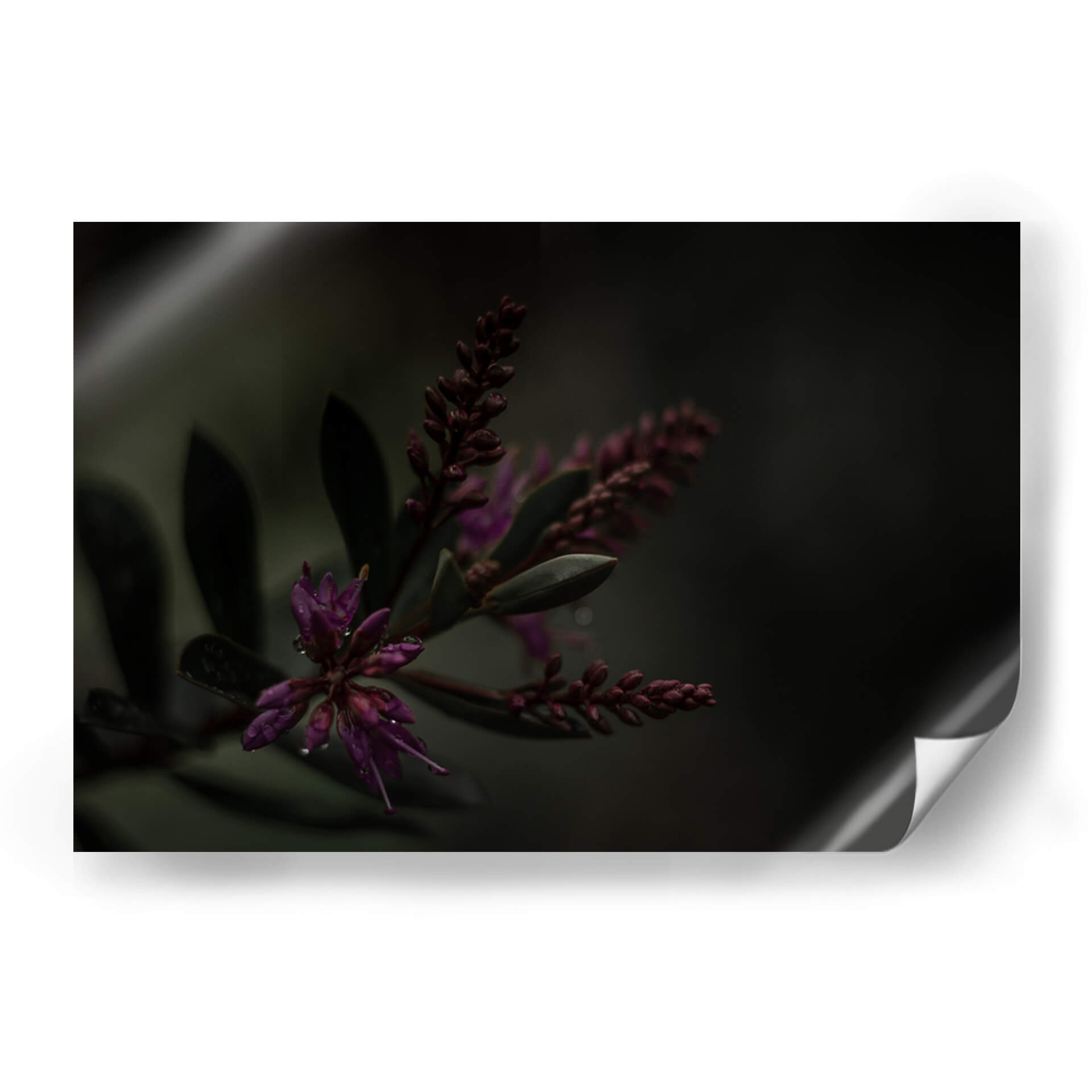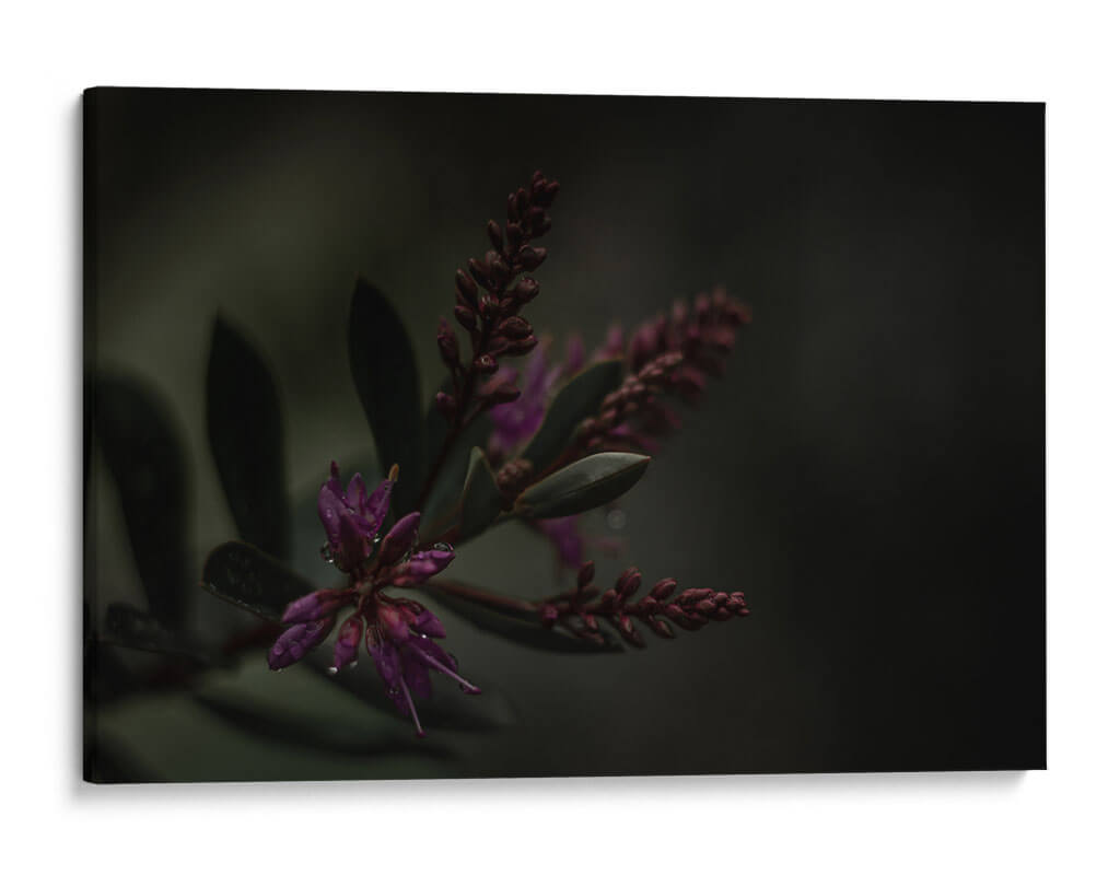 Sumérgete en la misteriosa belleza de 'Lágrimas Moradas', una obra de arte que captura la delicadeza de la naturaleza con un toque etéreo. Este cuadro decorativo presenta un primer plano íntimo de flores moradas vibrantes, sutilmente adornadas con gotas de agua que reflejan la luz, evocando una sensación de frescura y serenidad tras la lluvia. La paleta de colores, dominada por profundos tonos morados y verdes oscuros, crea una atmósfera envolvente y contemplativa, perfecta para espacios que buscan un toque de sofisticación y calma. El estilo fotográfico macro resalta las texturas y formas orgánicas, invitando al espectador a perderse en los detalles intrincados de la flora. Ideal para añadir un punto focal de elegancia natural a tu salón, dormitorio u oficina, este cuadro contemporáneo trasciende lo meramente decorativo para convertirse en una ventana a la tranquilidad del mundo natural. Su composición cuidada y la atmósfera melancólica pero hermosa lo convierten en una pieza única para coleccionistas y amantes del arte que aprecian la sutileza y la profundidad emocional en la decoración de interiores.